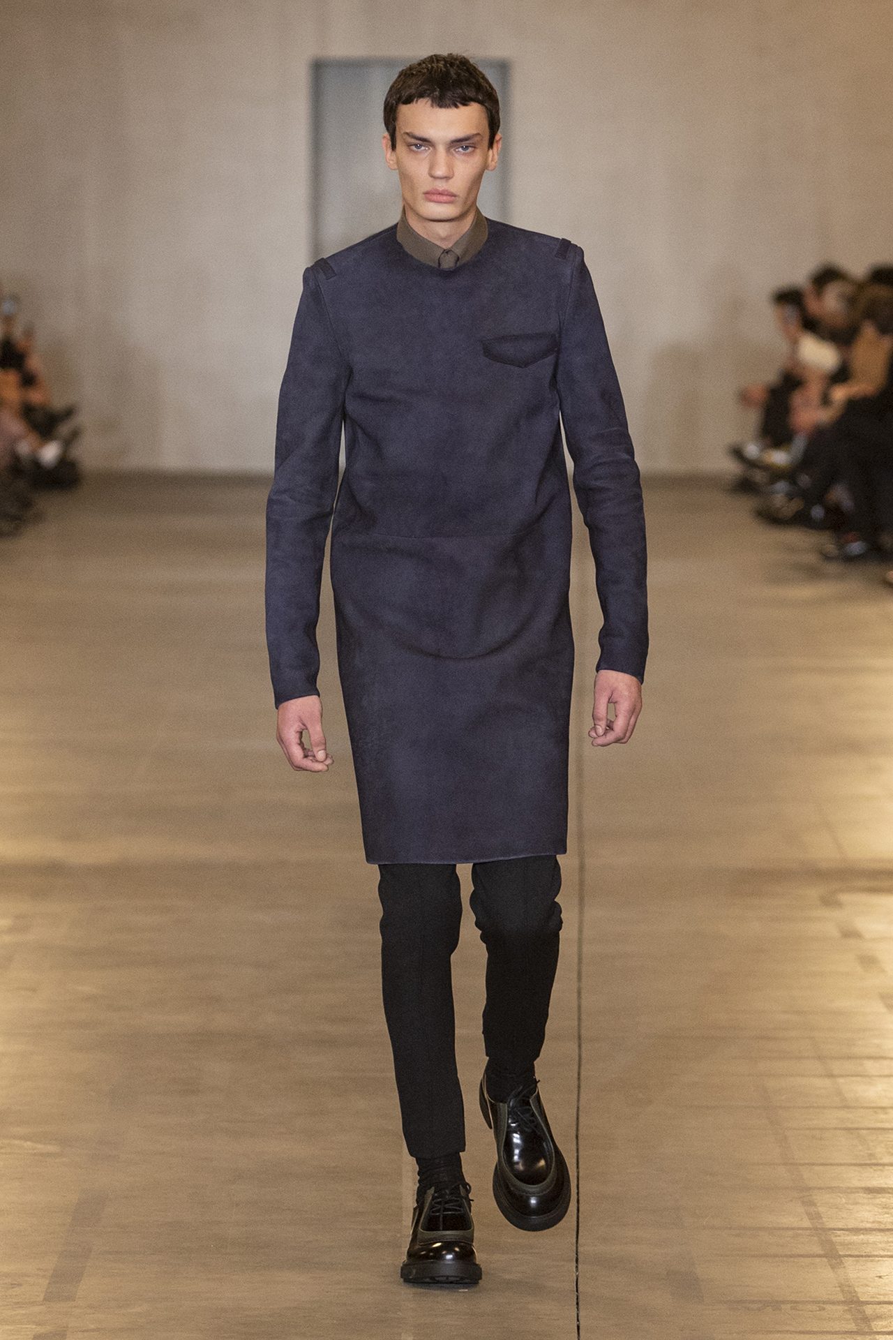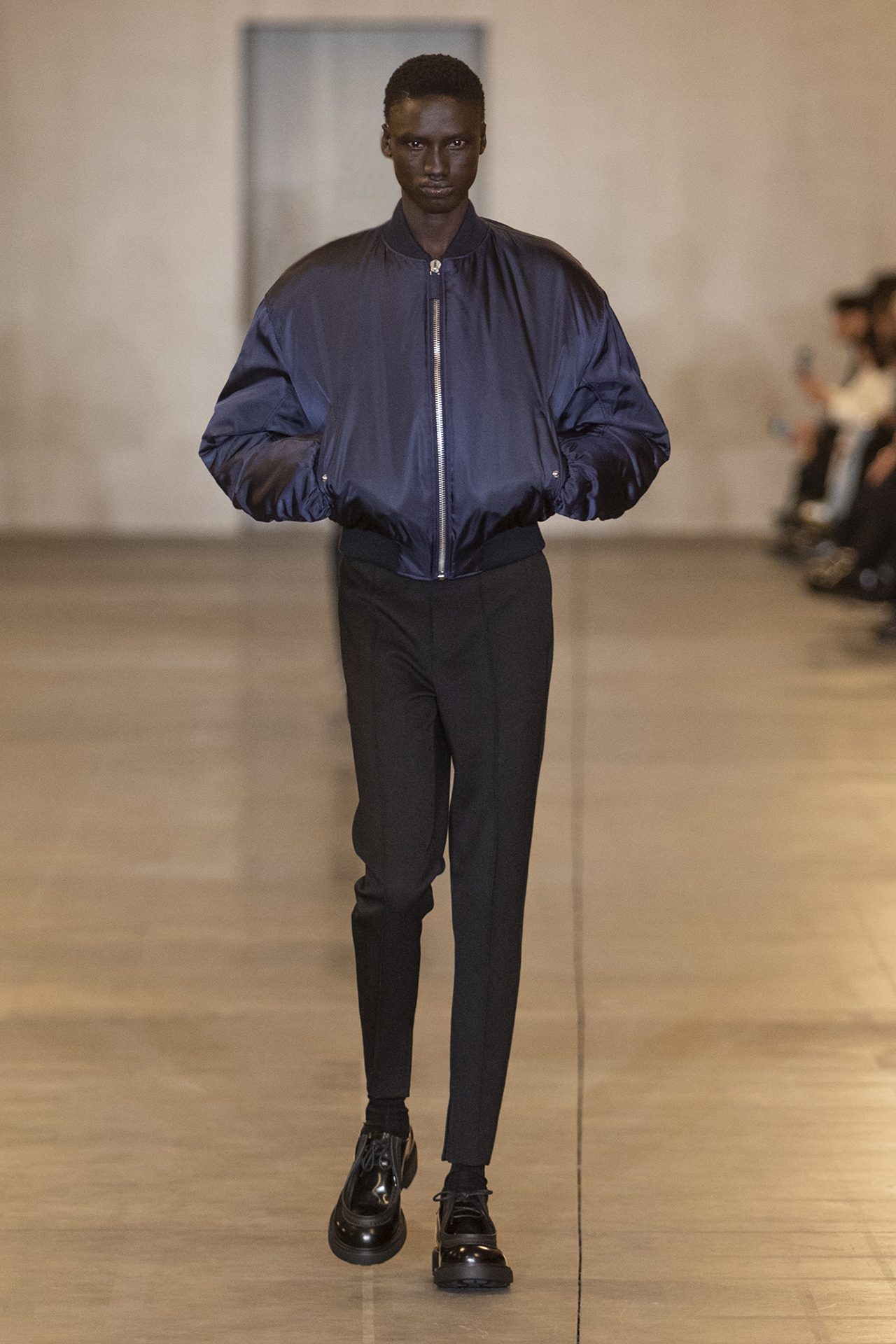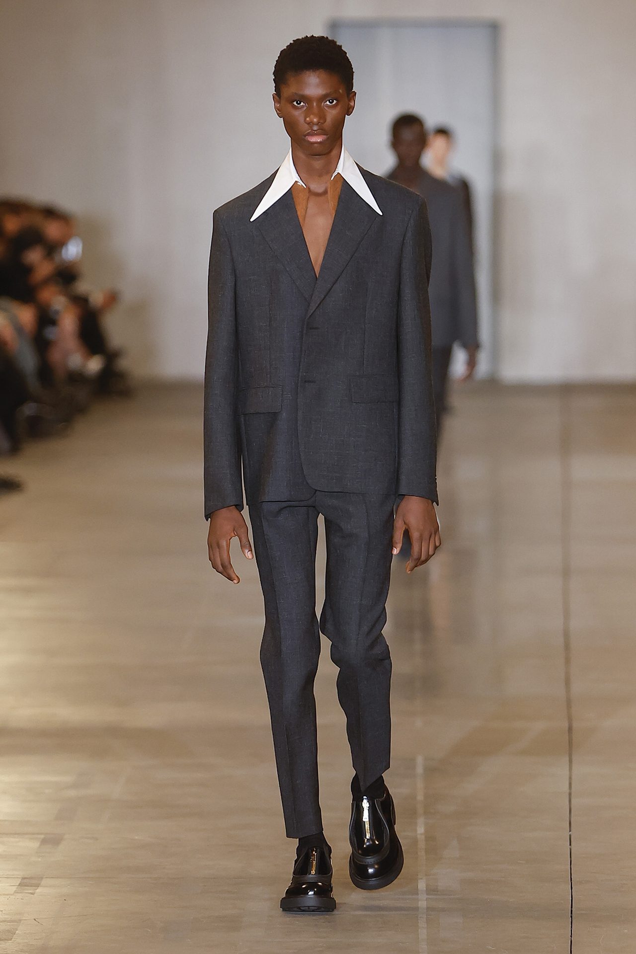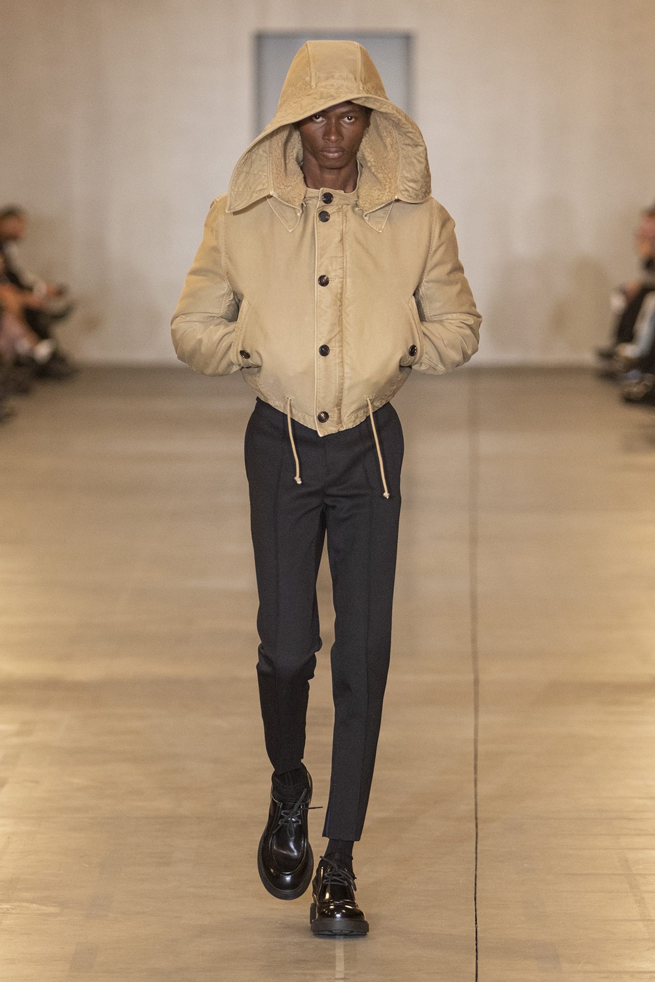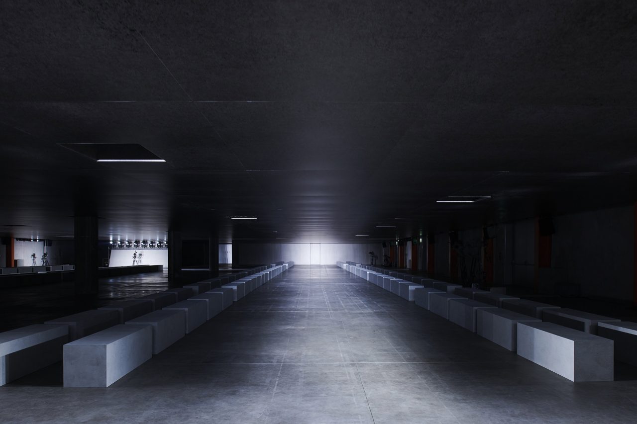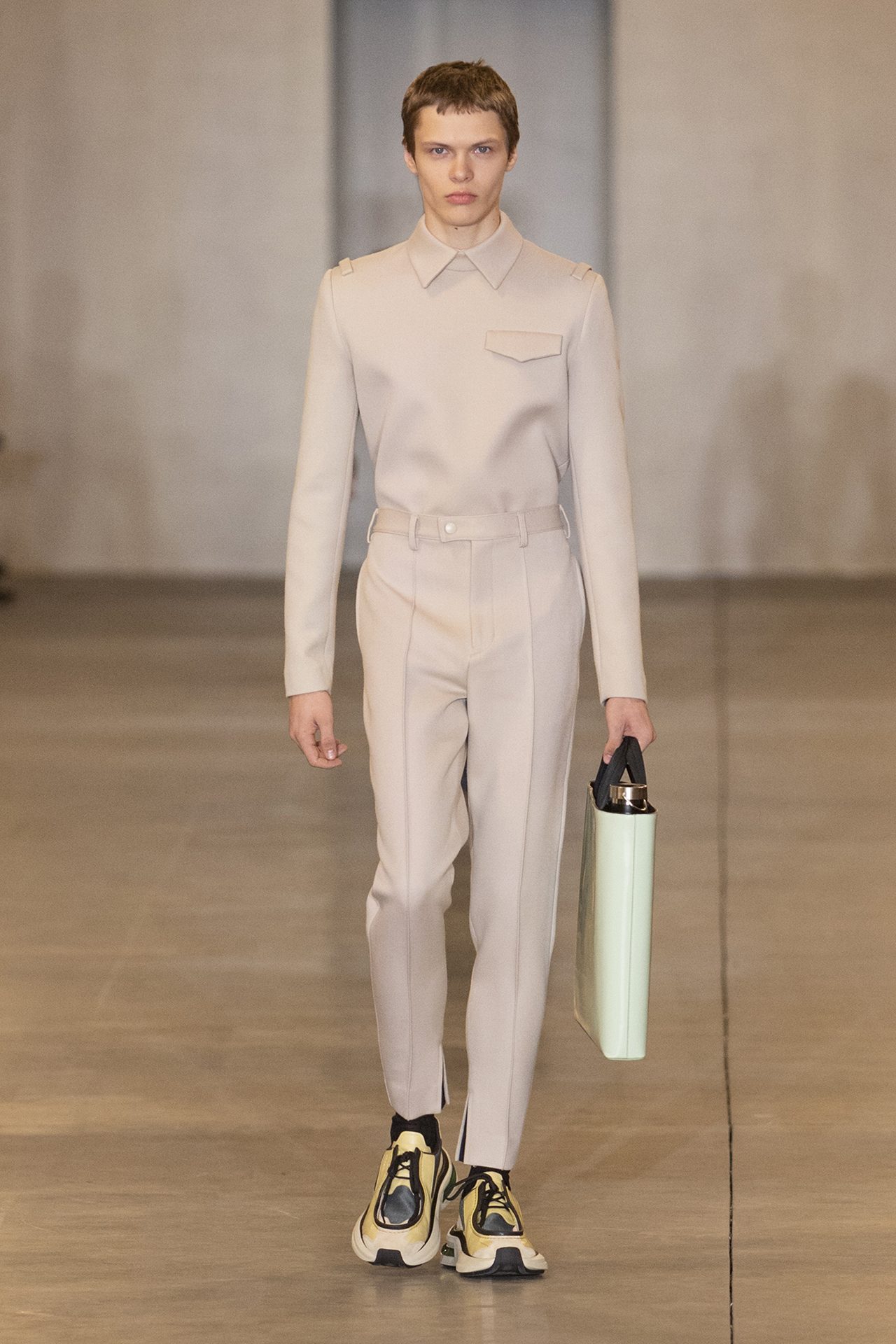 会場は、建築家の Rem Koolhaas (レム・コールハース) 率いる AMO が手掛けたプラダ財団の Deposito ショースペース。ショーでは、天井がゆっくりと上昇し、親密な空間が壮大な空間へと変化した。スケールが変わることでウェアに対しての視点も変化させるこの演出は、長く伸びていたり、短く切り詰められたウェアそのものと呼応する。