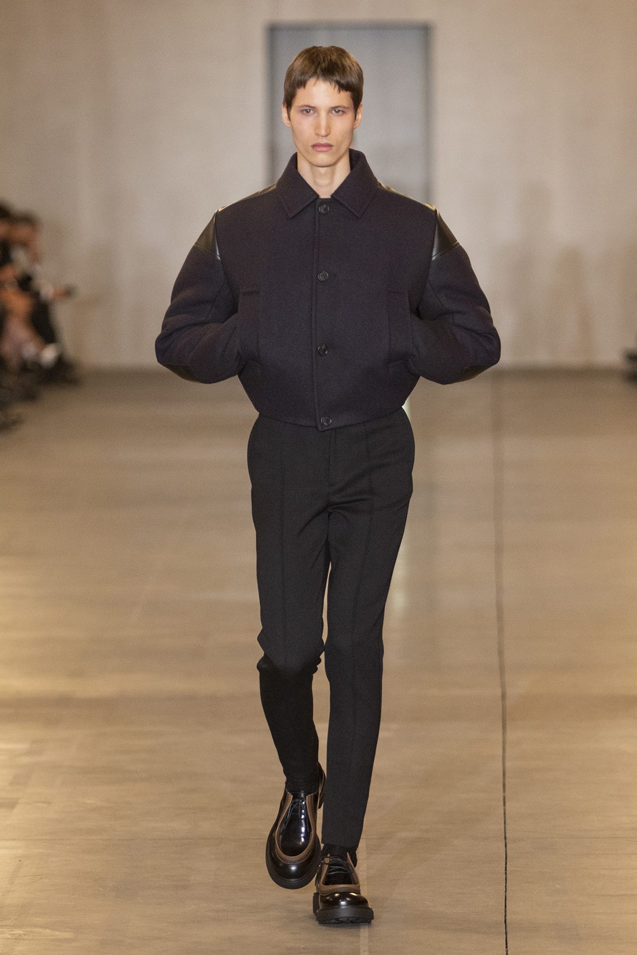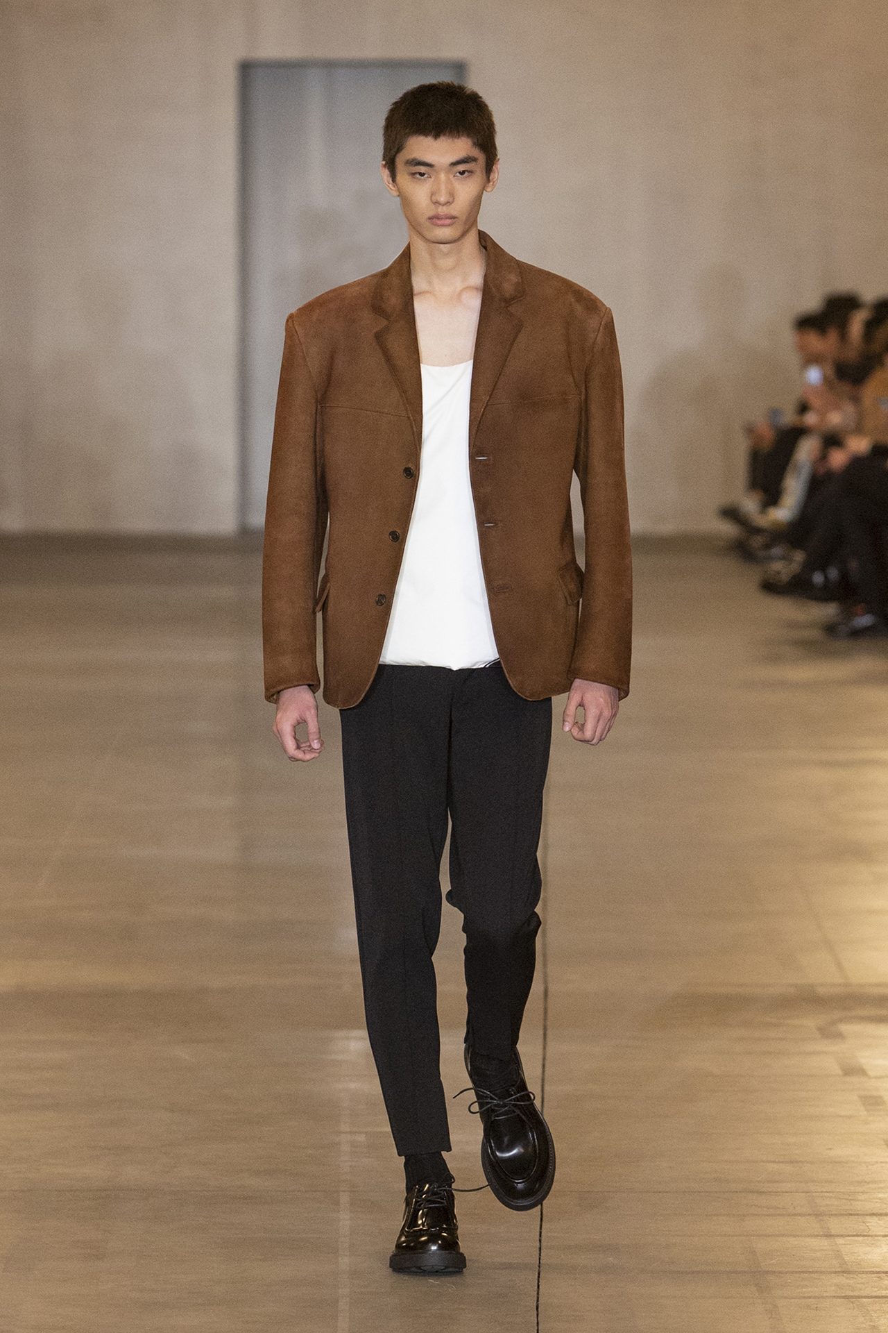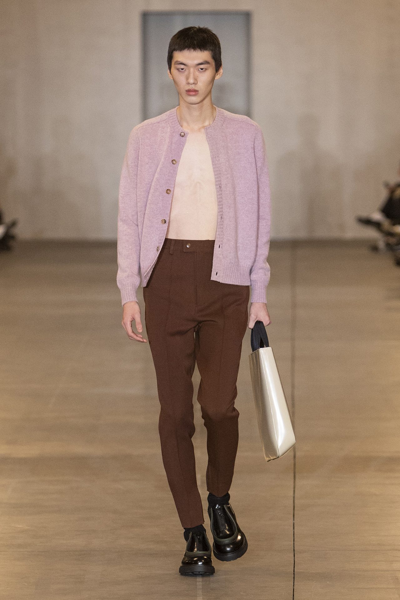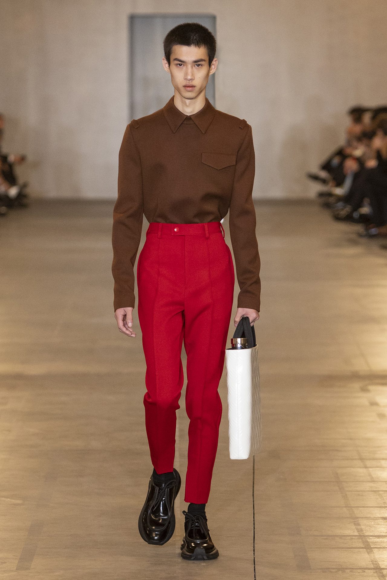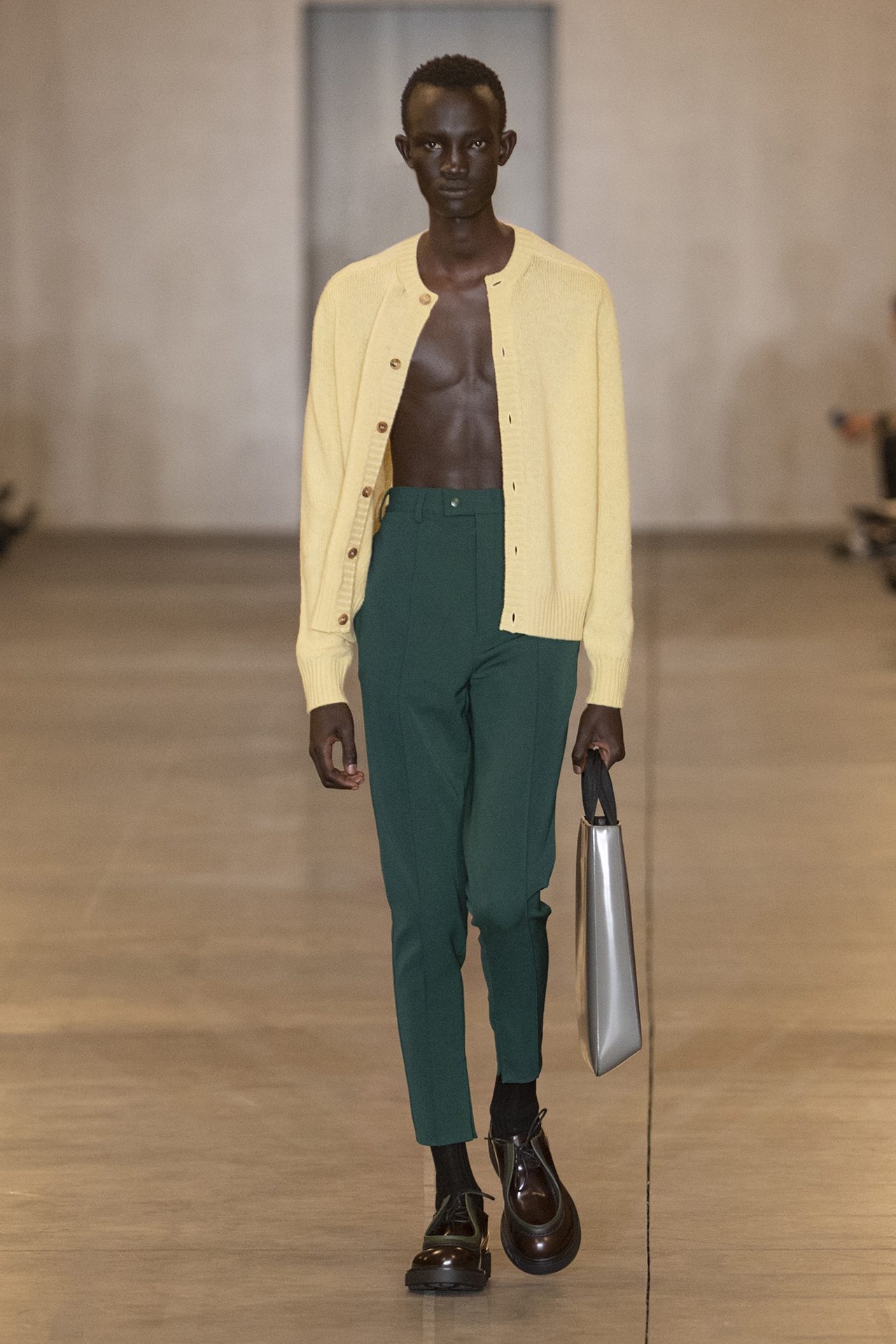 会場は、建築家の Rem Koolhaas (レム・コールハース) 率いる AMO が手掛けたプラダ財団の Deposito ショースペース。ショーでは、天井がゆっくりと上昇し、親密な空間が壮大な空間へと変化した。スケールが変わることでウェアに対しての視点も変化させるこの演出は、長く伸びていたり、短く切り詰められたウェアそのものと呼応する。