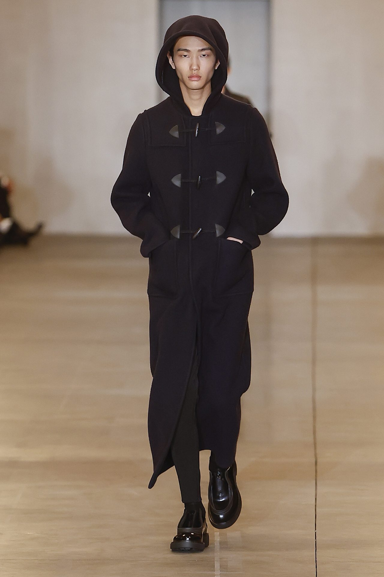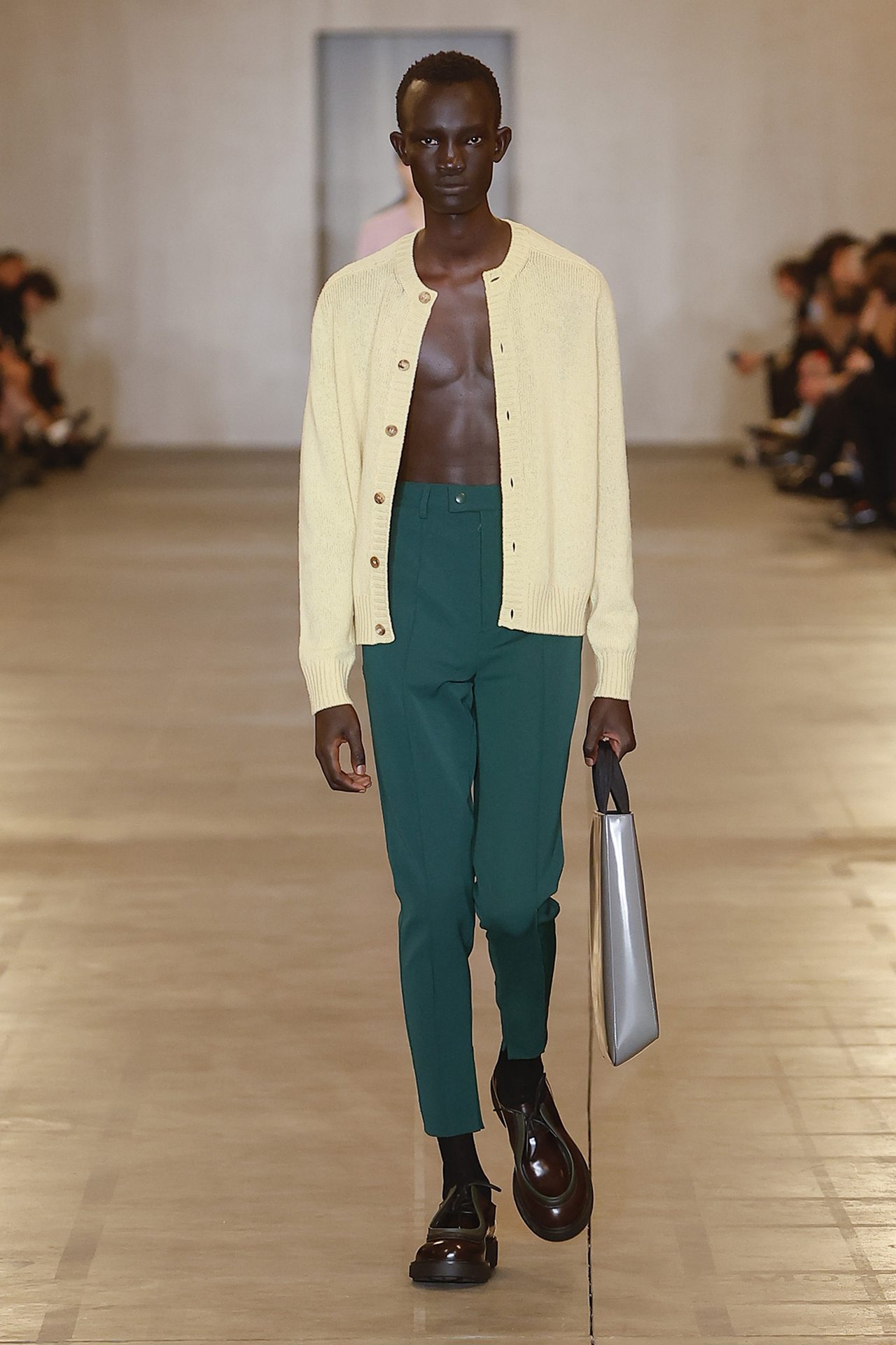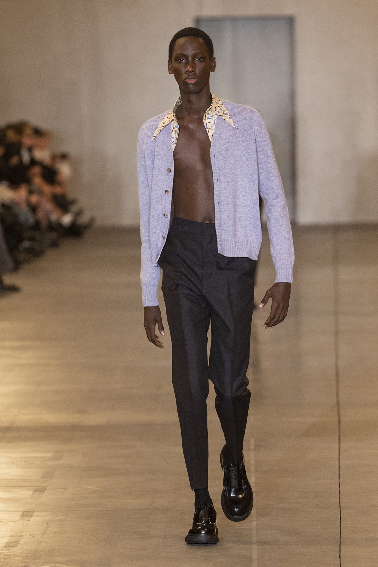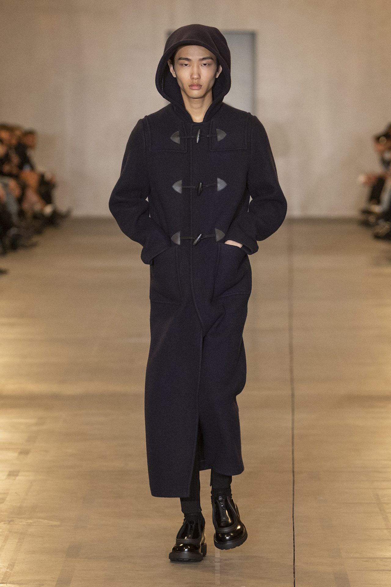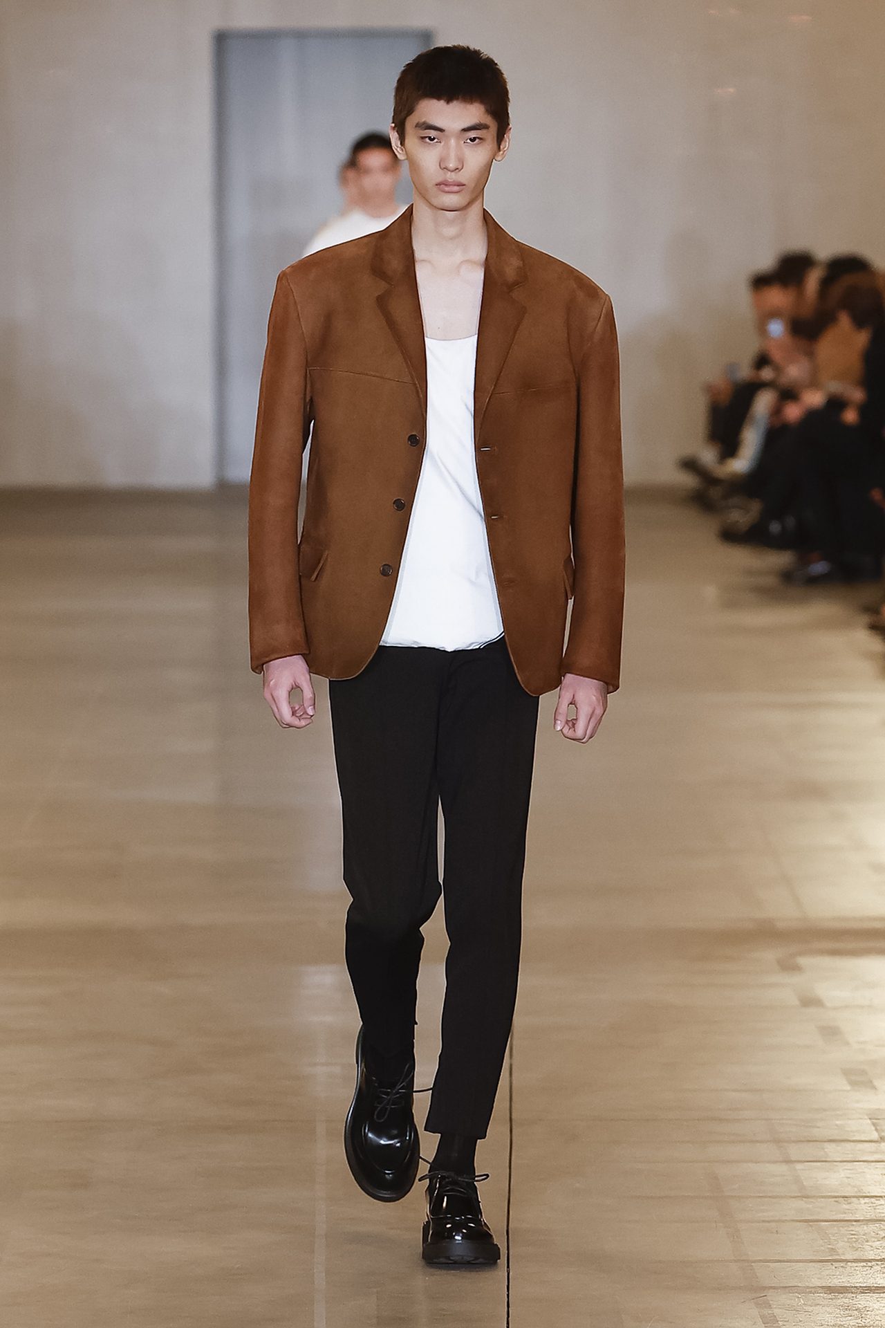 会場は、建築家の Rem Koolhaas (レム・コールハース) 率いる AMO が手掛けたプラダ財団の Deposito ショースペース。ショーでは、天井がゆっくりと上昇し、親密な空間が壮大な空間へと変化した。スケールが変わることでウェアに対しての視点も変化させるこの演出は、長く伸びていたり、短く切り詰められたウェアそのものと呼応する。