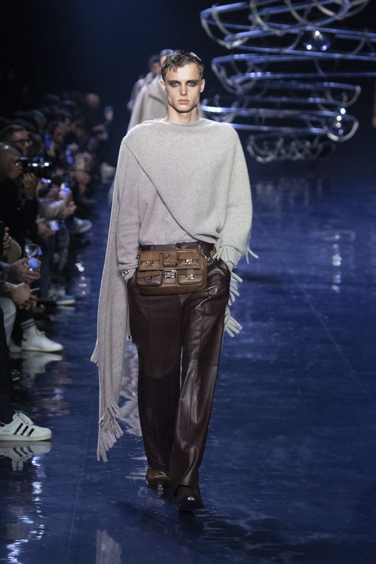 ファーストルックで登場したのは、カシミアのコクーニングなコート。コレクションを代表するアシンメトリーなデザインで、肩から流れるドレープの美しさが際立っている。続いてのルックも、一方の肩をあらわにしたアシンメトリーなセーターベスト。すっきりとしたブラックのトラウザーで締めつつ、今季のトレンドでもあるフェミニンとマスキュリンを掛け合わせたようなコーディネートとなった。このワンショルダーアイテムは、コレクション全体を通してトップスやインナーとしても着用された。さらに、「O’ Lock (オーロック) ジッパー」を使ったブランケットコートとポンチョは、リブ編みのカシミアトラックウェアを包み込み、滑らかなトラウザーにはドレープを描くスカート、ささやかで軽やかな光沢のジャケットには、フリース素材の「FF」ロゴがあしらわれた重さのあるロングベストを重ねるなど、実用性と技巧の間を行き来するレイヤードが際立っている。