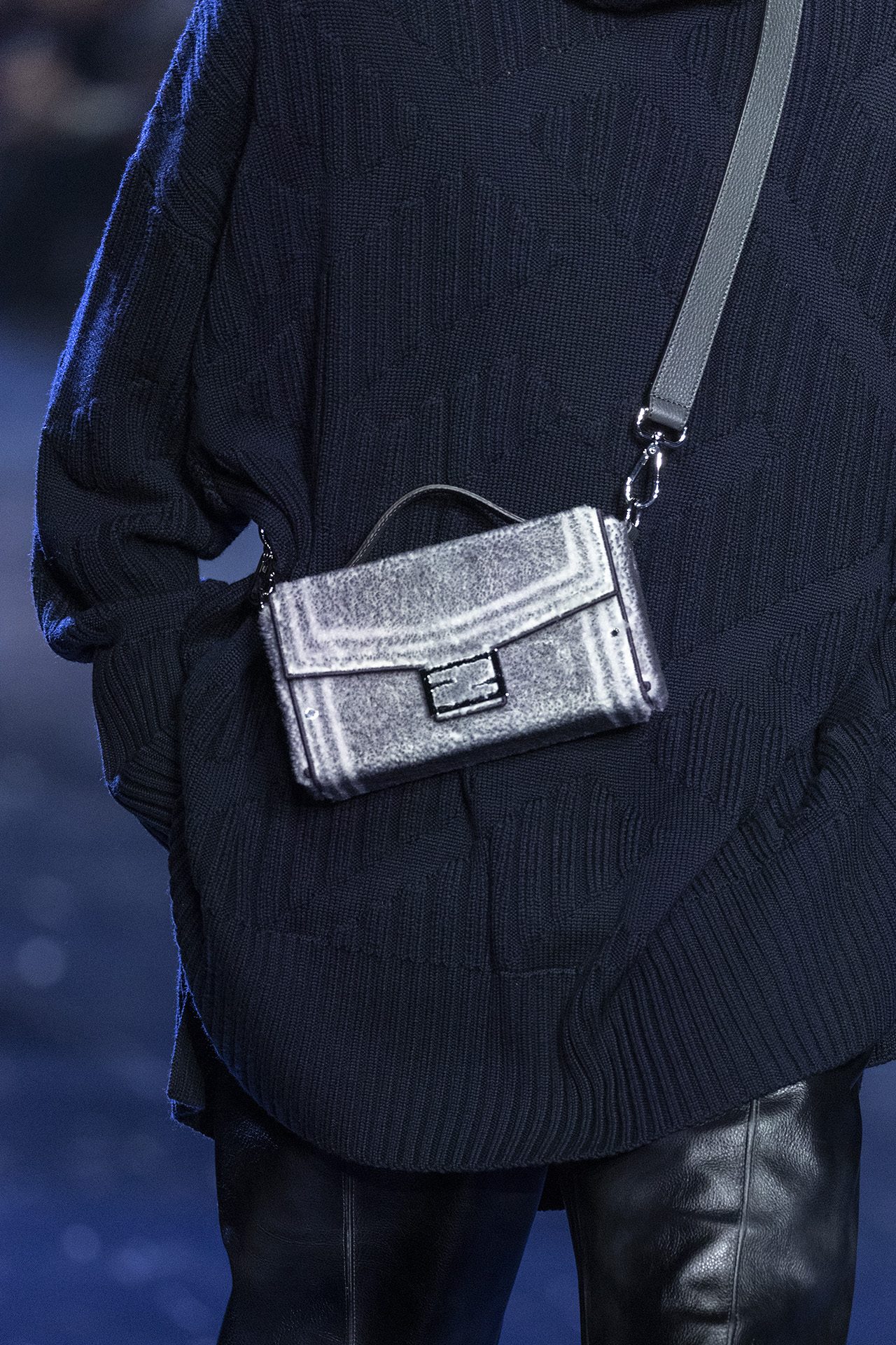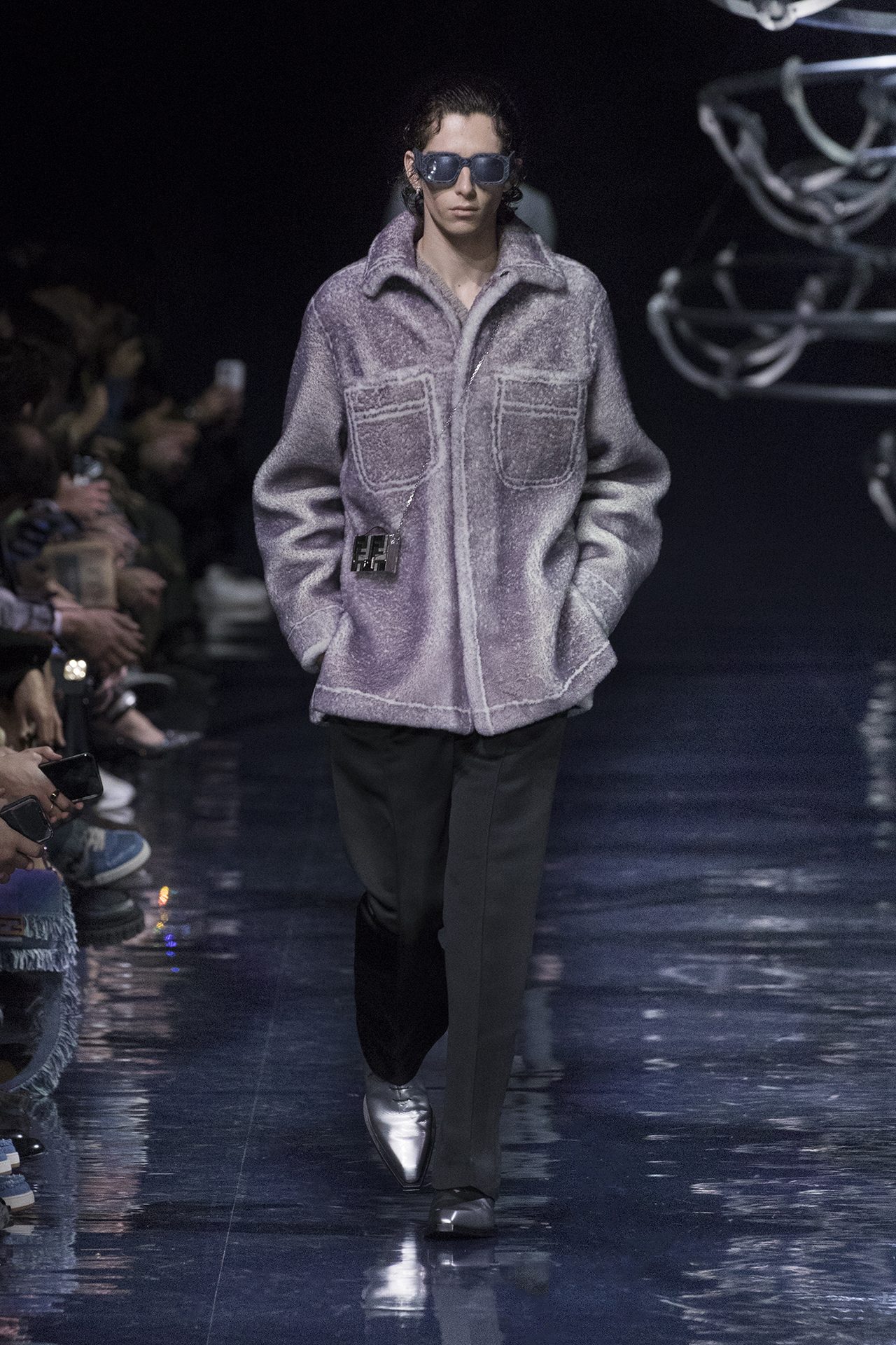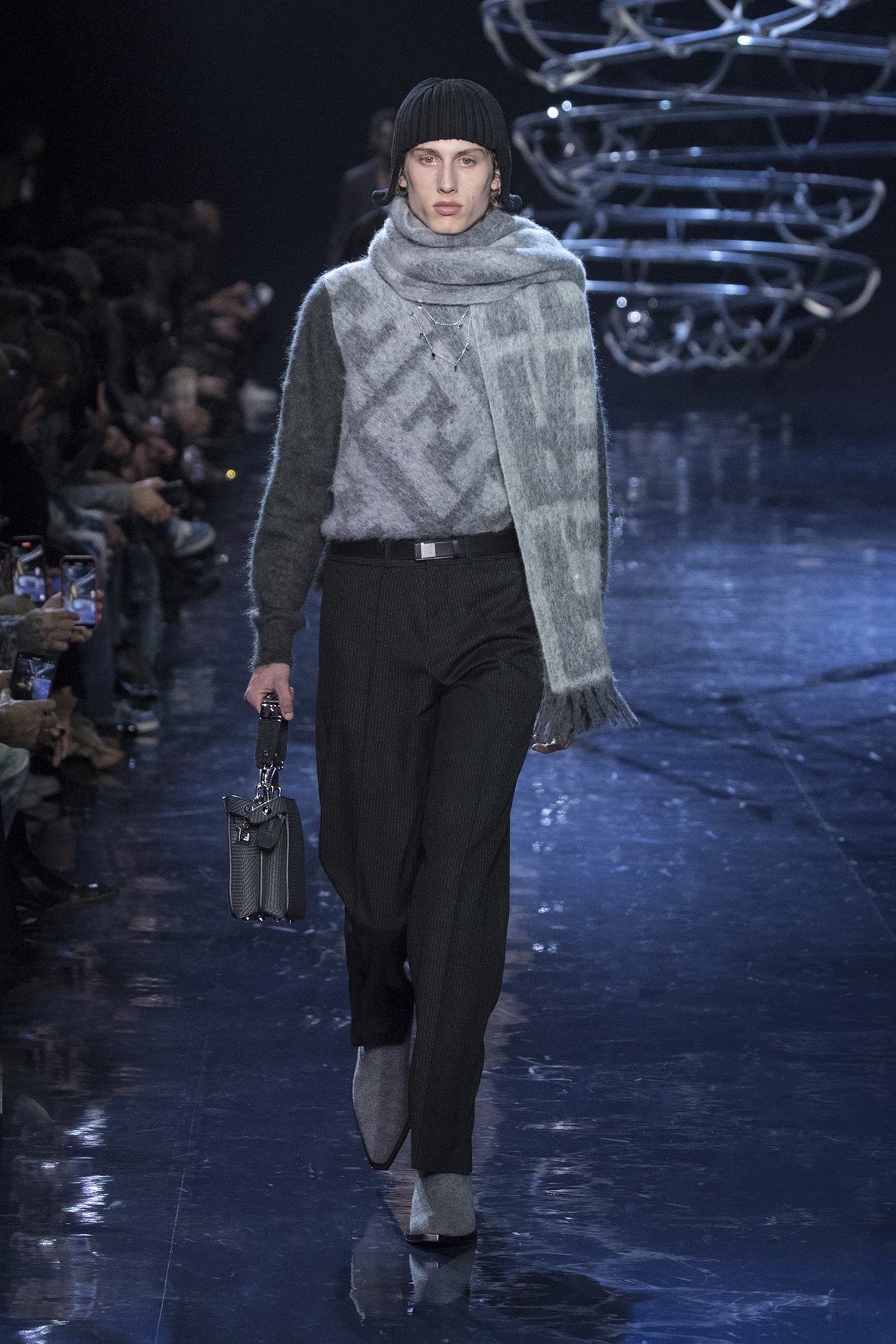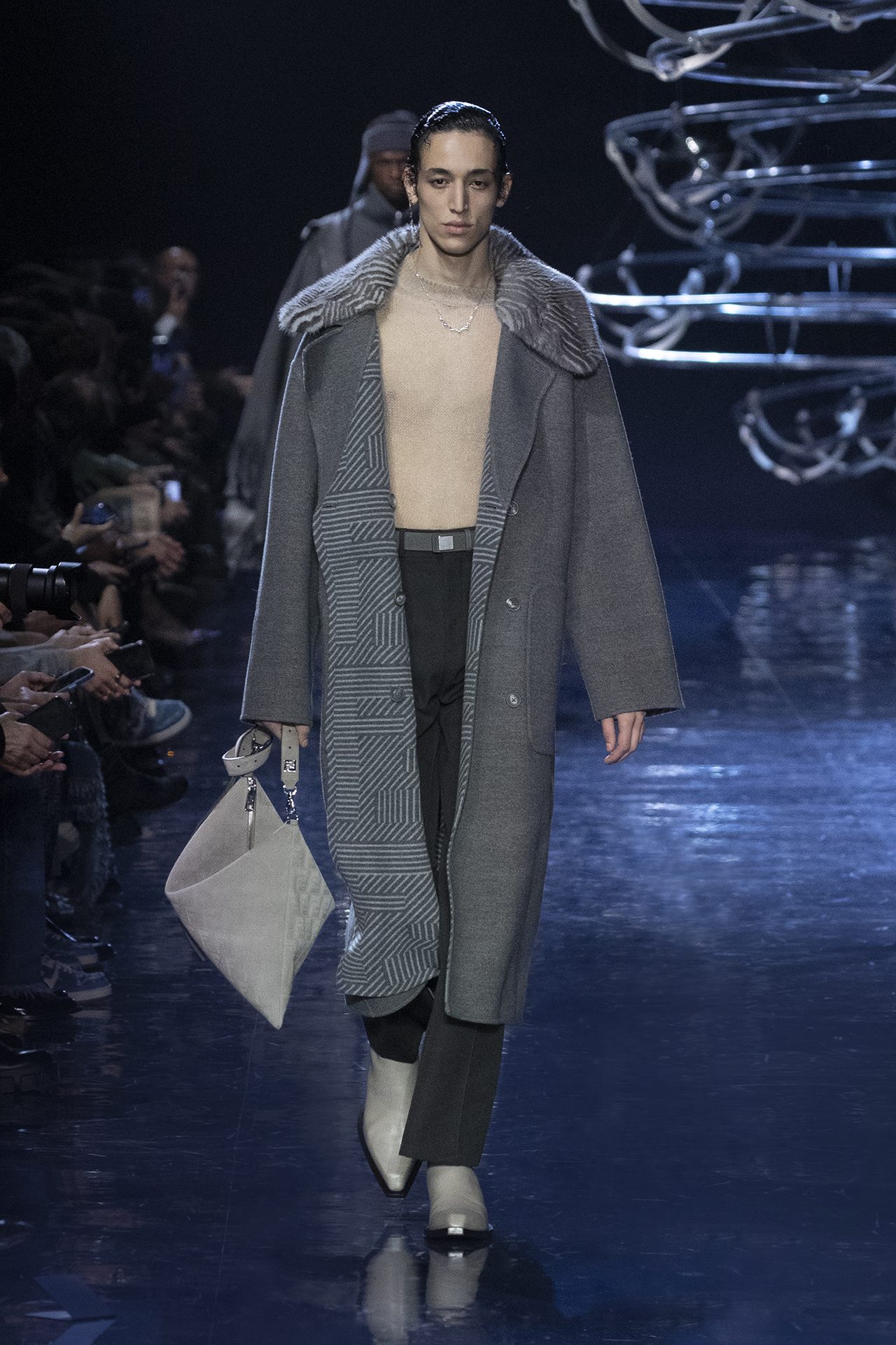 身体を包み込むような温もりを感じさせるアウターウェアとは対照的に、前側や肩部分がざっくりと開いた脱構築的なデザインのシャツも登場。エッジの効いたカッティングで、コーディネートにアクセントが加えられる。また、幾何学的な模様が織りなす「FENDI Shadow (フェンディ シャドウ)」は、アウターの表地や裏地、ピンストライプのスーツ、モヘアスカーフやブランケット、バッグ、さらにはカフスやペンダントなどにも配され、存在感を放った。