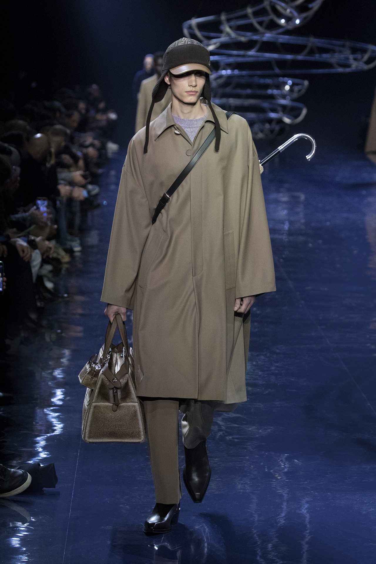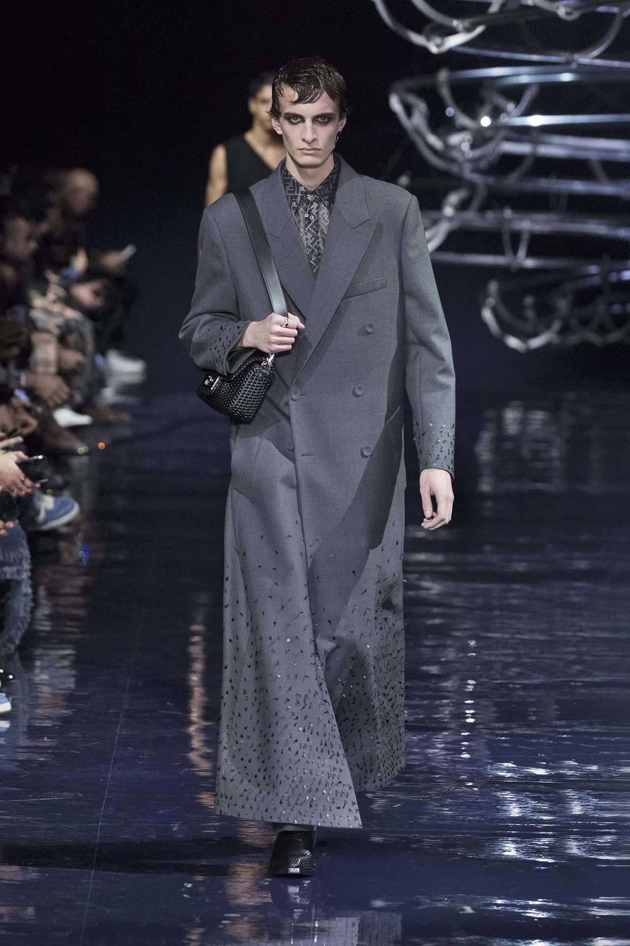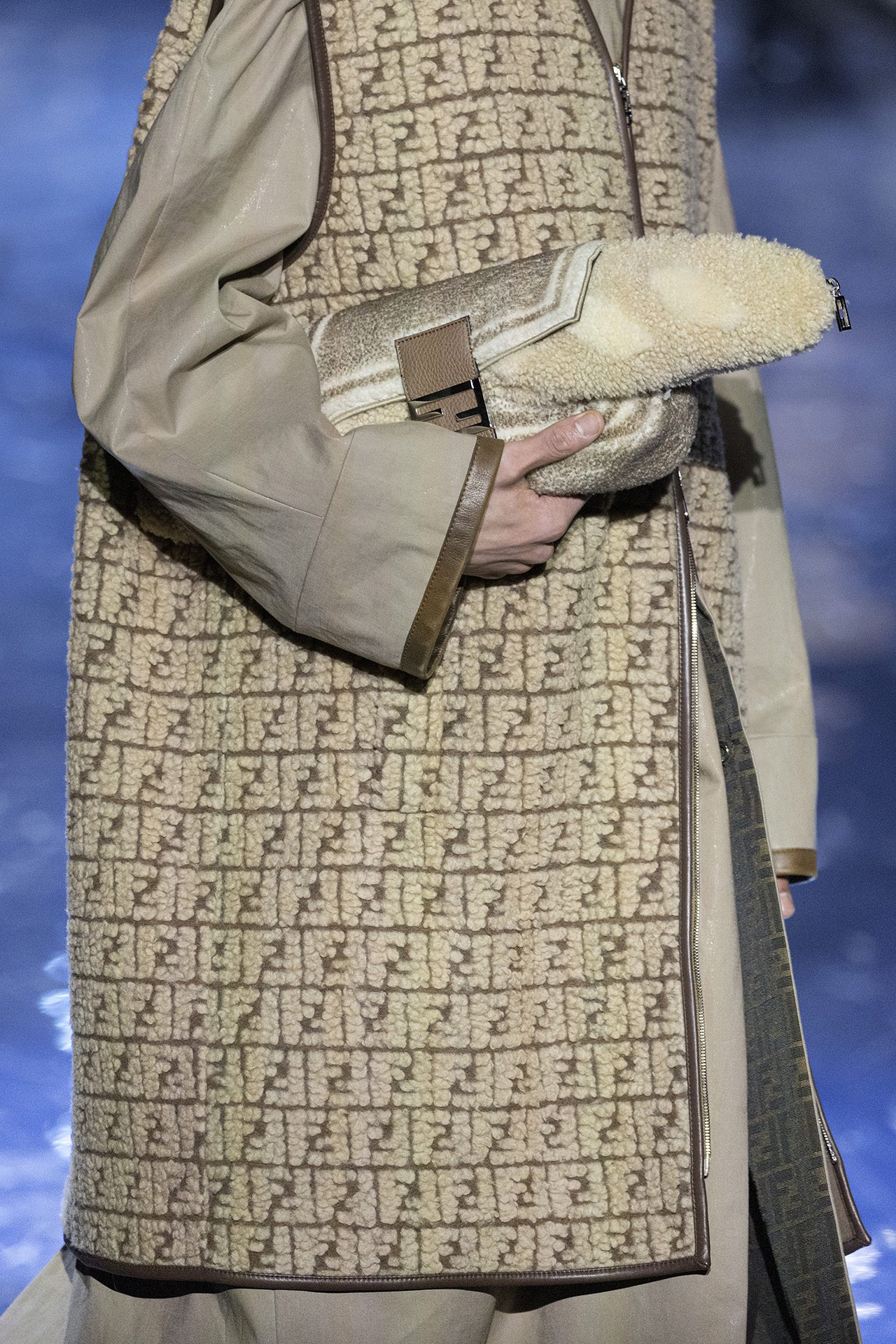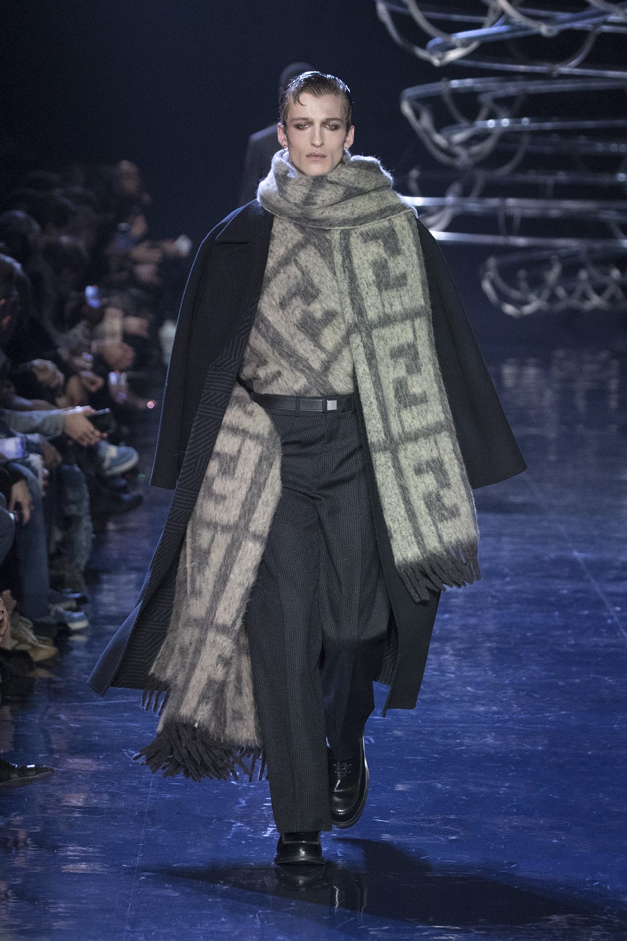 身体を包み込むような温もりを感じさせるアウターウェアとは対照的に、前側や肩部分がざっくりと開いた脱構築的なデザインのシャツも登場。エッジの効いたカッティングで、コーディネートにアクセントが加えられる。また、幾何学的な模様が織りなす「FENDI Shadow (フェンディ シャドウ)」は、アウターの表地や裏地、ピンストライプのスーツ、モヘアスカーフやブランケット、バッグ、さらにはカフスやペンダントなどにも配され、存在感を放った。