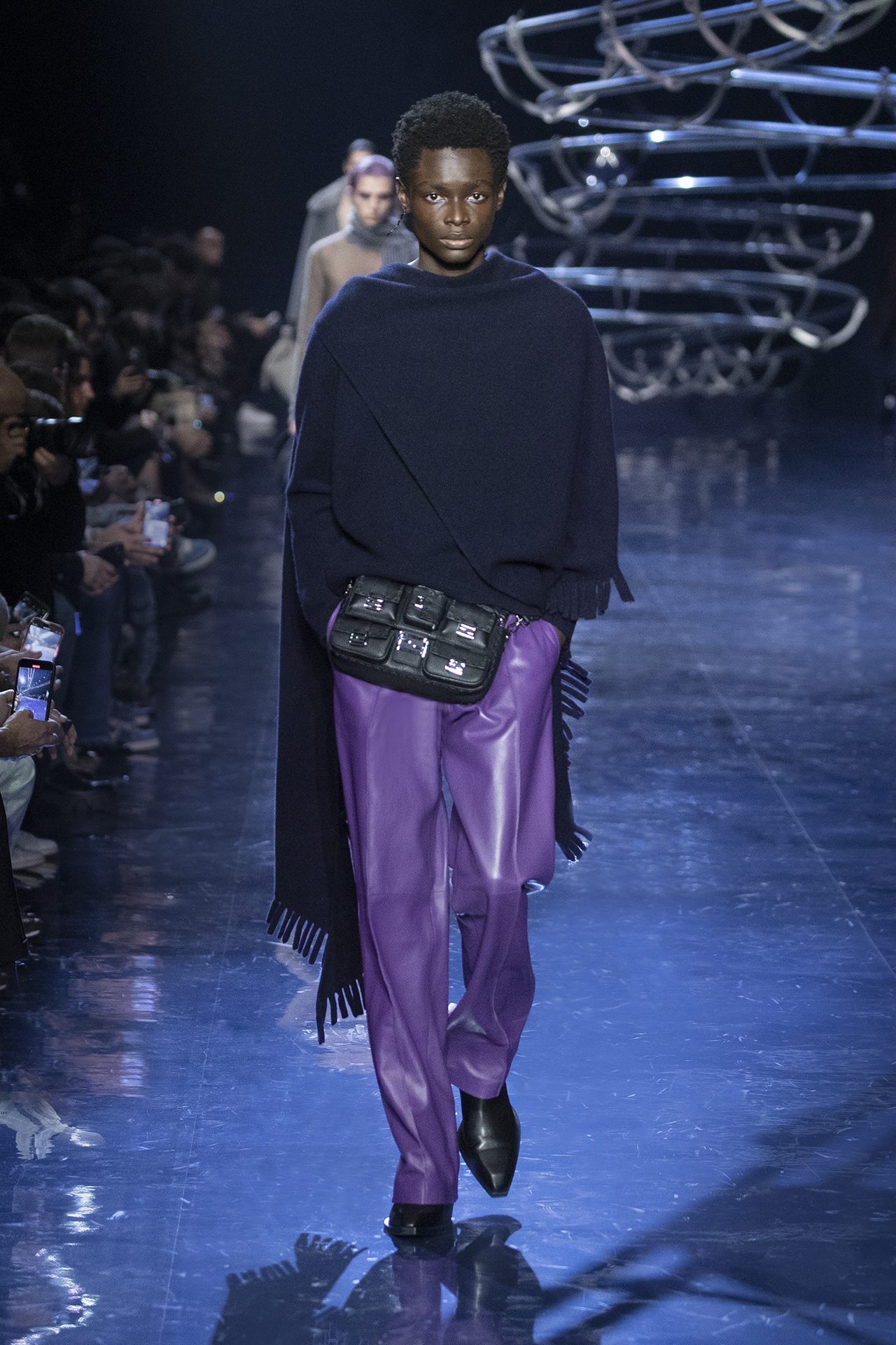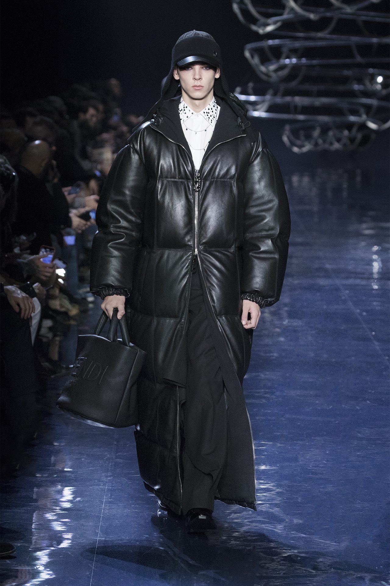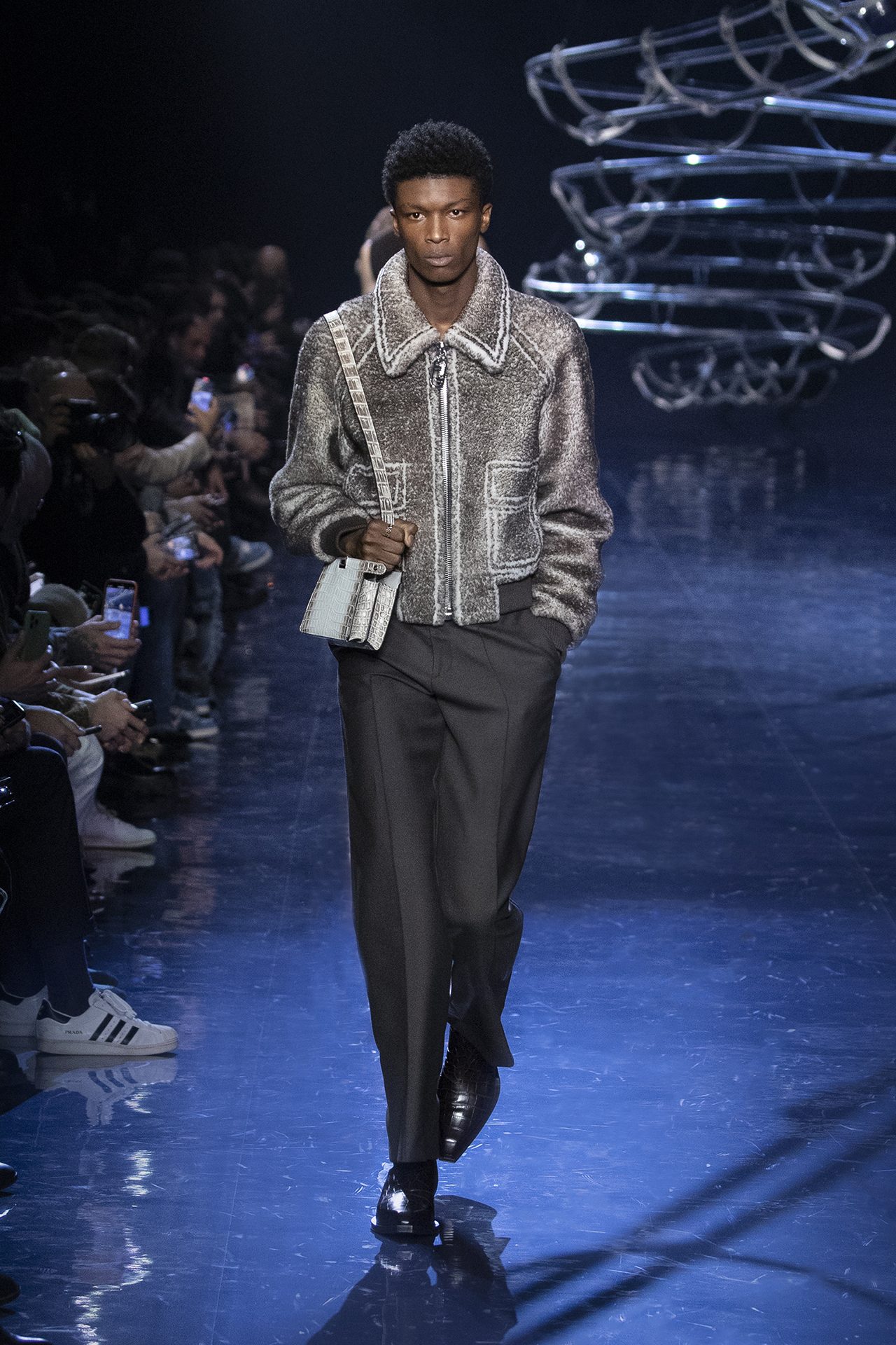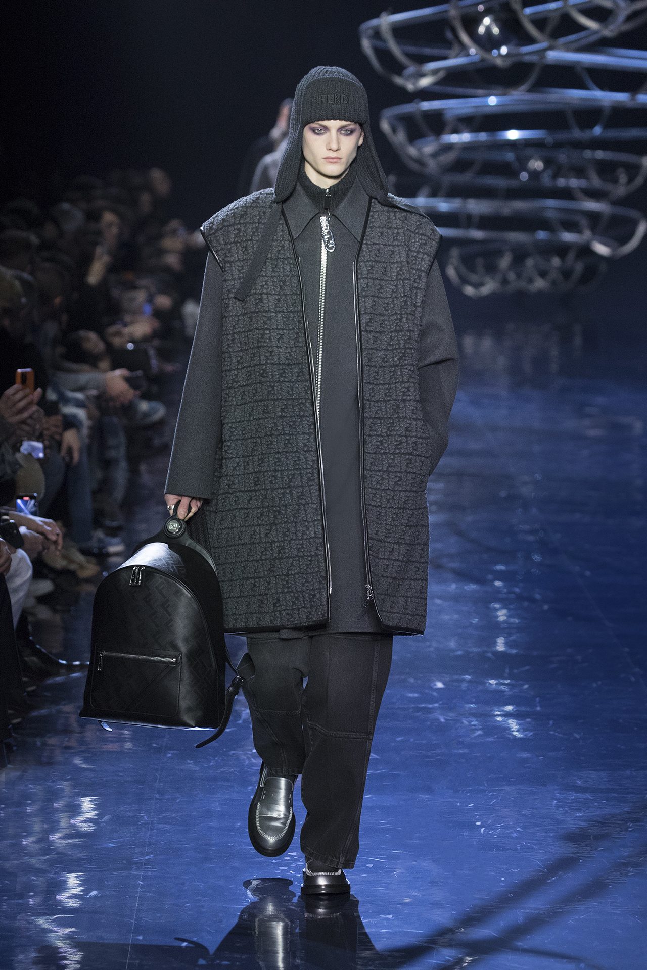 身体を包み込むような温もりを感じさせるアウターウェアとは対照的に、前側や肩部分がざっくりと開いた脱構築的なデザインのシャツも登場。エッジの効いたカッティングで、コーディネートにアクセントが加えられる。また、幾何学的な模様が織りなす「FENDI Shadow (フェンディ シャドウ)」は、アウターの表地や裏地、ピンストライプのスーツ、モヘアスカーフやブランケット、バッグ、さらにはカフスやペンダントなどにも配され、存在感を放った。