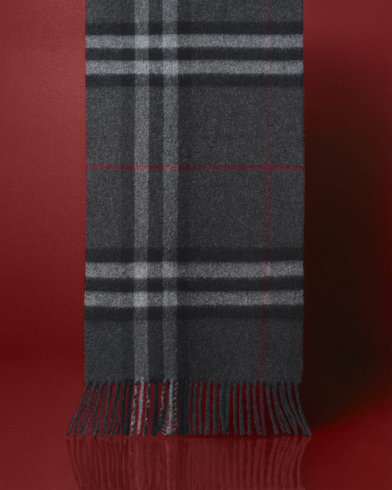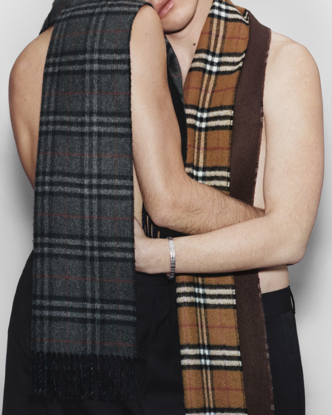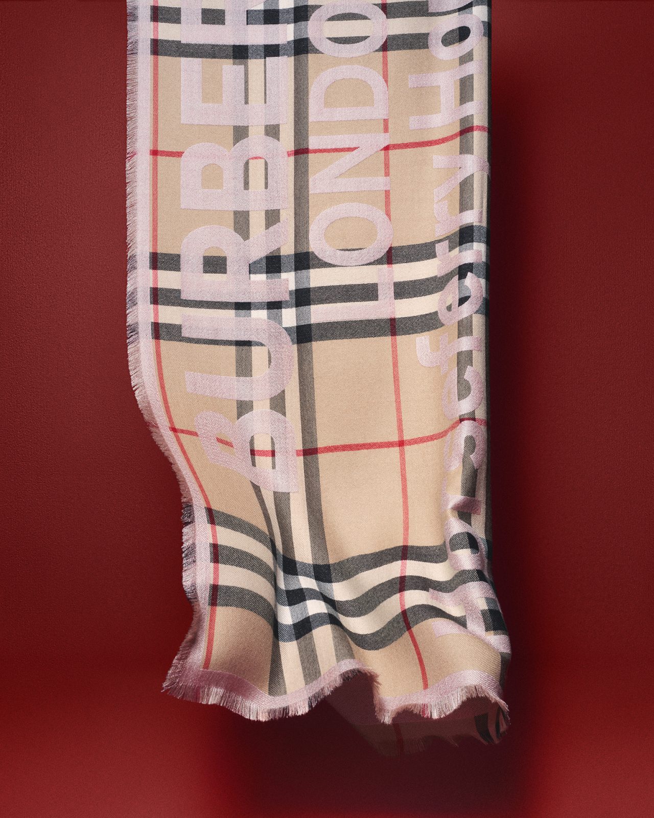ジャガード織りのカシミアとプリントが施されたシルクスカーフは、アーカイブベージュのバーバリーチェックにホースフェリーのグラフィックと桜のイラストが重ねられている。また、ウールブレンドのジャガードスカーフには、メタリックファイバーが織り込まれ、Burberry のロゴがあしらわれた。