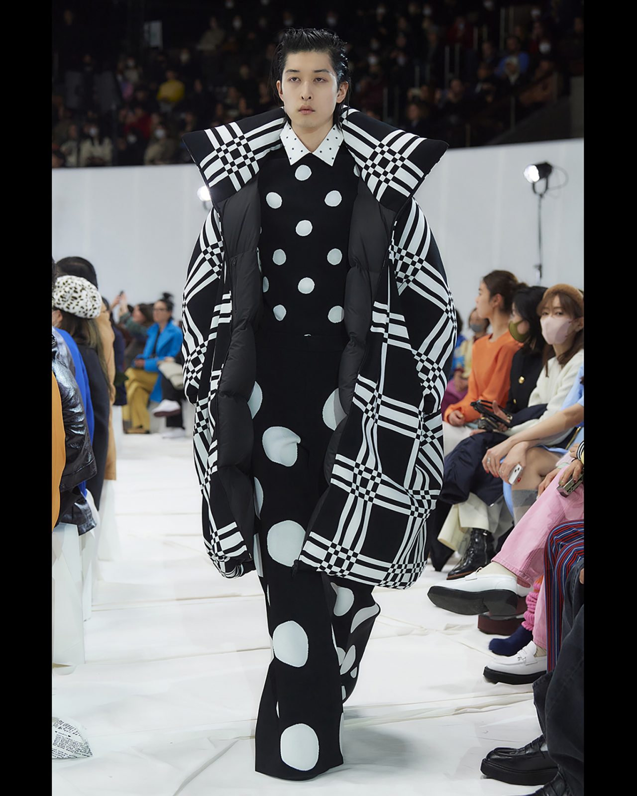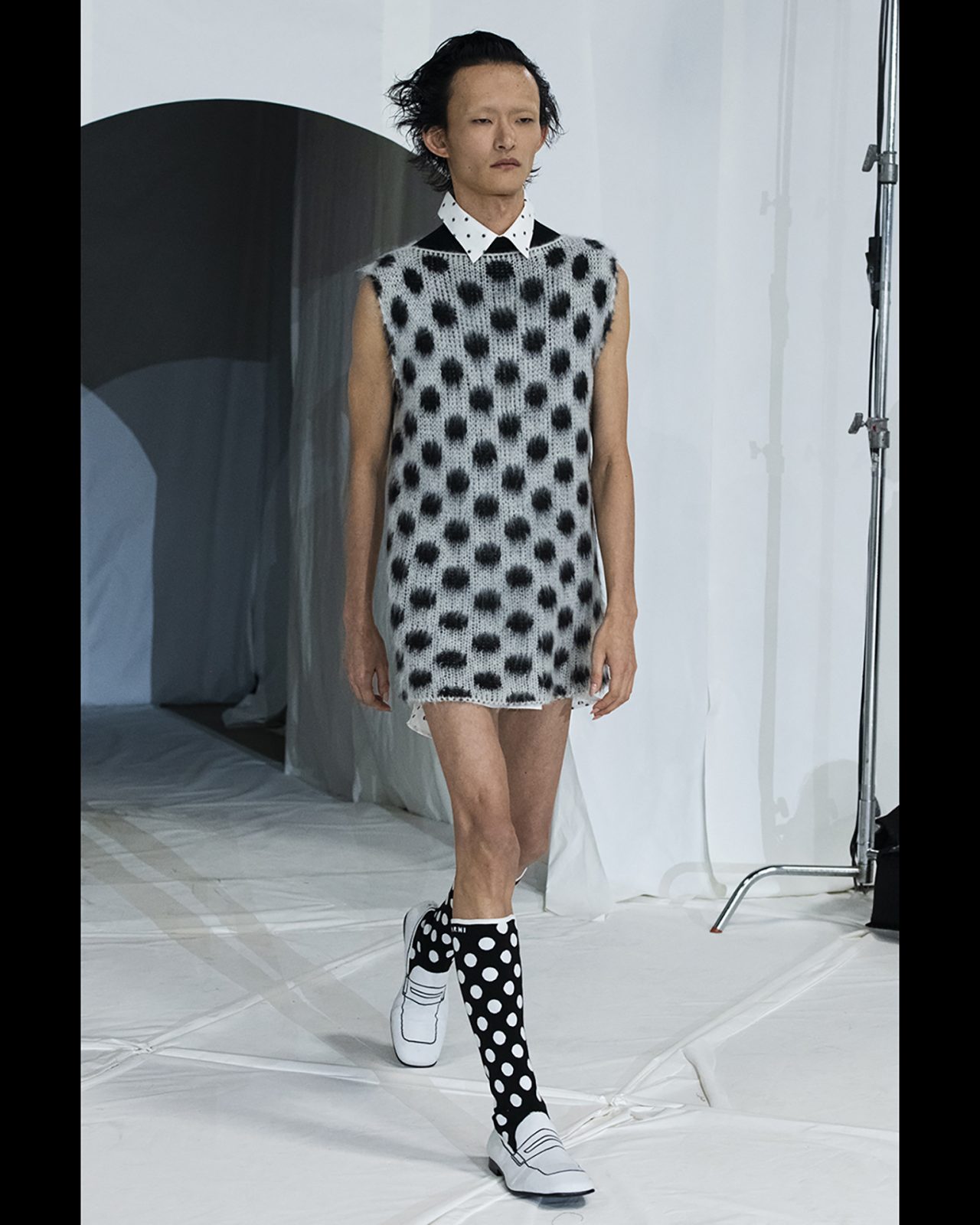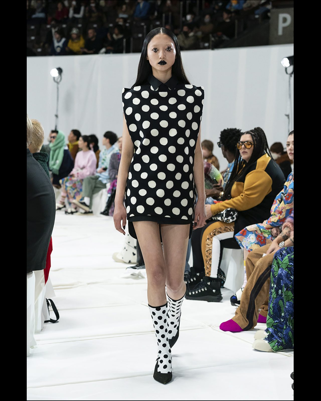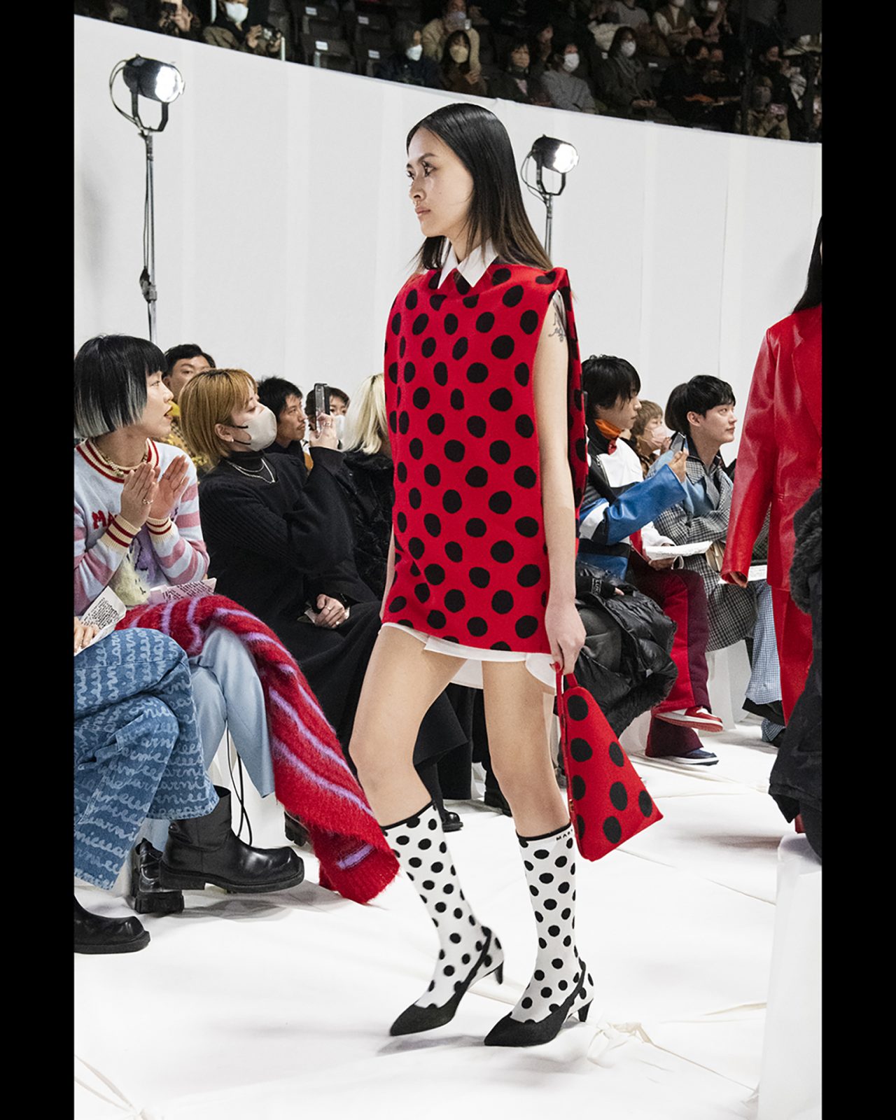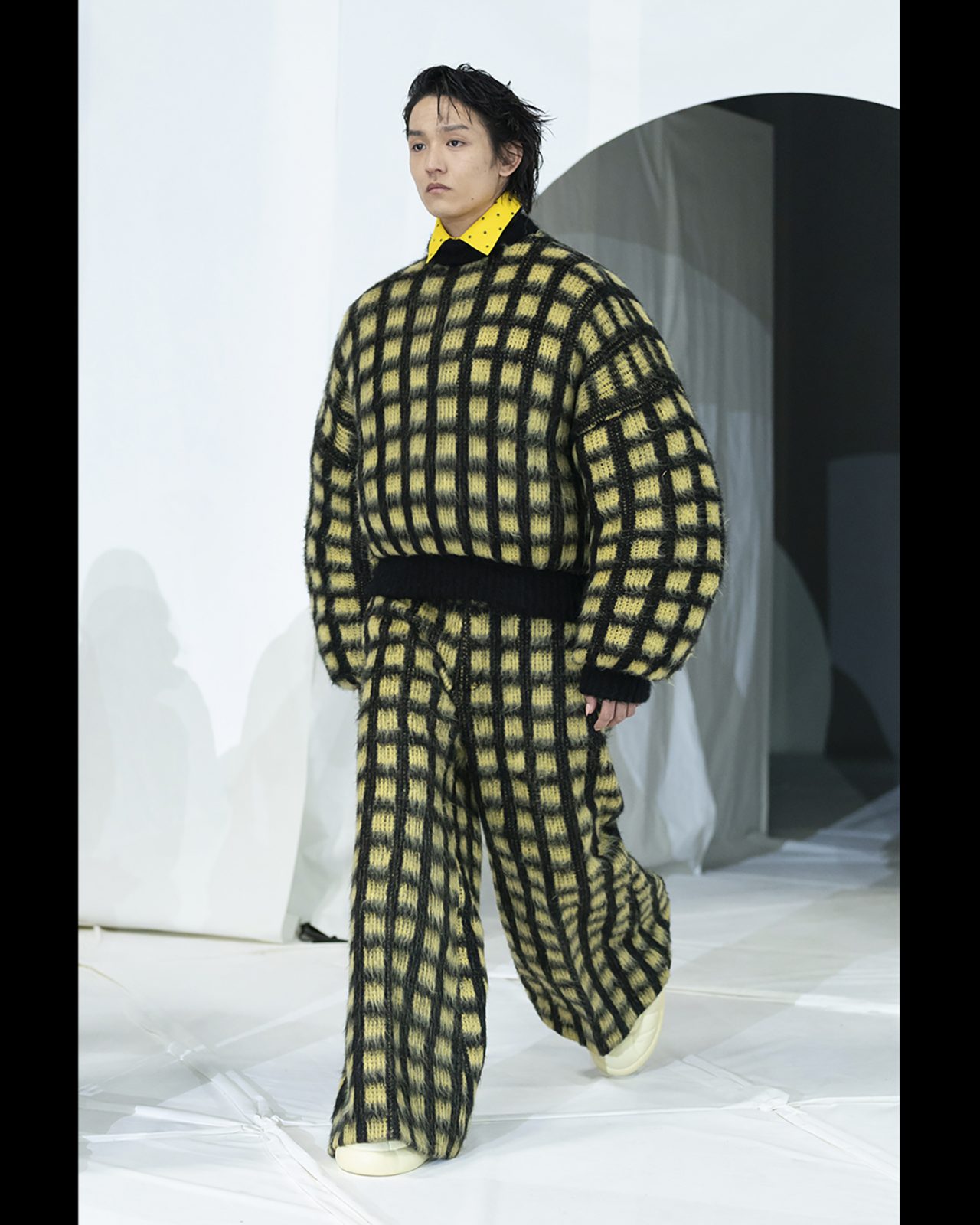 イエロー、レッド、ホワイト、ブラックといったカラーをベースに、ドットやストライプ、格子柄などの MARNI らしいグラフィックデザインが、純白のランウェイに映える。ボックス型のジャケットや脇が深くえぐられたような逆三角形のトップス、オフショルダーワンピースは袖が溜まるほどのオーバーサイズ、中国の若手デザイナー Dingyun Zhang (ディンユー・チャン) とコラボした大きなスタンドカラーのダウンジャケットなど、シルエットに緩急をつけたルックが登場した。ニット素材のダウンやスラックス、アシンメトリーな足元など、隋所に遊び心を感じさせる。