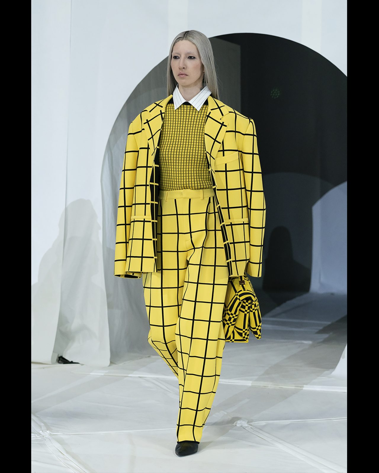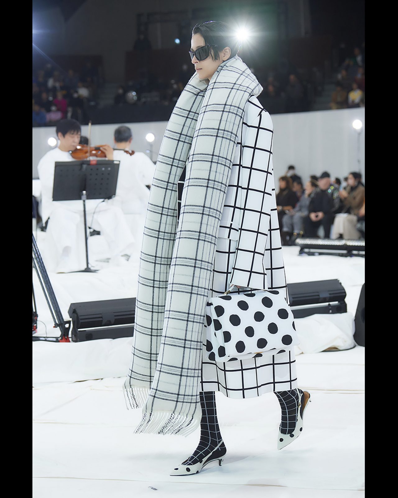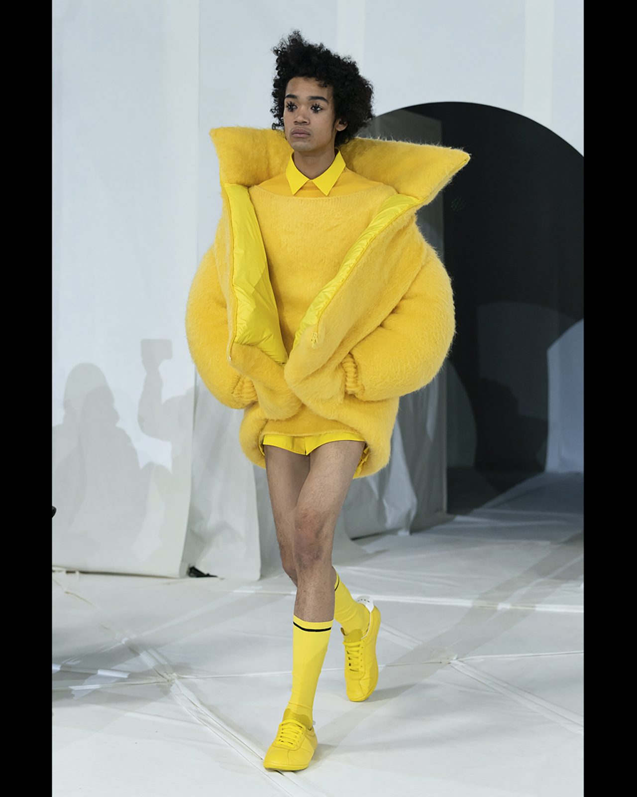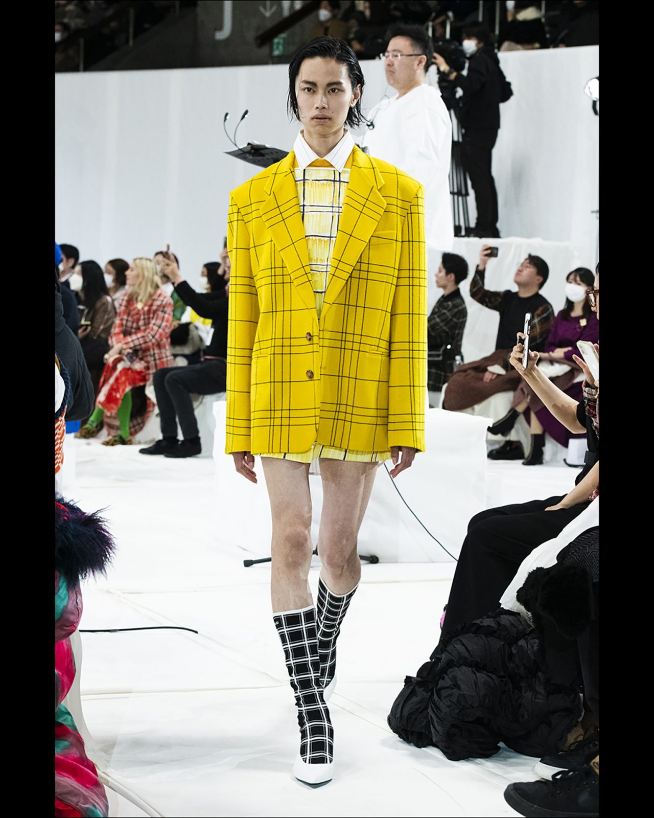 イエロー、レッド、ホワイト、ブラックといったカラーをベースに、ドットやストライプ、格子柄などの MARNI らしいグラフィックデザインが、純白のランウェイに映える。ボックス型のジャケットや脇が深くえぐられたような逆三角形のトップス、オフショルダーワンピースは袖が溜まるほどのオーバーサイズ、中国の若手デザイナー Dingyun Zhang (ディンユー・チャン) とコラボした大きなスタンドカラーのダウンジャケットなど、シルエットに緩急をつけたルックが登場した。ニット素材のダウンやスラックス、アシンメトリーな足元など、隋所に遊び心を感じさせる。