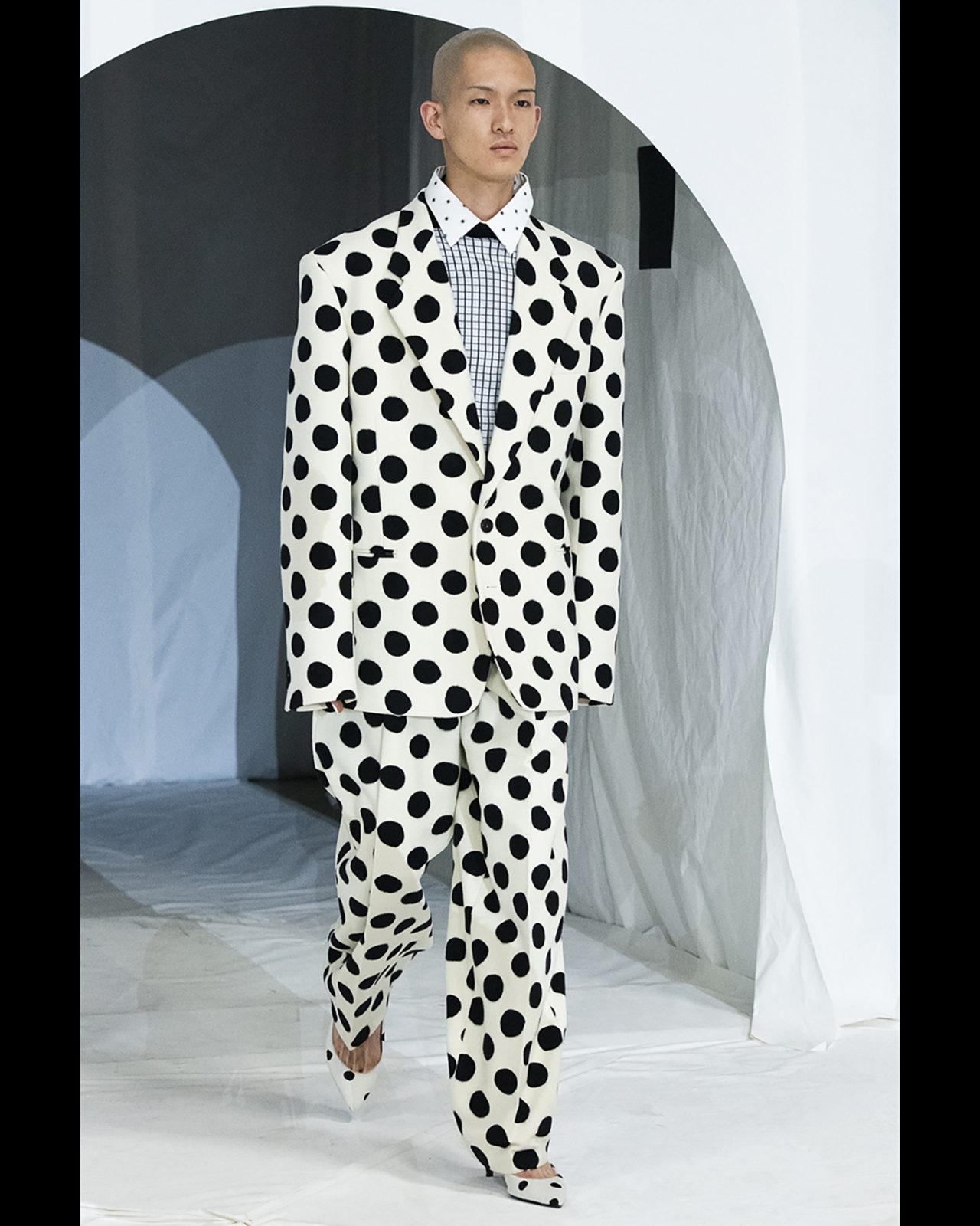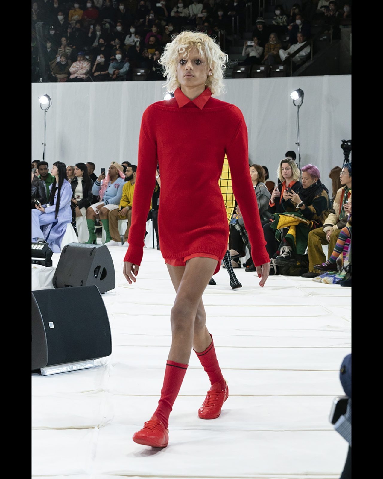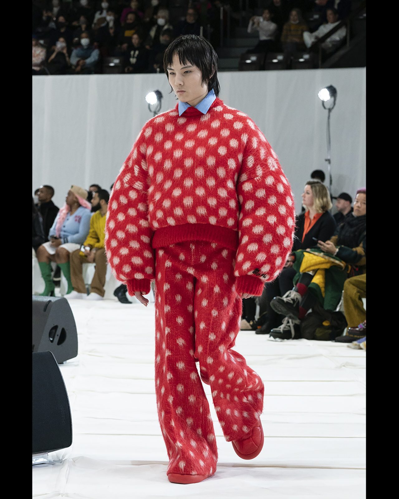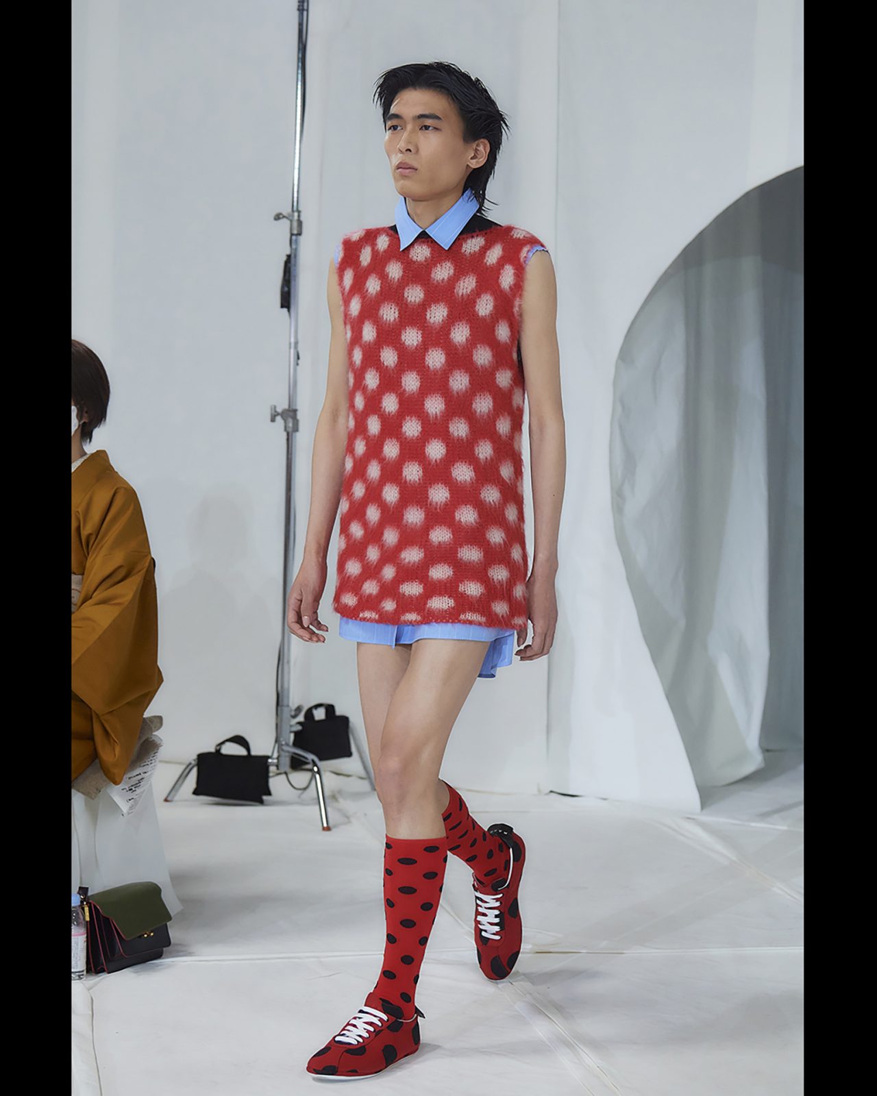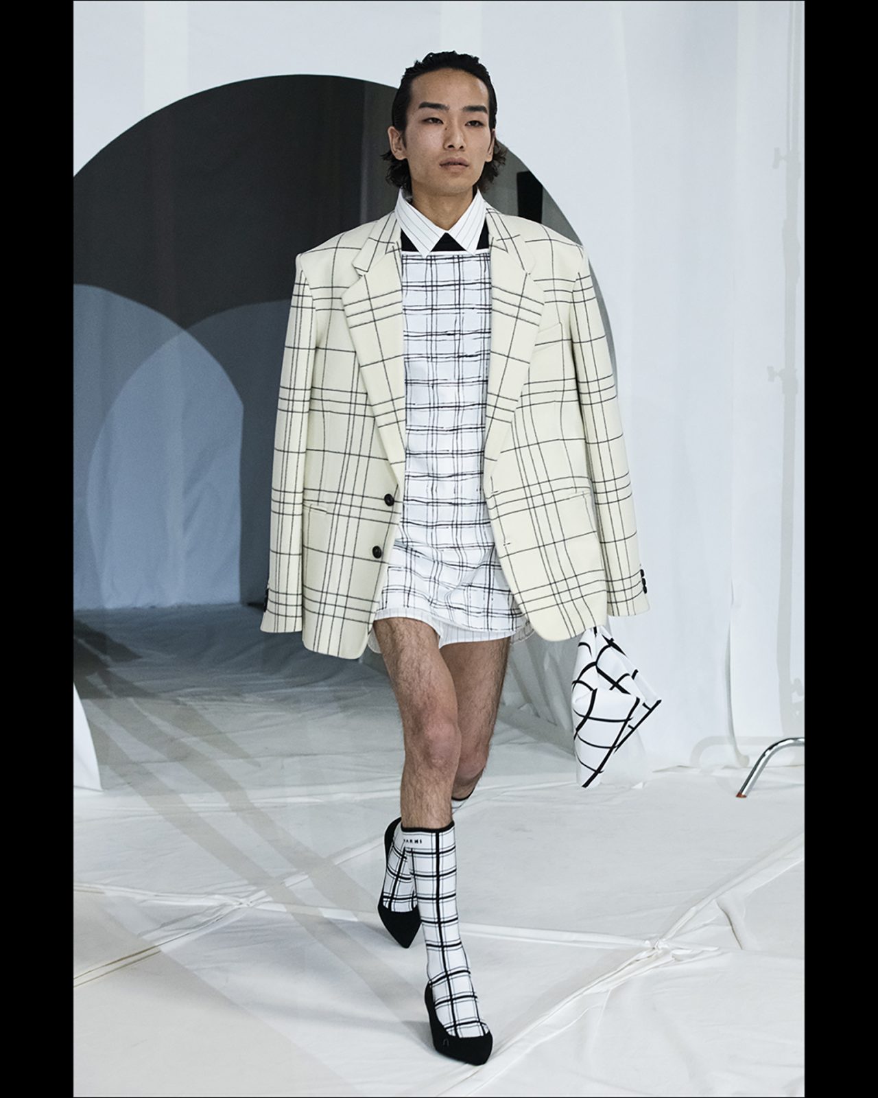 イエロー、レッド、ホワイト、ブラックといったカラーをベースに、ドットやストライプ、格子柄などの MARNI らしいグラフィックデザインが、純白のランウェイに映える。ボックス型のジャケットや脇が深くえぐられたような逆三角形のトップス、オフショルダーワンピースは袖が溜まるほどのオーバーサイズ、中国の若手デザイナー Dingyun Zhang (ディンユー・チャン) とコラボした大きなスタンドカラーのダウンジャケットなど、シルエットに緩急をつけたルックが登場した。ニット素材のダウンやスラックス、アシンメトリーな足元など、隋所に遊び心を感じさせる。