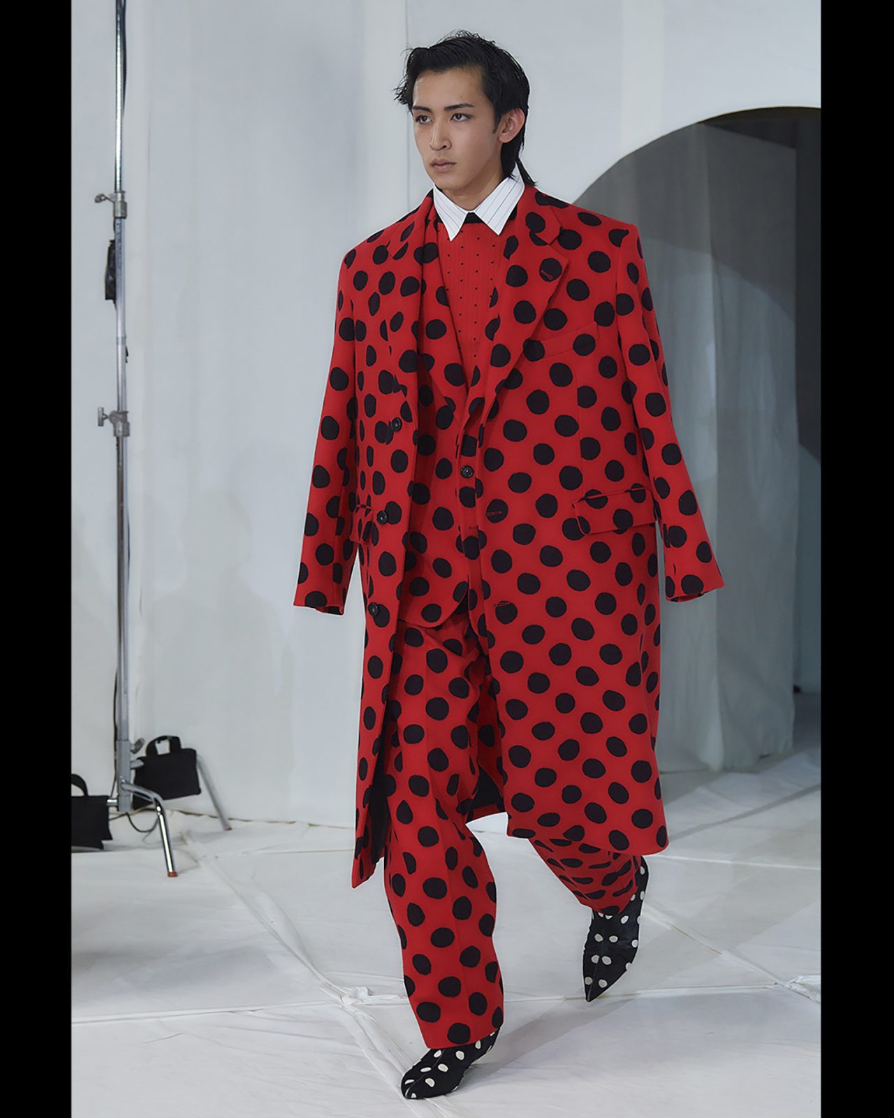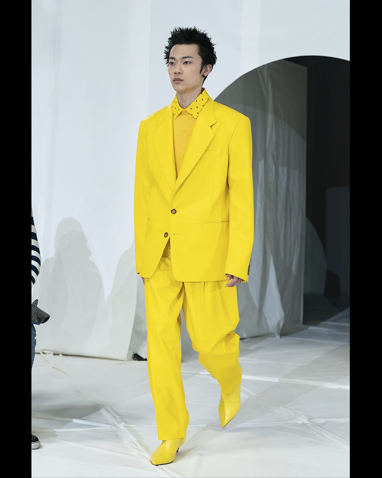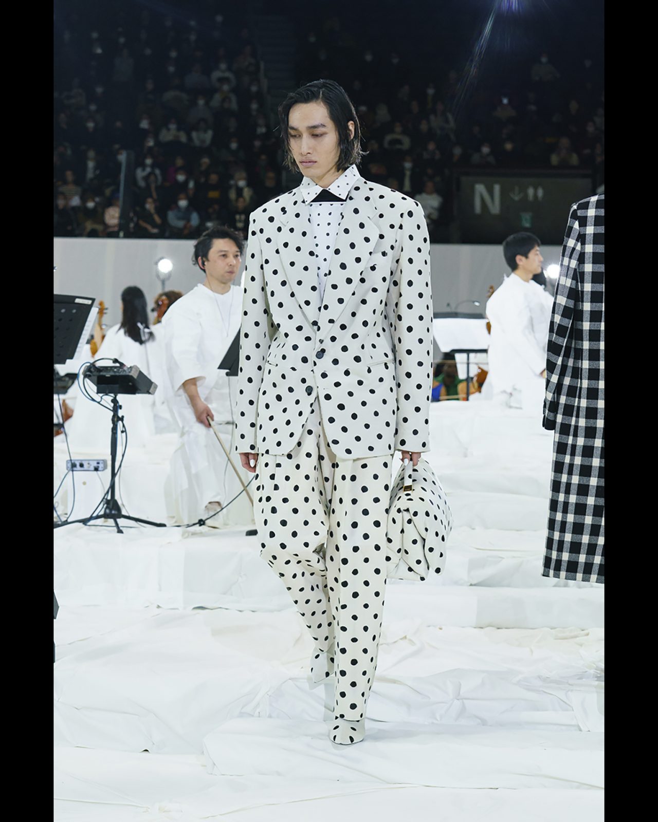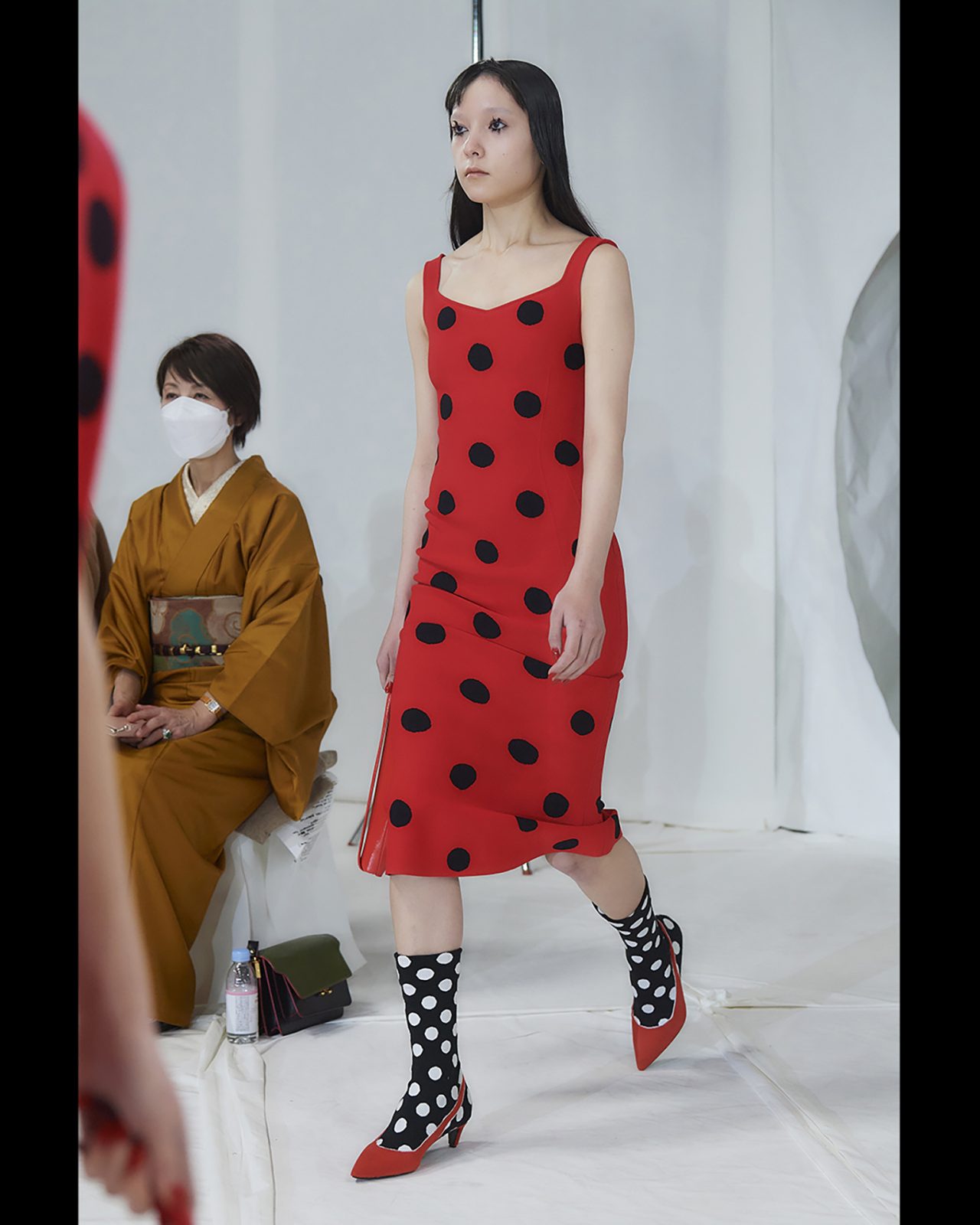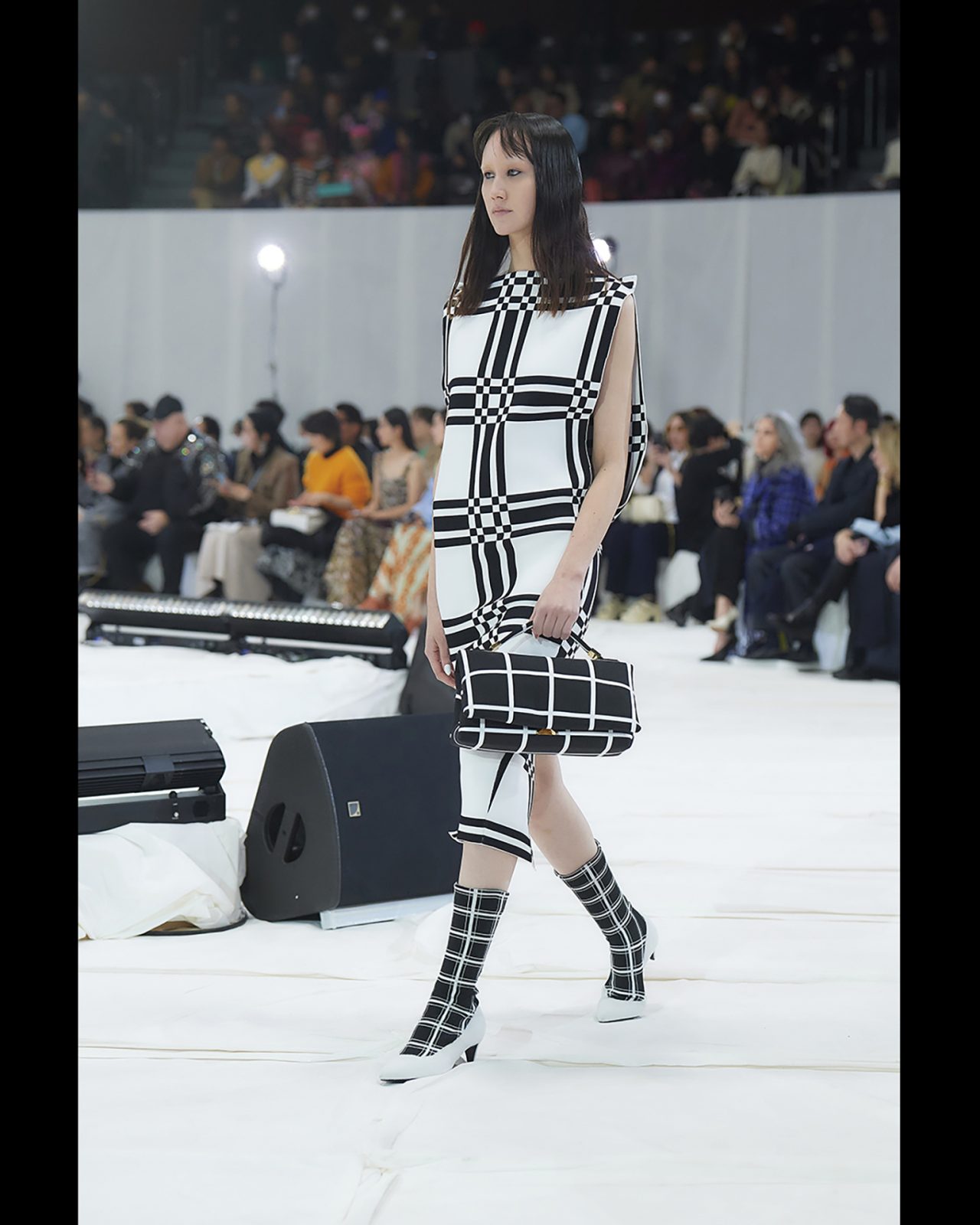 イエロー、レッド、ホワイト、ブラックといったカラーをベースに、ドットやストライプ、格子柄などの MARNI らしいグラフィックデザインが、純白のランウェイに映える。ボックス型のジャケットや脇が深くえぐられたような逆三角形のトップス、オフショルダーワンピースは袖が溜まるほどのオーバーサイズ、中国の若手デザイナー Dingyun Zhang (ディンユー・チャン) とコラボした大きなスタンドカラーのダウンジャケットなど、シルエットに緩急をつけたルックが登場した。ニット素材のダウンやスラックス、アシンメトリーな足元など、隋所に遊び心を感じさせる。
