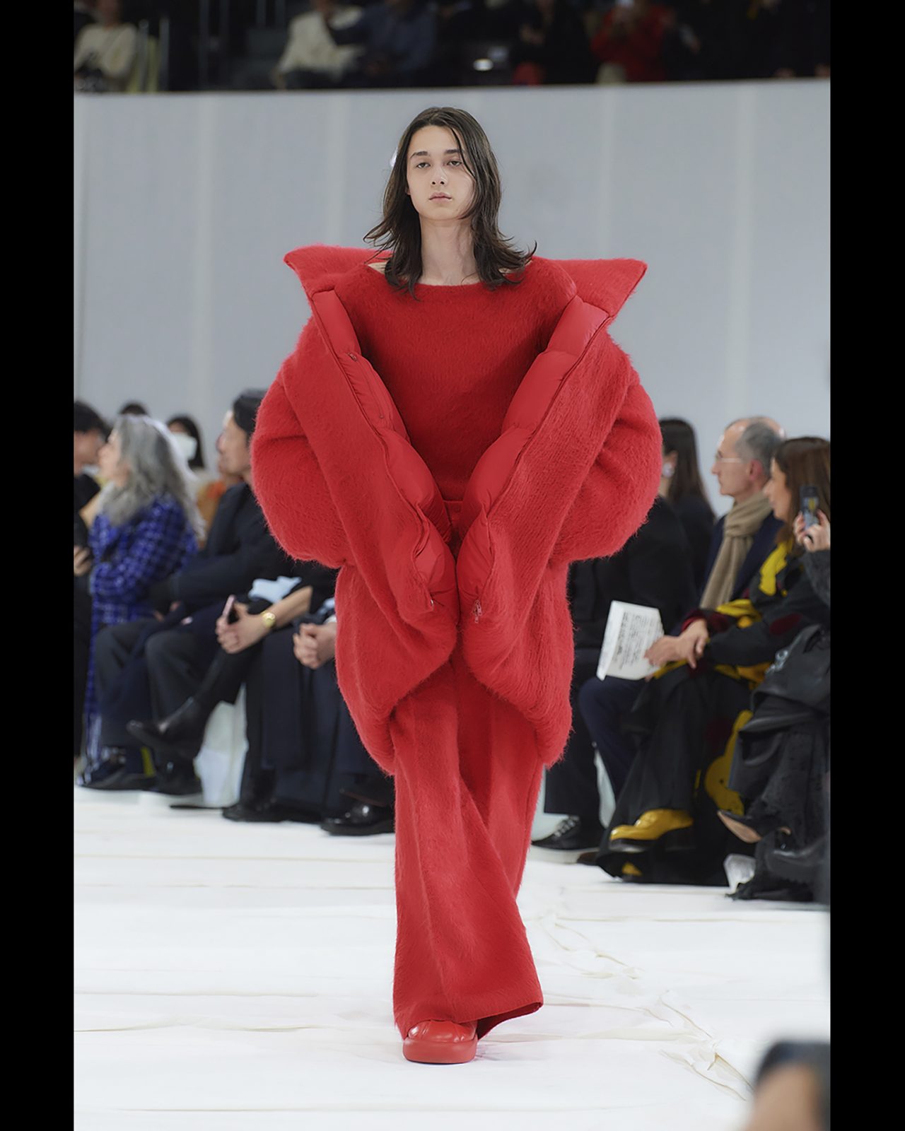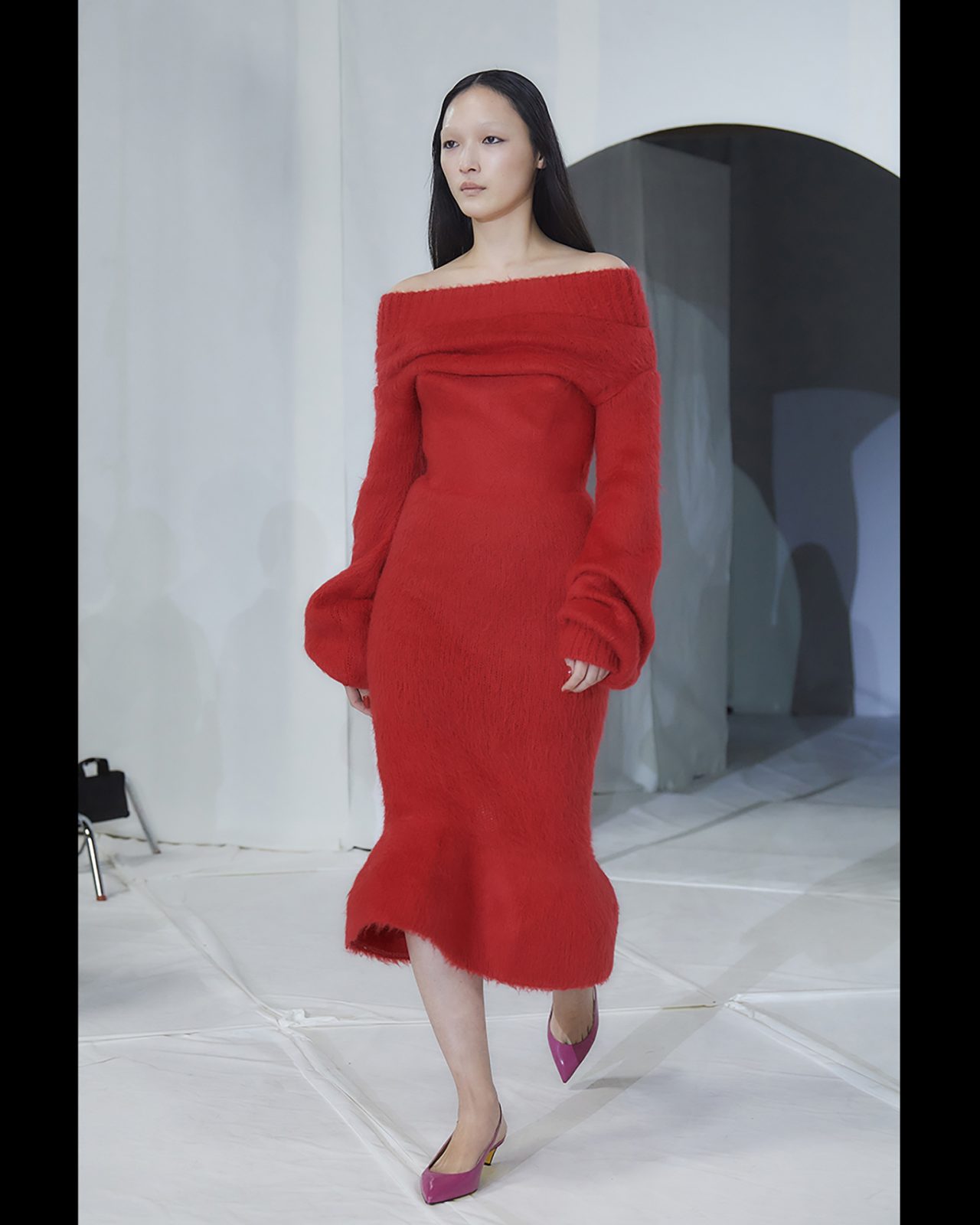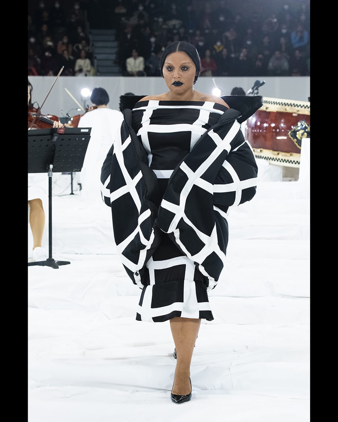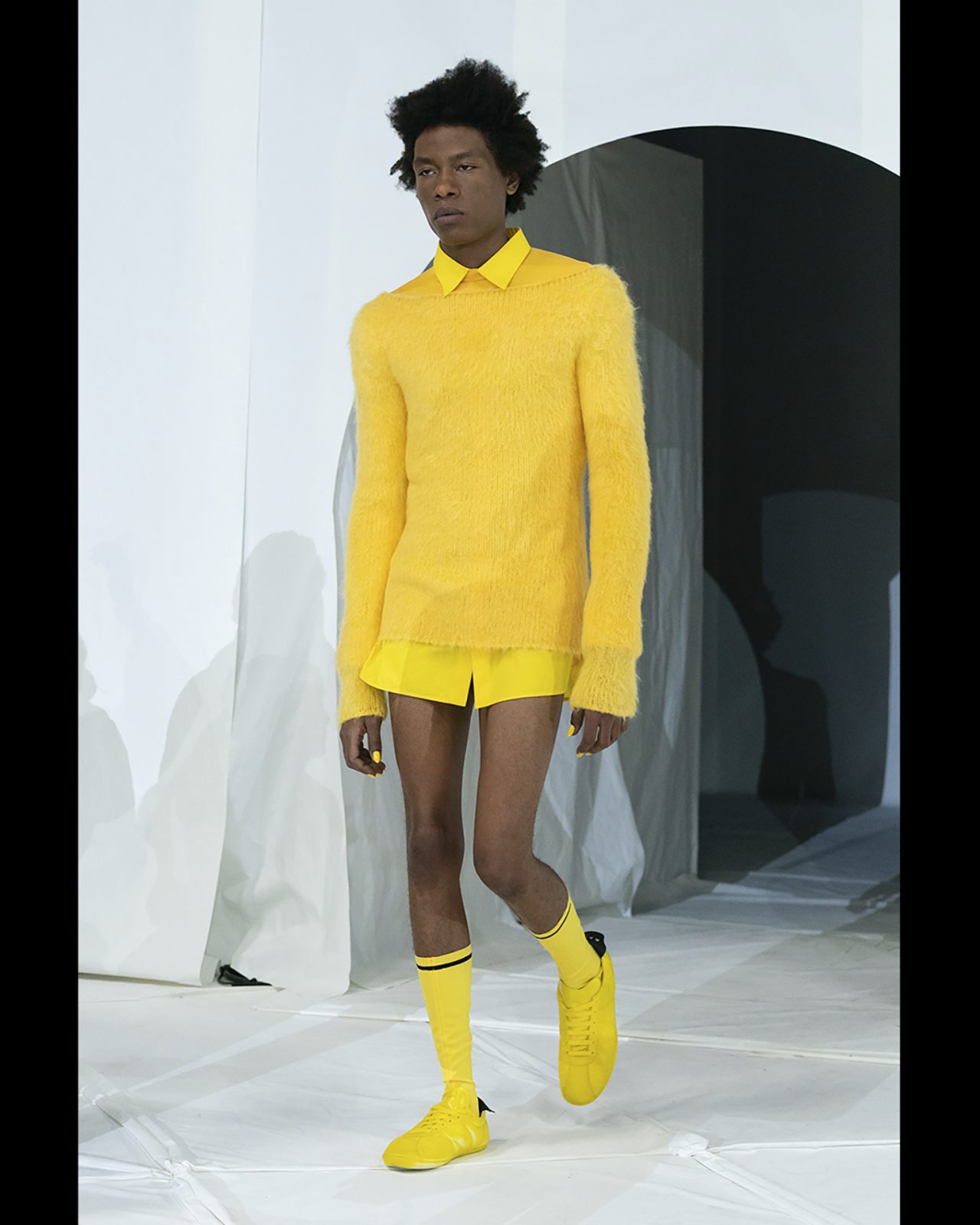 イエロー、レッド、ホワイト、ブラックといったカラーをベースに、ドットやストライプ、格子柄などの MARNI らしいグラフィックデザインが、純白のランウェイに映える。ボックス型のジャケットや脇が深くえぐられたような逆三角形のトップス、オフショルダーワンピースは袖が溜まるほどのオーバーサイズ、中国の若手デザイナー Dingyun Zhang (ディンユー・チャン) とコラボした大きなスタンドカラーのダウンジャケットなど、シルエットに緩急をつけたルックが登場した。ニット素材のダウンやスラックス、アシンメトリーな足元など、隋所に遊び心を感じさせる。