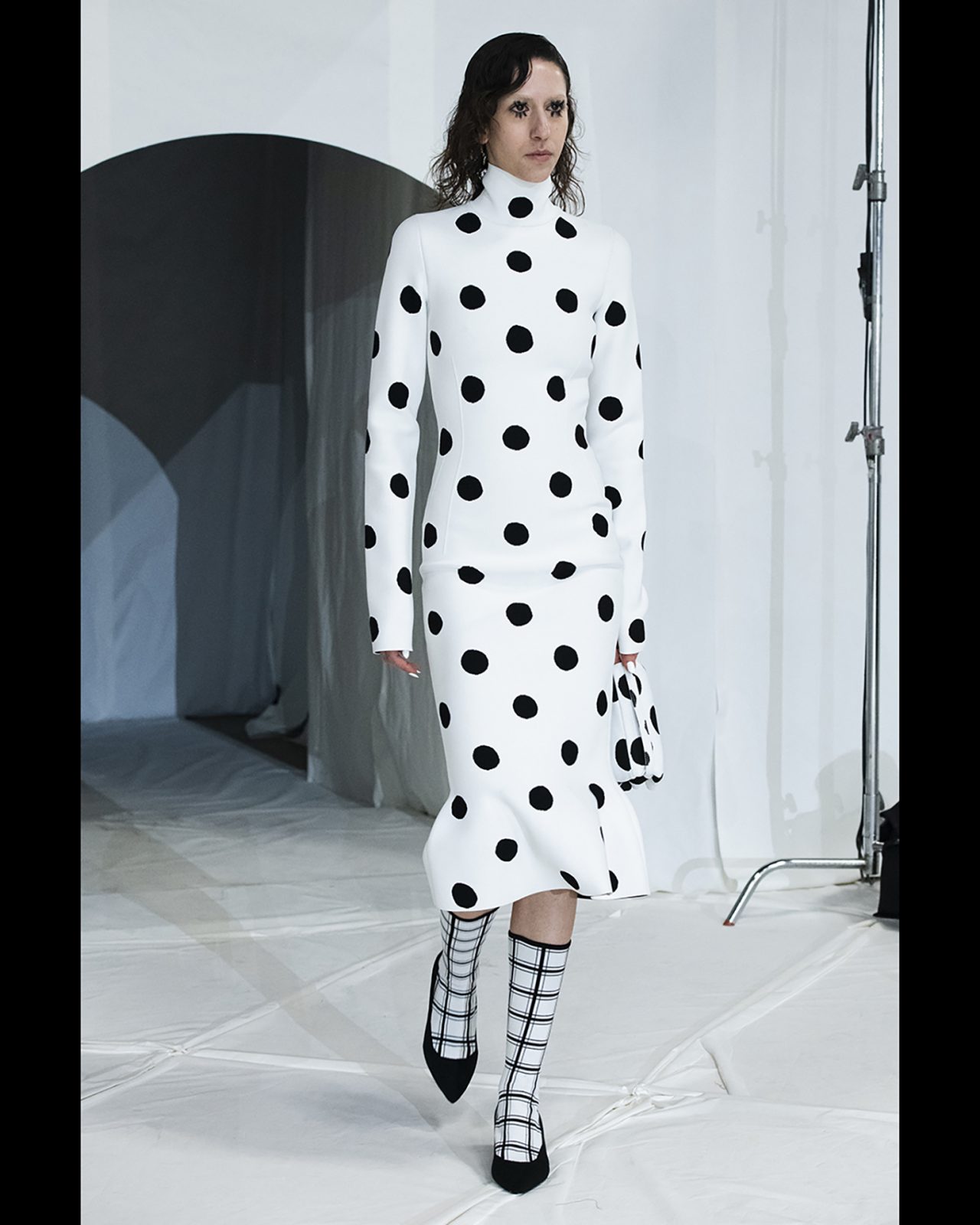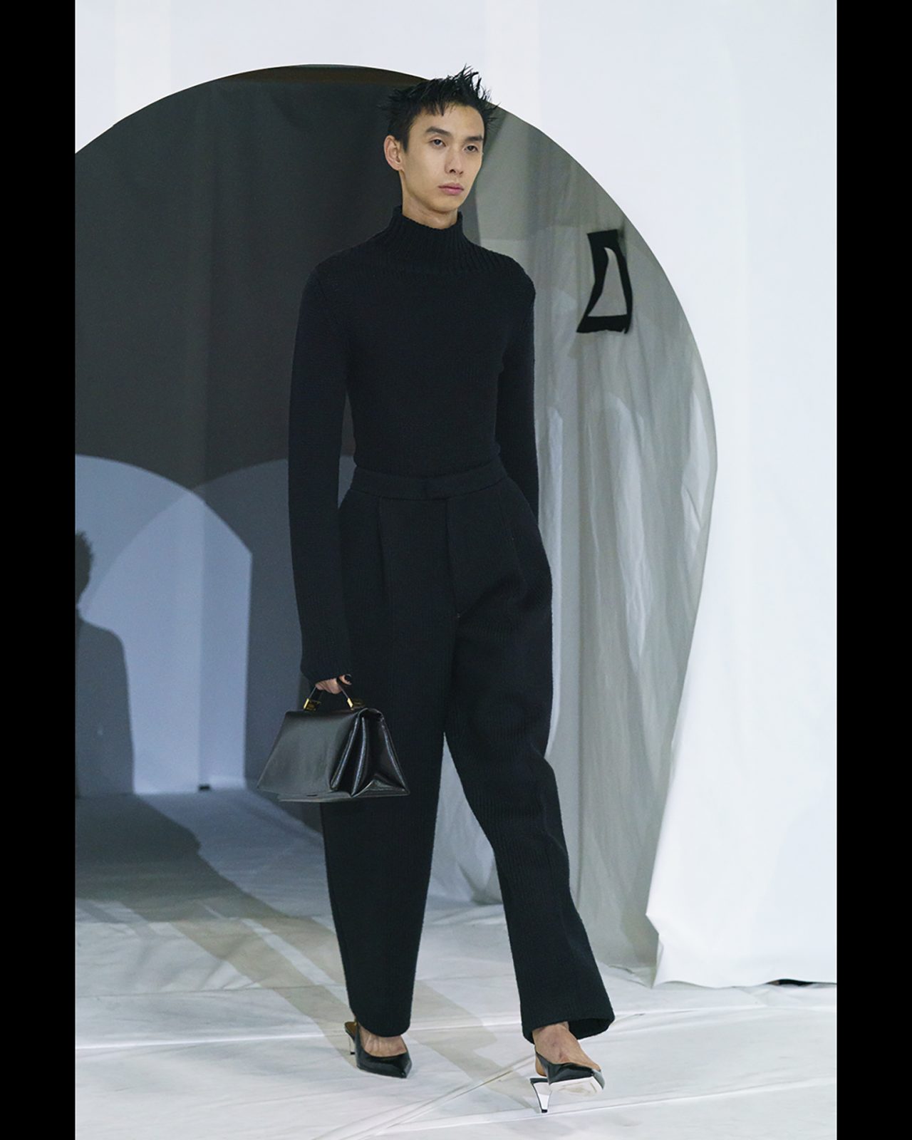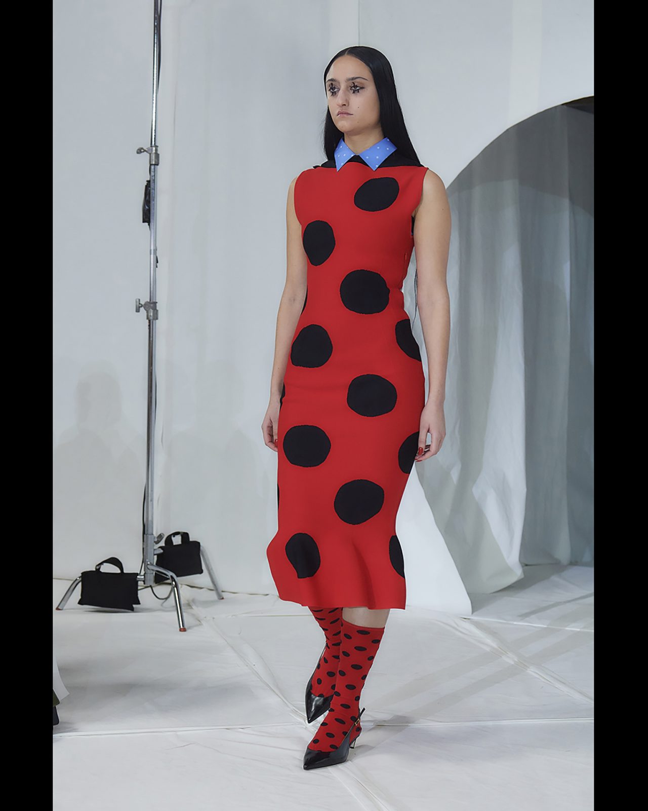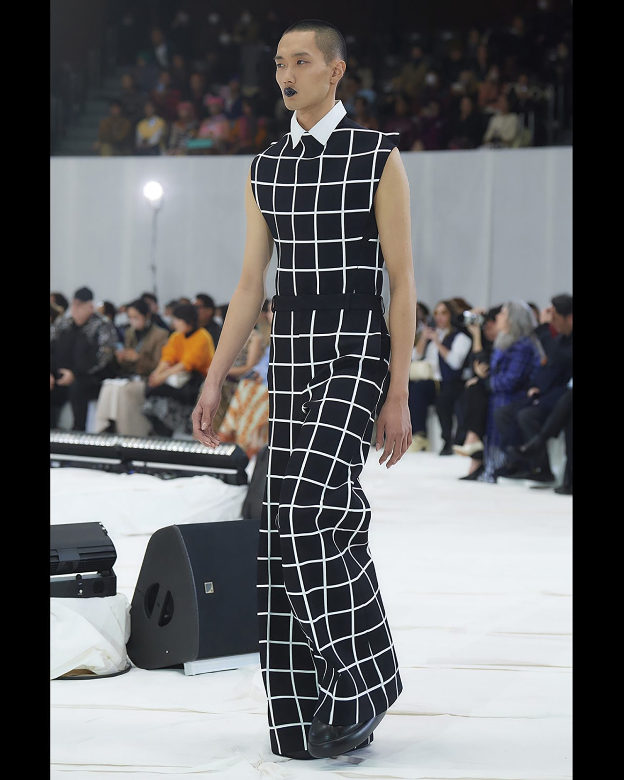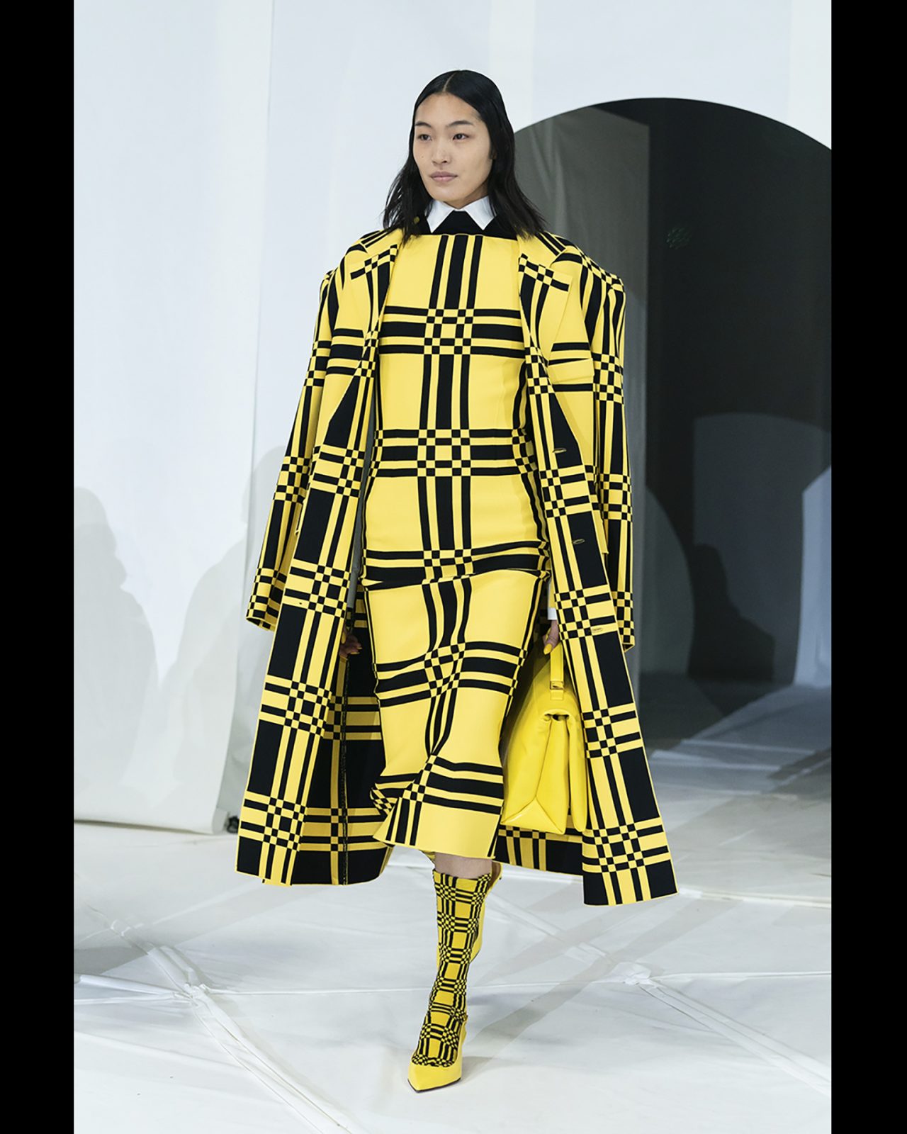 イエロー、レッド、ホワイト、ブラックといったカラーをベースに、ドットやストライプ、格子柄などの MARNI らしいグラフィックデザインが、純白のランウェイに映える。ボックス型のジャケットや脇が深くえぐられたような逆三角形のトップス、オフショルダーワンピースは袖が溜まるほどのオーバーサイズ、中国の若手デザイナー Dingyun Zhang (ディンユー・チャン) とコラボした大きなスタンドカラーのダウンジャケットなど、シルエットに緩急をつけたルックが登場した。ニット素材のダウンやスラックス、アシンメトリーな足元など、隋所に遊び心を感じさせる。