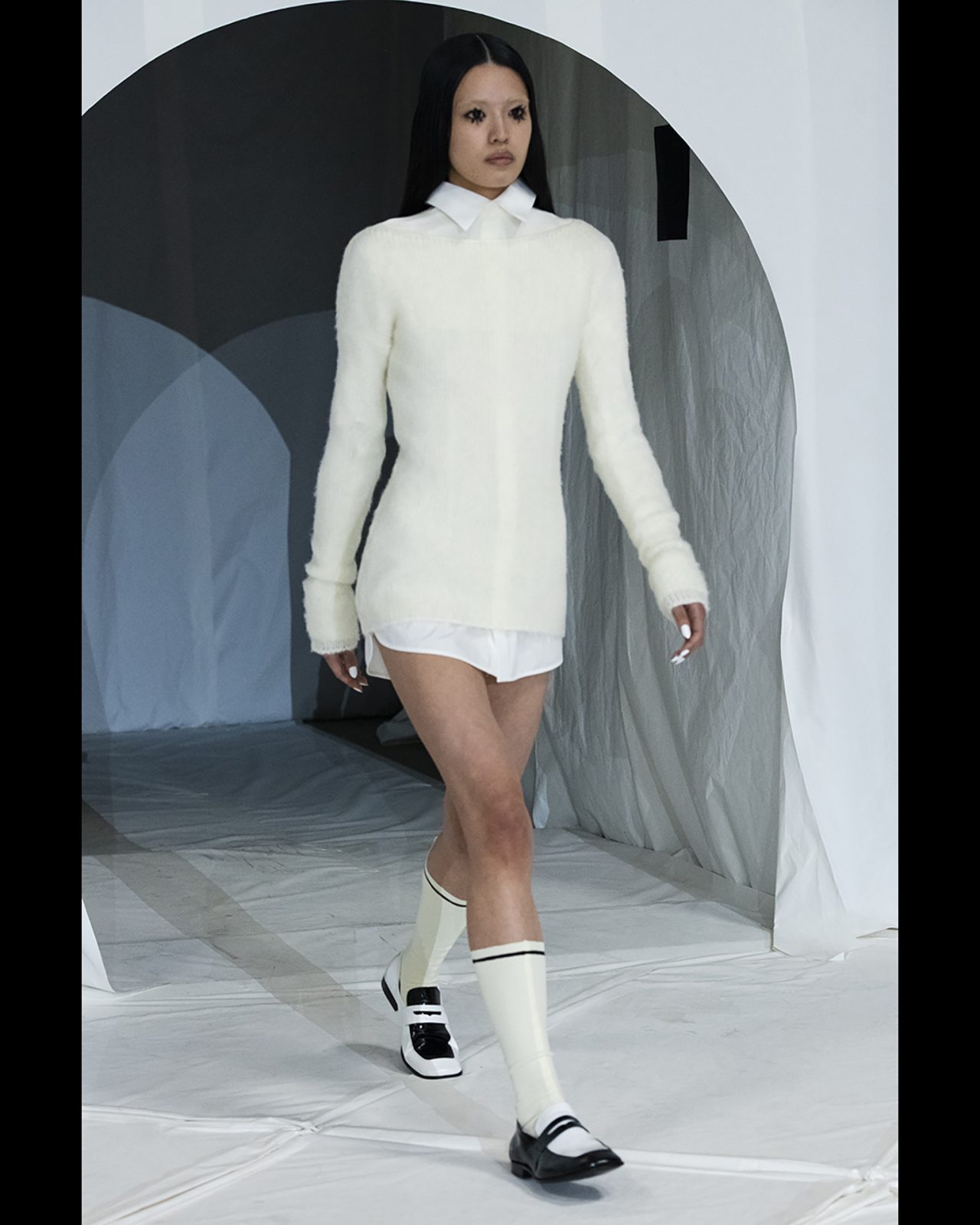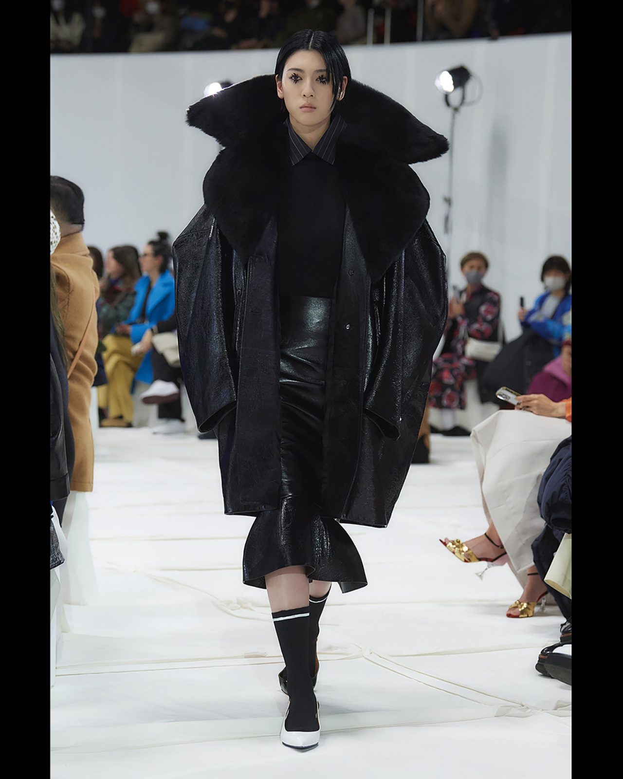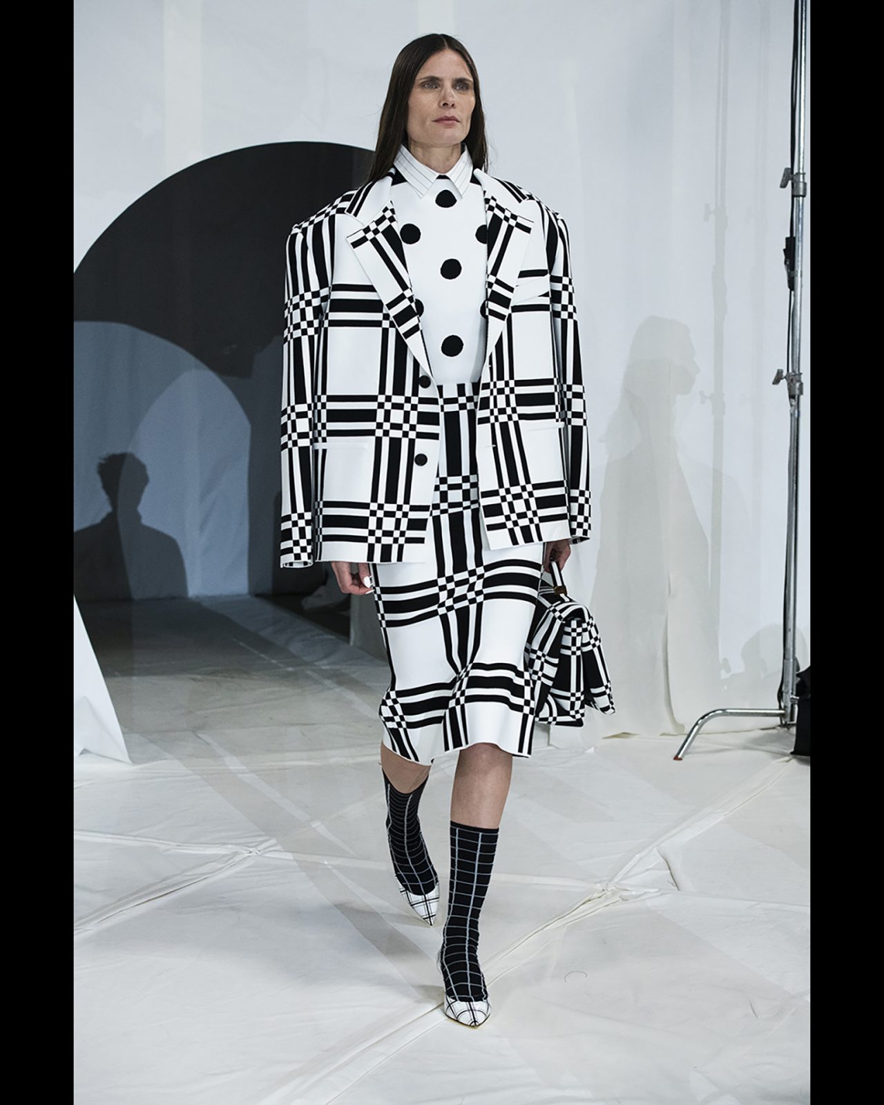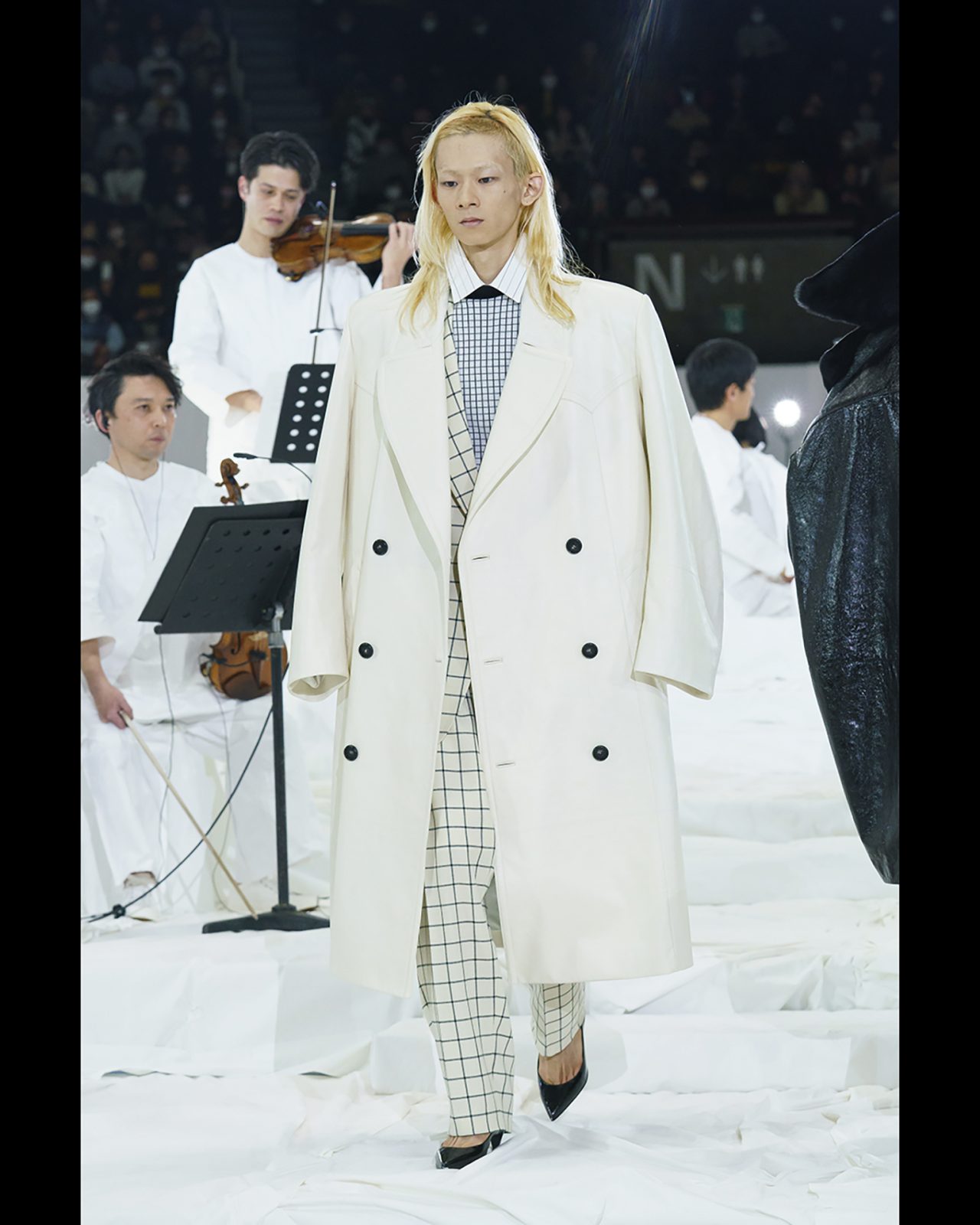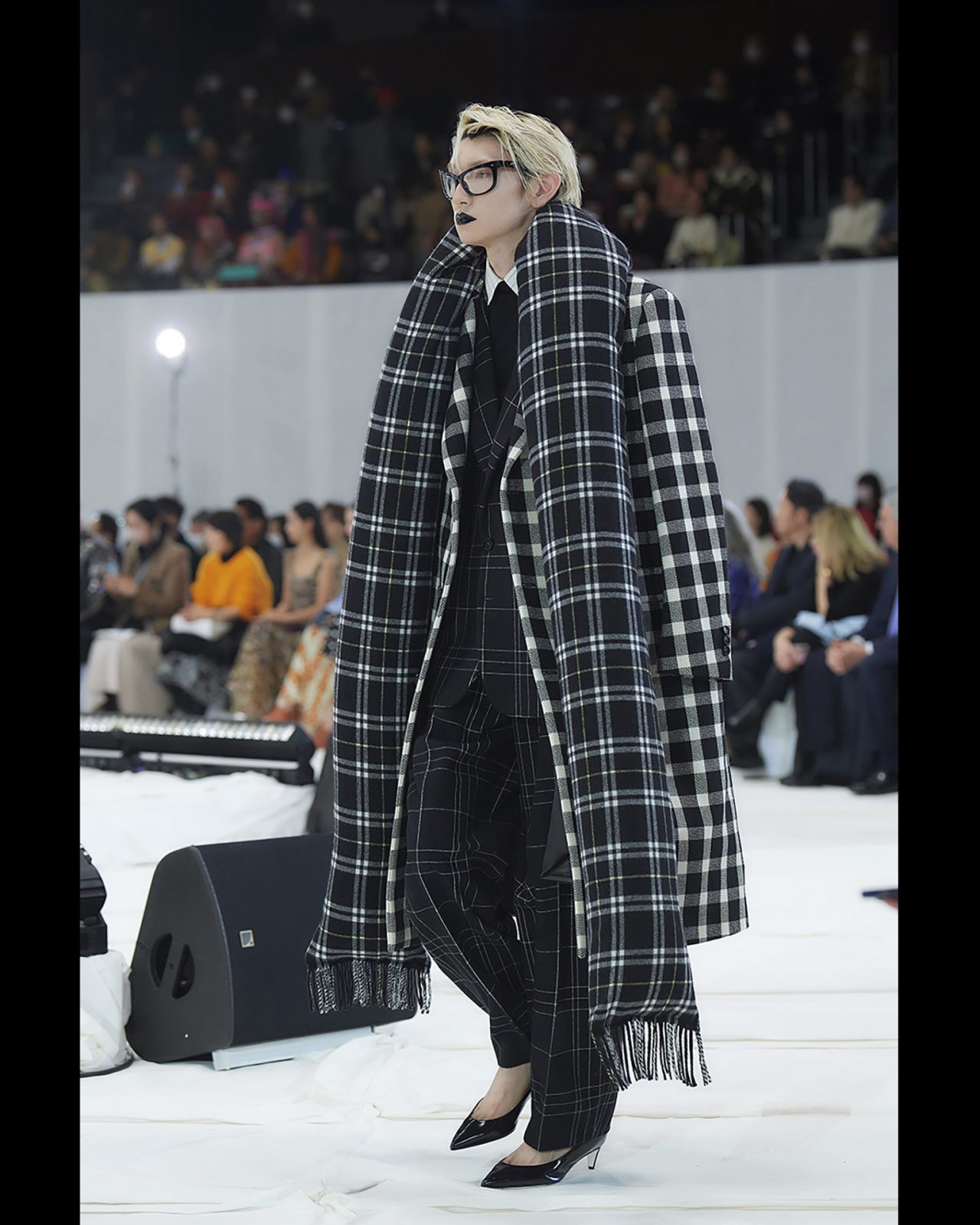 イエロー、レッド、ホワイト、ブラックといったカラーをベースに、ドットやストライプ、格子柄などの MARNI らしいグラフィックデザインが、純白のランウェイに映える。ボックス型のジャケットや脇が深くえぐられたような逆三角形のトップス、オフショルダーワンピースは袖が溜まるほどのオーバーサイズ、中国の若手デザイナー Dingyun Zhang (ディンユー・チャン) とコラボした大きなスタンドカラーのダウンジャケットなど、シルエットに緩急をつけたルックが登場した。ニット素材のダウンやスラックス、アシンメトリーな足元など、隋所に遊び心を感じさせる。