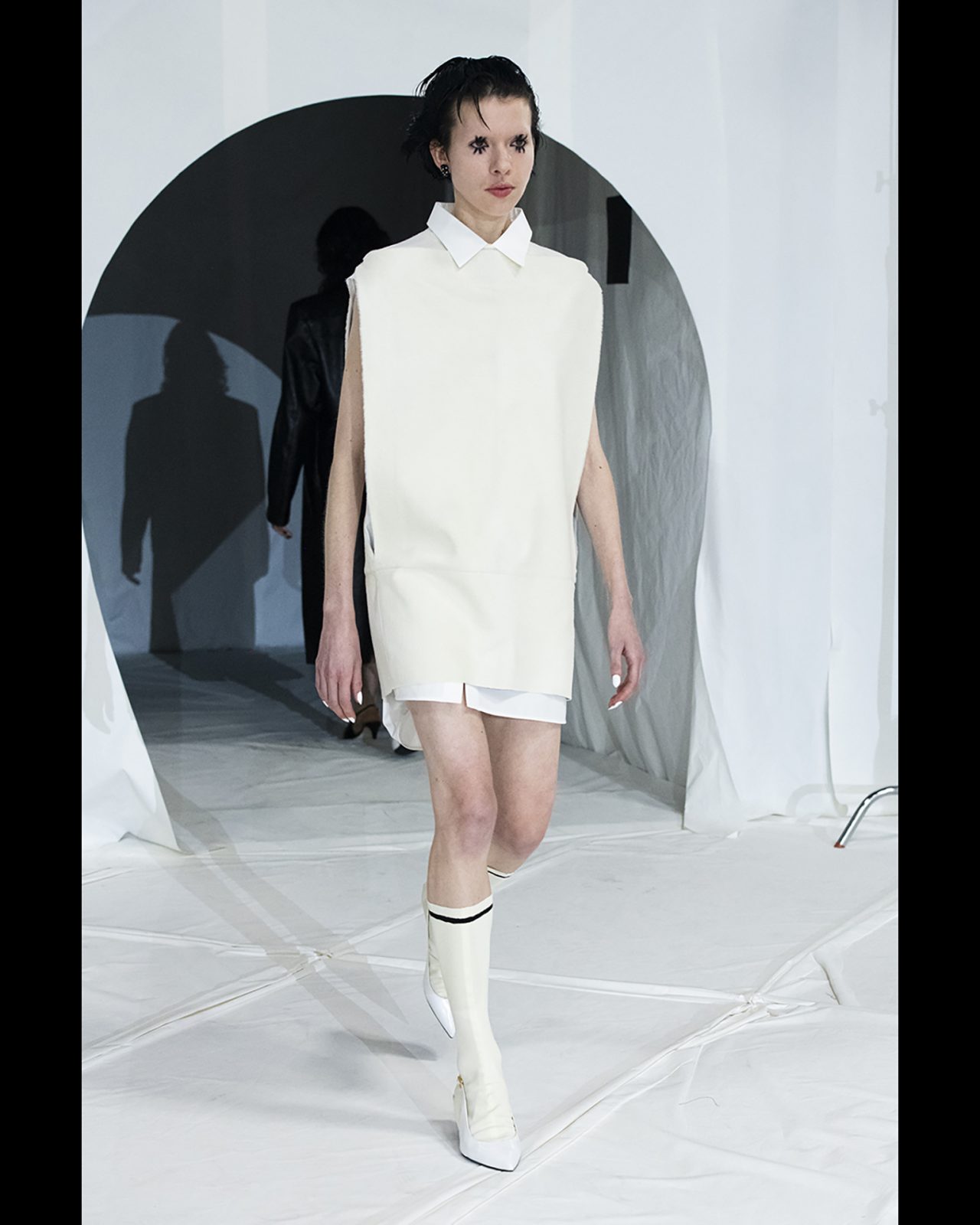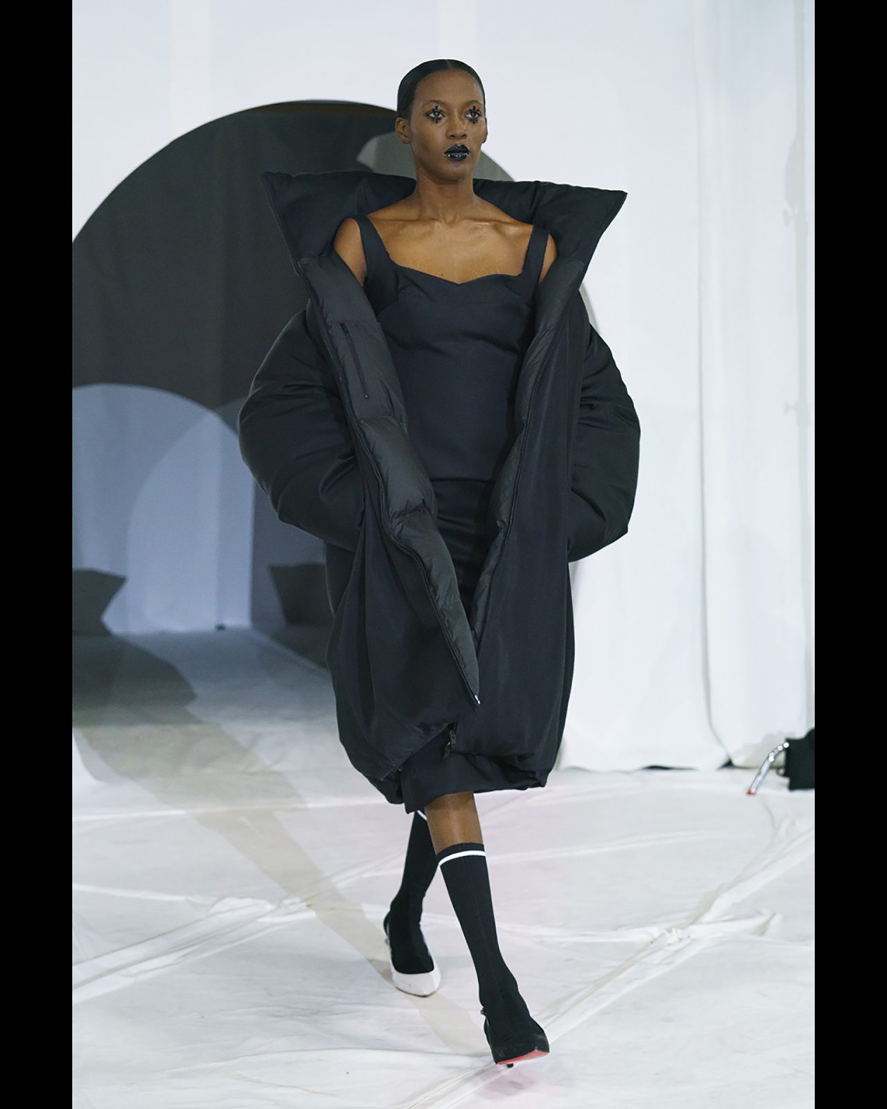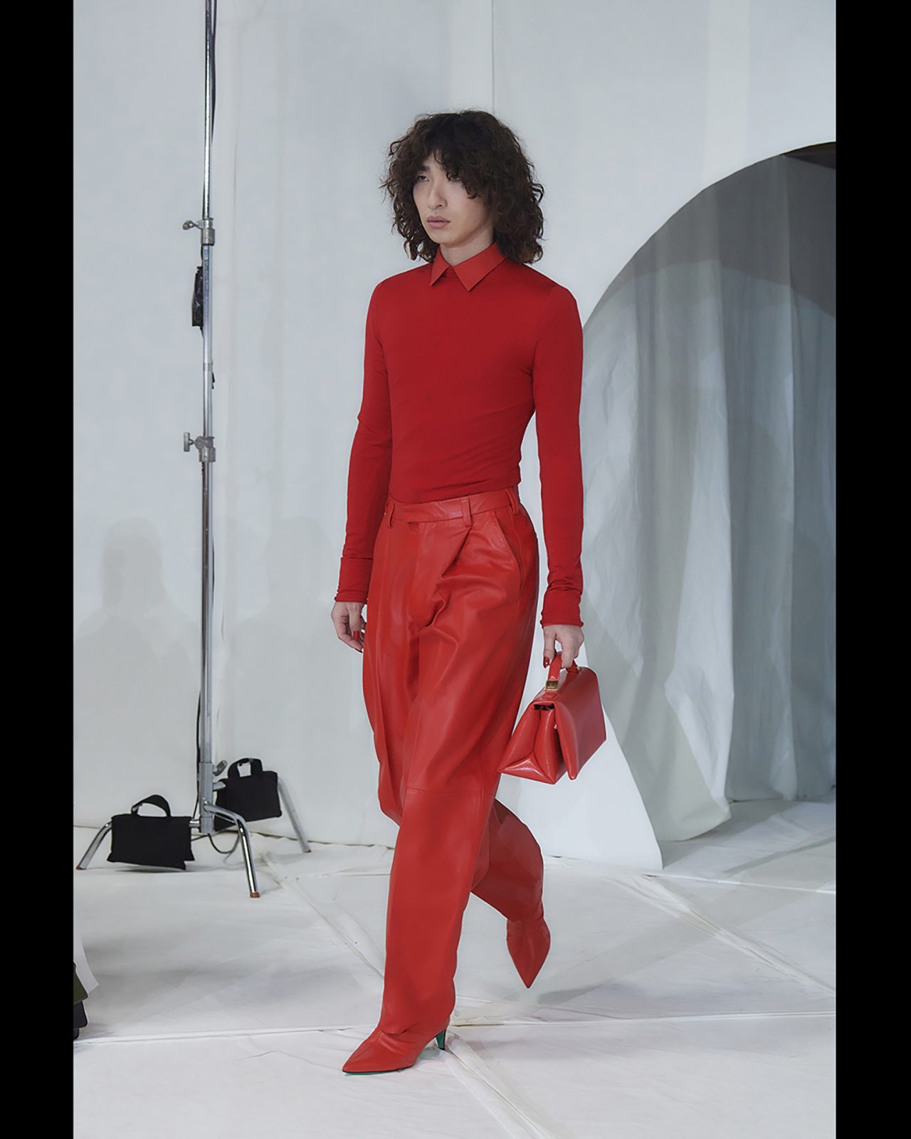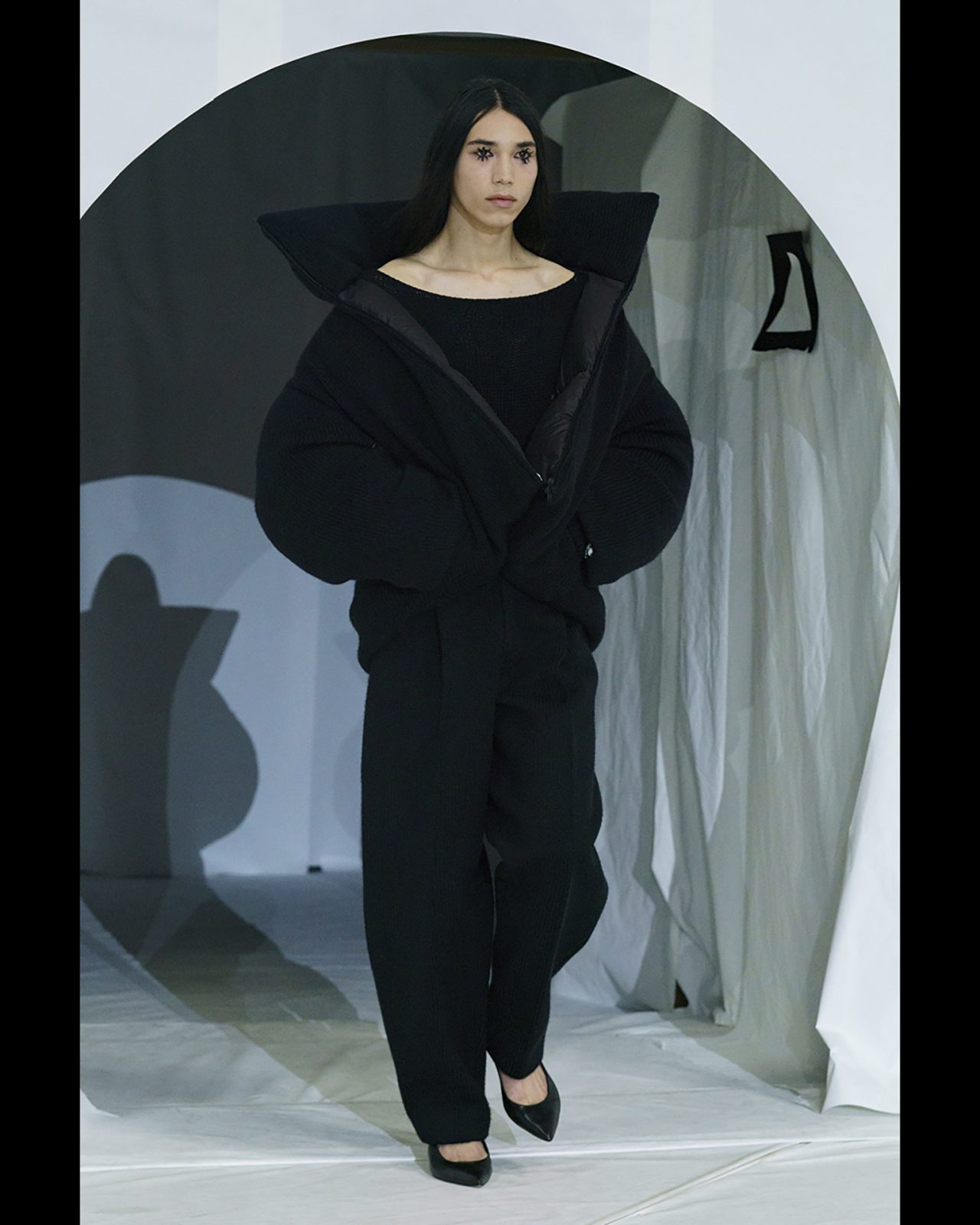 イエロー、レッド、ホワイト、ブラックといったカラーをベースに、ドットやストライプ、格子柄などの MARNI らしいグラフィックデザインが、純白のランウェイに映える。ボックス型のジャケットや脇が深くえぐられたような逆三角形のトップス、オフショルダーワンピースは袖が溜まるほどのオーバーサイズ、中国の若手デザイナー Dingyun Zhang (ディンユー・チャン) とコラボした大きなスタンドカラーのダウンジャケットなど、シルエットに緩急をつけたルックが登場した。ニット素材のダウンやスラックス、アシンメトリーな足元など、隋所に遊び心を感じさせる。