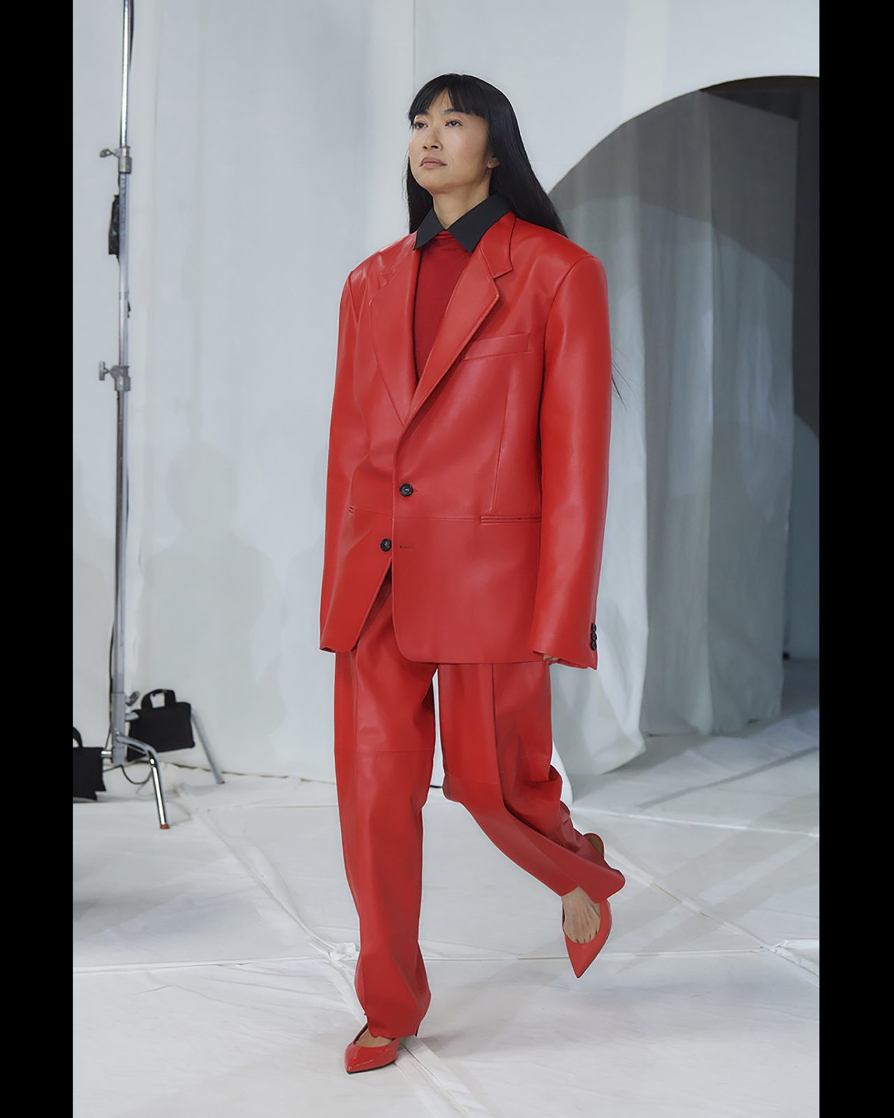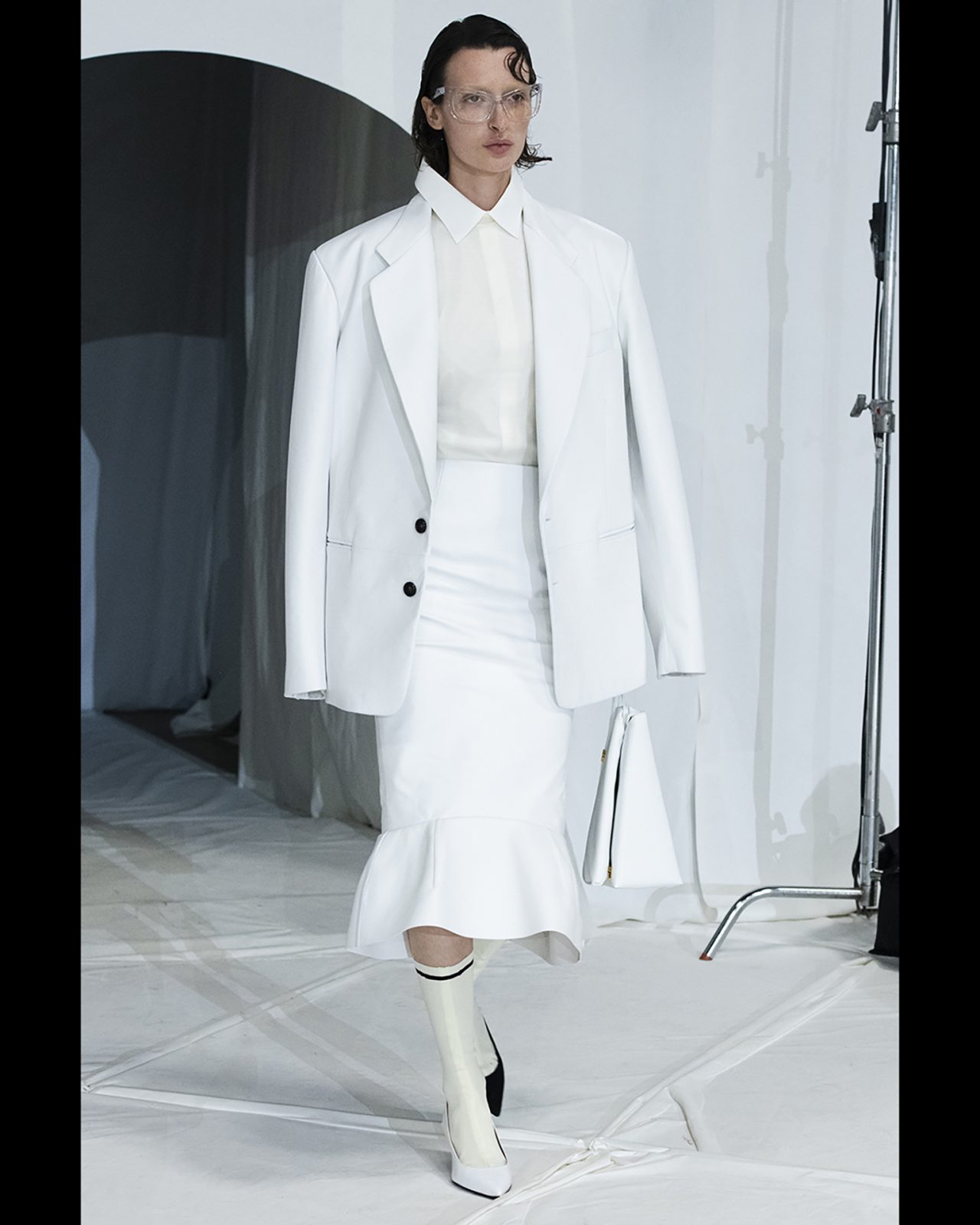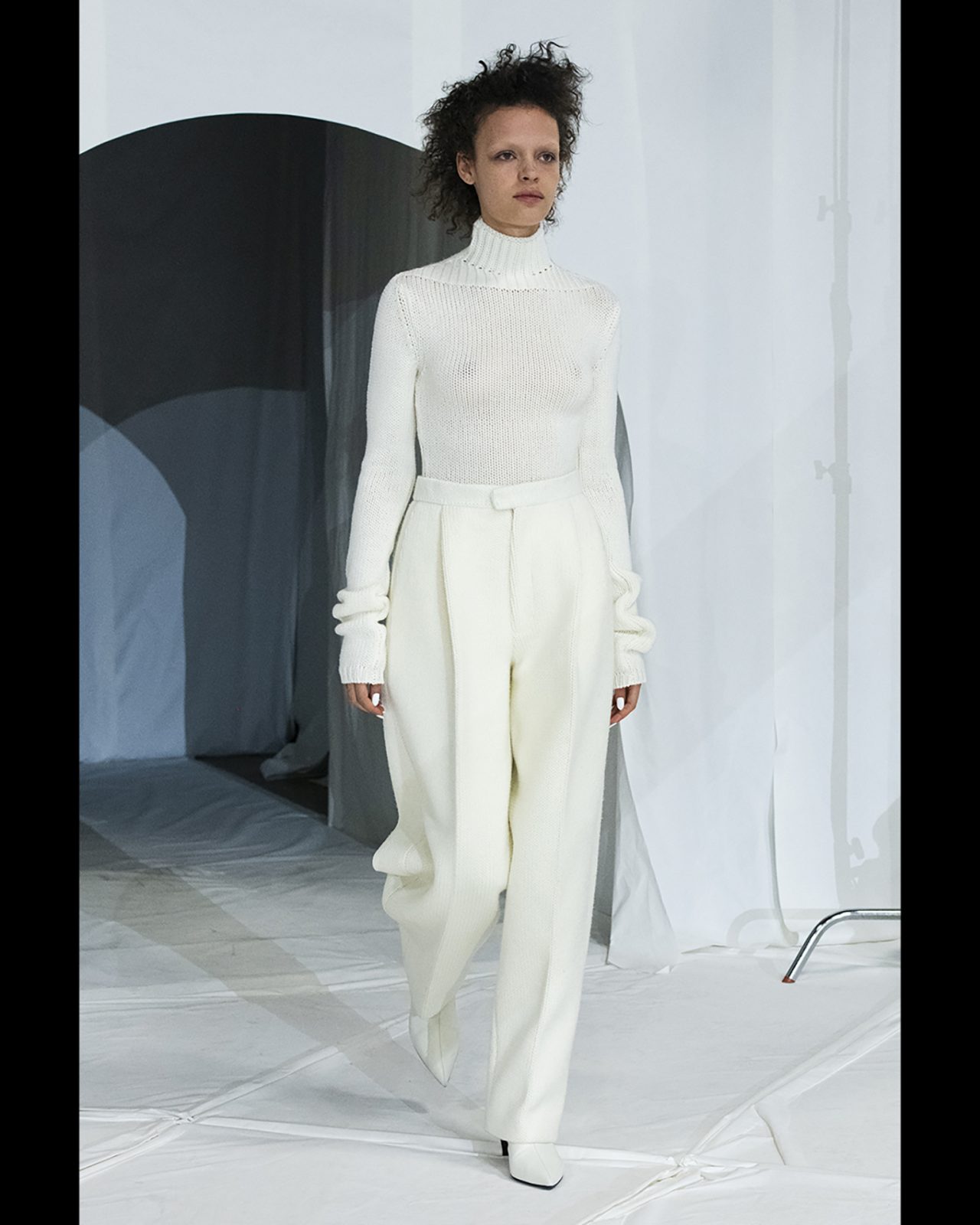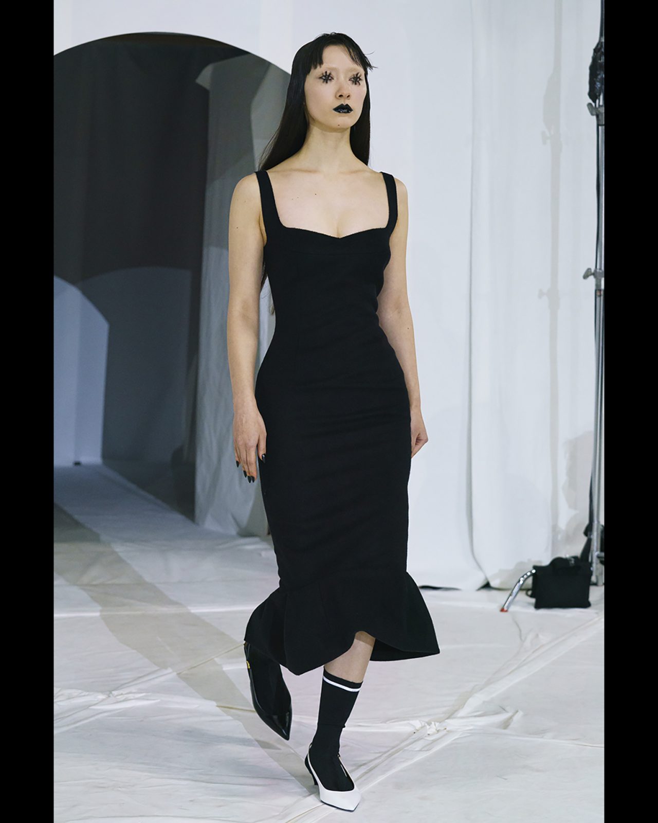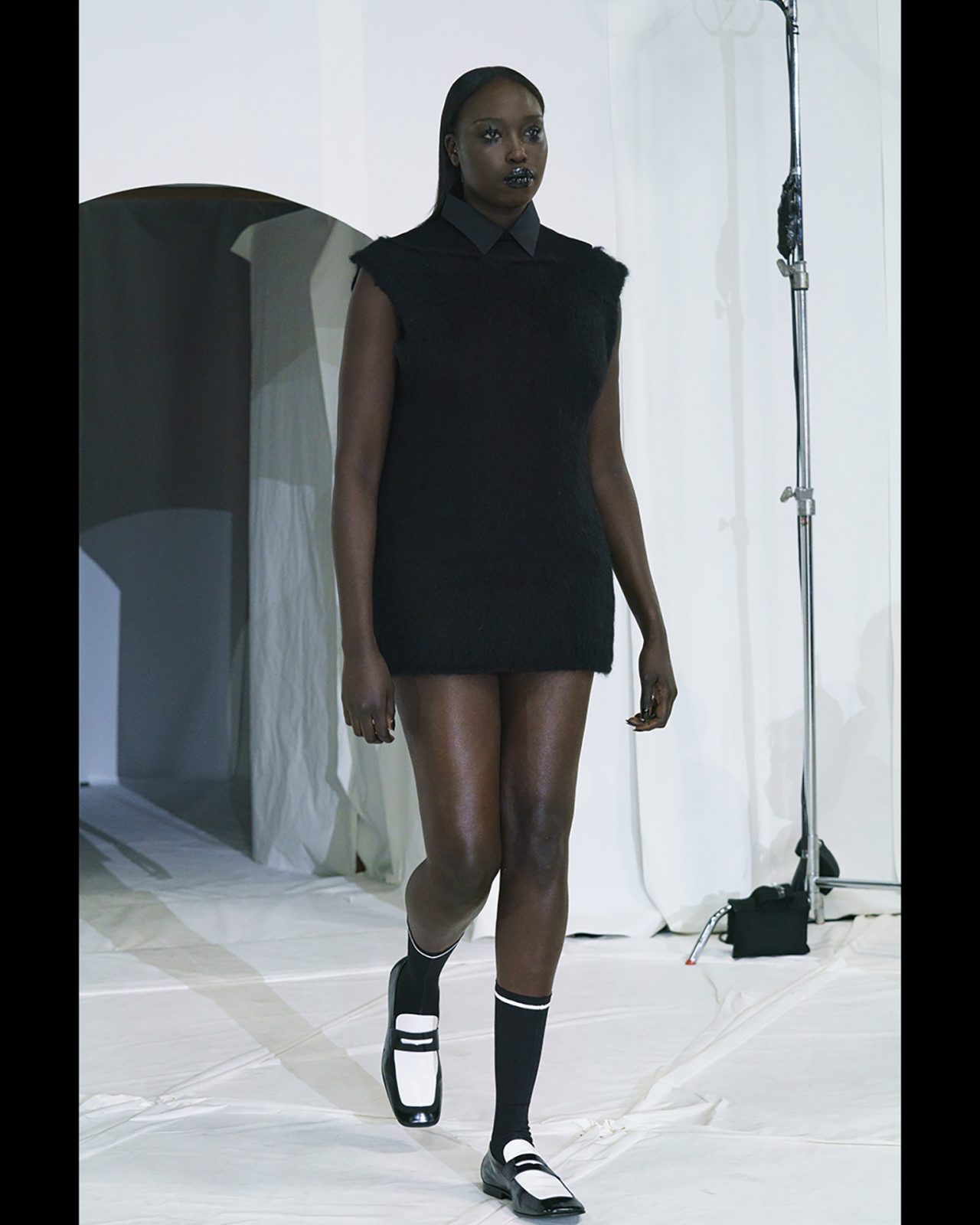 イエロー、レッド、ホワイト、ブラックといったカラーをベースに、ドットやストライプ、格子柄などの MARNI らしいグラフィックデザインが、純白のランウェイに映える。ボックス型のジャケットや脇が深くえぐられたような逆三角形のトップス、オフショルダーワンピースは袖が溜まるほどのオーバーサイズ、中国の若手デザイナー Dingyun Zhang (ディンユー・チャン) とコラボした大きなスタンドカラーのダウンジャケットなど、シルエットに緩急をつけたルックが登場した。ニット素材のダウンやスラックス、アシンメトリーな足元など、隋所に遊び心を感じさせる。