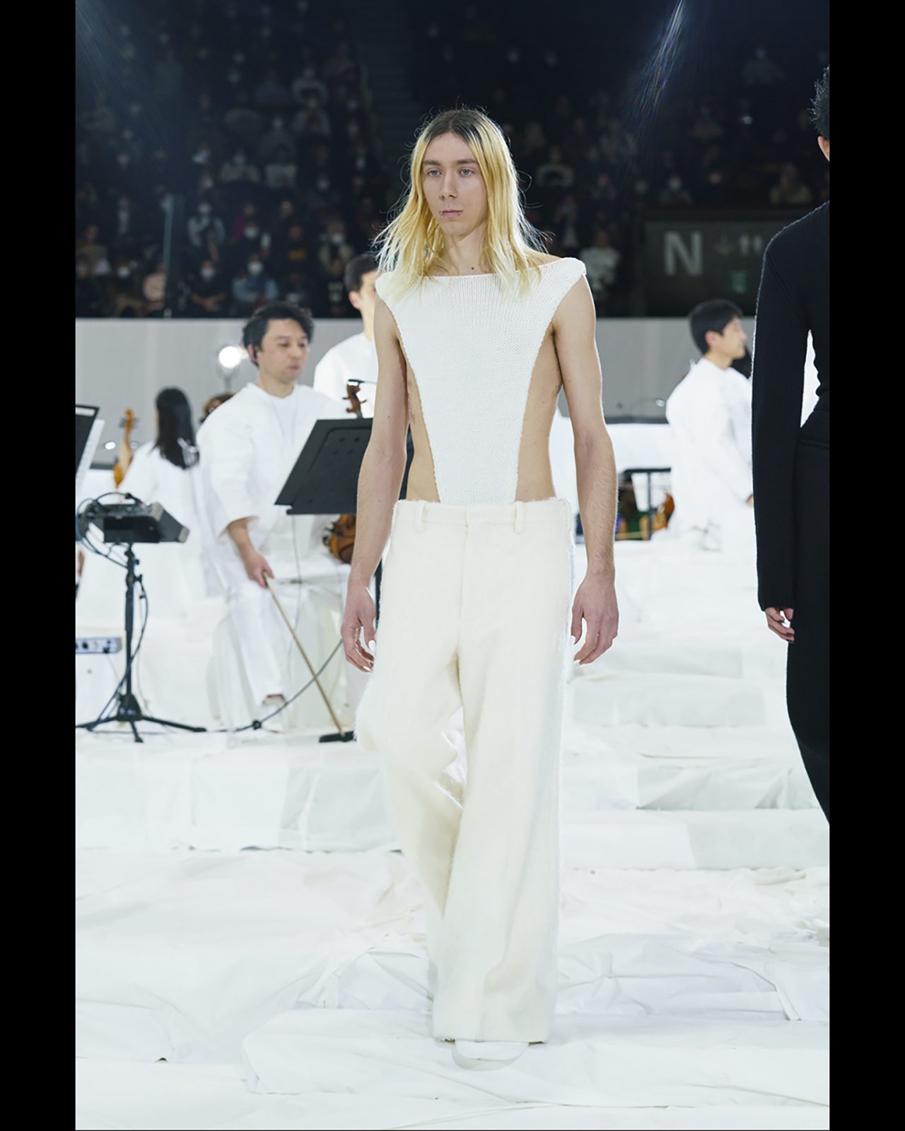 会場となった国立代々木競技場第二体育館は、ランウェイや椅子が真っ白なシートで覆われ、中央のステージに登場したオーケストラ奏者たちまでもが、白の衣装に身を包んでいる。Dev Hynes (デヴ・ハインズ) がディレクションを務めた演奏に合わせて和太鼓の音色が響き渡り、ショーがスタートした。