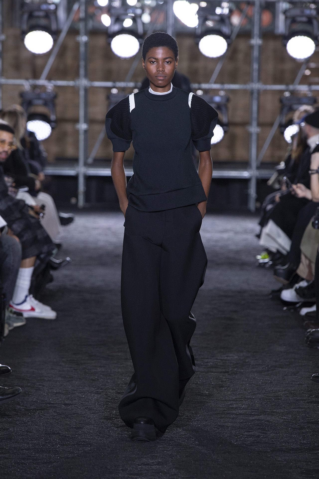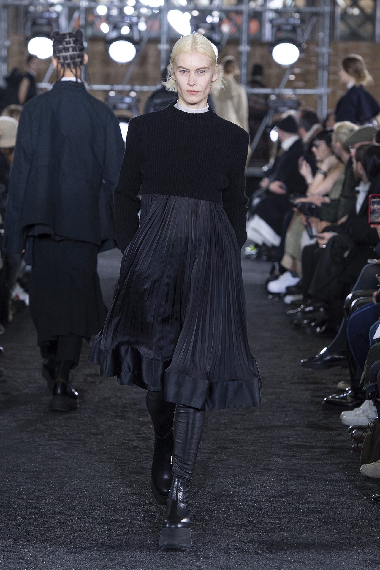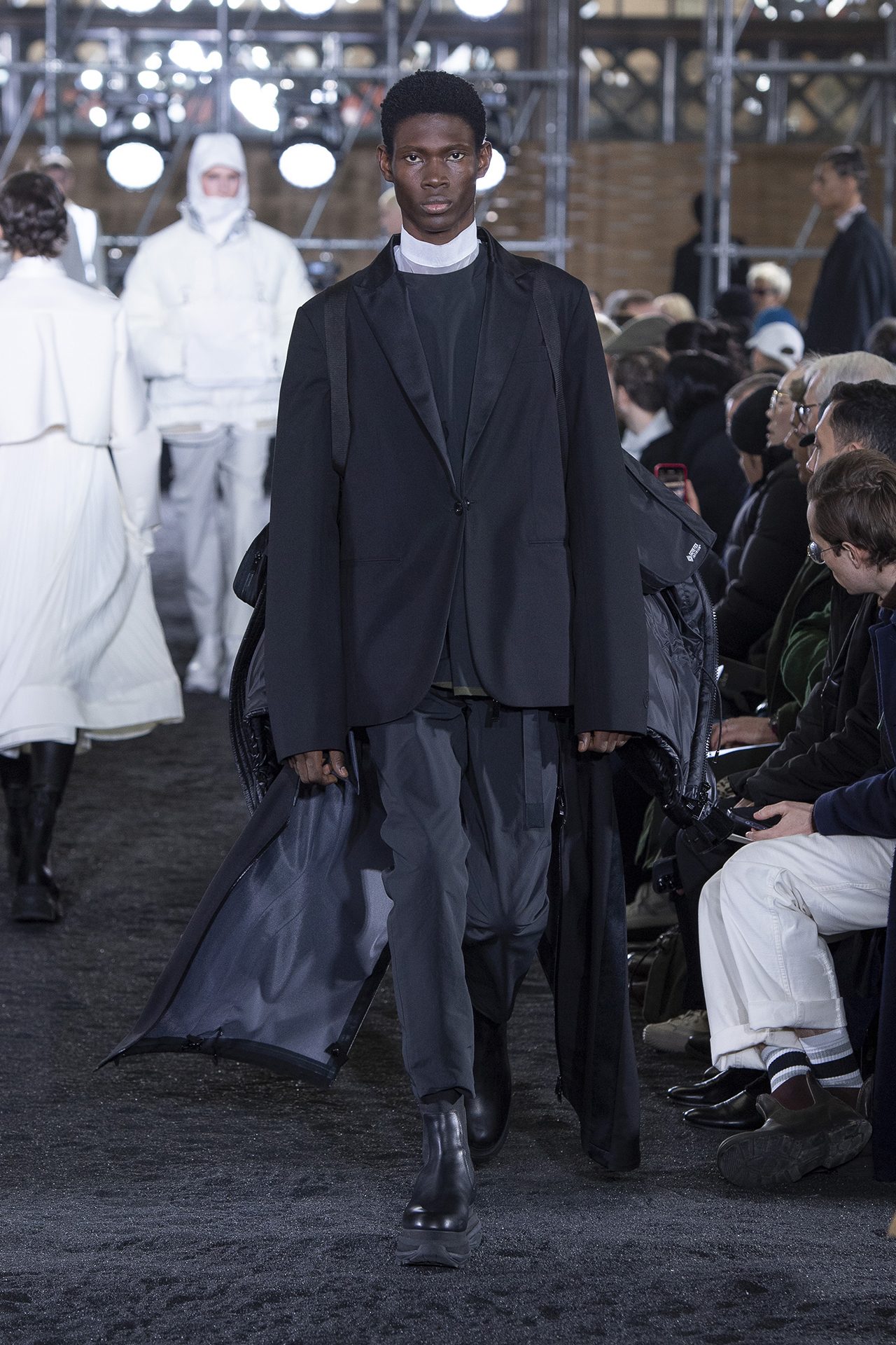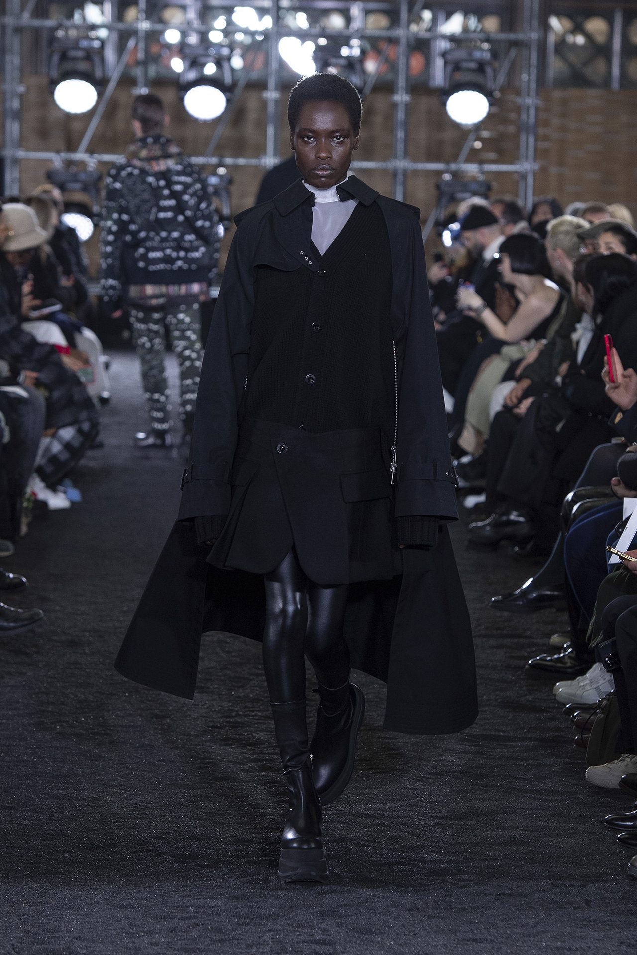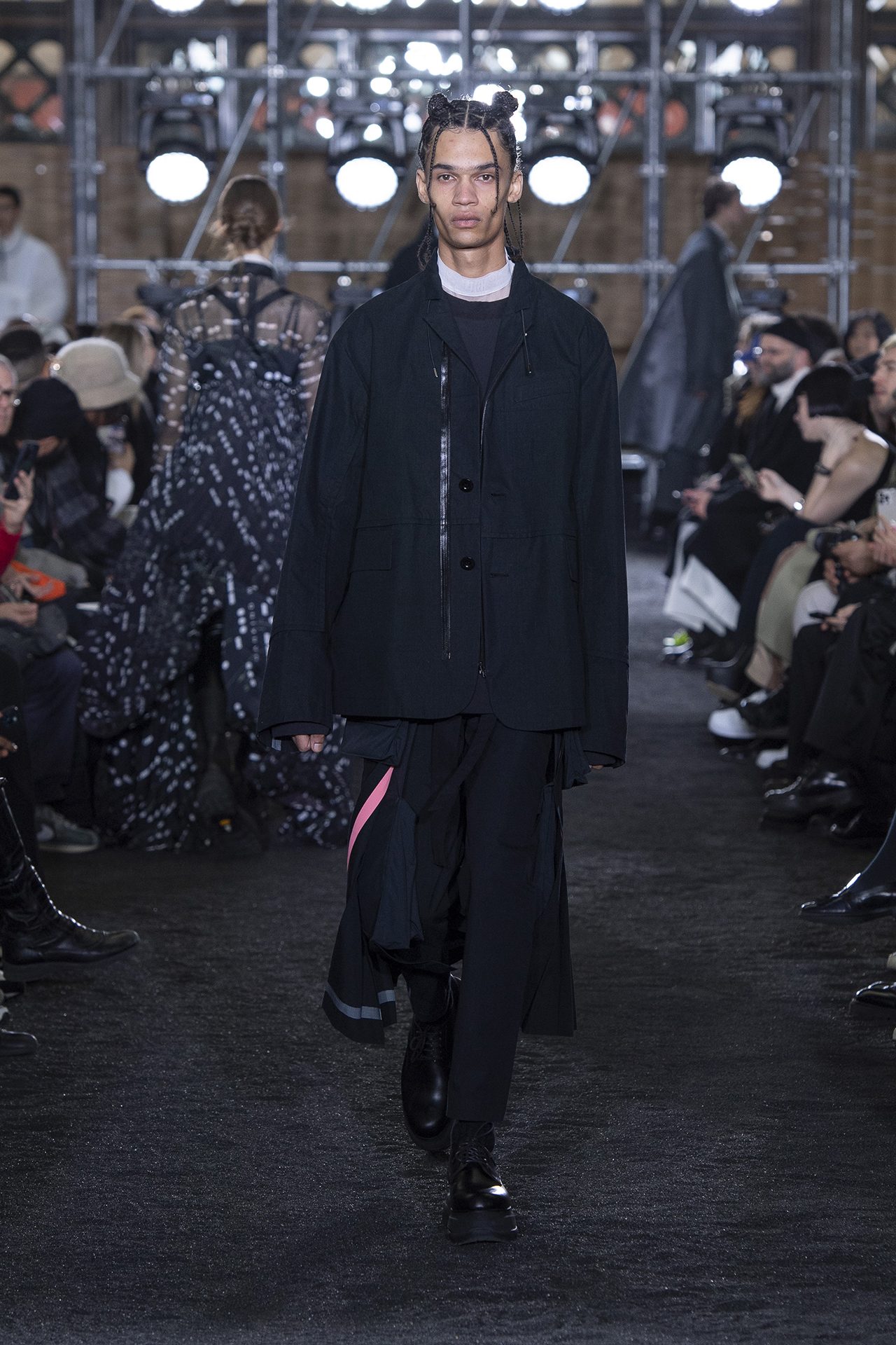 阿部千登勢は、「変身」をテーマに過去、現在、未来の関係性に触れながら、新しいものへと変化するコレクションを発表した。見慣れた形やシルエットが、着こなしによって変形、変化することで着る人の個性を引き出してくれる。ファーストルックは、シンプルなブラックをベースにしながらも、パフスリーブや異素材をミックスさせると共に、ジッパーの開閉により前後で見え方が異なる sacai らしいドレスが登場した。また、ジャケットはアウターレイヤーをバックパックスタイルに変換することで、まったく新しい形の提案を可能にしている。ショーの前半は、カラーをブラックで統一することで、よりシルエットにフィーチャーしたルックが多く見られた。