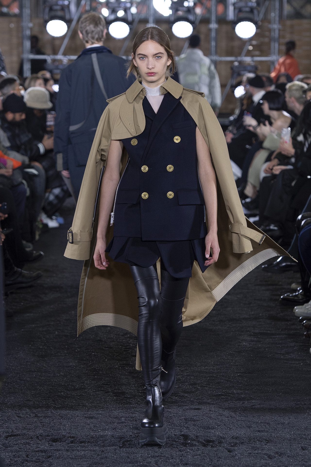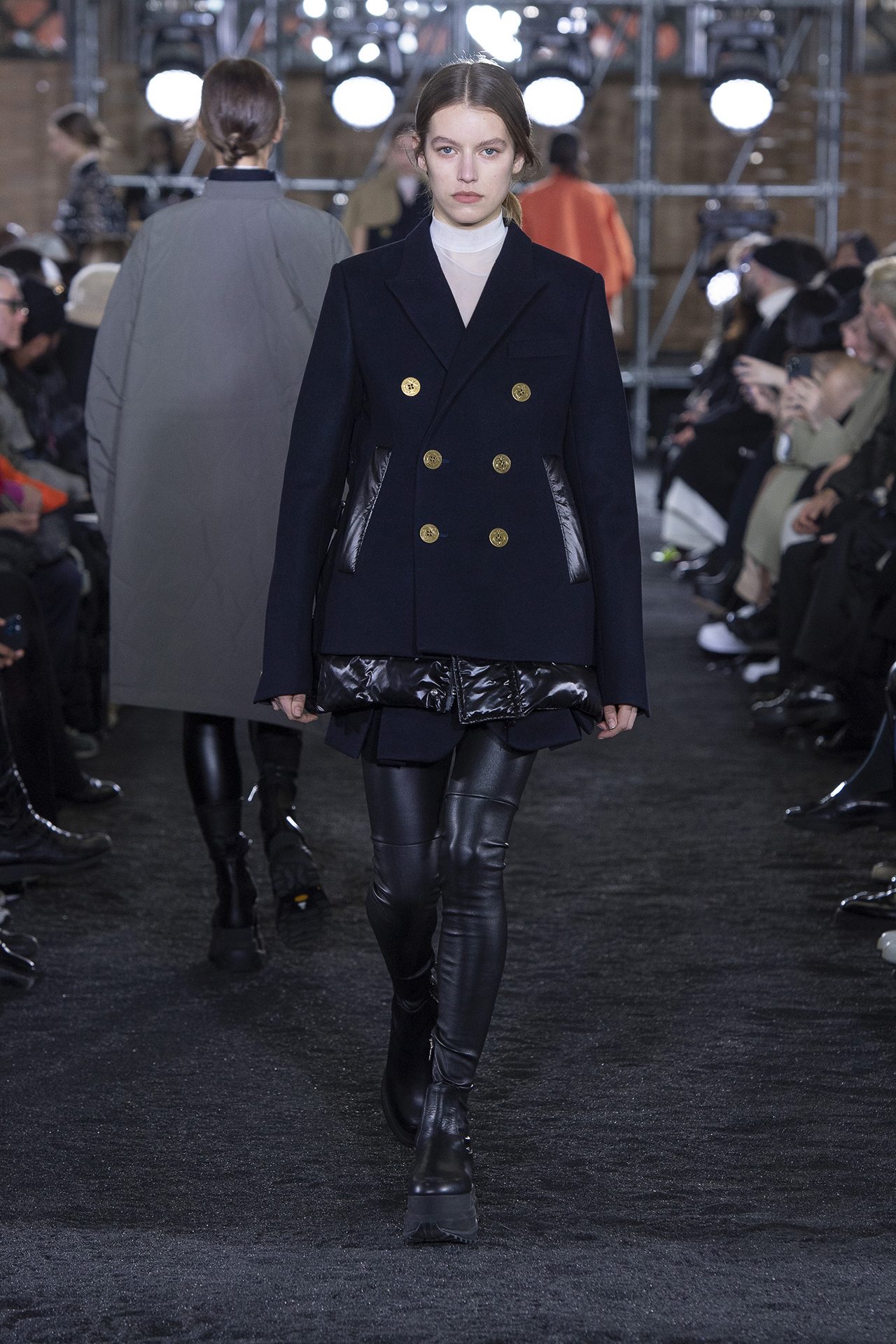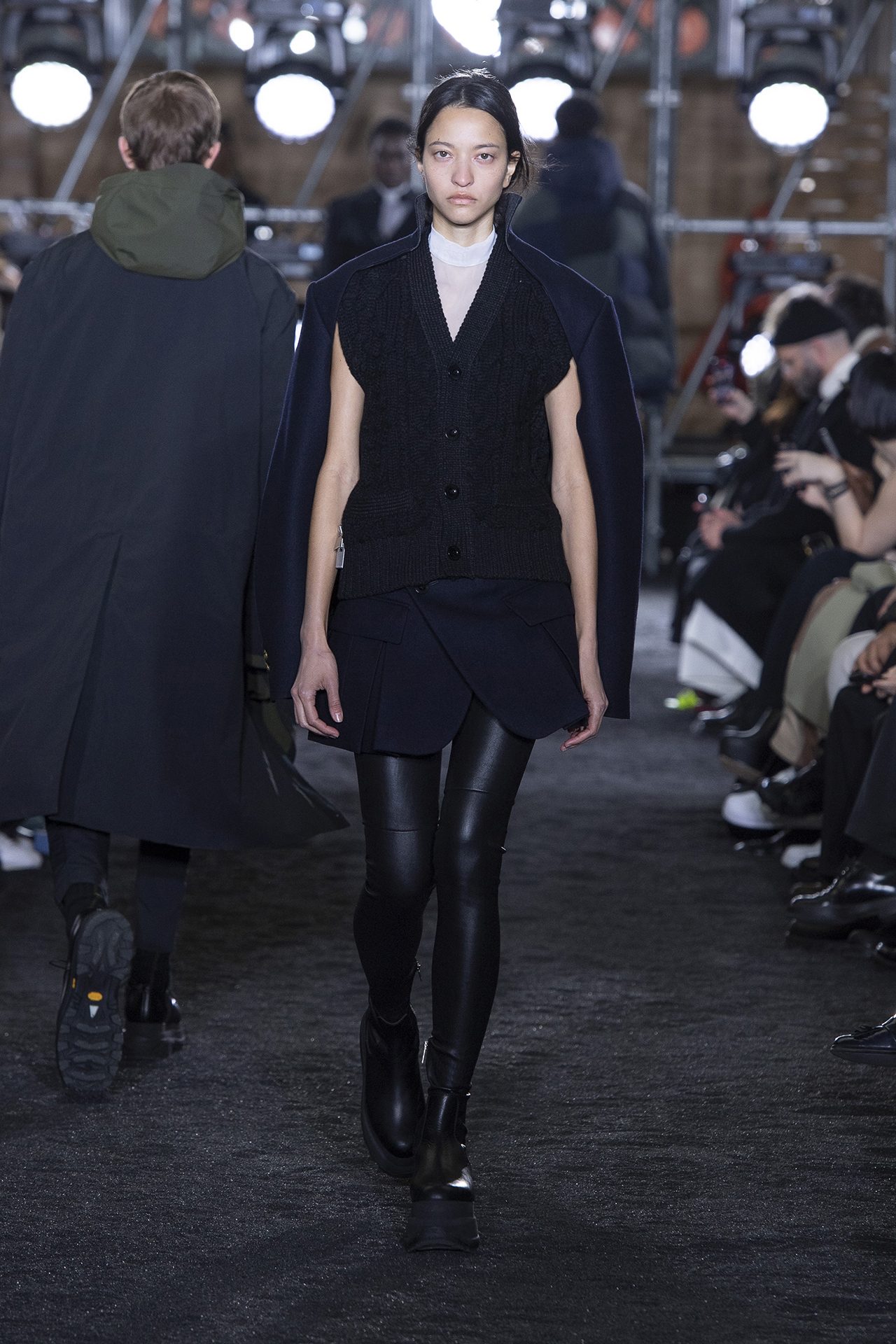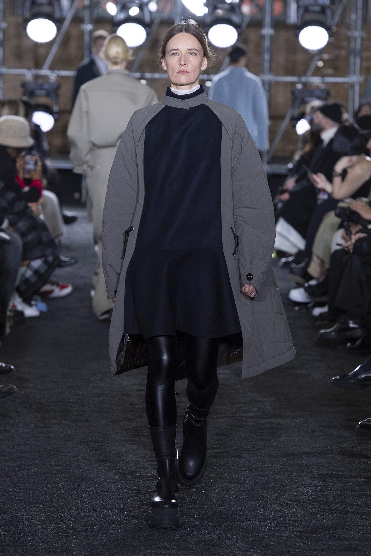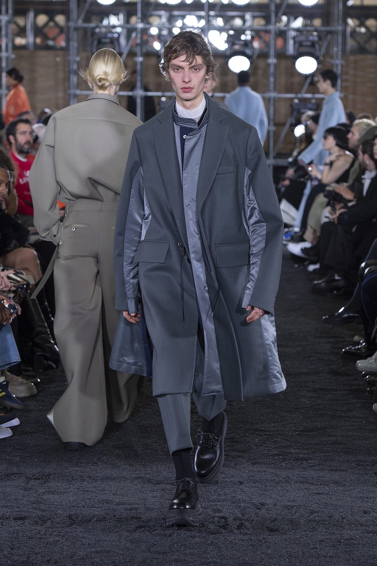 阿部千登勢は、「変身」をテーマに過去、現在、未来の関係性に触れながら、新しいものへと変化するコレクションを発表した。見慣れた形やシルエットが、着こなしによって変形、変化することで着る人の個性を引き出してくれる。ファーストルックは、シンプルなブラックをベースにしながらも、パフスリーブや異素材をミックスさせると共に、ジッパーの開閉により前後で見え方が異なる sacai らしいドレスが登場した。また、ジャケットはアウターレイヤーをバックパックスタイルに変換することで、まったく新しい形の提案を可能にしている。ショーの前半は、カラーをブラックで統一することで、よりシルエットにフィーチャーしたルックが多く見られた。