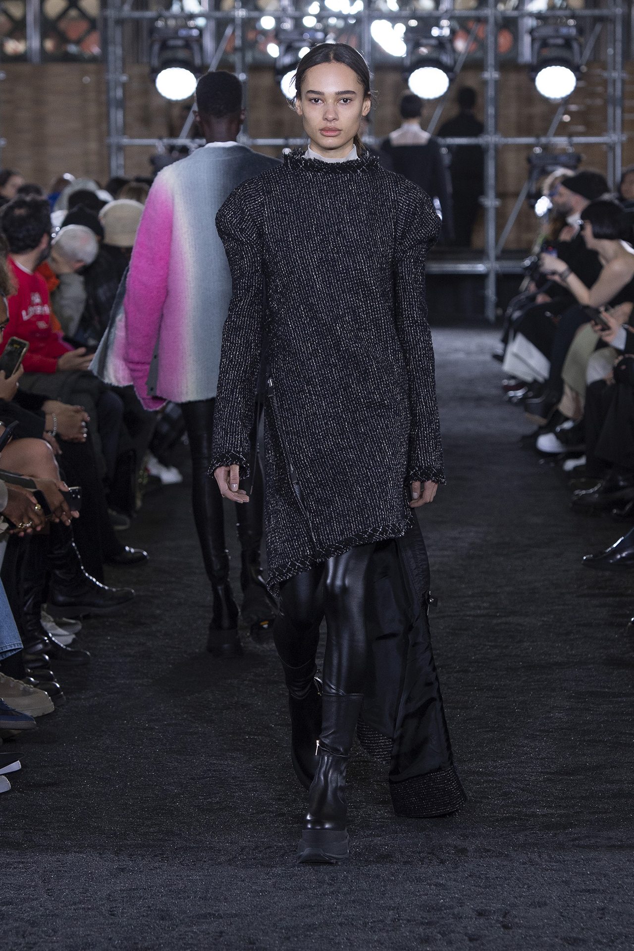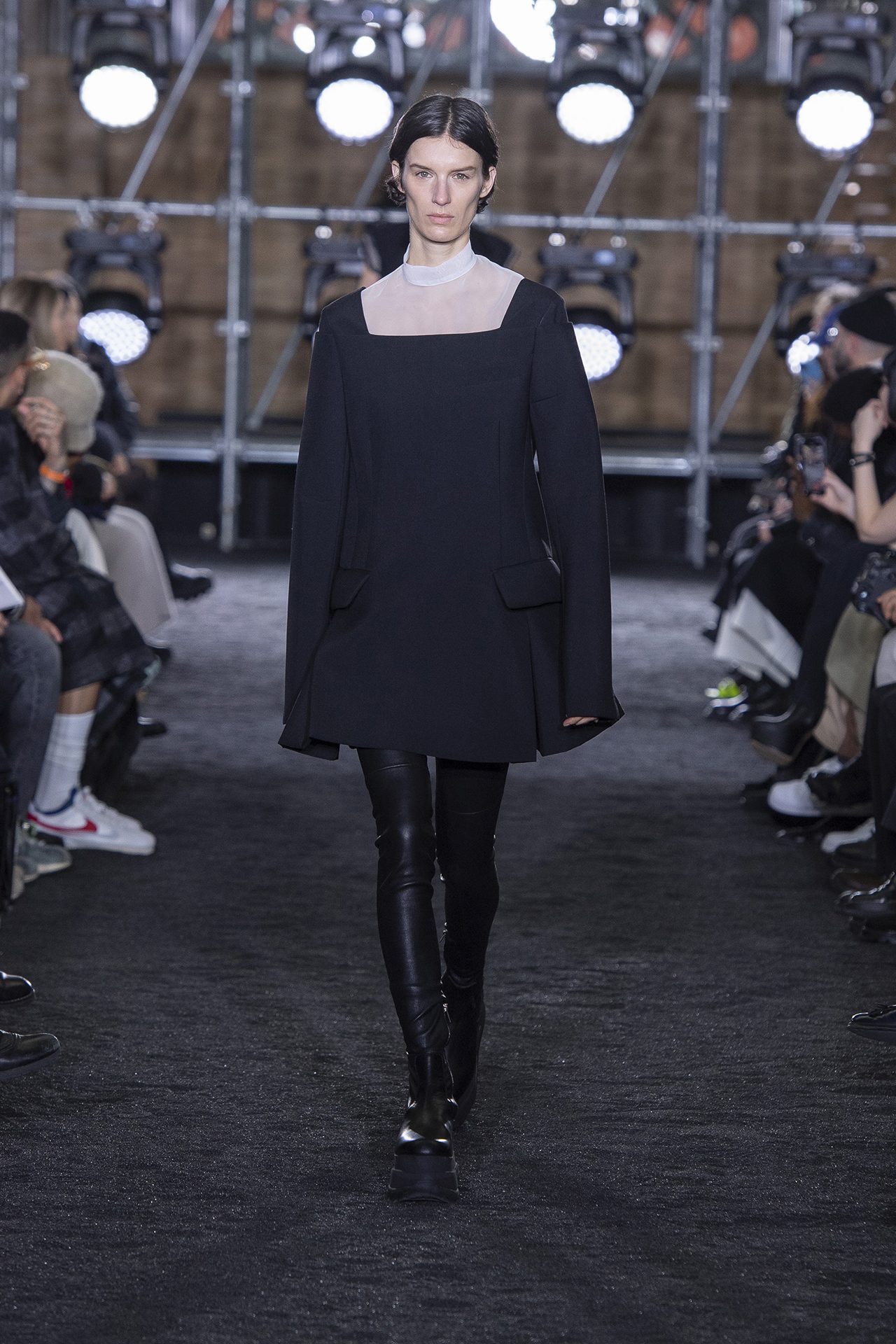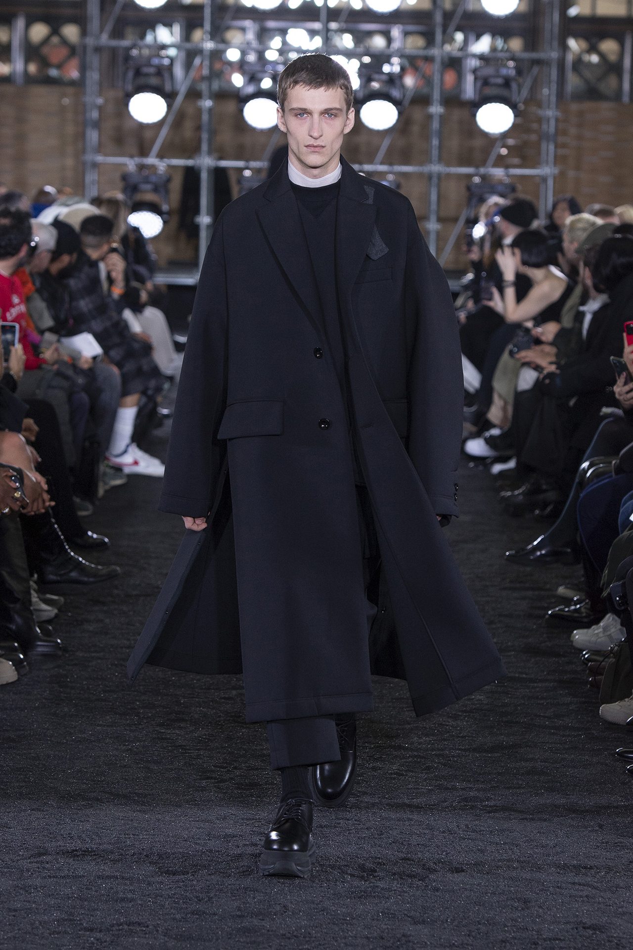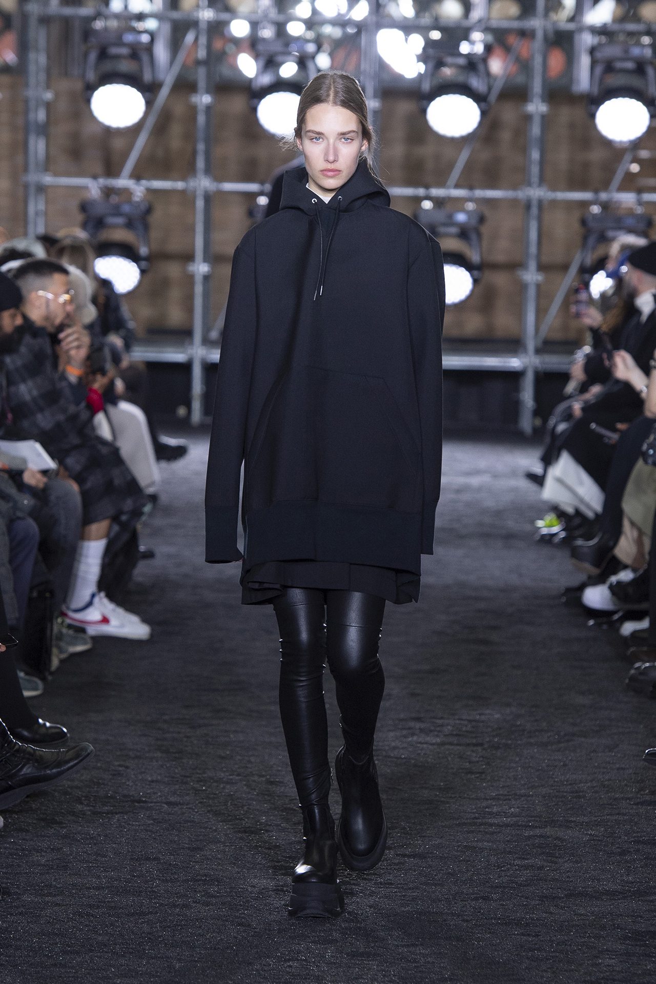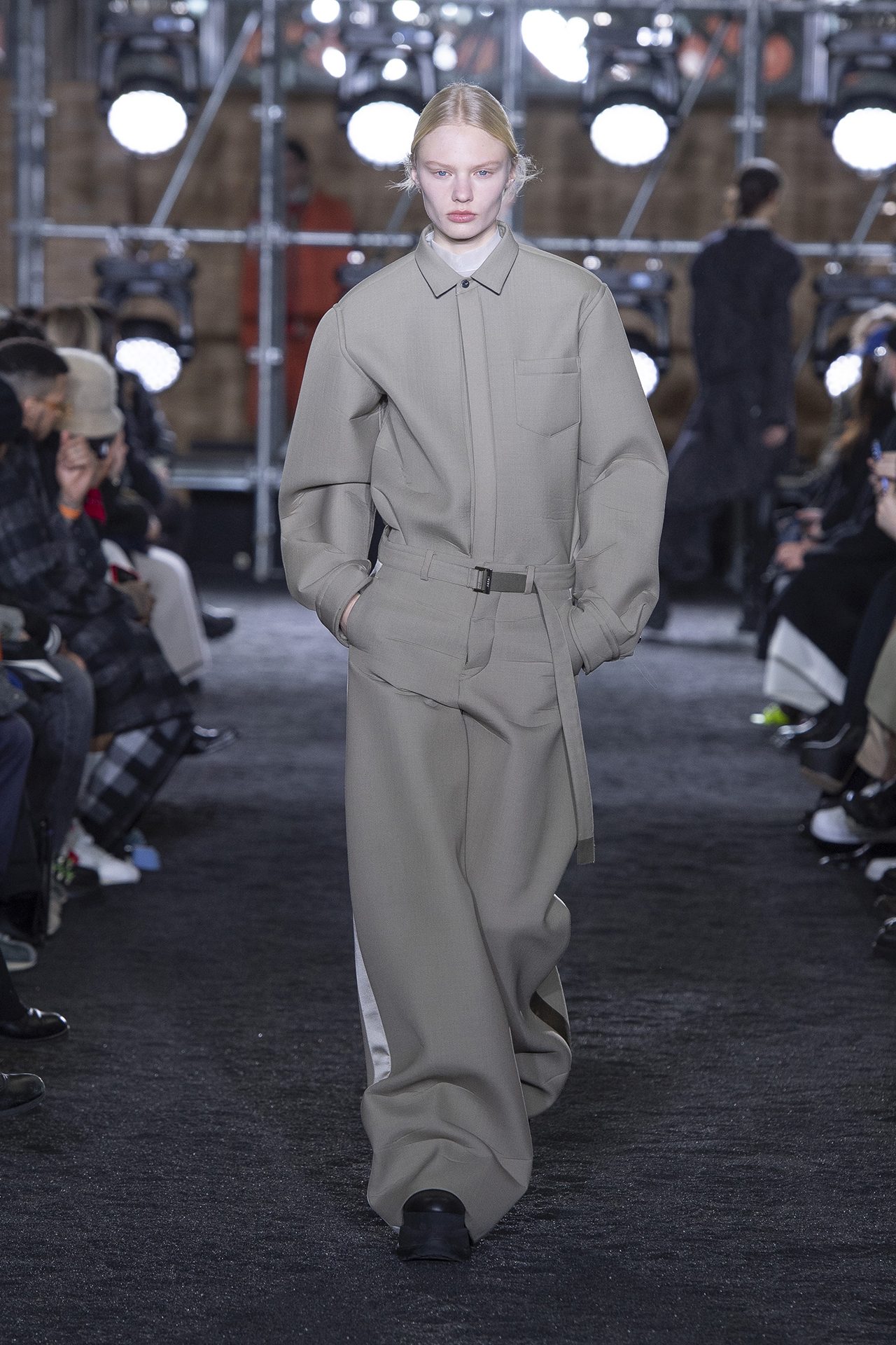 阿部千登勢は、「変身」をテーマに過去、現在、未来の関係性に触れながら、新しいものへと変化するコレクションを発表した。見慣れた形やシルエットが、着こなしによって変形、変化することで着る人の個性を引き出してくれる。ファーストルックは、シンプルなブラックをベースにしながらも、パフスリーブや異素材をミックスさせると共に、ジッパーの開閉により前後で見え方が異なる sacai らしいドレスが登場した。また、ジャケットはアウターレイヤーをバックパックスタイルに変換することで、まったく新しい形の提案を可能にしている。ショーの前半は、カラーをブラックで統一することで、よりシルエットにフィーチャーしたルックが多く見られた。