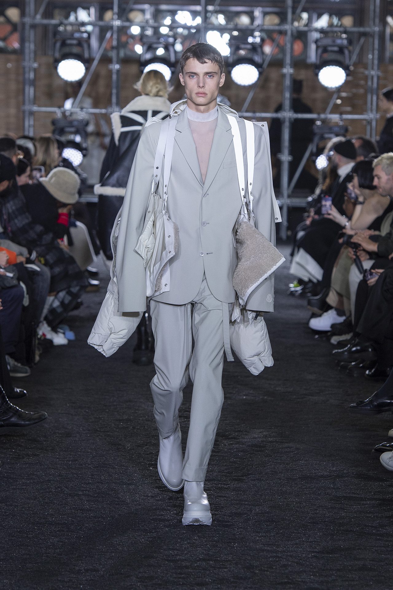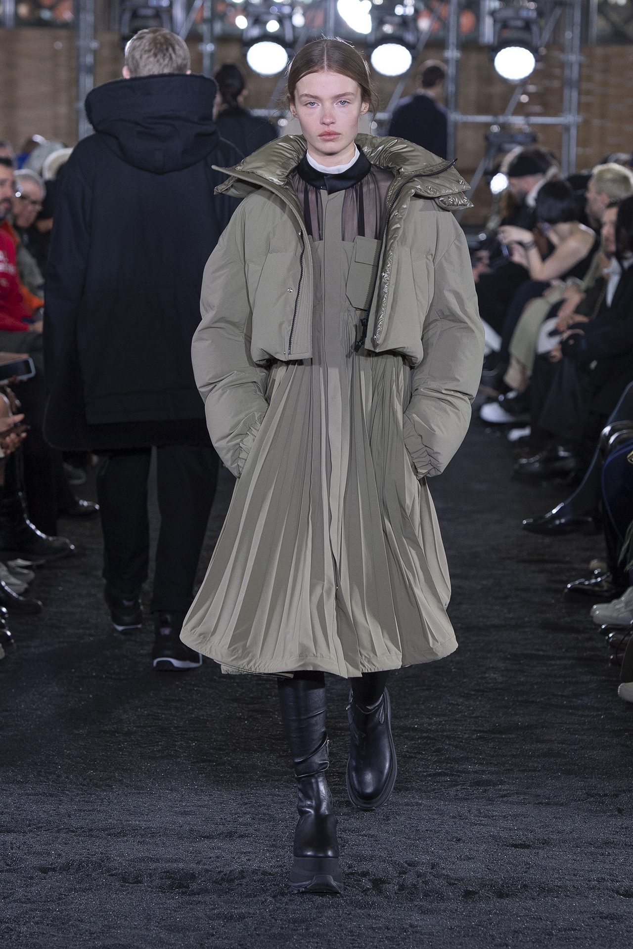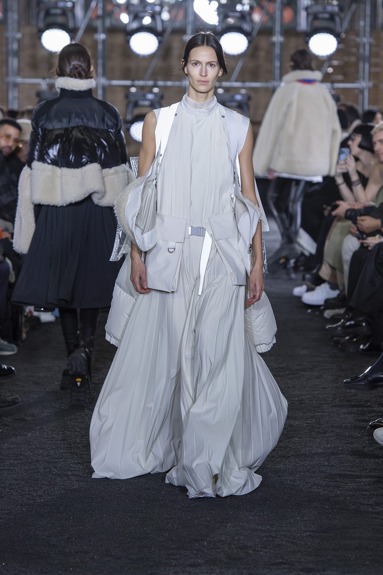Moncler とのコラボアイテムは、幾つものピースを重ね、切り離し、また繋ぎ合わせることで、新しい形を作るマルチピースのフォルムが特徴。ショート丈のダウンジャケットには、フォーマルで洗練されたテーラードスーツがドッキングされ、ジャケットとブレザーはバックが長く垂れ下がり、プリーツやランジェリーから着想を得たドレスが合わせられたりと、女性らしいエレガンスさと実用性が混ざり合ったスタイリングに仕上げられた。