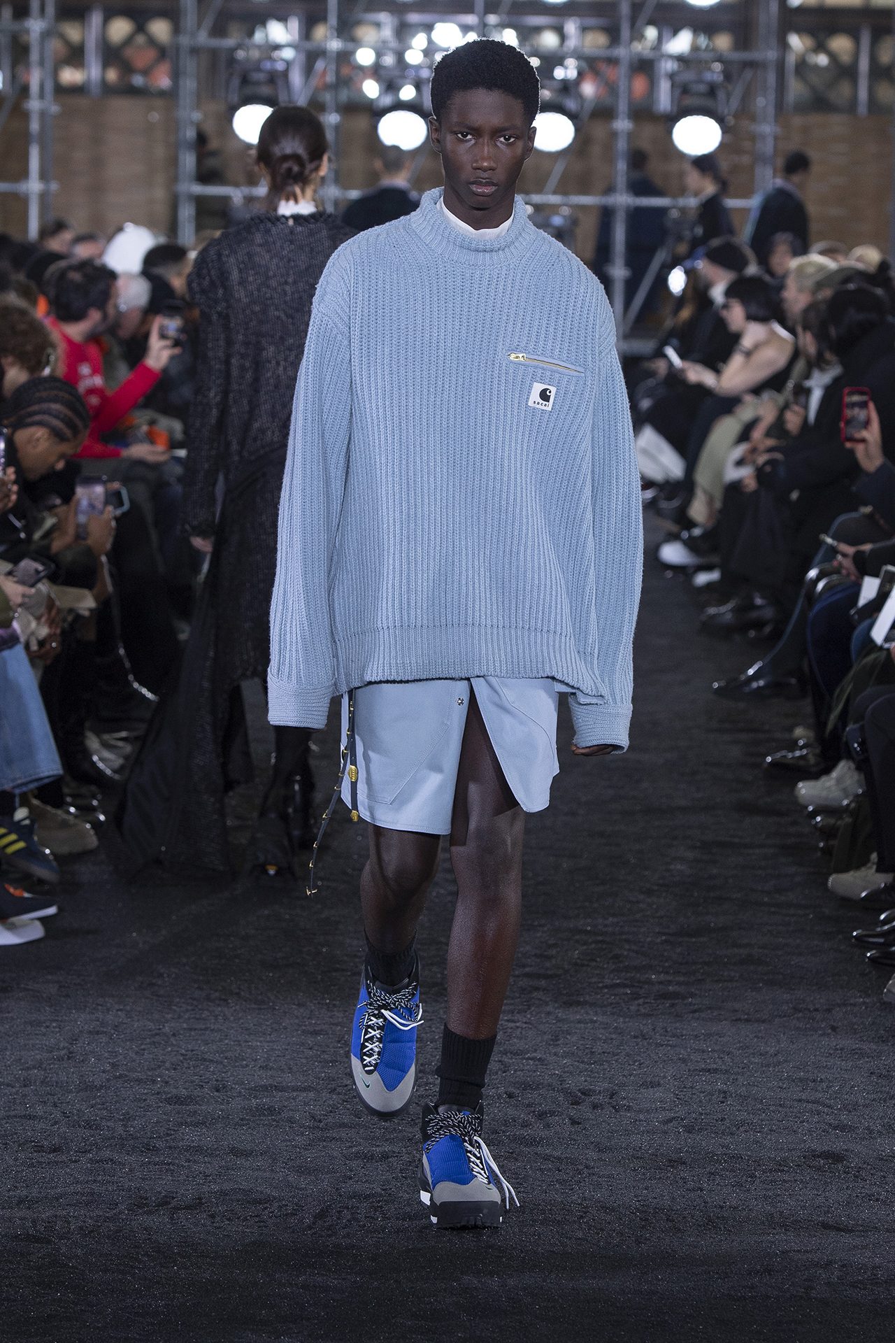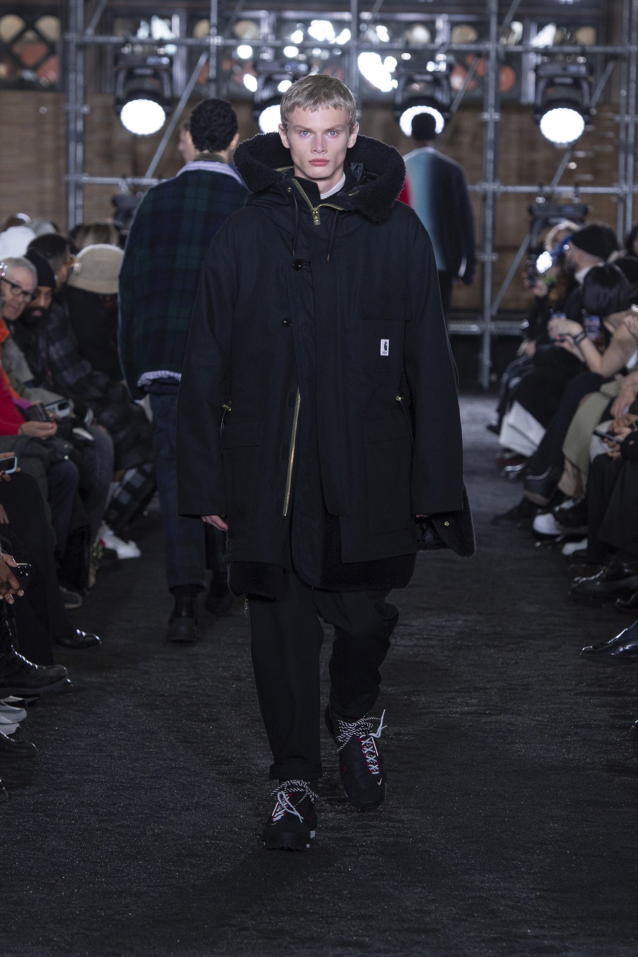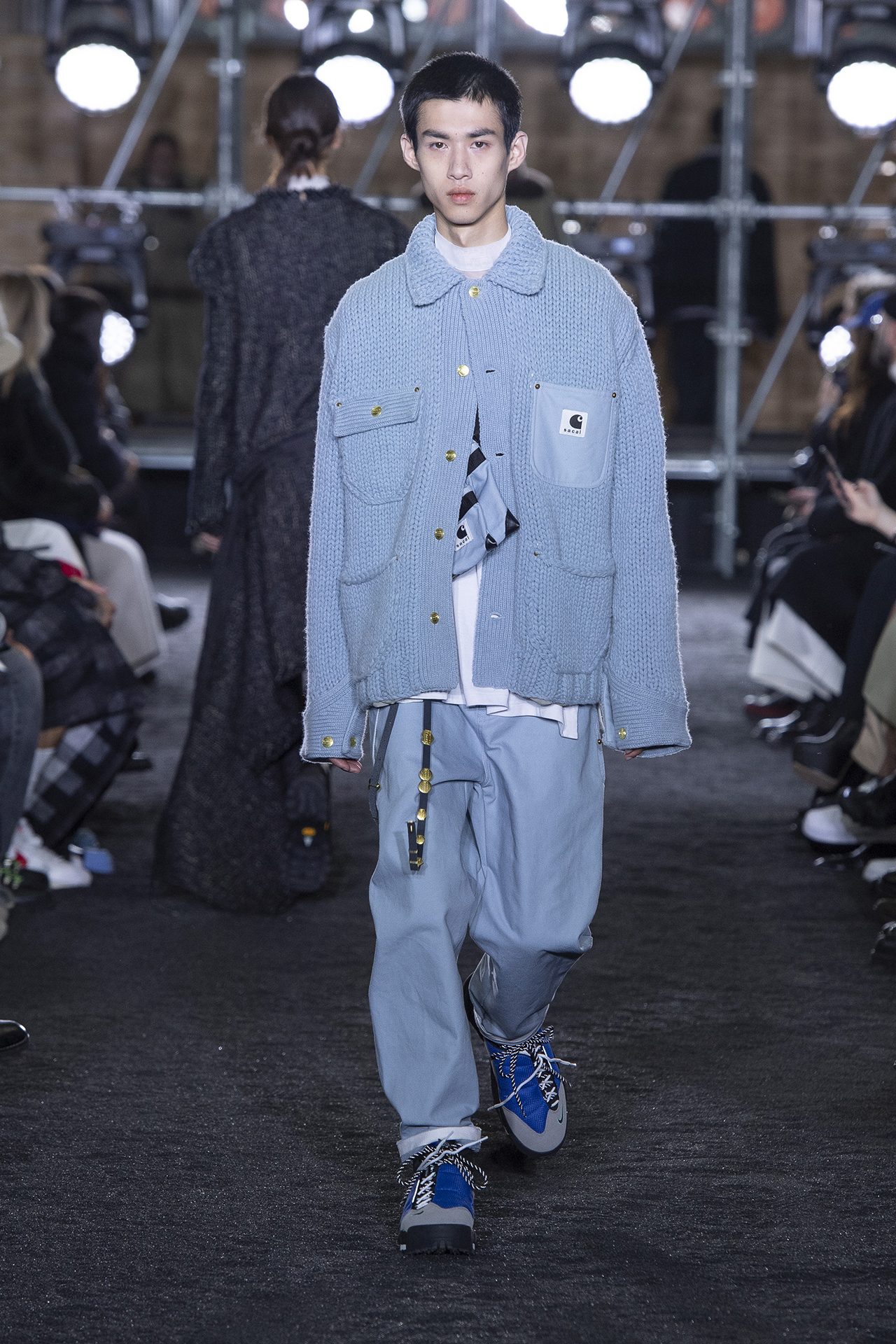 Carhartt WIP とのコラボアイテムは、コートや MA1 ジャケット、パーカー、ニットなどのユーティリティアイテムを sacai ならではの解釈でハイブリッドさせることで、より上質なウェアに再構築した。