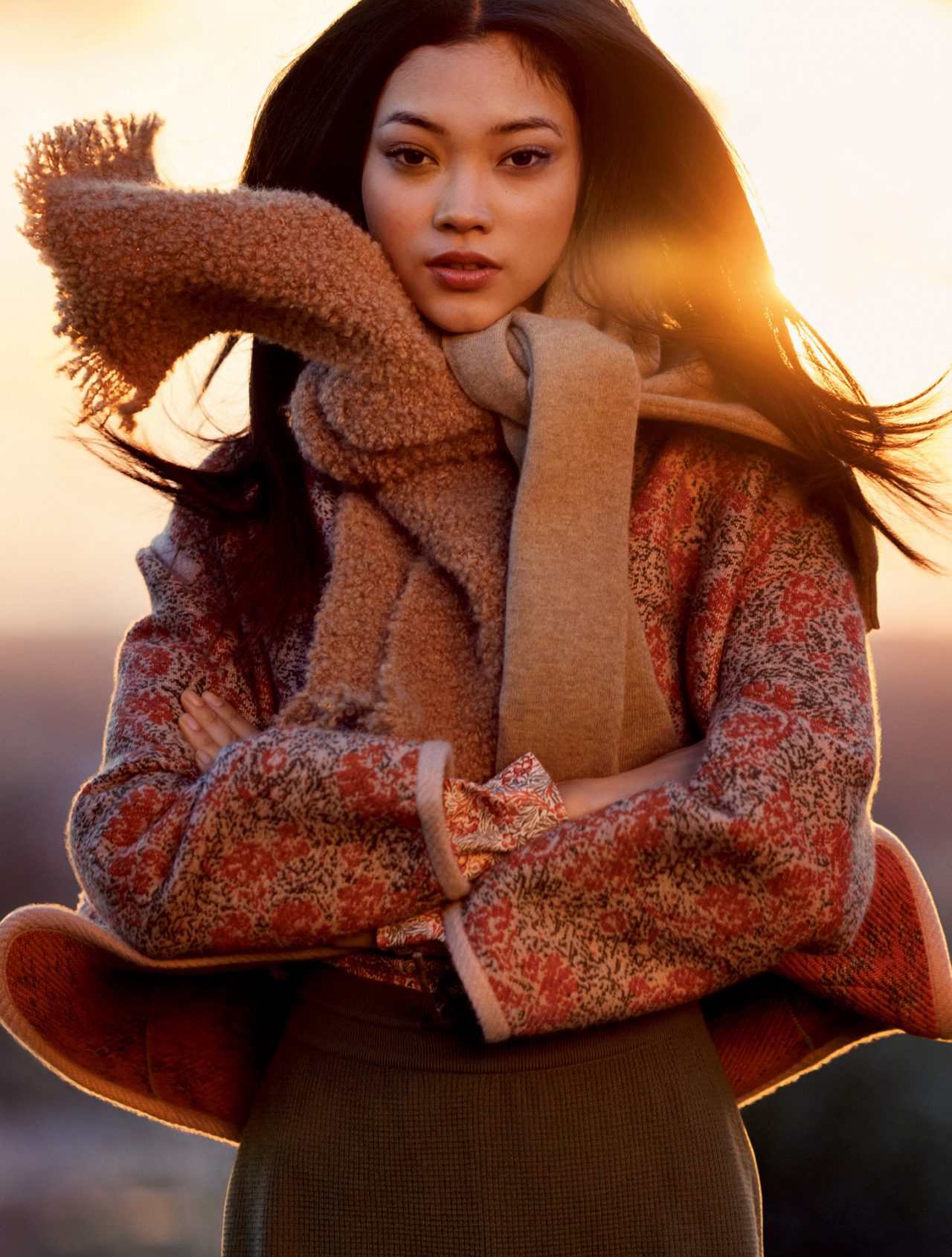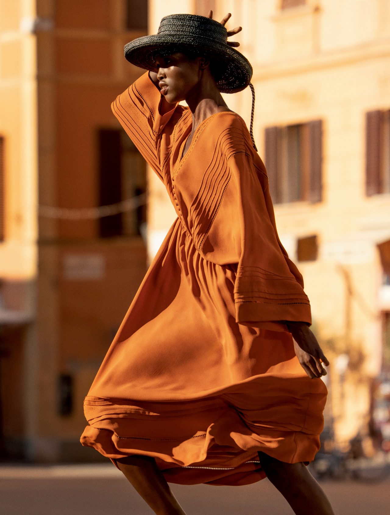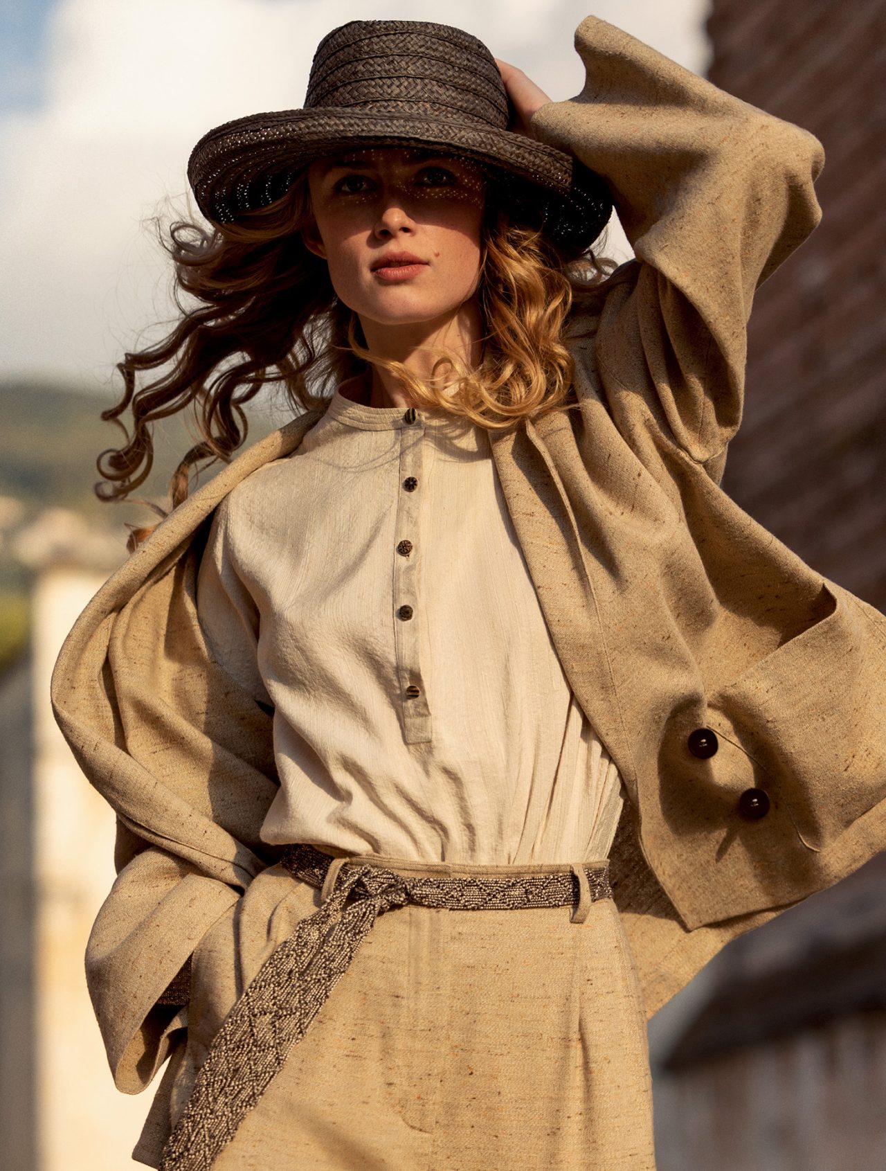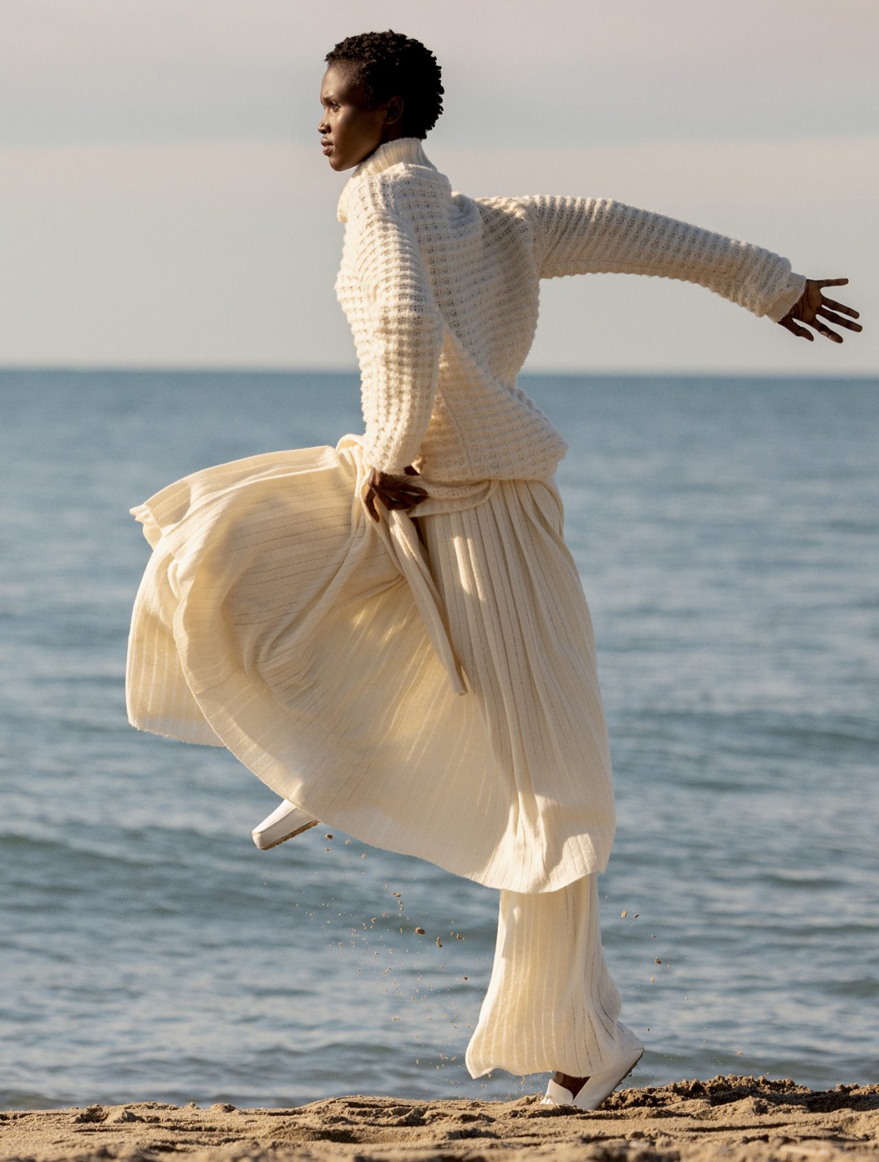 モデルには、 Rianne Van Rompaey (リアン・ヴァン・ロンパエイ)、Amar Akway (アマール・アクウェイ)、Mika Schneider (ミカ・シュナイダー)、Leon Dame (レオン・デイム) を起用。海辺、都会、田舎、別荘、広場など屋内外で撮影された写真は、身体の動きとともに流れるように巻かれる衣服や、表情豊かでのびやかなジェスチャーがとらえられている。静止しているものはなく、身体のエネルギーが解き放たれた写真は、まるで映画のシークエンスの1コマのような仕上がりだ。完璧なテーラードスーツとエアリーなドレスが、ブークレのコート、ニットジャンパー、Loro Piana のアイコンと融合し、コットン、カシミヤ、シルク、リネンが自然な色合いのアースカラーとミックス。フォルムの流れ、質感の密度、コレクションの色彩の安心感が映し出されている。