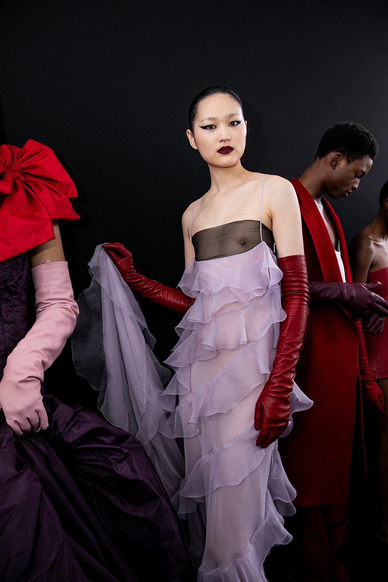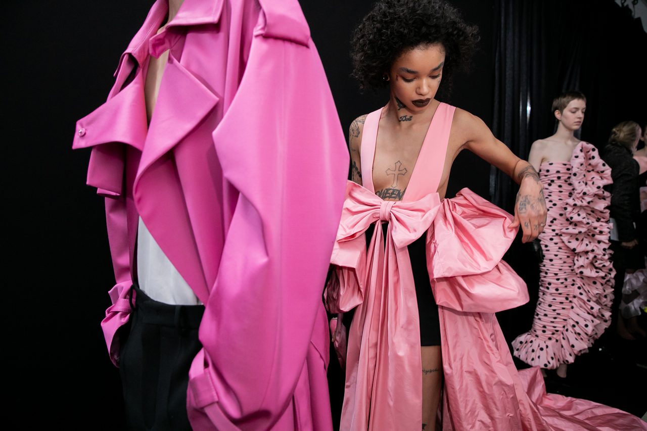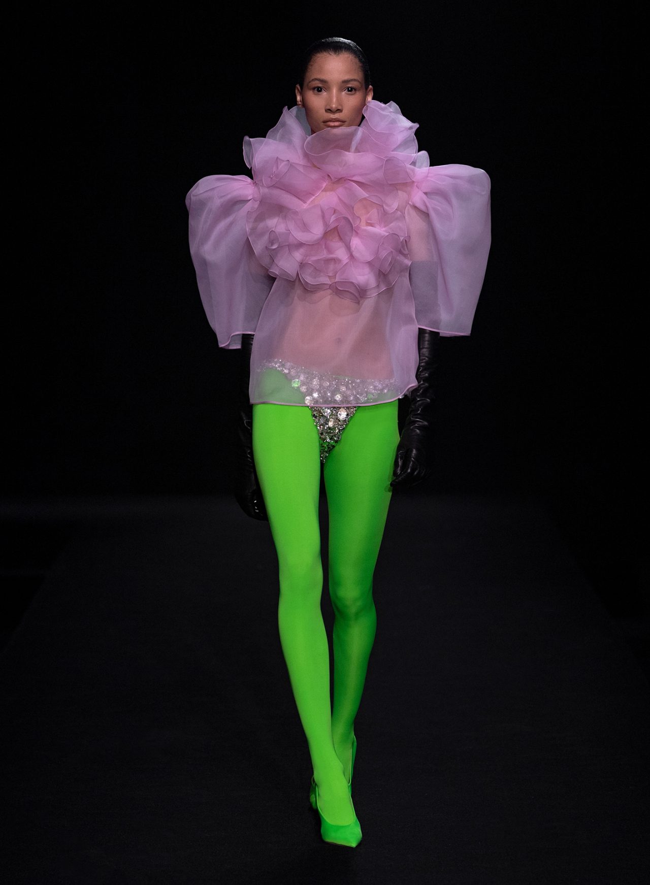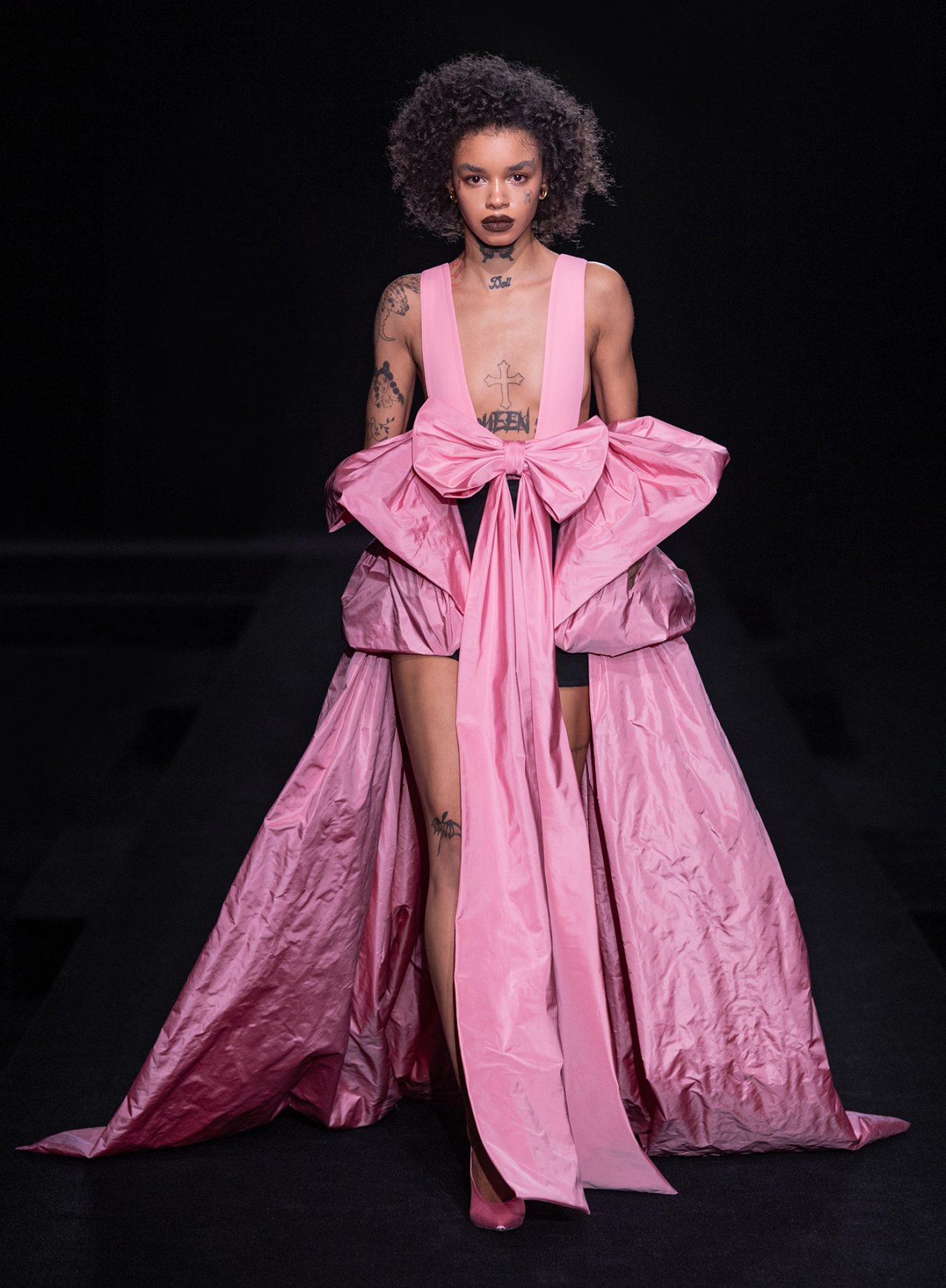 ファーストルックで登場したのは、襟のカッティングが特徴のオーバーサイズジャケットと大きな赤いリボン。ジャケットの下にはシンプルなシャツにブラックのネクタイを締めてマスキュリンな印象を持たせながら、リボンの装飾でフェミニンな雰囲気を醸し出すと共にクラブシーンを連想させるようなルックだ。全体的に色が強調されたコレクションだったが、昨年の秋冬コレクションにて発表され、大きな話題を呼んだメゾンのオリジナルカラー「VALENTINO Pink PP」を採用したアイテムが今回も豊富に登場。ボールガウンやコート、アイウェア、オペラグローブなどがピンクで彩られ、存在感を示した。他にも、ベビーピンクとネオングリーン、イエローとブラックなど、遊び心のあるカラーの組み合わせにも注目だ。