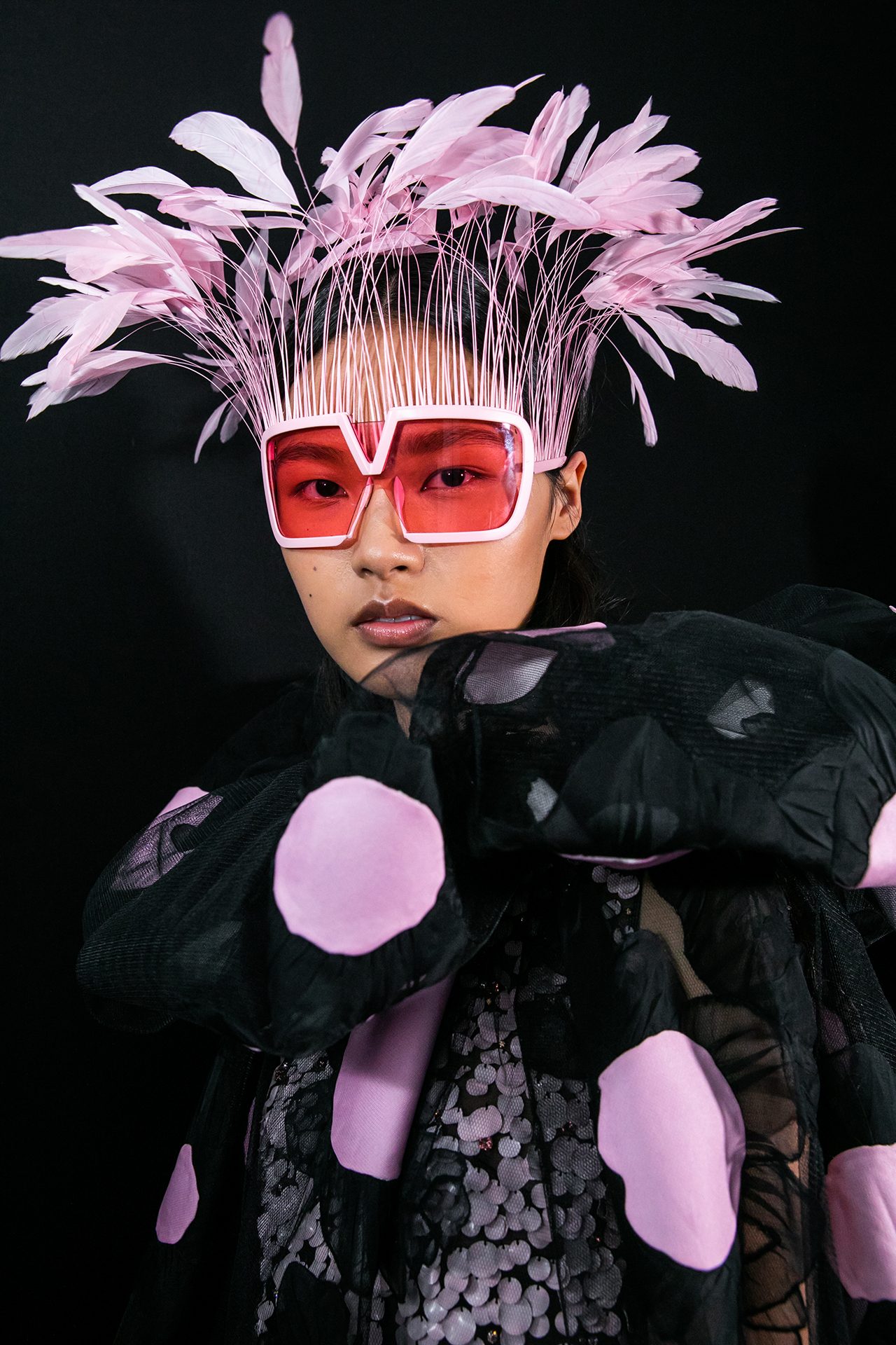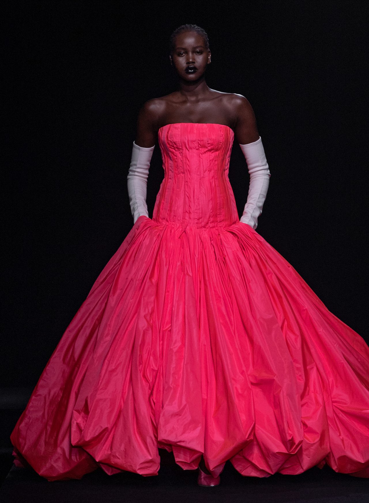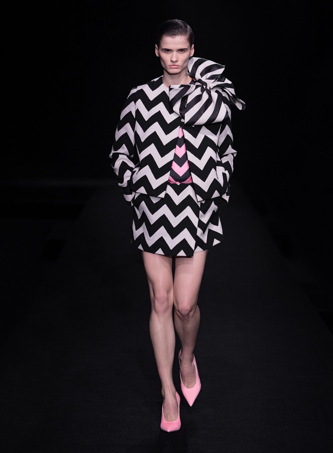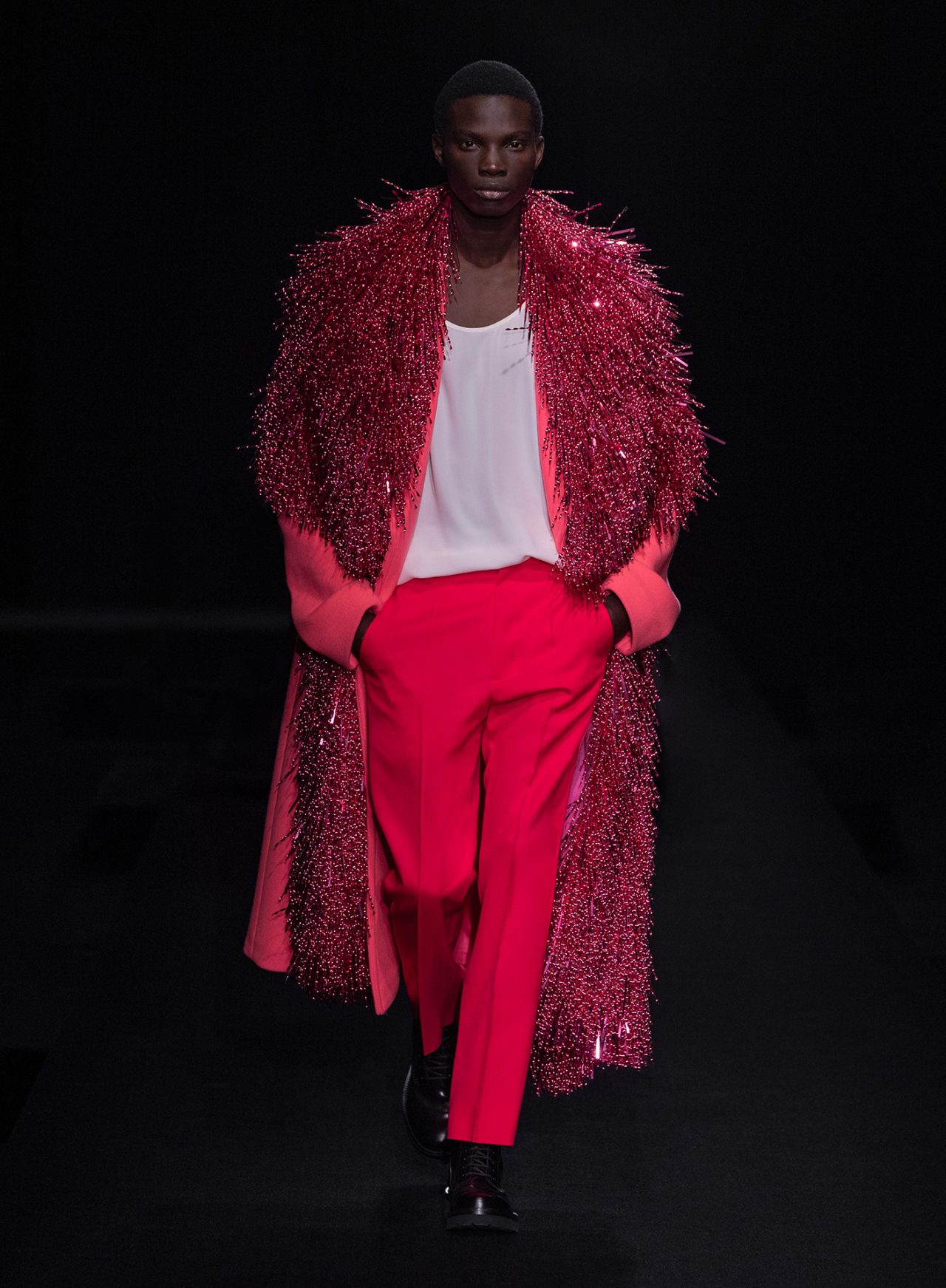 ファーストルックで登場したのは、襟のカッティングが特徴のオーバーサイズジャケットと大きな赤いリボン。ジャケットの下にはシンプルなシャツにブラックのネクタイを締めてマスキュリンな印象を持たせながら、リボンの装飾でフェミニンな雰囲気を醸し出すと共にクラブシーンを連想させるようなルックだ。全体的に色が強調されたコレクションだったが、昨年の秋冬コレクションにて発表され、大きな話題を呼んだメゾンのオリジナルカラー「VALENTINO Pink PP」を採用したアイテムが今回も豊富に登場。ボールガウンやコート、アイウェア、オペラグローブなどがピンクで彩られ、存在感を示した。他にも、ベビーピンクとネオングリーン、イエローとブラックなど、遊び心のあるカラーの組み合わせにも注目だ。