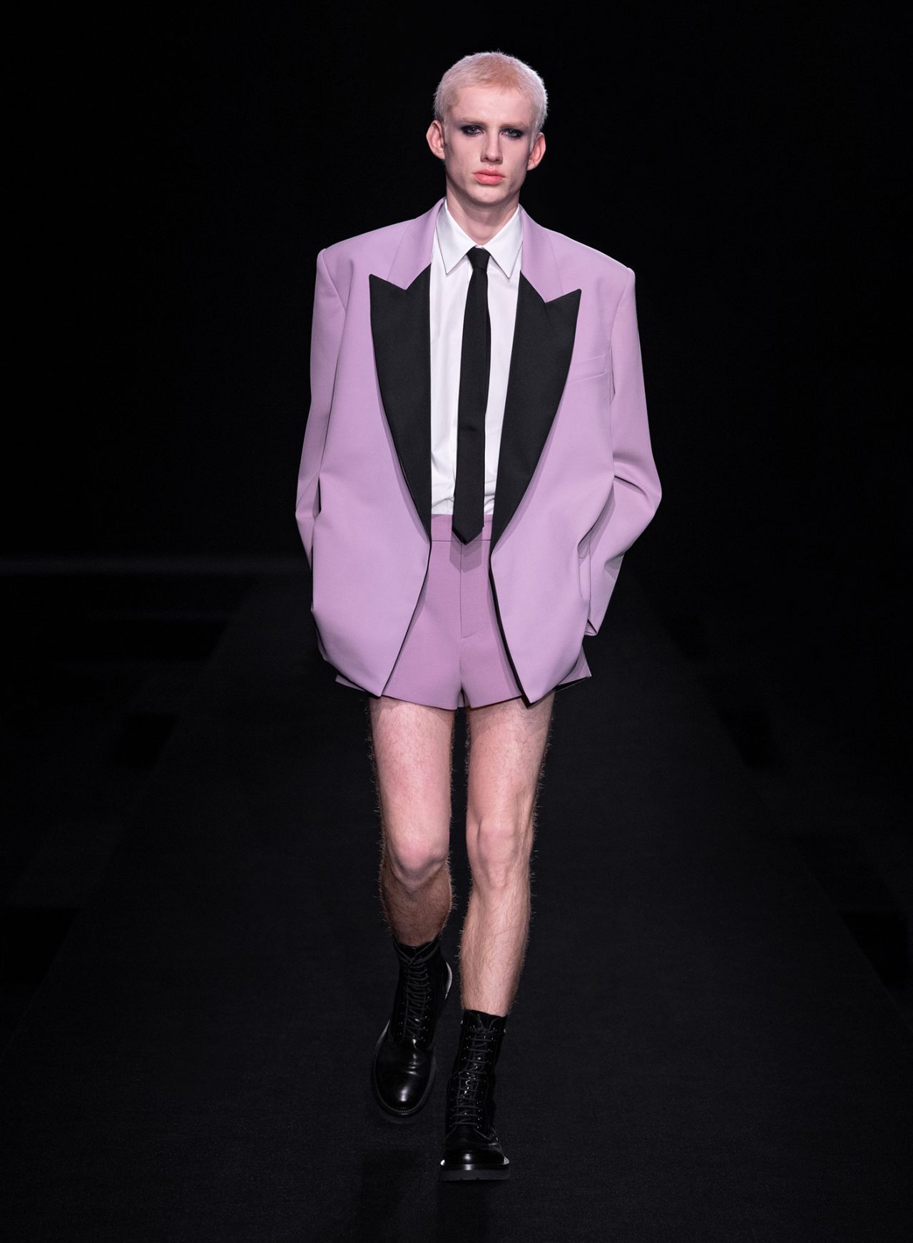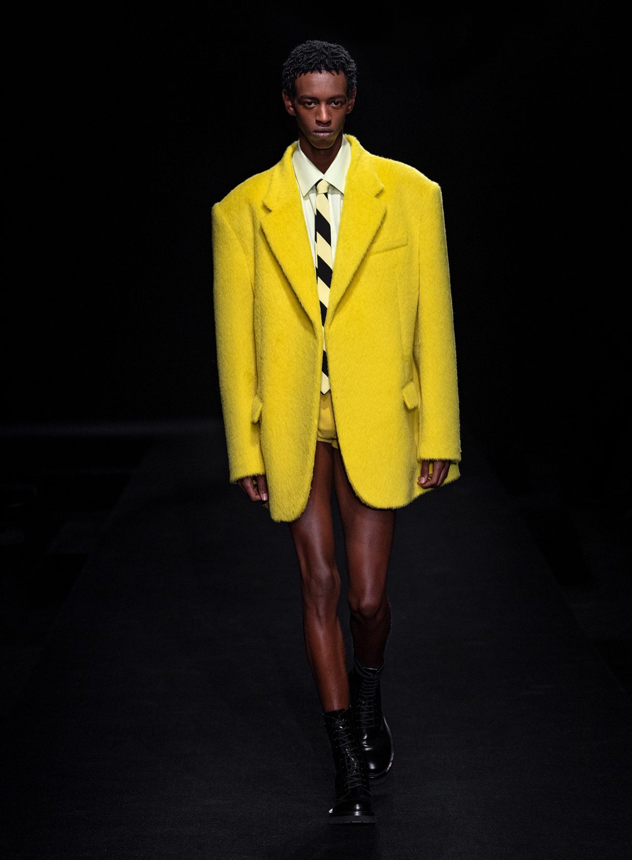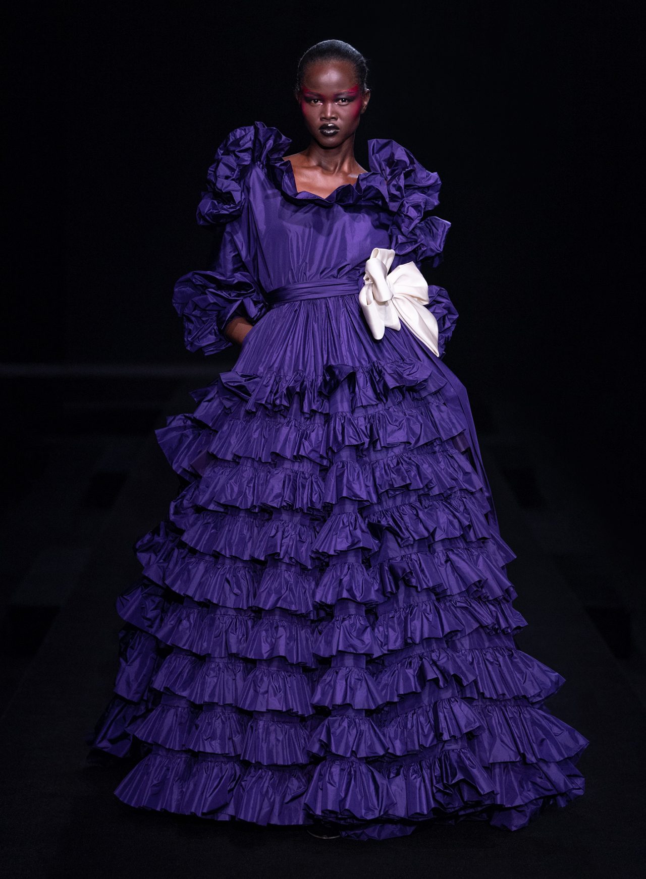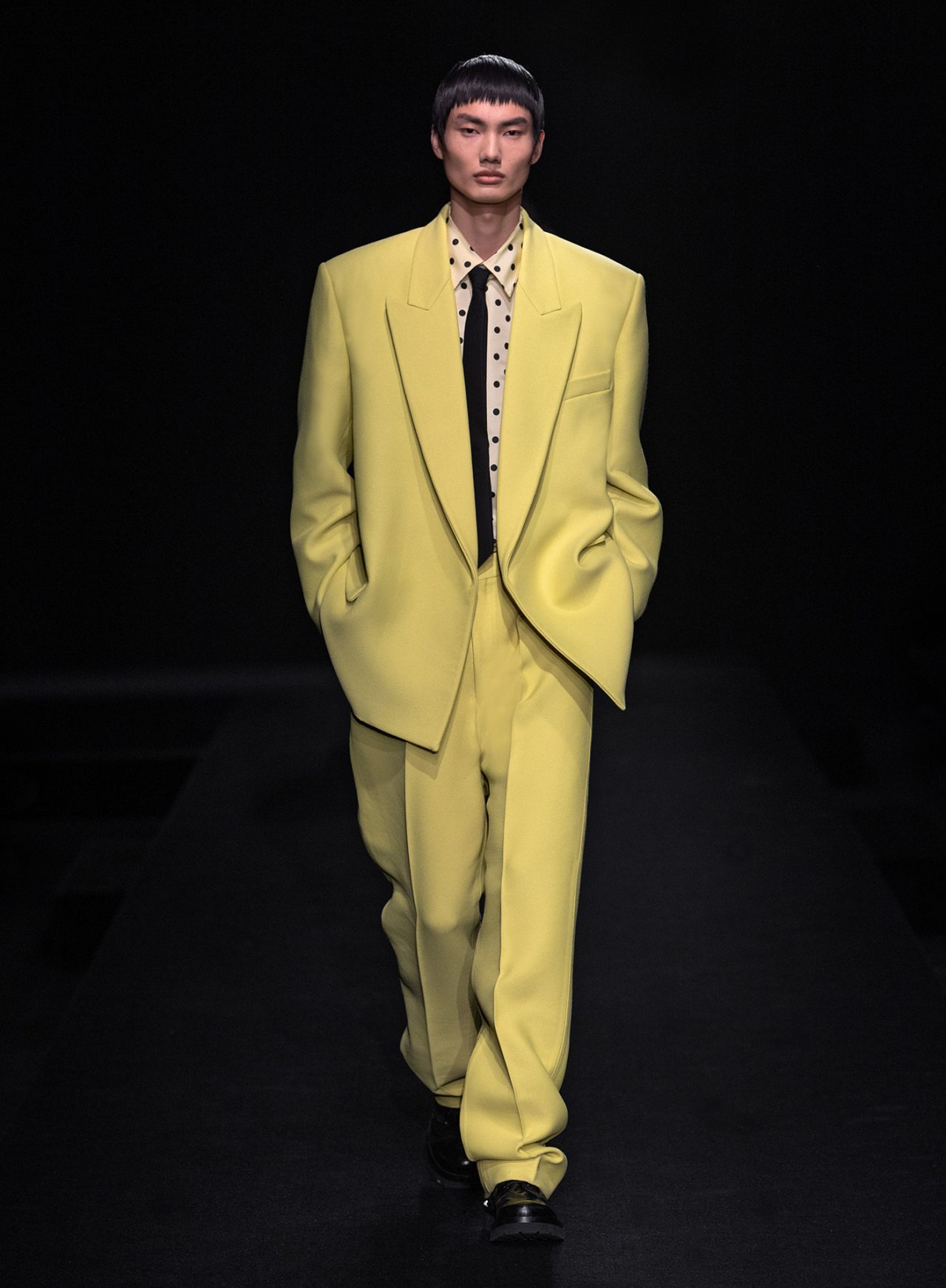 ファーストルックで登場したのは、襟のカッティングが特徴のオーバーサイズジャケットと大きな赤いリボン。ジャケットの下にはシンプルなシャツにブラックのネクタイを締めてマスキュリンな印象を持たせながら、リボンの装飾でフェミニンな雰囲気を醸し出すと共にクラブシーンを連想させるようなルックだ。全体的に色が強調されたコレクションだったが、昨年の秋冬コレクションにて発表され、大きな話題を呼んだメゾンのオリジナルカラー「VALENTINO Pink PP」を採用したアイテムが今回も豊富に登場。ボールガウンやコート、アイウェア、オペラグローブなどがピンクで彩られ、存在感を示した。他にも、ベビーピンクとネオングリーン、イエローとブラックなど、遊び心のあるカラーの組み合わせにも注目だ。