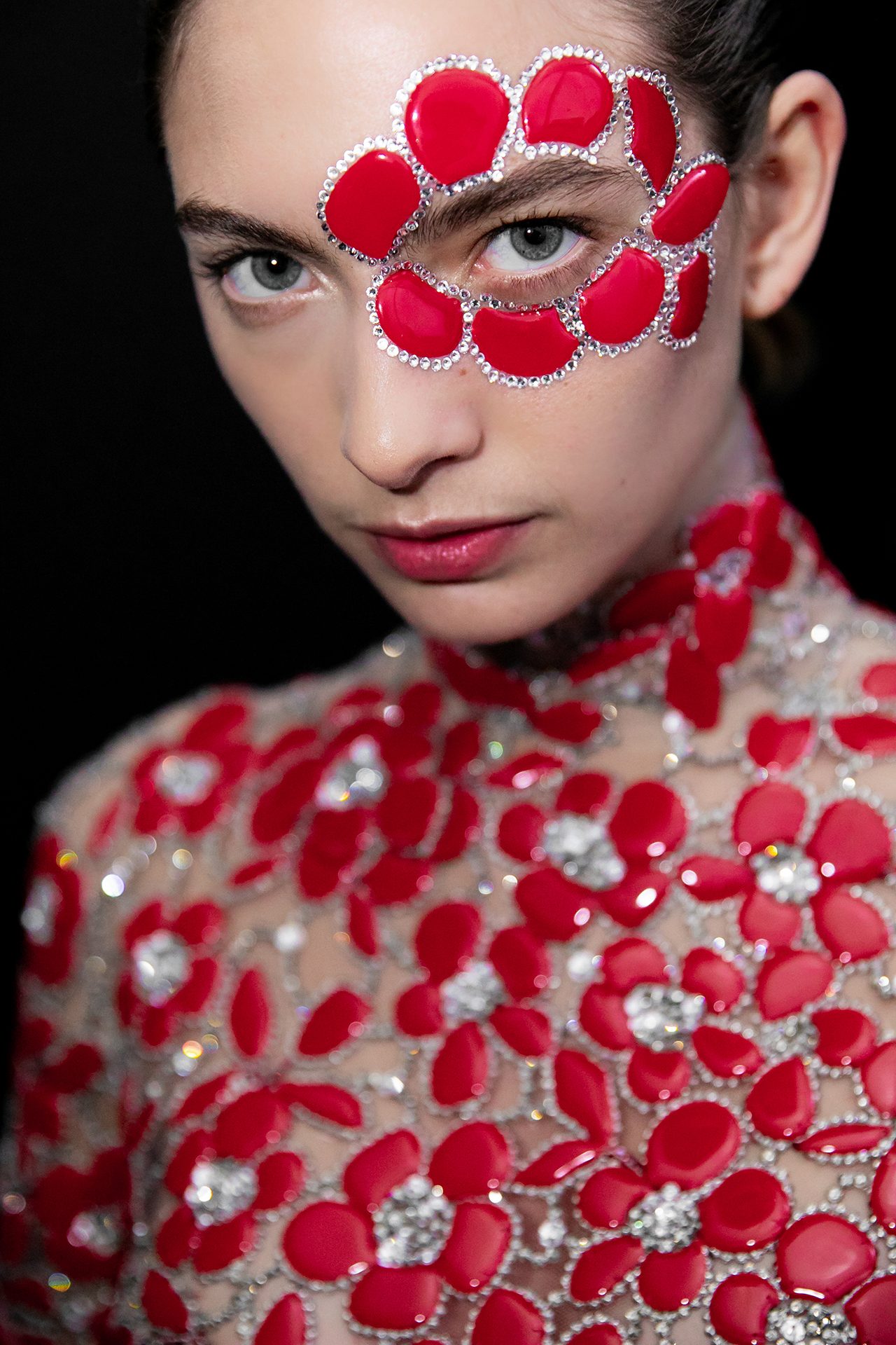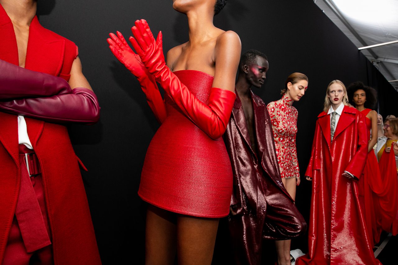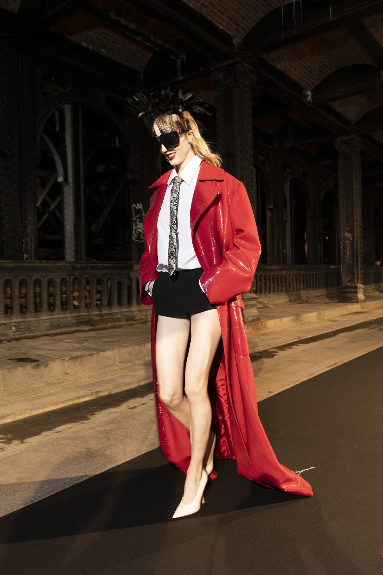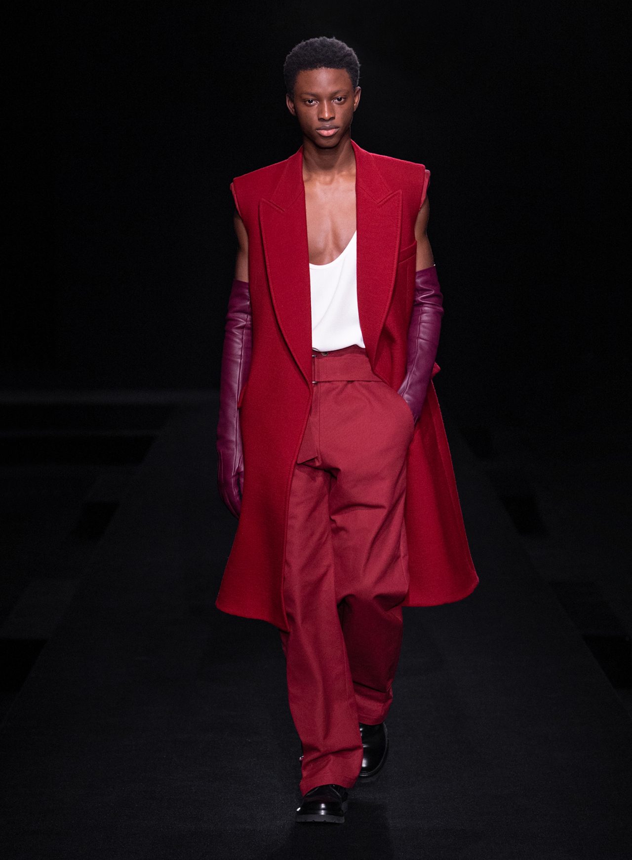ファーストルックで登場したのは、襟のカッティングが特徴のオーバーサイズジャケットと大きな赤いリボン。ジャケットの下にはシンプルなシャツにブラックのネクタイを締めてマスキュリンな印象を持たせながら、リボンの装飾でフェミニンな雰囲気を醸し出すと共にクラブシーンを連想させるようなルックだ。全体的に色が強調されたコレクションだったが、昨年の秋冬コレクションにて発表され、大きな話題を呼んだメゾンのオリジナルカラー「VALENTINO Pink PP」を採用したアイテムが今回も豊富に登場。ボールガウンやコート、アイウェア、オペラグローブなどがピンクで彩られ、存在感を示した。他にも、ベビーピンクとネオングリーン、イエローとブラックなど、遊び心のあるカラーの組み合わせにも注目だ。