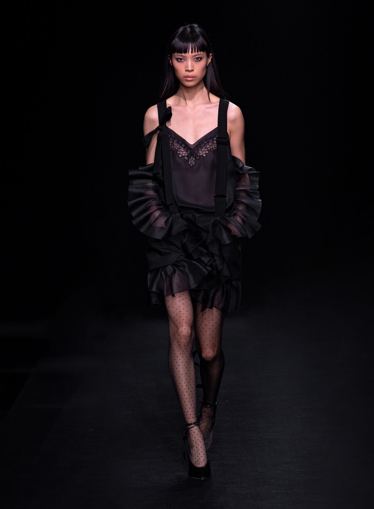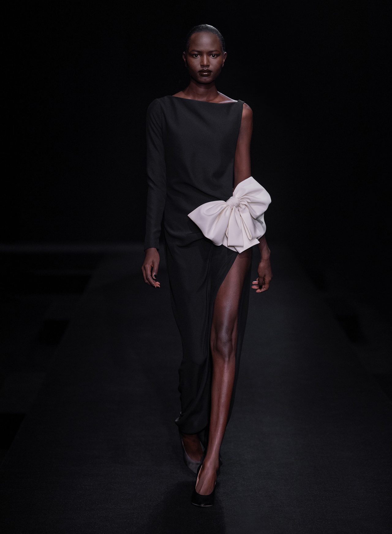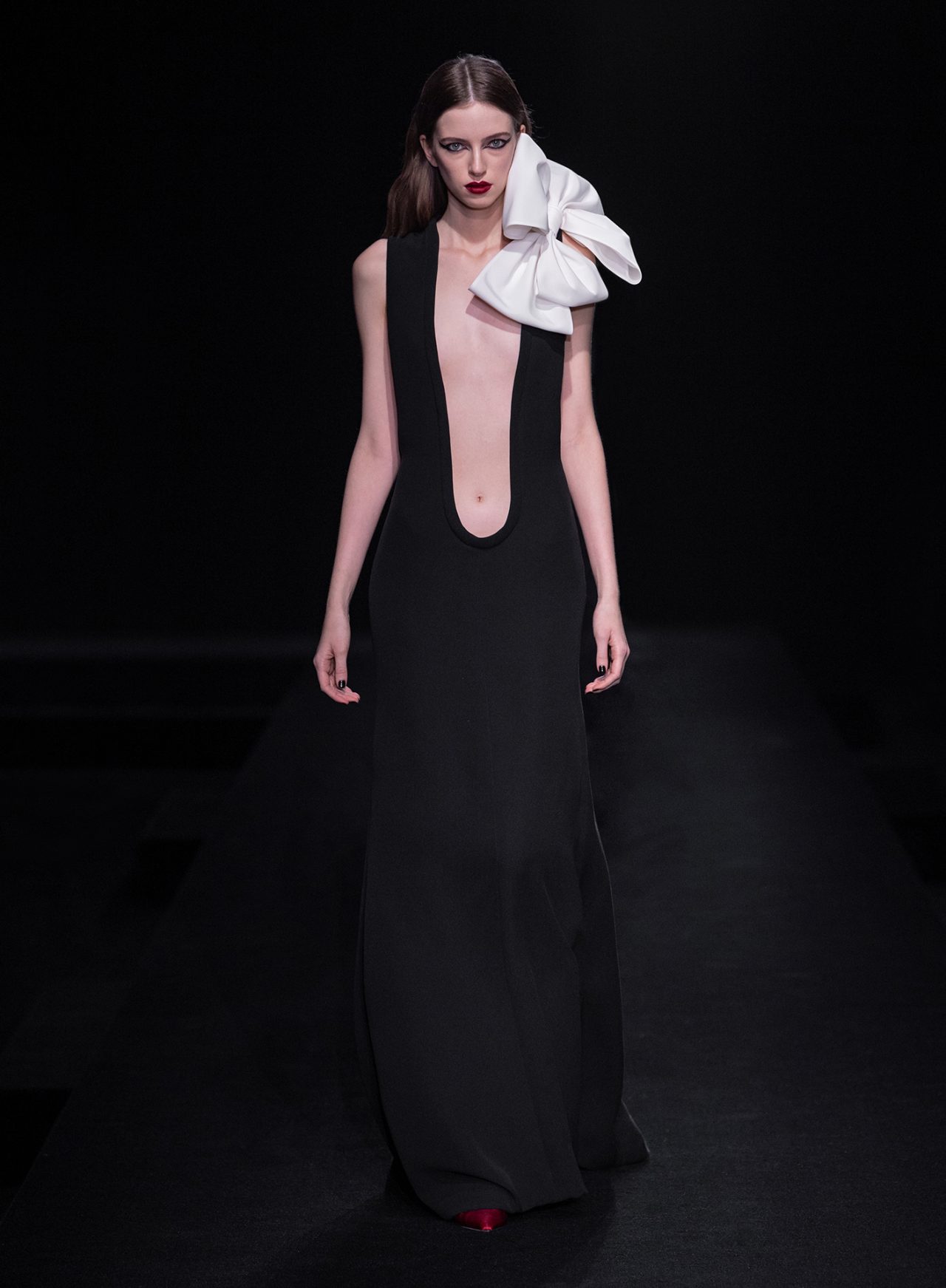 Hercules and Love Affair (ヘラクレス・アンド・ラブ・アフェア) の Andy Butler (アンディ・バトラー) によるサウンドトラックに乗せ、ナイトクラブの暗闇の中から現れたのは、ボディ上でコントラストを描くファブリックや繊細な手仕事が反映されたルックの数々。再解釈されたポルカドットとストライプのカッティング、華やかなエンブロイダリー、ハンドドレープ、ブラックサテンのリボン、柔らかなフェザーガウン、美しく大胆なチュールドレスなど、エレガンスの中に、美の多様性、個性としての美、内なる真実を追及した VALENTINO ならではのディテールが光るコレクションとなった。