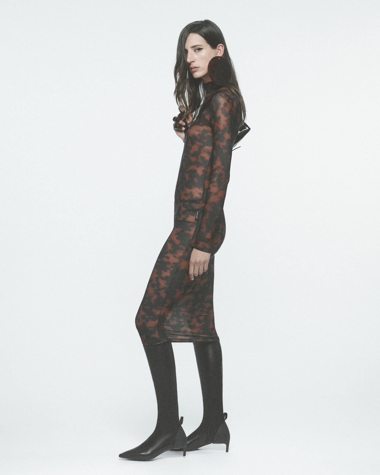 肘に大きなスリットが入り、ジッパーを開けると腕の上に覆い被さるデザインのジャケットにはフーディーやスキントップスを忍ばせ、ミニスカートと融合したパリッとしたシネ素材のスラックスには腿部分に大きなカッティングを施すなど、フォーマルなテーラードにエキセントリックなエッセンスを加えた。ユニセックスのジャージ素材のセパレーツには、「全てを見通す」眼が宿っており、未来へと導くサインのように私たちを見つめている。ネオカモフラージュや大胆なシルクスクリーンプリントは、新時代のオフィスウェアの定番となることだろう。