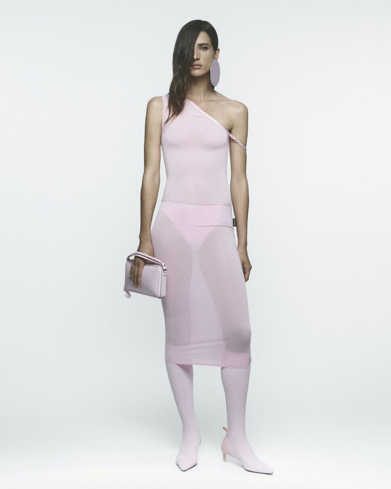 クレープ織りにはパンキッシュなウールキャビアを合わせ、アーカイブのパターンからテクニカルなランジェリーを覗かせるなど、ブランドの特徴である幾何学模様は異素材の重なりによってその伝統を覆した。さらに、今シーズンのコレクションで多く見られたワンショルダートップスや、腿の高さまであるストレッチレザーのコンバットブーツは、ジェンダーの境界を曖昧にしている。ルックは、クラシックなケースバッグを再構築したミニマルな「クラウドバッグ」と組み合わされ、柔らかさを醸し出しながらも、指に光るナックルアーマーや印象的な「衛星放送受信アンテナ」イヤリングで反体制の雰囲気を高めた。