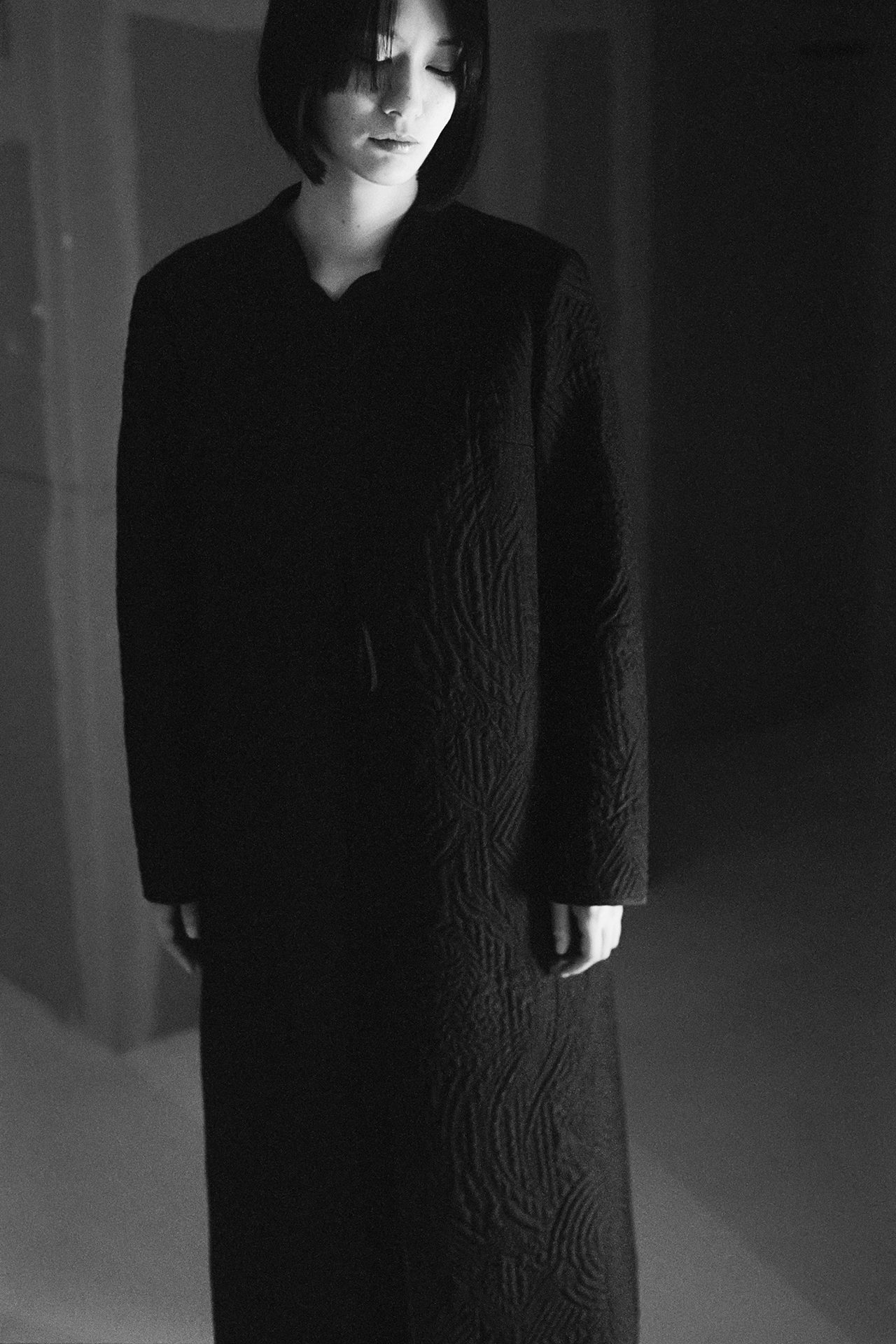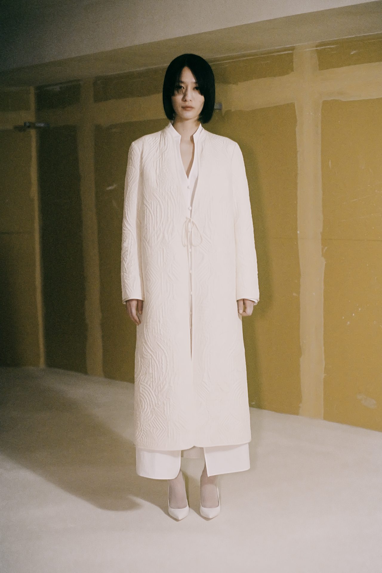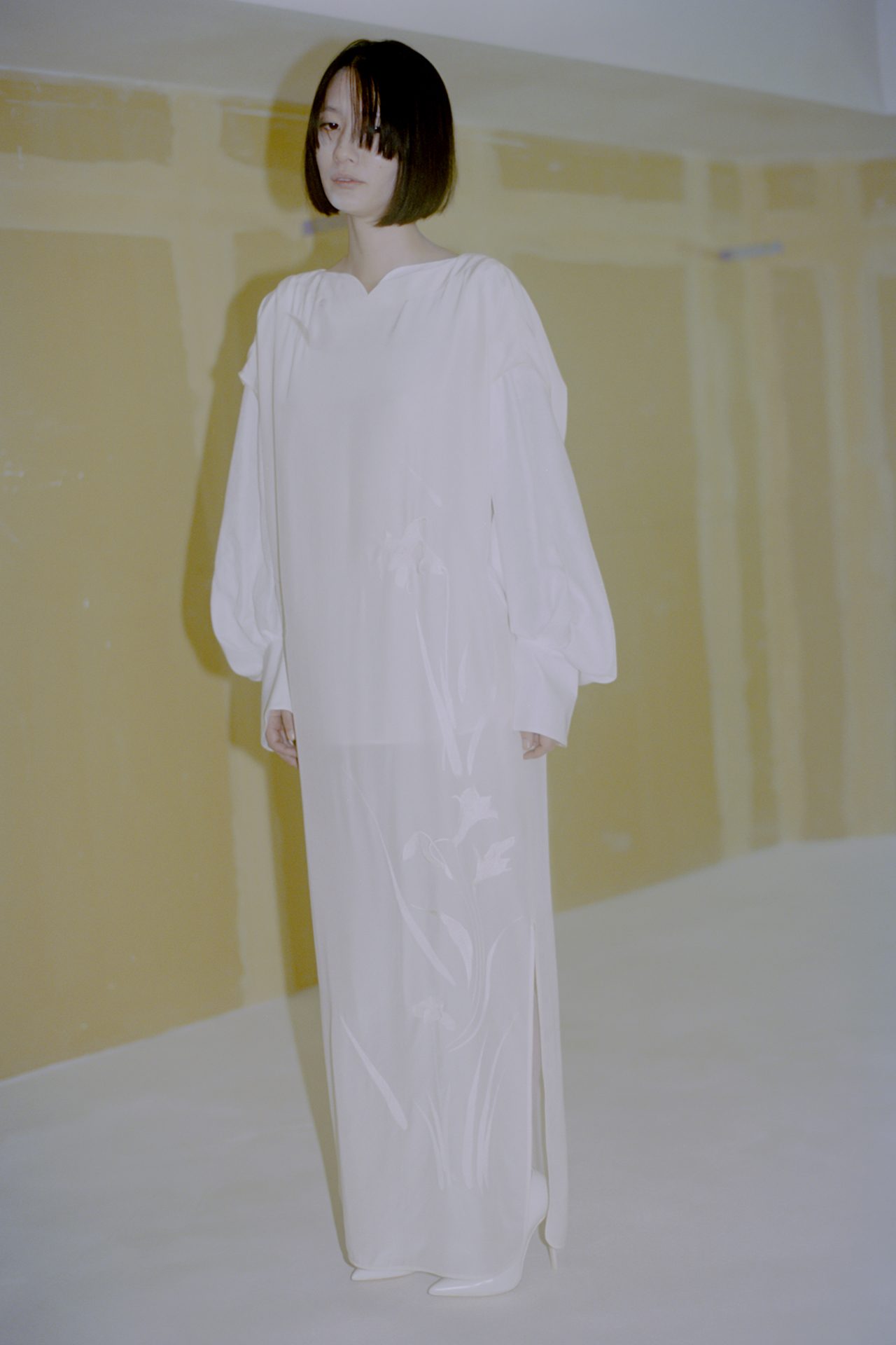 プロヴァンスの伝統的刺繍技法であるブティ刺繍を想起させる、草花のキルティング刺繍が全体に施されたコートやジャケット、ビスチェは、シルクの表地にシルクキュプラのライニング、シルクの中綿といった、贅沢な素材使いにより生み出された。アルルで目にした生き生きとした草花の記憶が、細やかで色彩豊かな刺繍としてあしらわれることで、まるで白昼夢を思わせるおぼろげなニュアンスに、凛とした静けさと力強さがプラス。シルク素材のドレスやオープンカラーのシャツは、腕を通すと命を与えられたかのようにトーンオントーンの刺繍が浮かび上がり、また別の顔を覗かせる。