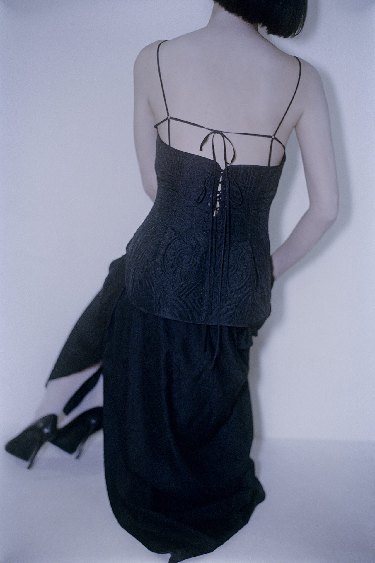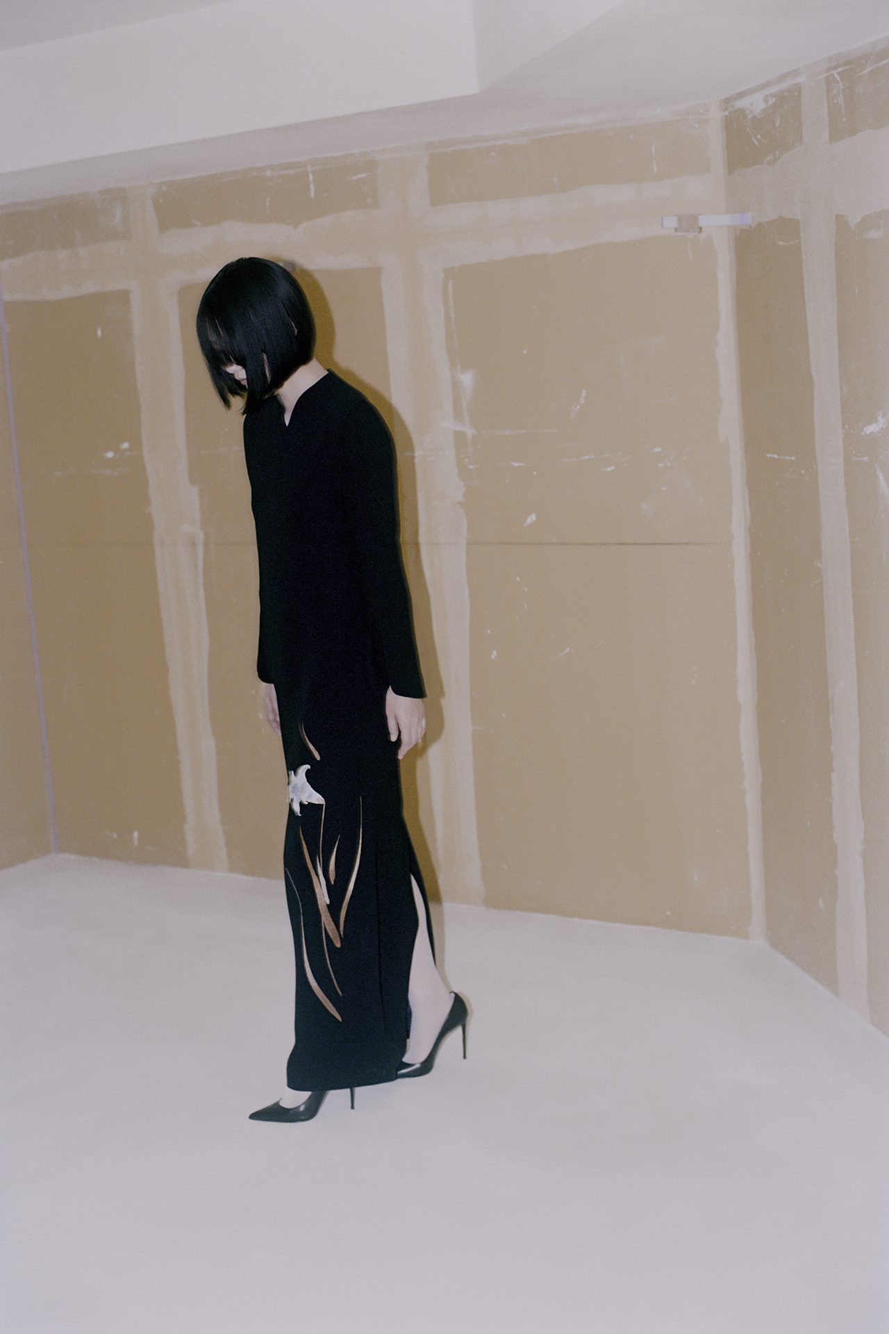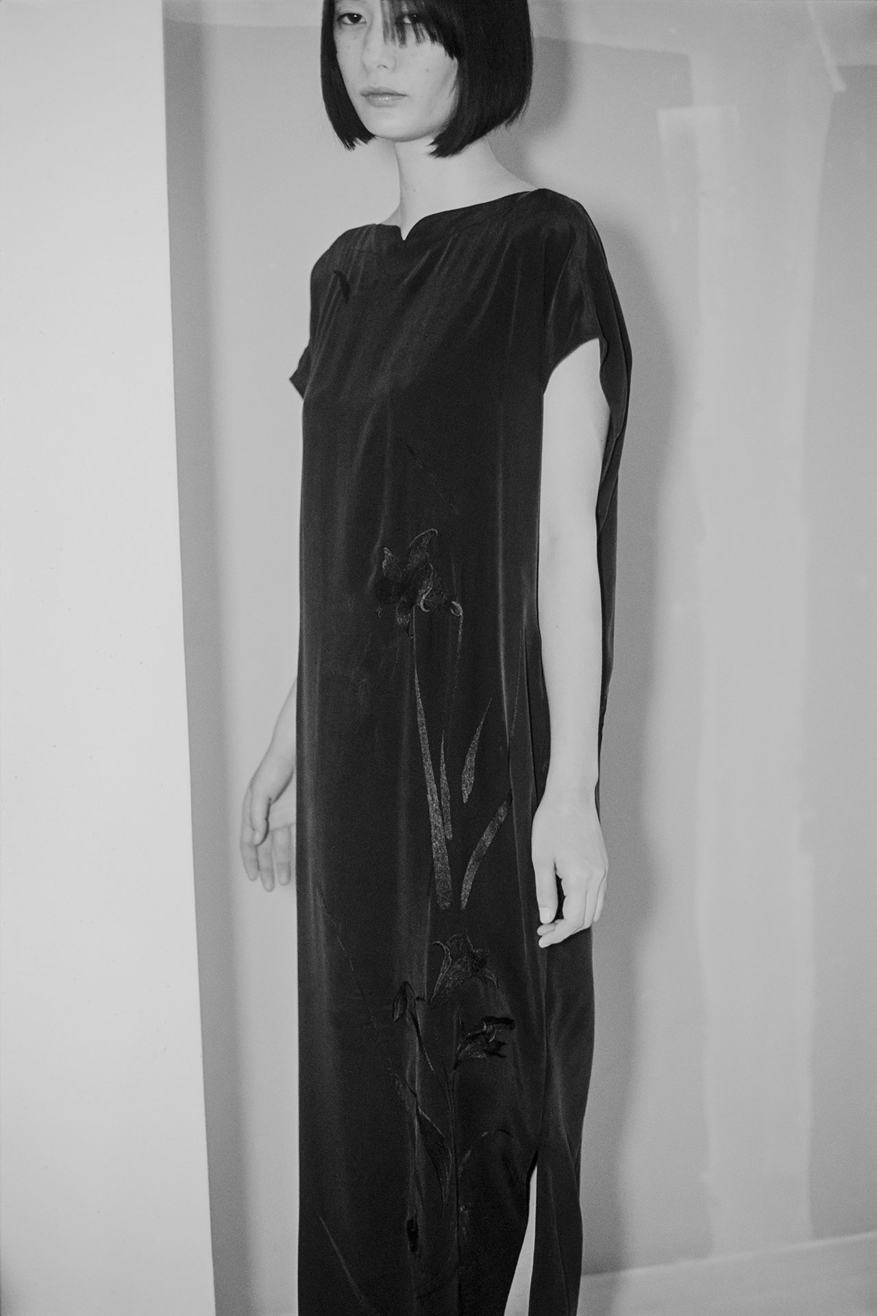 プロヴァンスの伝統的刺繍技法であるブティ刺繍を想起させる、草花のキルティング刺繍が全体に施されたコートやジャケット、ビスチェは、シルクの表地にシルクキュプラのライニング、シルクの中綿といった、贅沢な素材使いにより生み出された。アルルで目にした生き生きとした草花の記憶が、細やかで色彩豊かな刺繍としてあしらわれることで、まるで白昼夢を思わせるおぼろげなニュアンスに、凛とした静けさと力強さがプラス。シルク素材のドレスやオープンカラーのシャツは、腕を通すと命を与えられたかのようにトーンオントーンの刺繍が浮かび上がり、また別の顔を覗かせる。