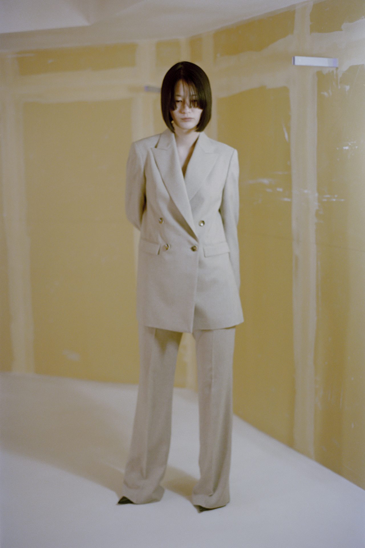 今シーズン、日常からすくい取られたテクスチャーへのユニークな目線は、さらにミクロな単位まで落とし込まれた。アルルの街を舞う石灰石のパウダーが肌や洋服に付着することで、偶然に作り出される抽象的な景色があらゆるピースの質感に影響を及ぼしている。ニドム加工による滑らかな生地は、緻密なパターン設計によってメンズシャツのようなオーバーサイズのシャツとなり、ノンシャランな「アティチュードのデザイン」という Mame Kurogouchi が考えベーシックを表現。放射線状に入ったタックがウェスト周りに象徴的な陰影を作り出すトラウザーズは、近江晒(おうみさらし)という加工が施されたコットン素材が採用された。近江晒とは、滋賀県愛荘町にて培われた伝統的な技法である。木材などを燃やした灰を水で溶かした灰汁をかけながら半月ほど天日干しし、釜に入れて灰汁と焚き込み、再び日光に晒す工程を数回繰り返した後、最後に木臼でついて水で洗いげ、また数十日日光に晒して完成させるという加工法だ。麻の色調とタッチを再現したトリアセテートのセットアップなどと共に、ドライな質感で夏の終わりから秋に至るまで、その快適さを実感できるだろう。