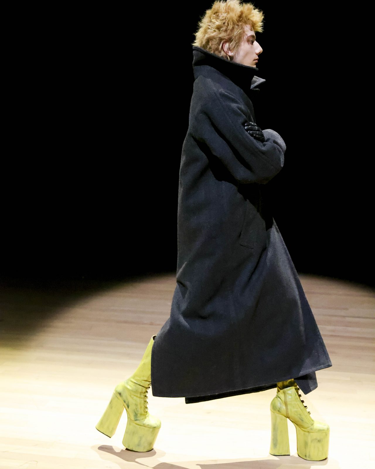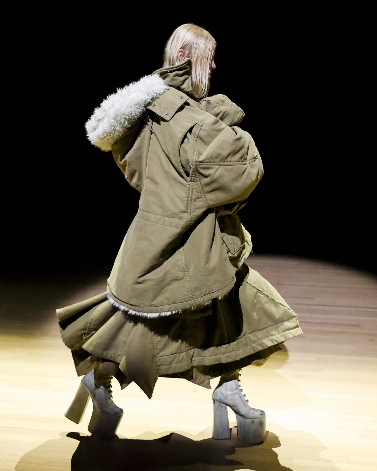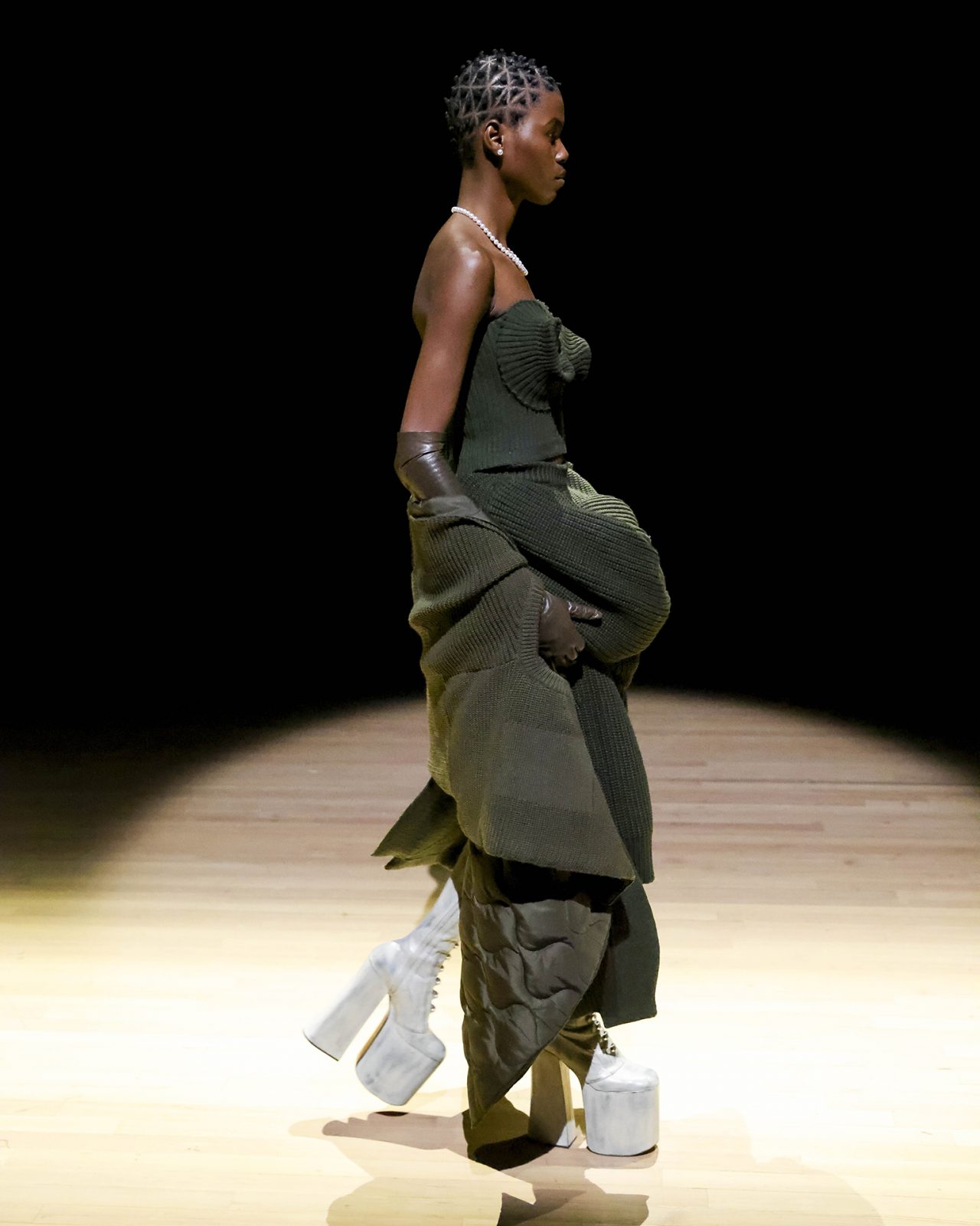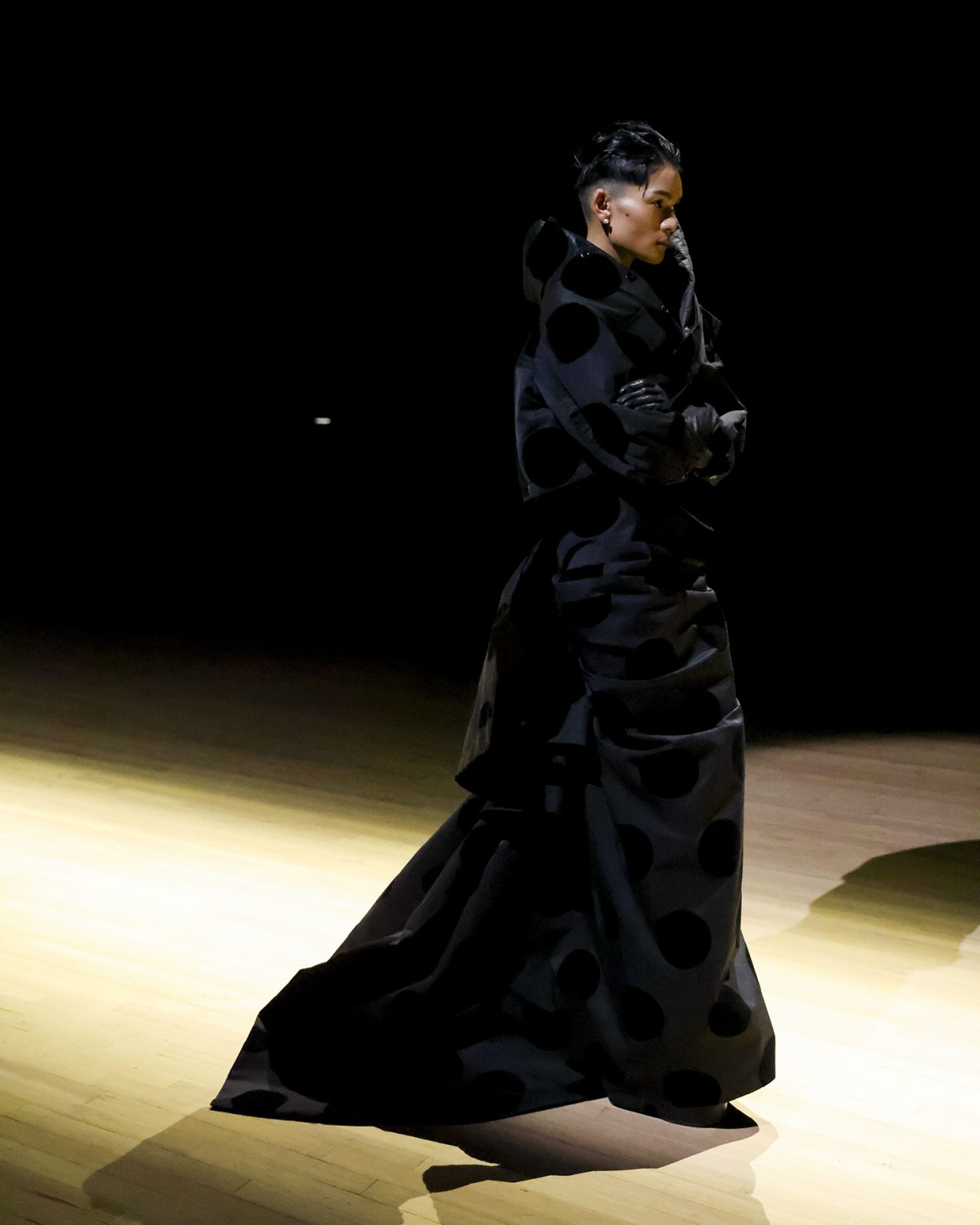 Vivienne Westwood の1985年春夏コレクション「Mini Crini」で用いられたドット柄は、本コレクションの後半に登場。ロングトレーンが印象的なドレスは、ボリューミーなダウン素材で MARC JACOBS らしい不協和的なアイテムに仕上げられた。足元を飾ったのは、細身の厚底ブーツ。1993年に発表された、Vivienne Westwood の伝説的シューズ 「Super Elevated Gillie (スーパー・エレベイテッド・ギリー)」を彷彿とさせるようなドラマティックなブーツが登場し、コーディネートをよりパンクに仕上げた。