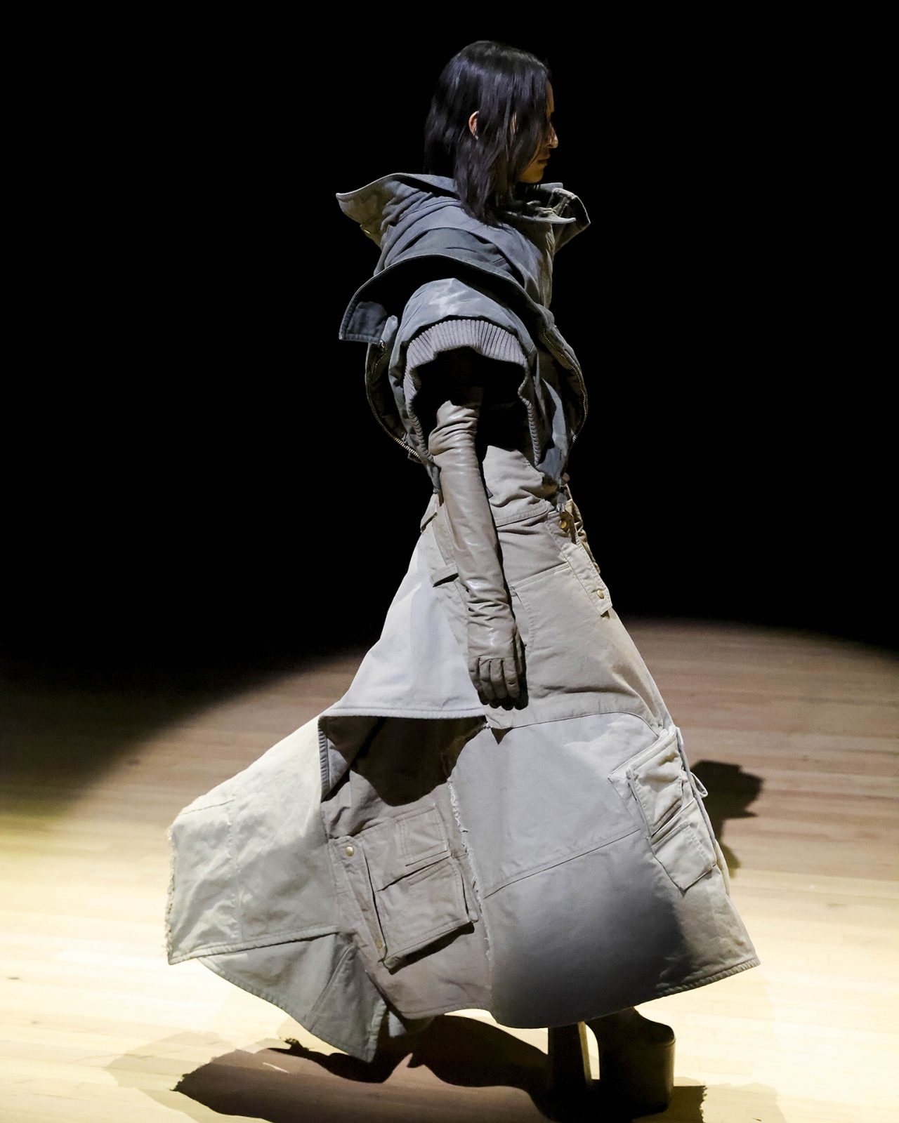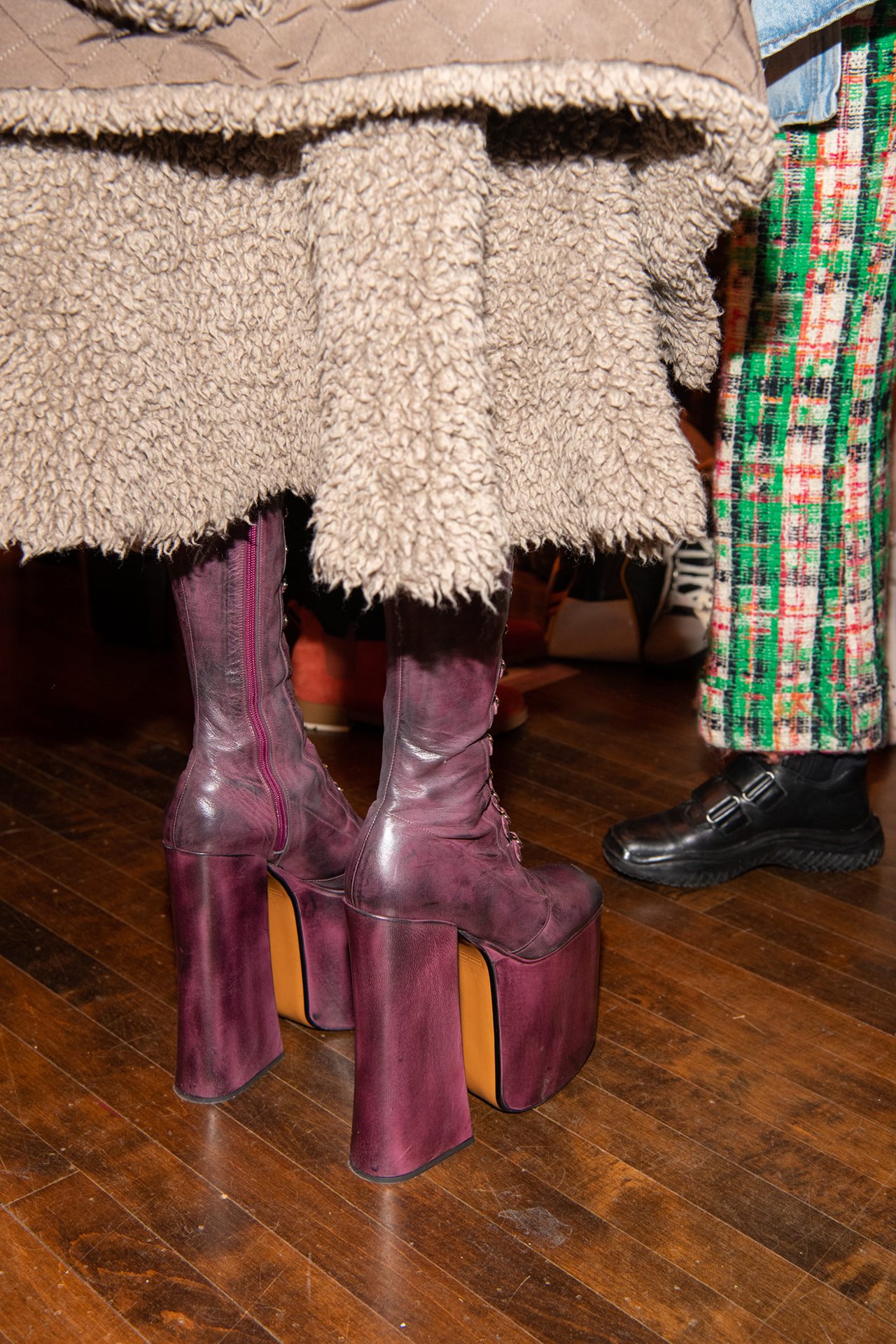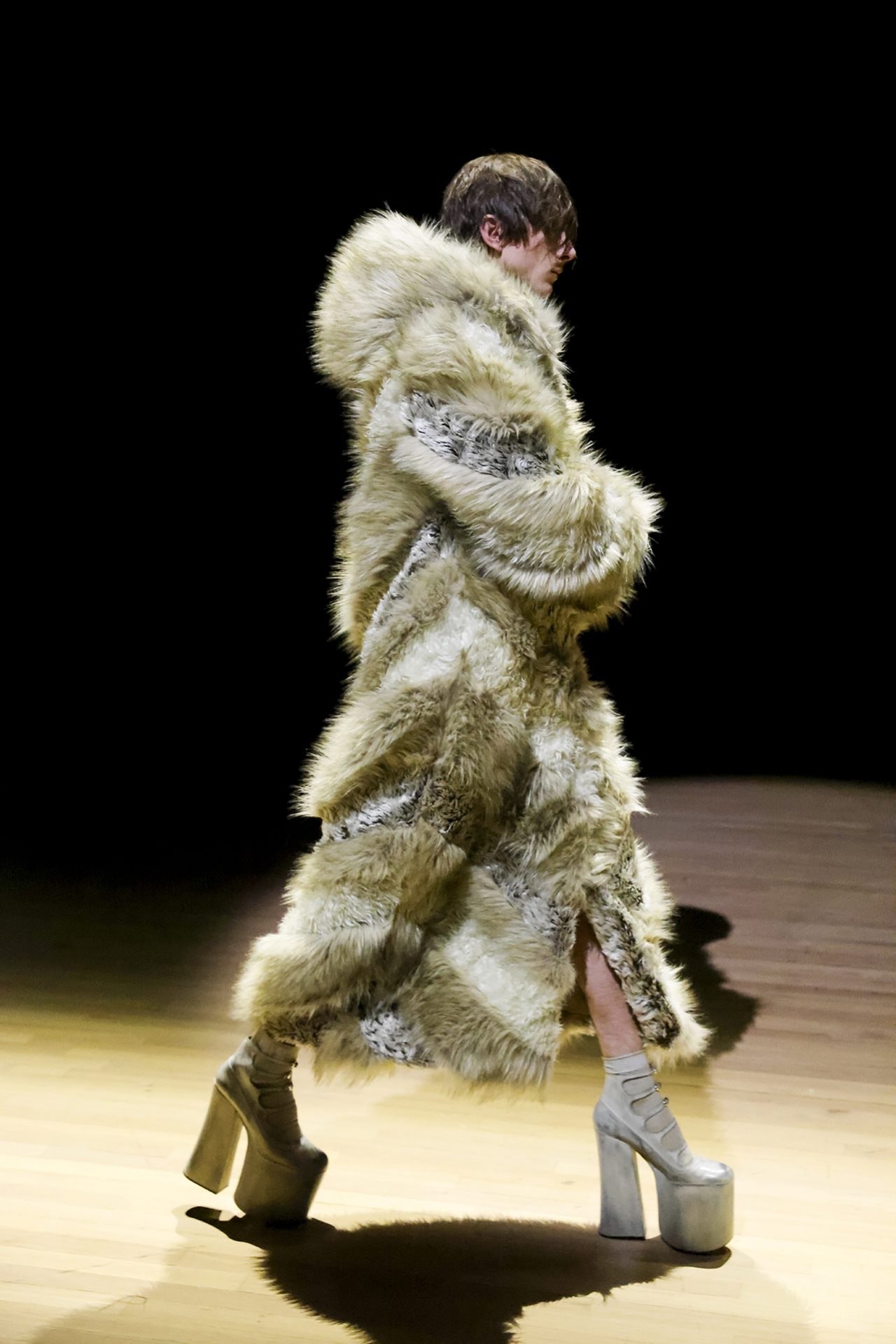 Vivienne Westwood の1985年春夏コレクション「Mini Crini」で用いられたドット柄は、本コレクションの後半に登場。ロングトレーンが印象的なドレスは、ボリューミーなダウン素材で MARC JACOBS らしい不協和的なアイテムに仕上げられた。足元を飾ったのは、細身の厚底ブーツ。1993年に発表された、Vivienne Westwood の伝説的シューズ 「Super Elevated Gillie (スーパー・エレベイテッド・ギリー)」を彷彿とさせるようなドラマティックなブーツが登場し、コーディネートをよりパンクに仕上げた。
