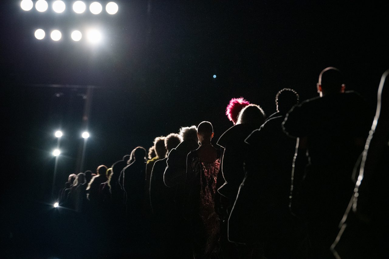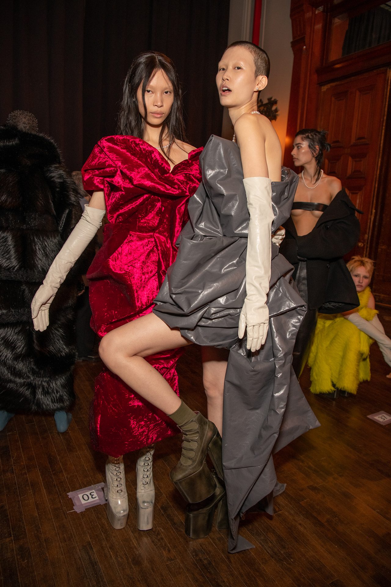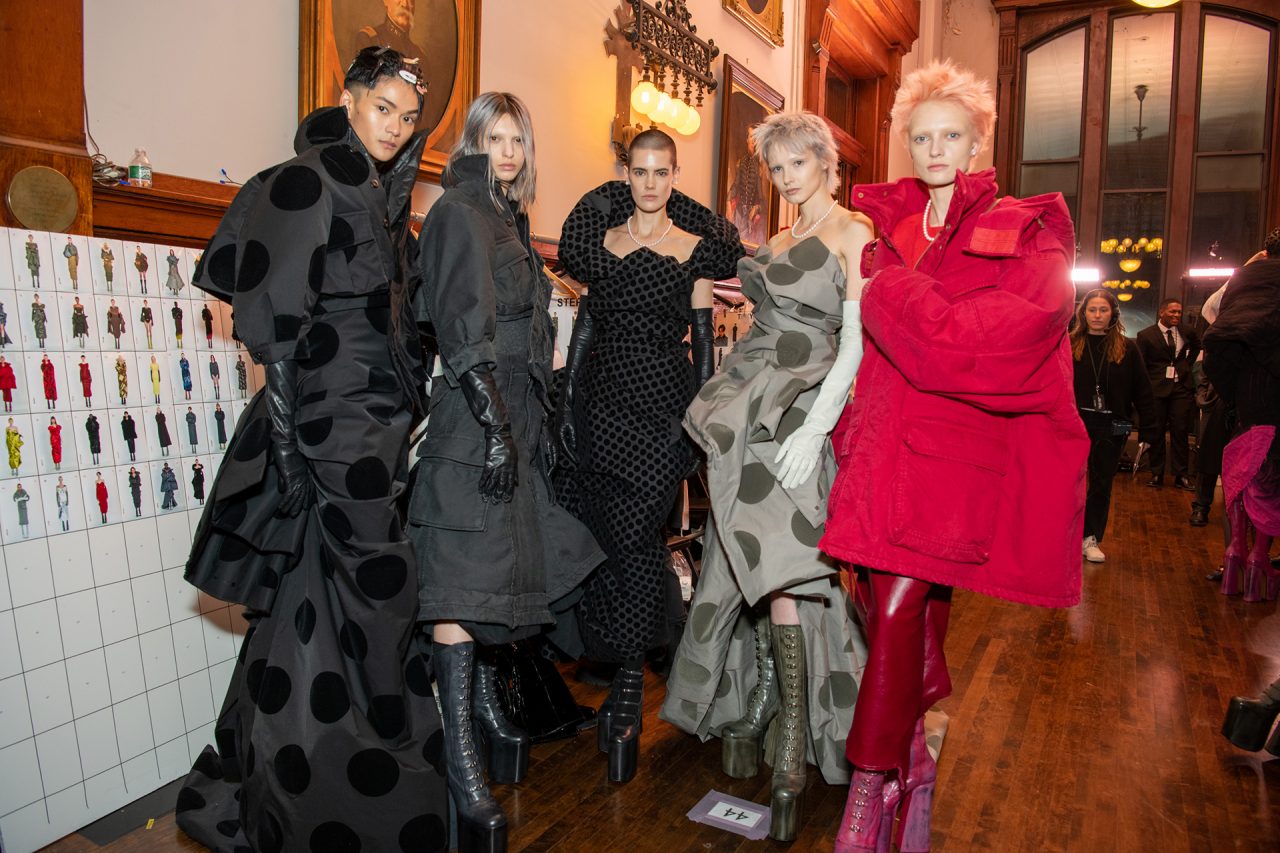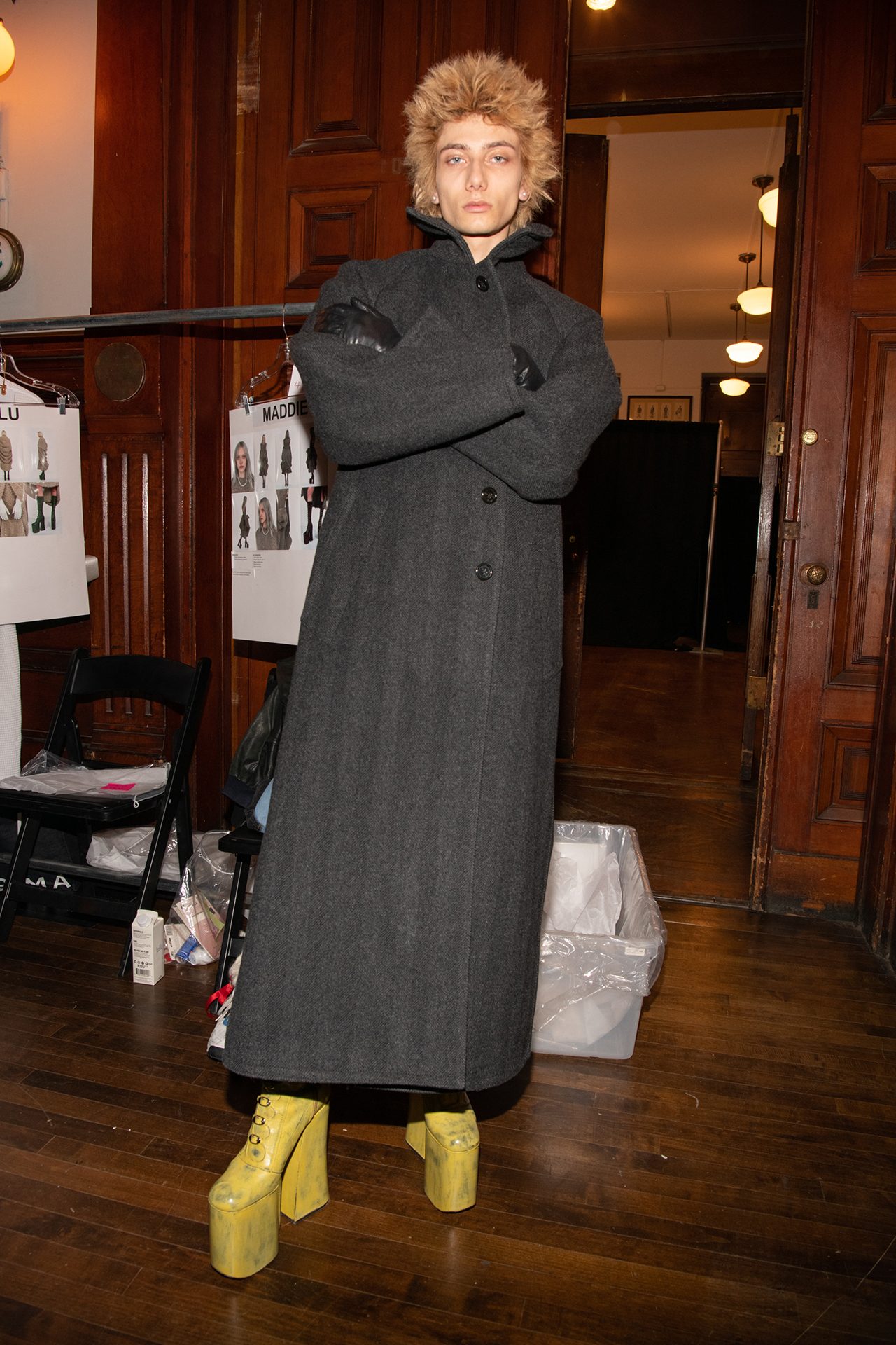 Vivienne Westwood の1985年春夏コレクション「Mini Crini」で用いられたドット柄は、本コレクションの後半に登場。ロングトレーンが印象的なドレスは、ボリューミーなダウン素材で MARC JACOBS らしい不協和的なアイテムに仕上げられた。足元を飾ったのは、細身の厚底ブーツ。1993年に発表された、Vivienne Westwood の伝説的シューズ 「Super Elevated Gillie (スーパー・エレベイテッド・ギリー)」を彷彿とさせるようなドラマティックなブーツが登場し、コーディネートをよりパンクに仕上げた。