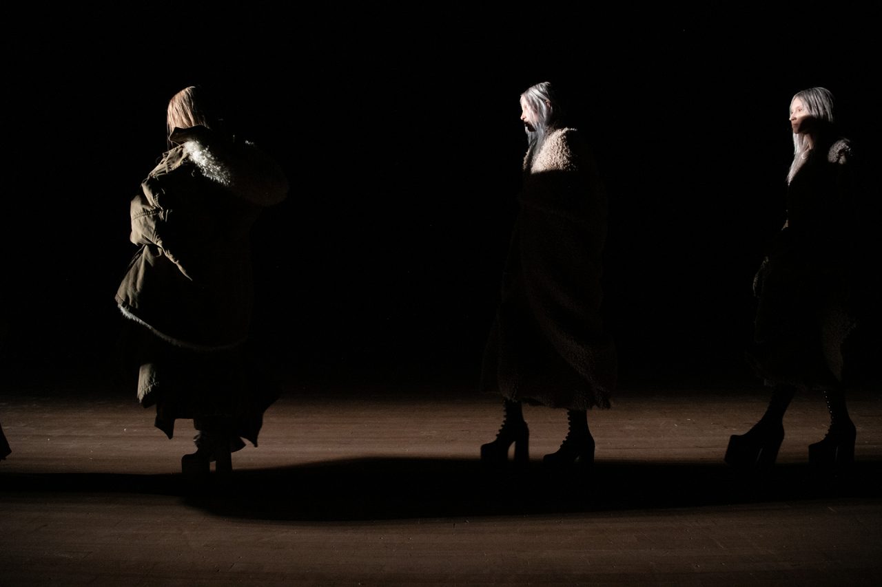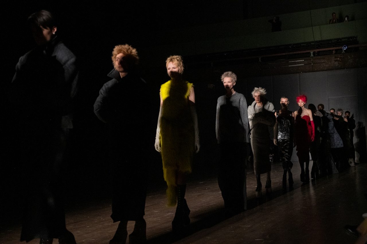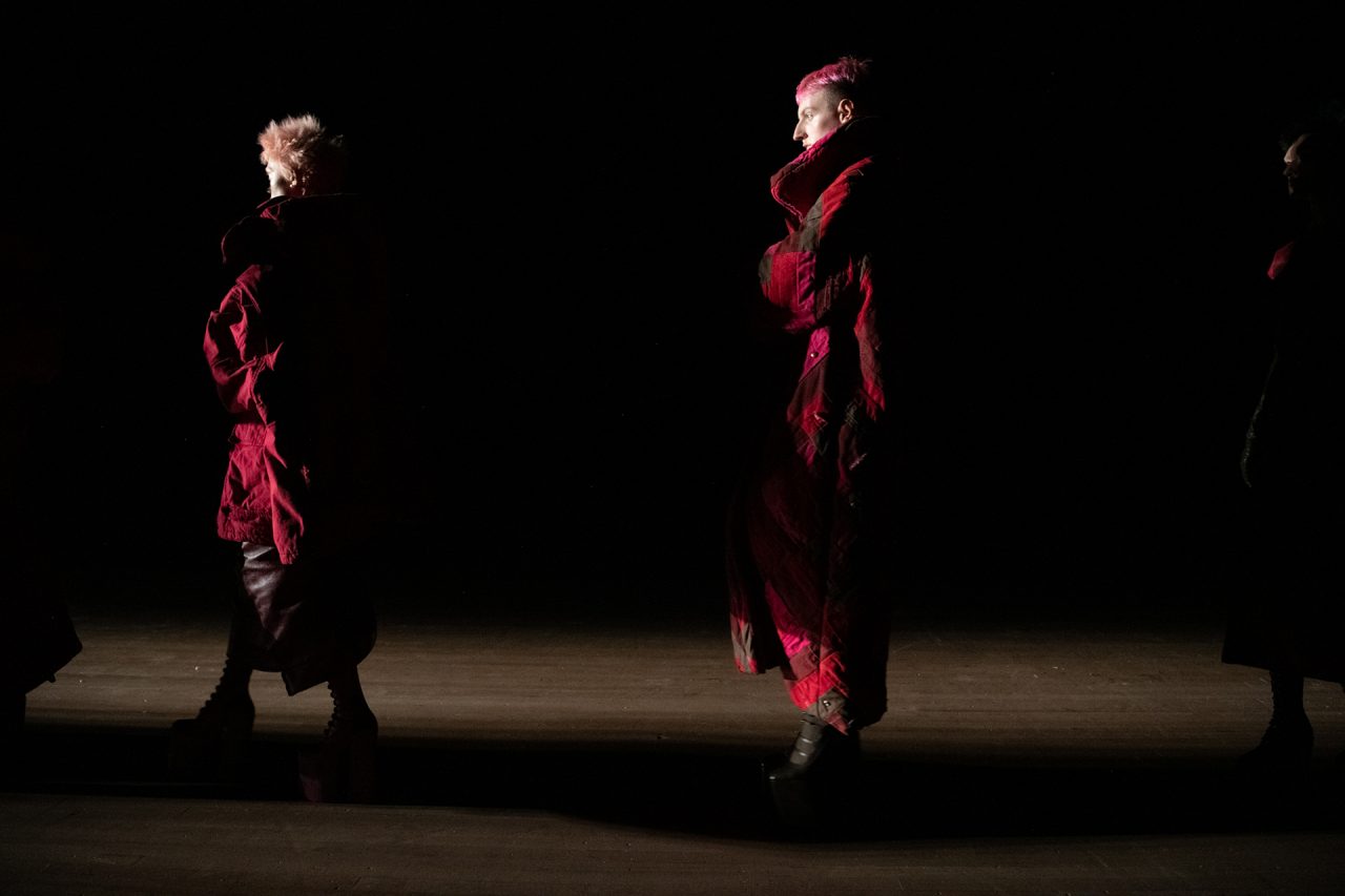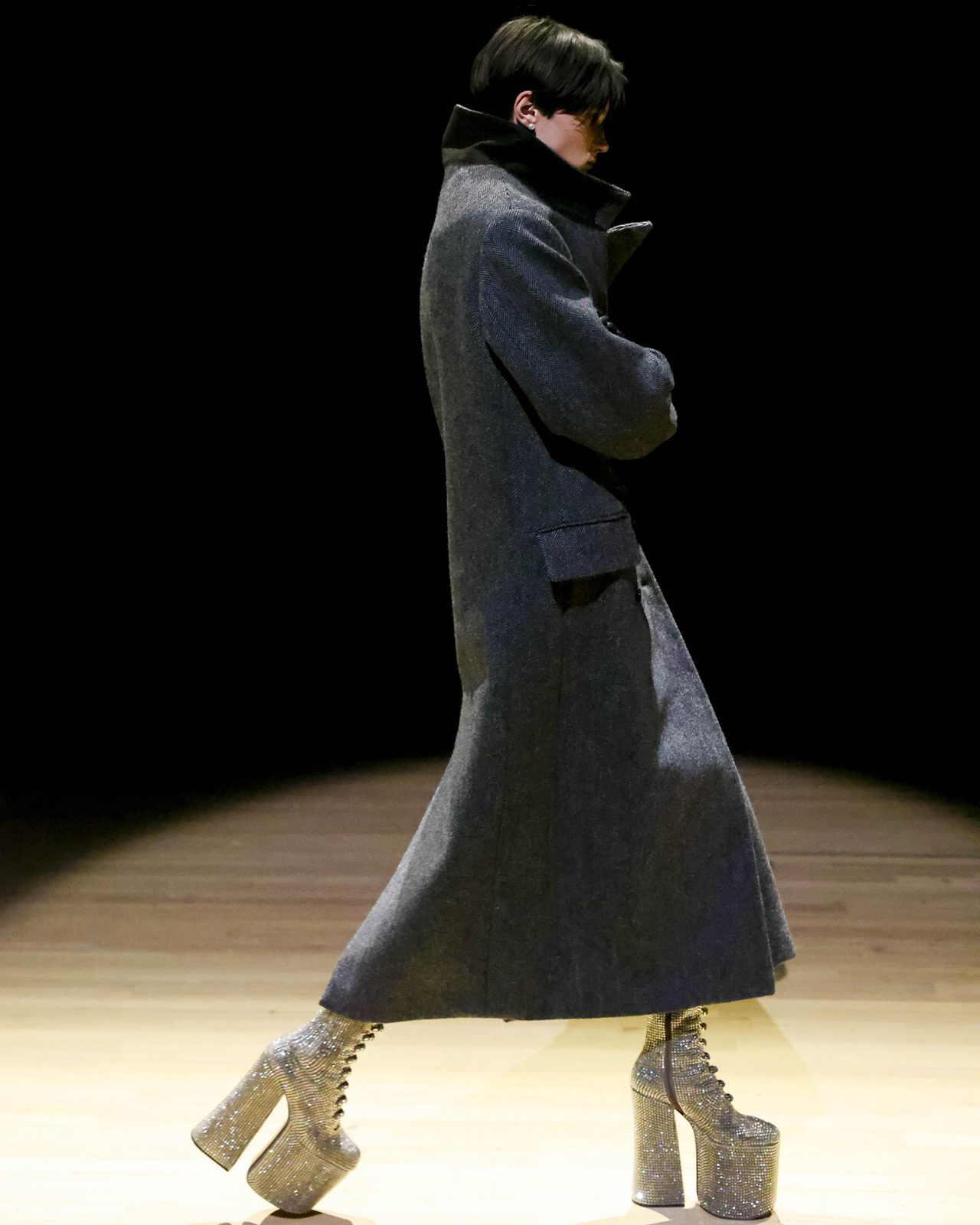 テーラードのコートは、モノトーンでシンプルながらもバックの大胆なスリットや、メタリック、ネオンカラーのブーツを合わせることで、上品になりすぎないコーディネートが完成した。また、グレートーンのニットにブラックのロングスカートというベーシックなアイテムを合わせたルックは、90年代イギリスのミニマリズムファッションを想像させ、時代によって移り変わってきたストリートスタイルを表しているかのようだ。