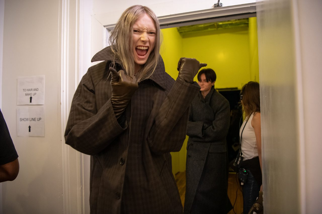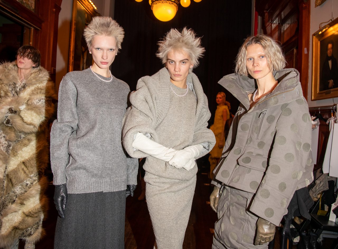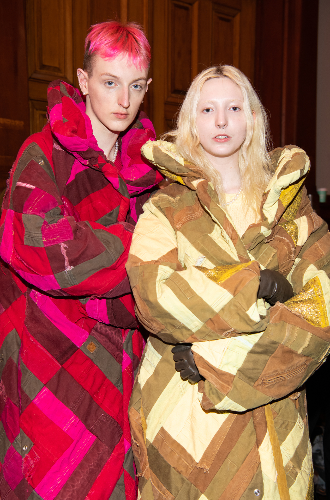 テーラードのコートは、モノトーンでシンプルながらもバックの大胆なスリットや、メタリック、ネオンカラーのブーツを合わせることで、上品になりすぎないコーディネートが完成した。また、グレートーンのニットにブラックのロングスカートというベーシックなアイテムを合わせたルックは、90年代イギリスのミニマリズムファッションを想像させ、時代によって移り変わってきたストリートスタイルを表しているかのようだ。