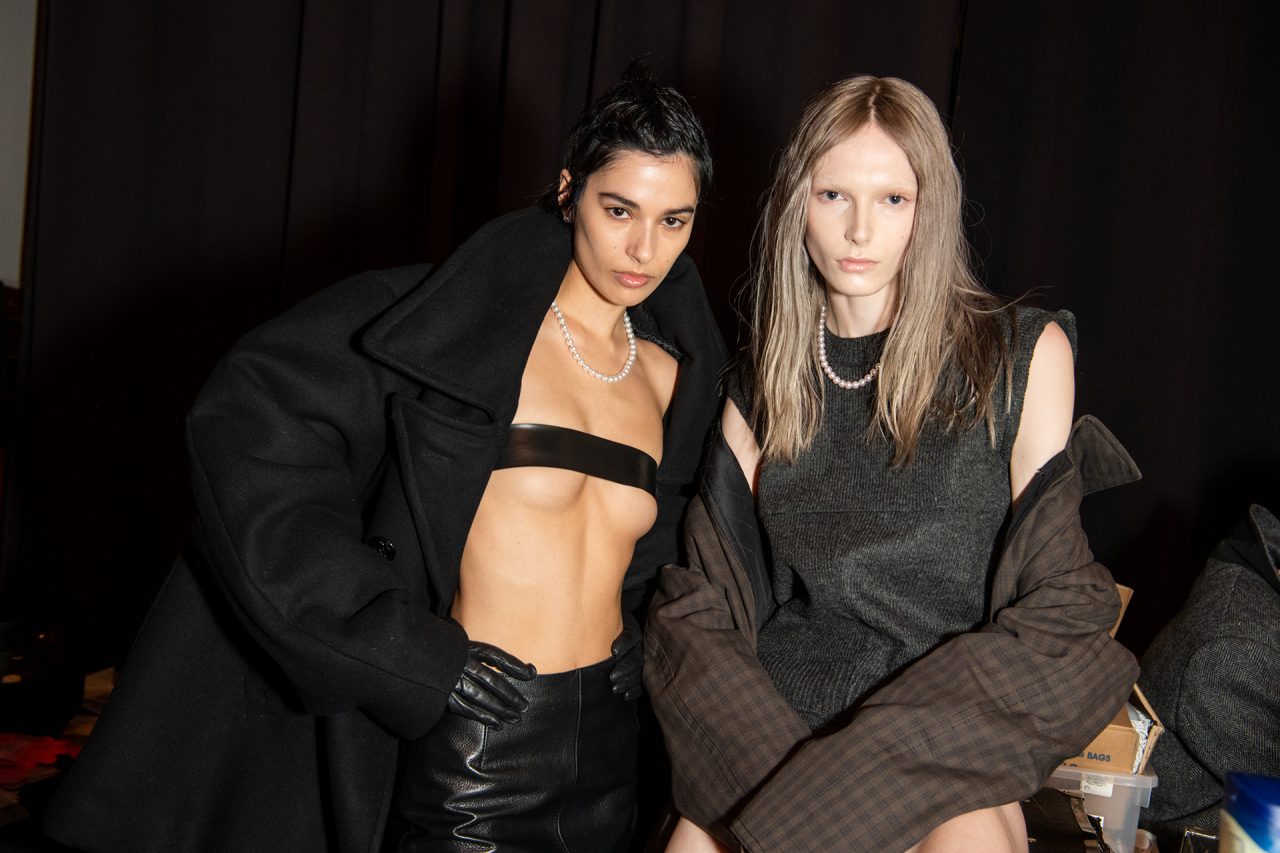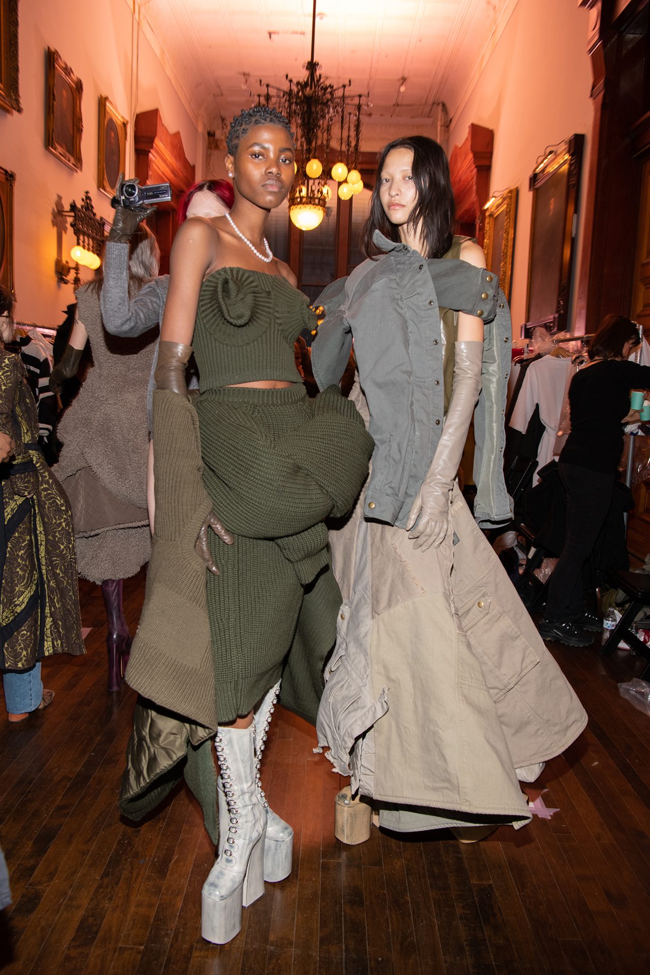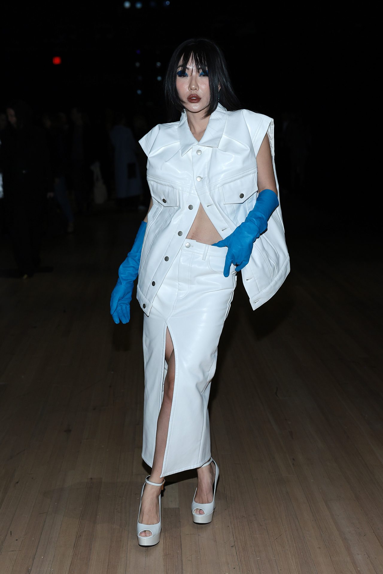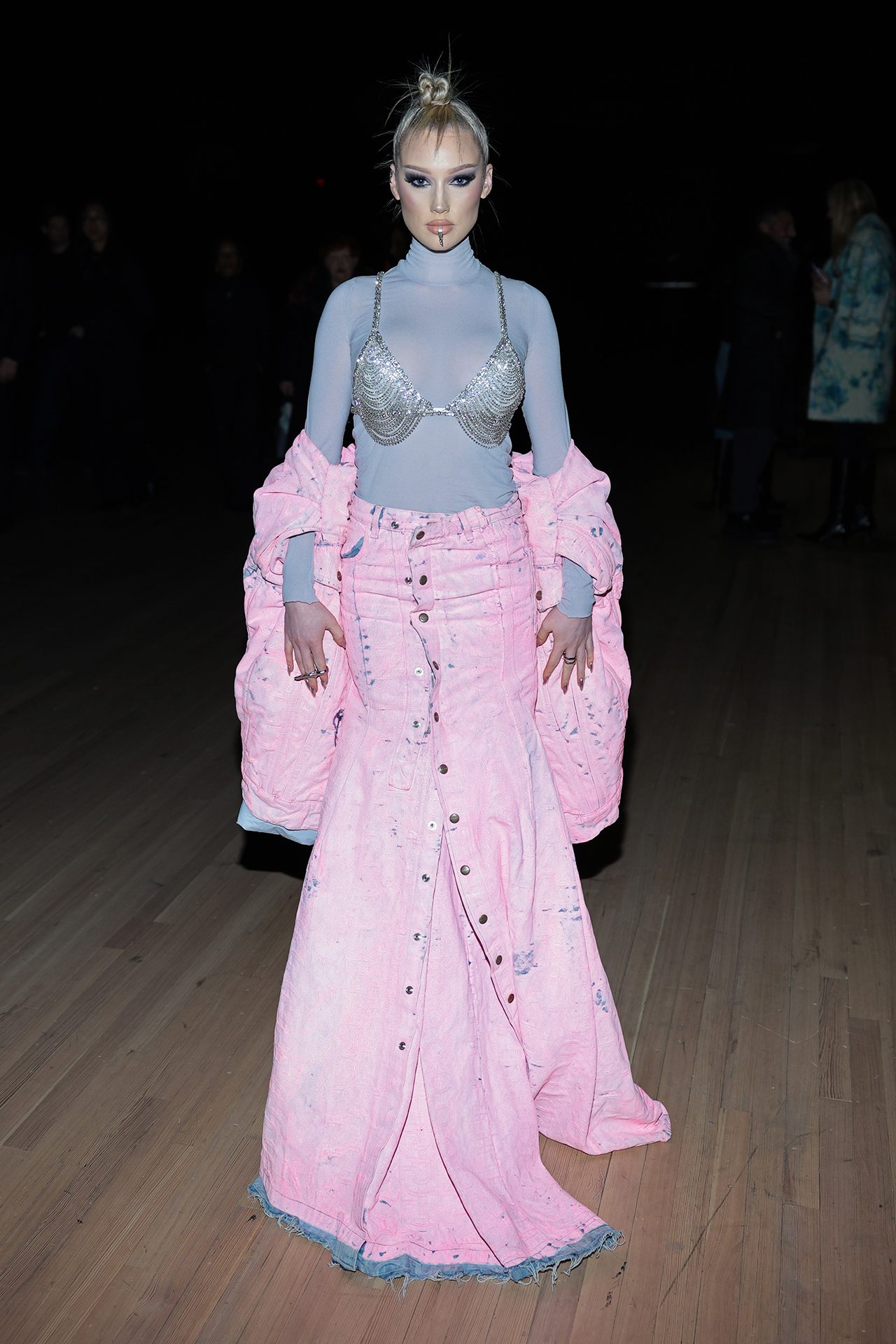 コレクションには、複雑なレイヤードやつぎはぎしたようなアイテムが登場。体にフィットしたボディースーツからボリューミーなアウターやスカートまで幅広いシルエットを展開し、緩急をつけた。ファーストルックで登場したのは、全体にラインストーンがあしらわれたショート丈のジャケットとスカートのセットアップ。スカートは、同素材のジャケットをリメイクしたようなデザインで、袖部分をギュッと縛ったようなディテールが新しい。アクセサリーはレザーグローブとパールのイヤリング、ネックレスを合わせ、パンクの中にエレガンスの要素をプラスした。