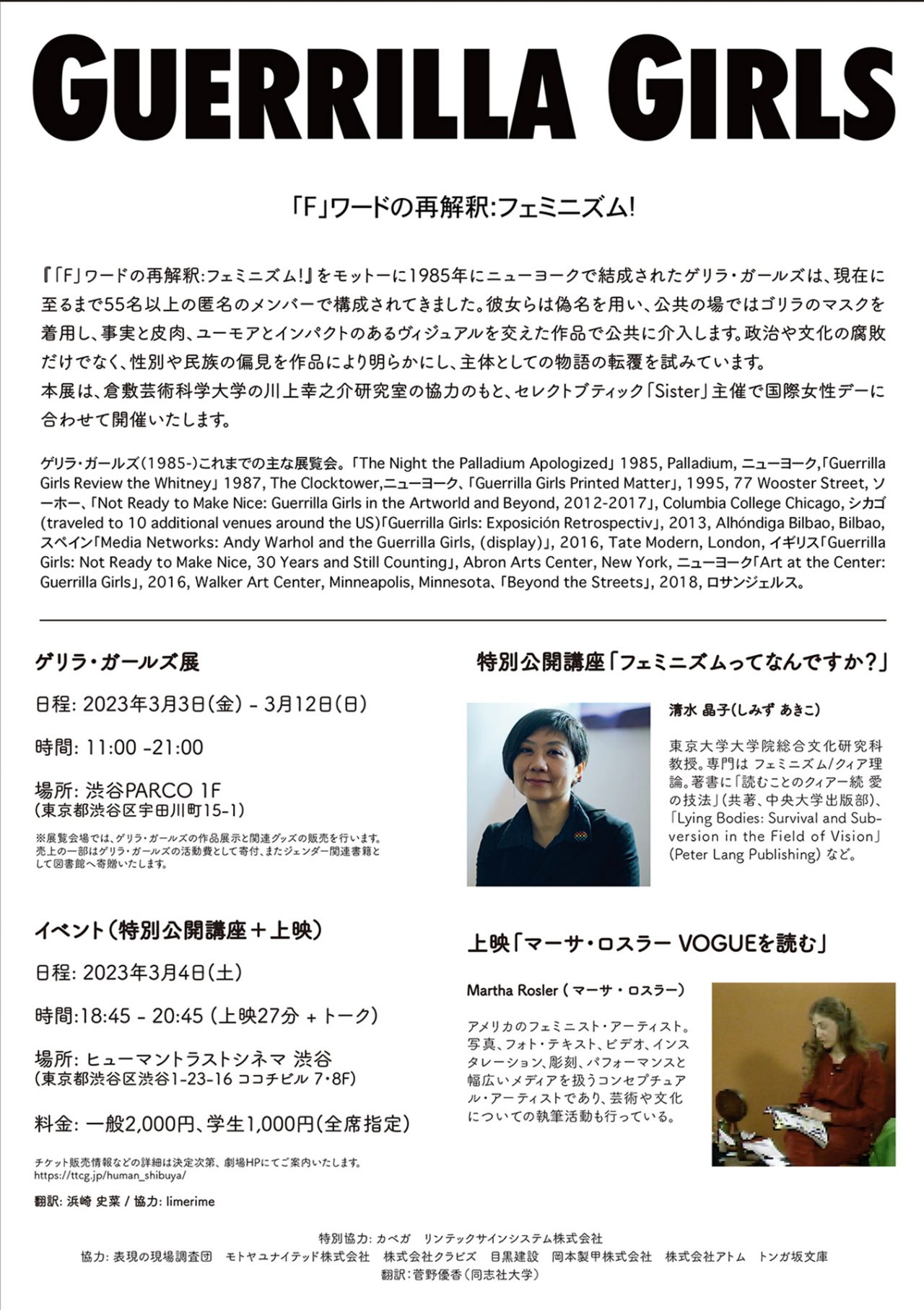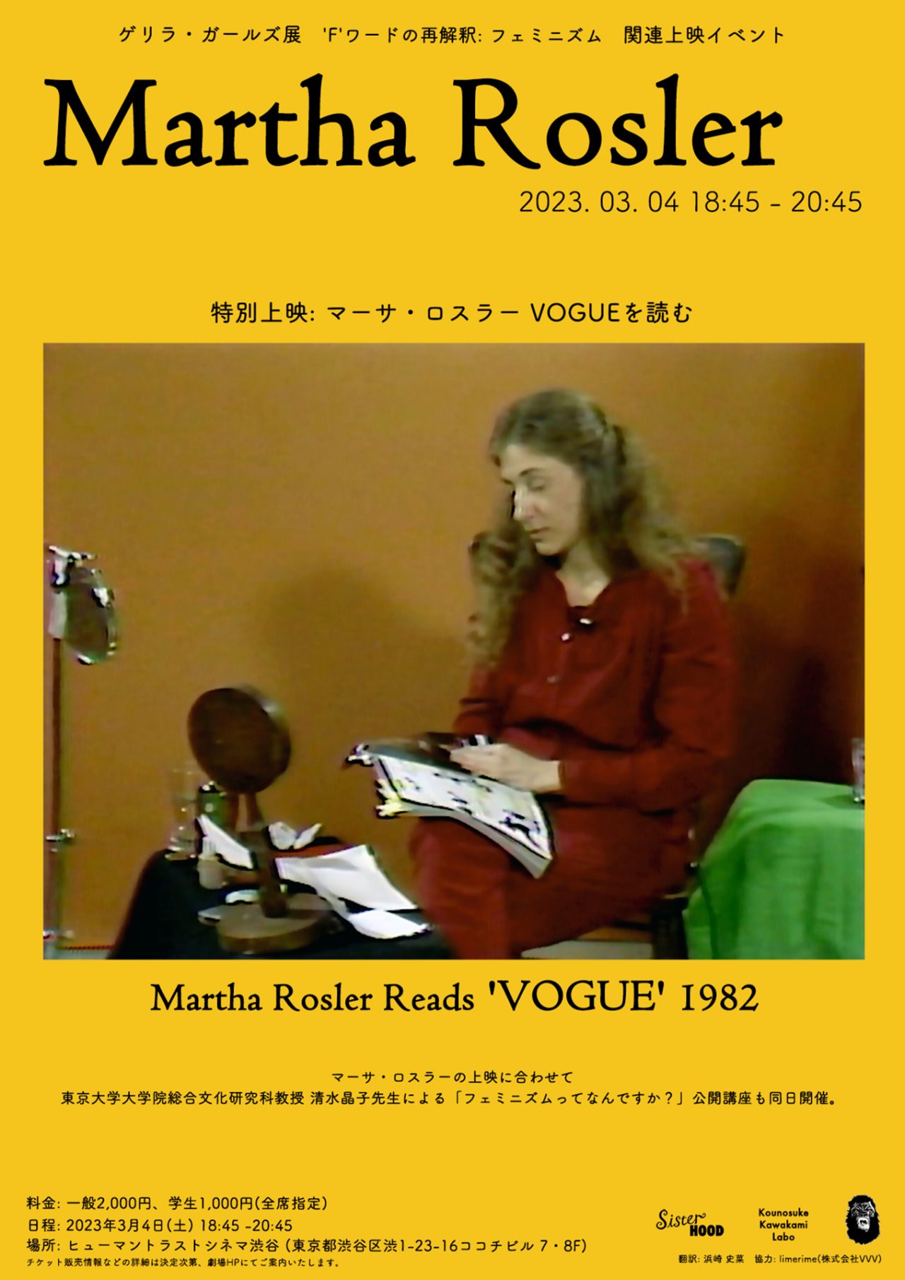 期間中の3月4日(土)には、ヒューマントラストシネマ 渋谷にて、VOGUE JAPAN オンラインの人気連載で知られる、東京大学大学院総合文化研究科の清水晶子教授による公開講座、そしてアメリカのフェミニスト・アーティスト Martha Rosler (マーサ・ロスラー) による作品『マーサ・ロスラー VOGUE を読む』の特別上映を行う。