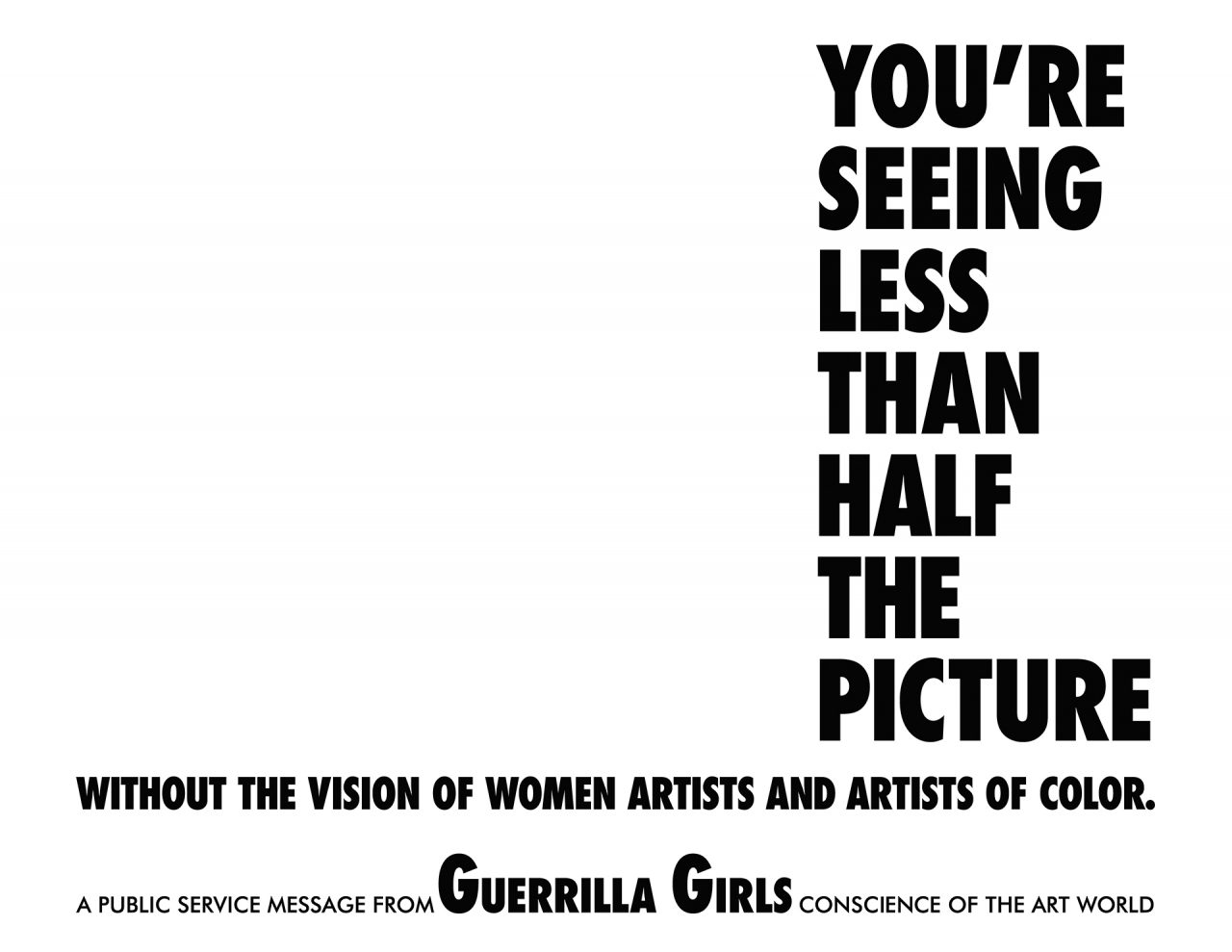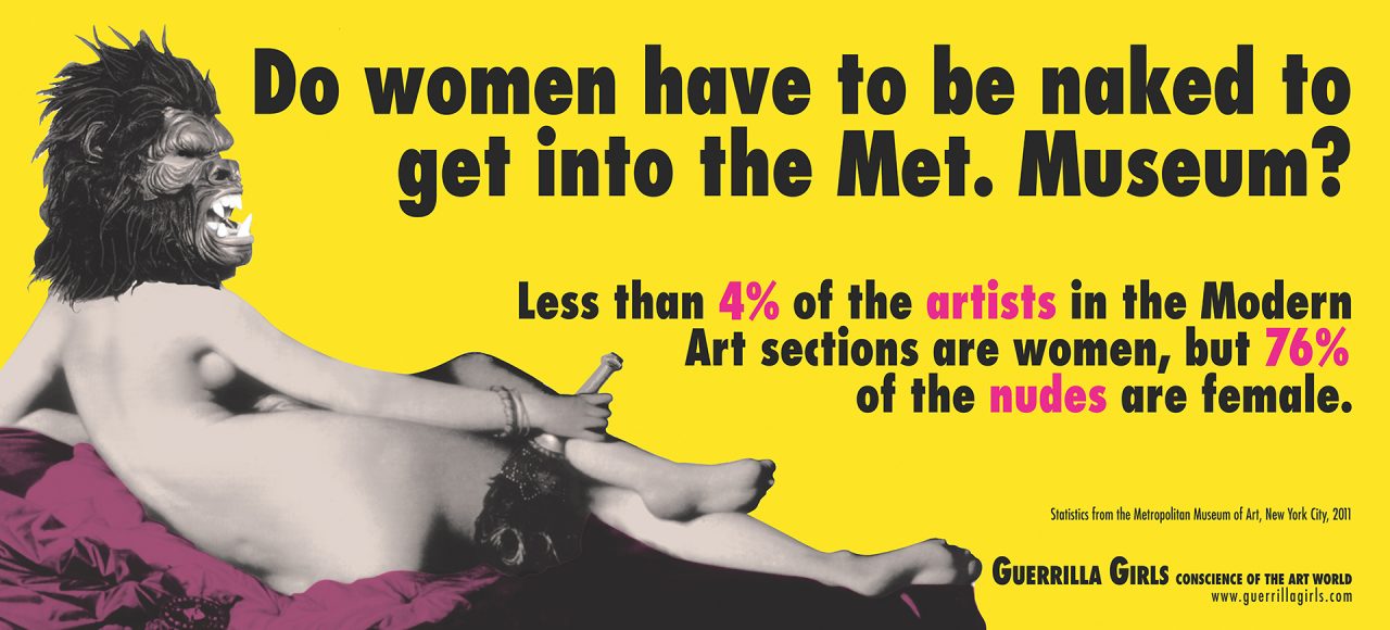 1985年にニューヨークで結成された Guerrilla Girls は、現在に至るまで55名以上の匿名のメンバーで構成され、「『F』ワードの再解釈 : フェミニズム !」をモットーに活動してきた。彼女たちは偽名を使い、ゴリラのマスクを着用し、事実と皮肉、ユーモアとインパクトのあるヴィジュアルを交えた作品で公共に介入し、政治や文化の腐敗や性差別、人種差別を暴き出すことで、アート界に立ちはだかる壁を打ち壊そうとしている。