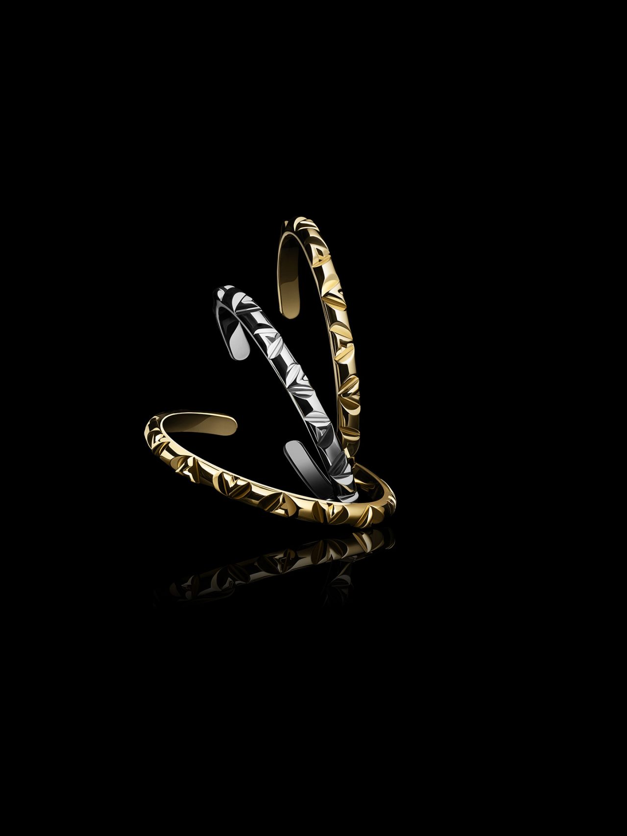 2022年にローンチした「LV ヴォルト アップ サイド ダウン プレイ ブレスレット」も、今年はブレスレットのコードを新たに解釈した新作が登場。2サイズで展開し、コードの付け替えが可能なブレスレットは輝くイエローゴールドスレッドに、レッドまたはブラックのナイロンファイバーを組み合わせたブレイド(編み込み)が特徴。