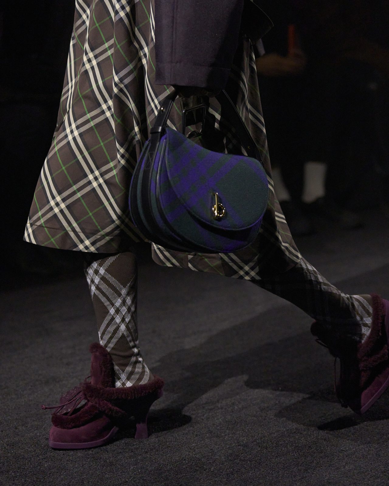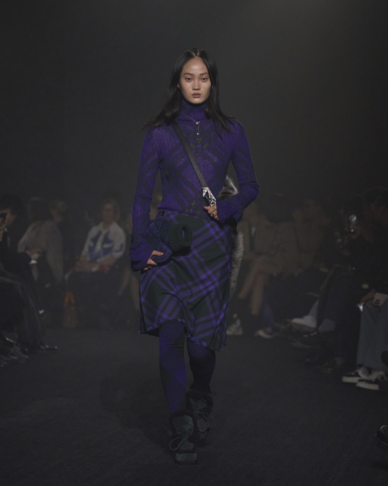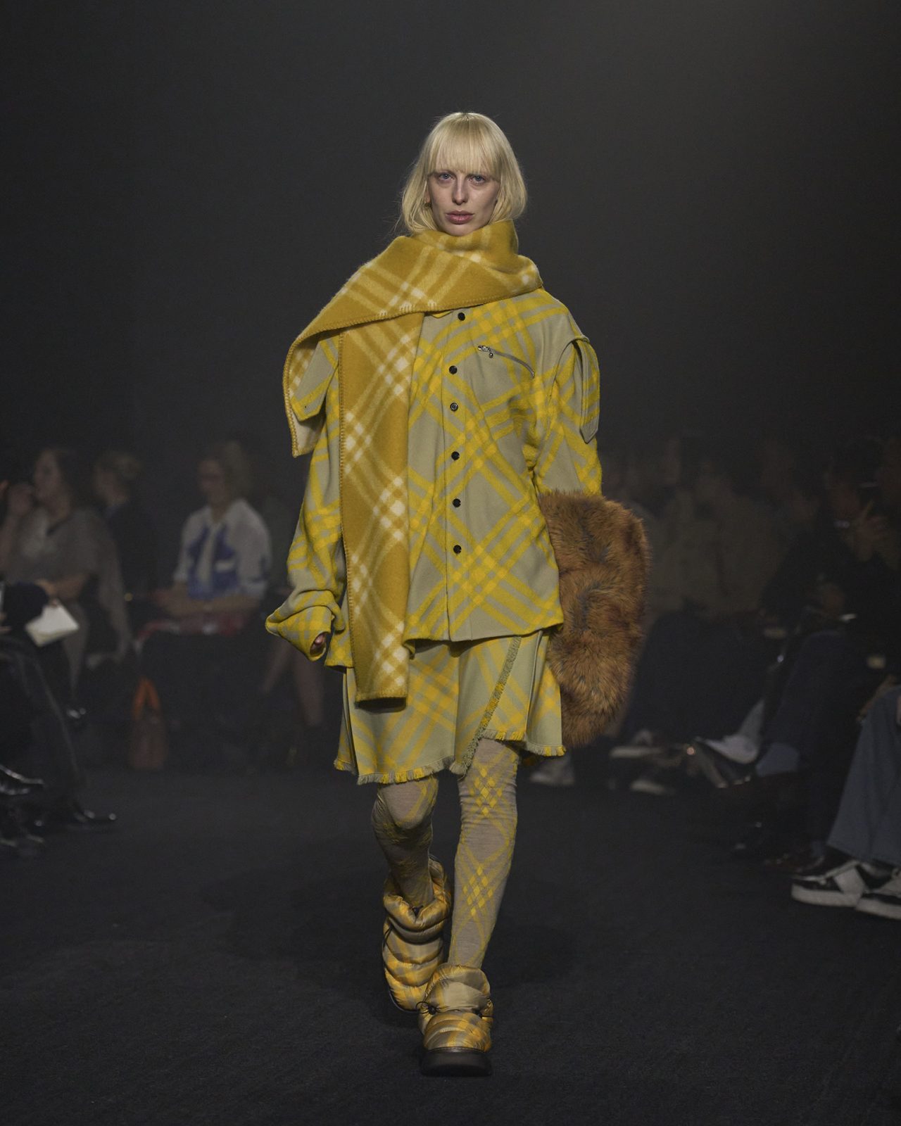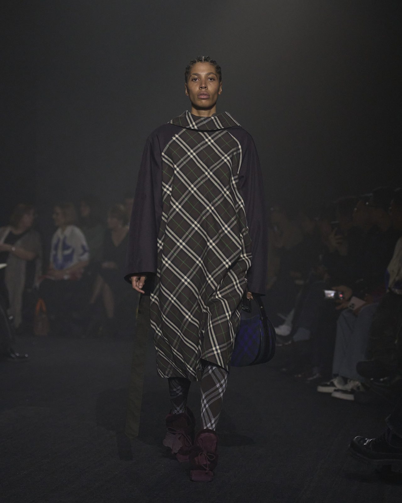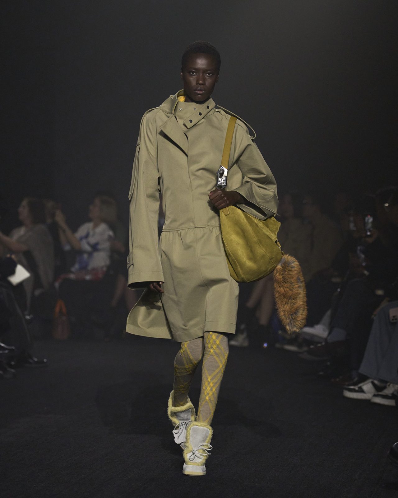 ファーストルックに登場したのは、ブランドのアイコンであるトレンチコート。ダークブラウンのカラーにグリーンのフェイクファーで縁取られたラペルが印象的だ。手元には、紫のバーバリーチェックの湯たんぽを携え、大きなファーチャームが付いたバッグを合わせてコーディネートされている。デコンストラクトされたカーコートやダッフル、アビエーターは、よりソフトなシルエットを強調。また、大胆なカラーのチェックをテーラリング、ブランケットコート、ニットなどにフィーチャーさせると共に、ベルトやエポレットなどの装飾、シルエットに工夫を見せ、クラシックスタイルをアップデートさせた。