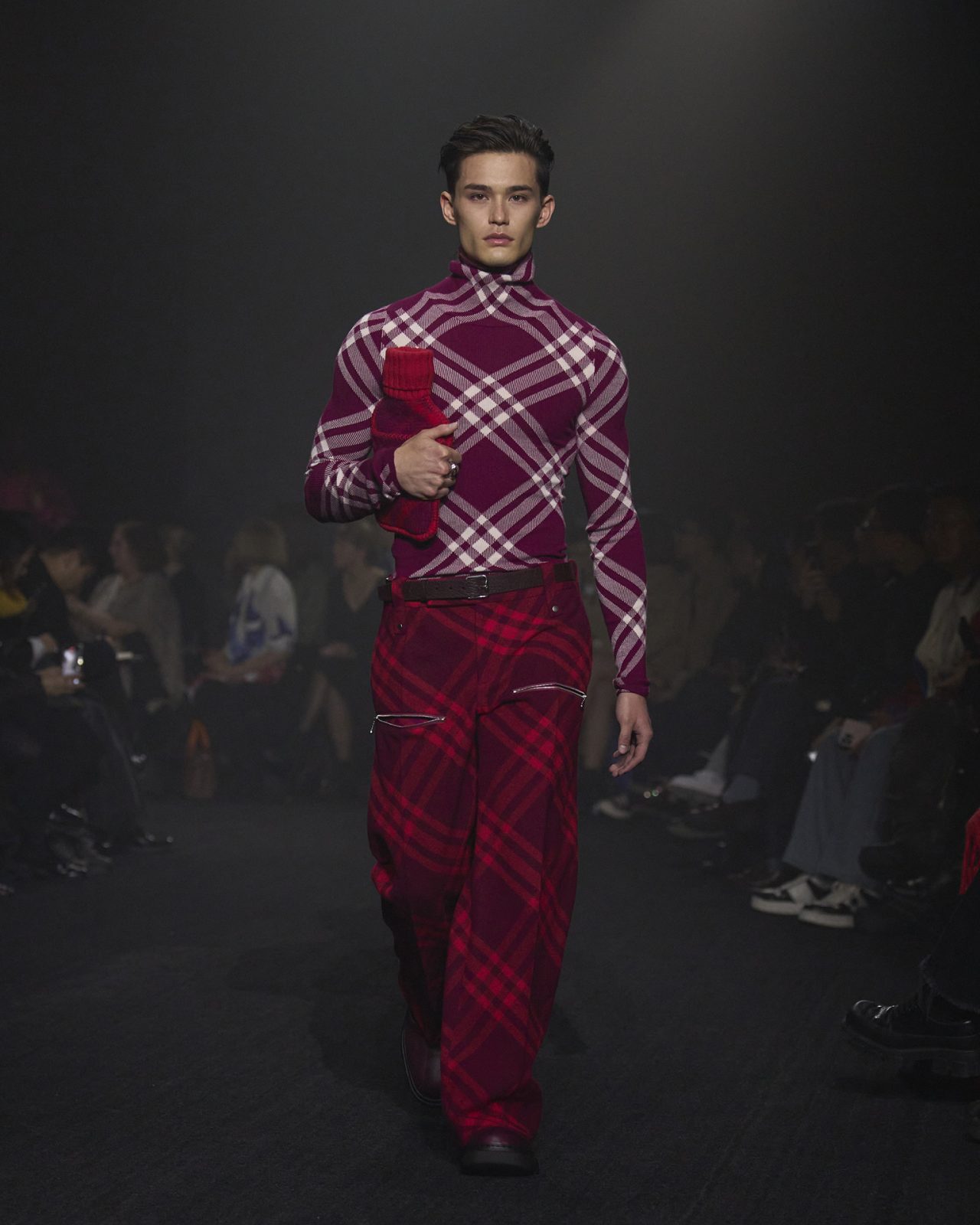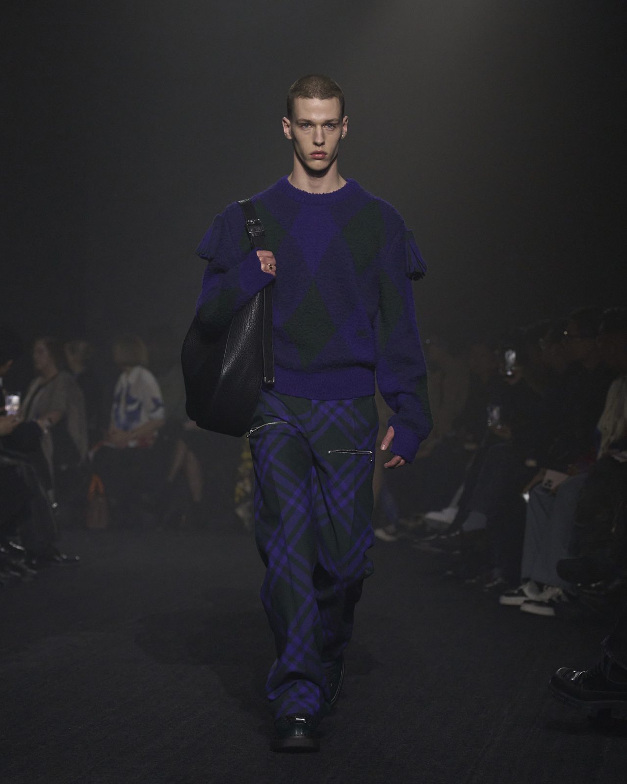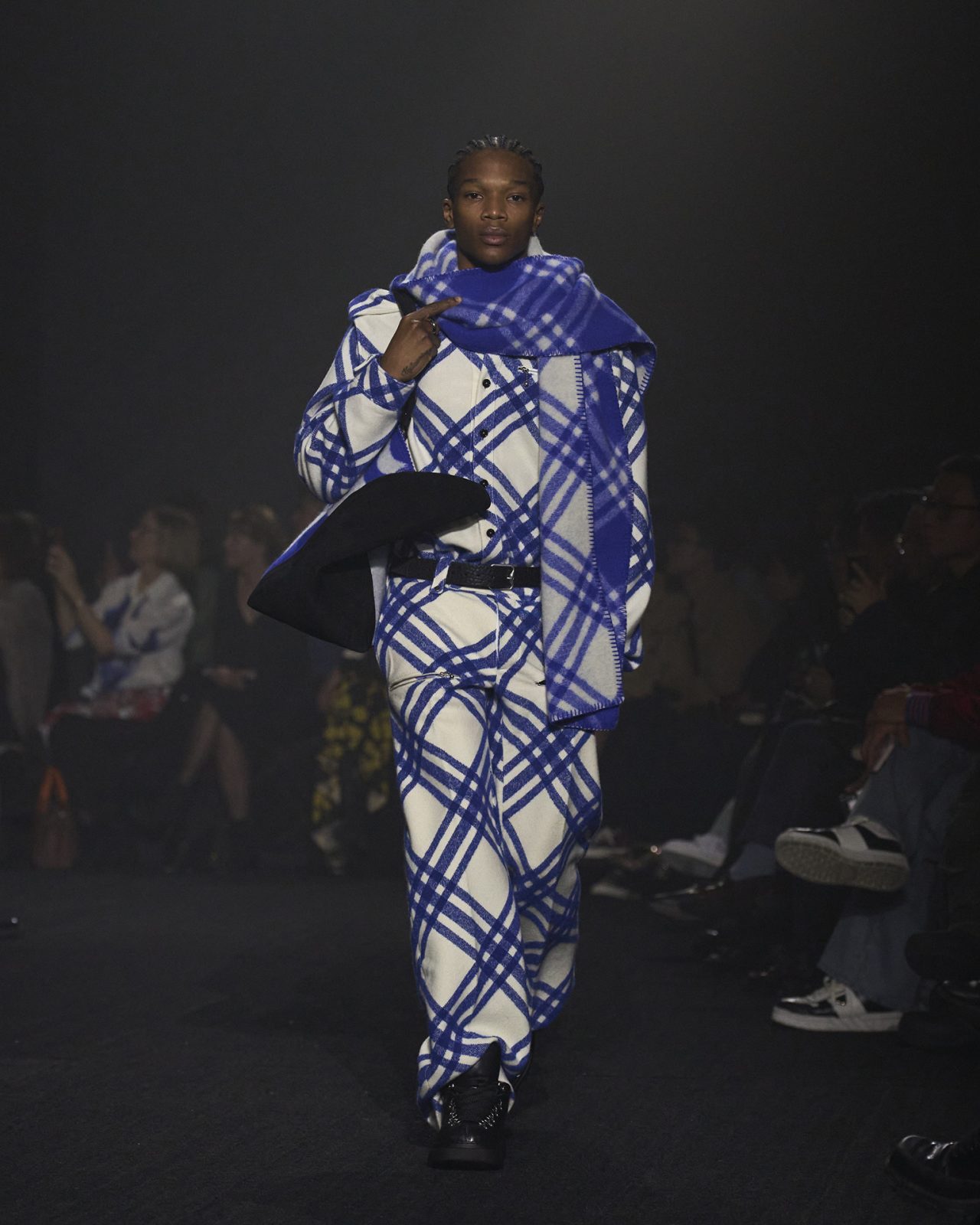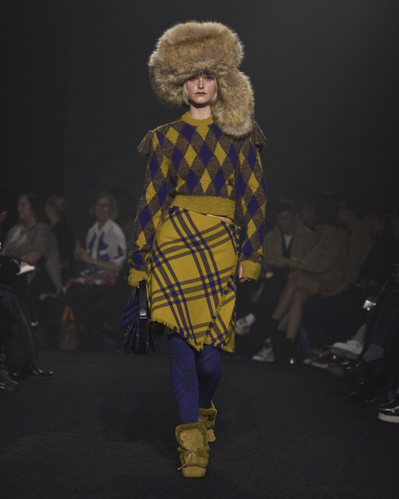 ファーストルックに登場したのは、ブランドのアイコンであるトレンチコート。ダークブラウンのカラーにグリーンのフェイクファーで縁取られたラペルが印象的だ。手元には、紫のバーバリーチェックの湯たんぽを携え、大きなファーチャームが付いたバッグを合わせてコーディネートされている。デコンストラクトされたカーコートやダッフル、アビエーターは、よりソフトなシルエットを強調。また、大胆なカラーのチェックをテーラリング、ブランケットコート、ニットなどにフィーチャーさせると共に、ベルトやエポレットなどの装飾、シルエットに工夫を見せ、クラシックスタイルをアップデートさせた。