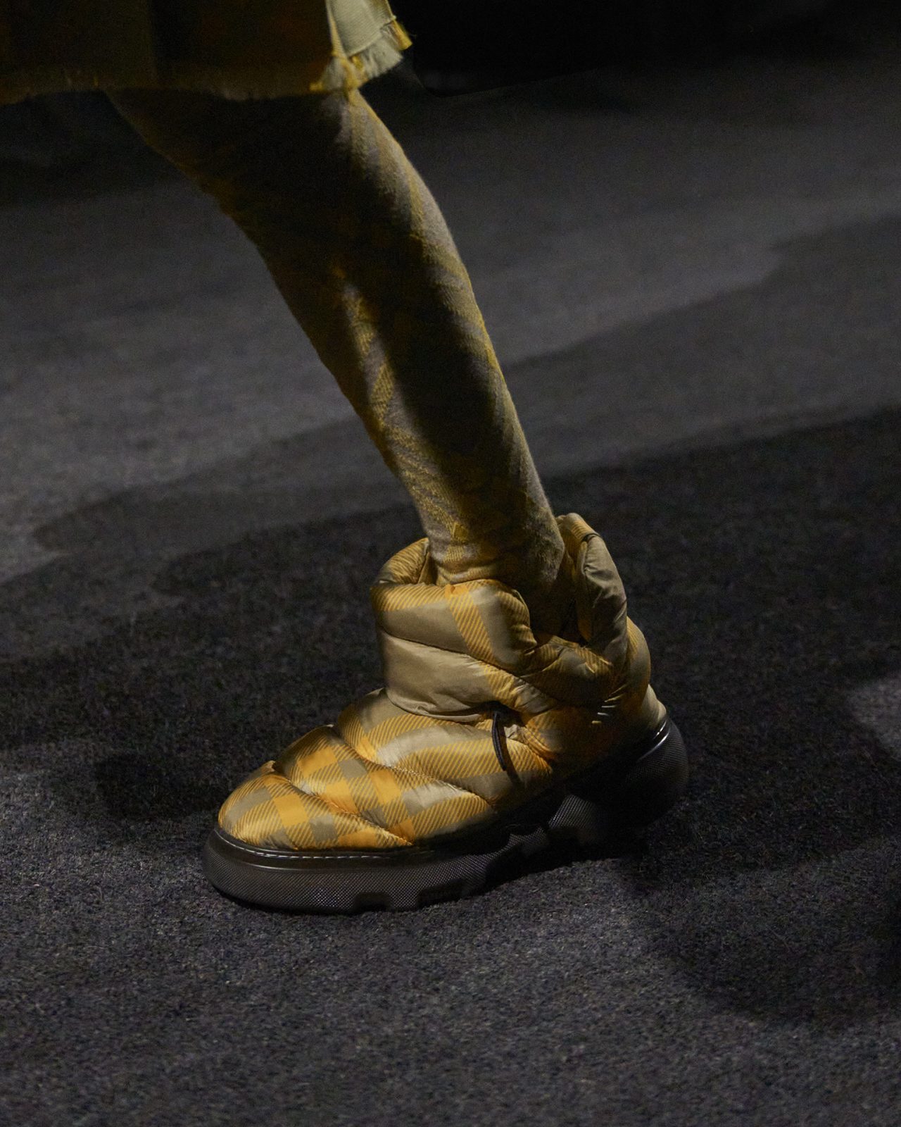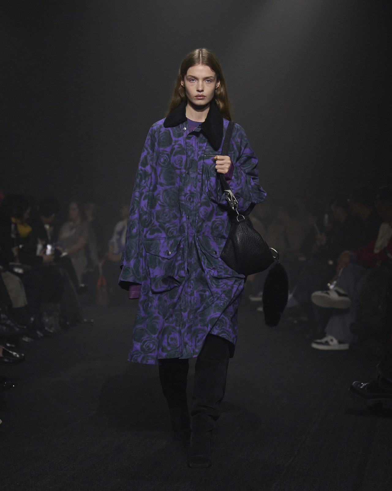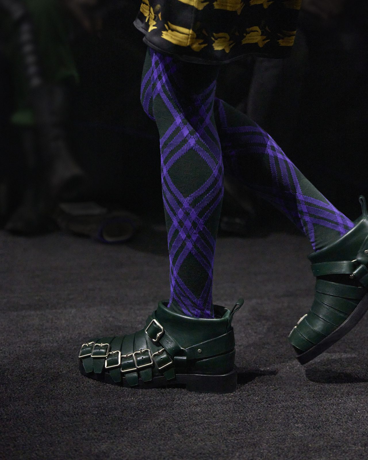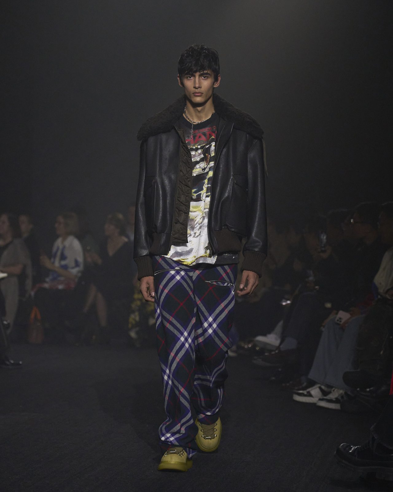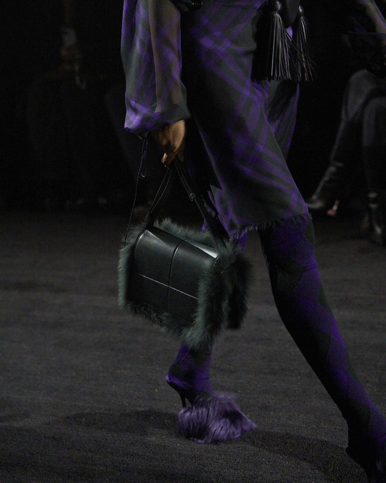 ファーストルックに登場したのは、ブランドのアイコンであるトレンチコート。ダークブラウンのカラーにグリーンのフェイクファーで縁取られたラペルが印象的だ。手元には、紫のバーバリーチェックの湯たんぽを携え、大きなファーチャームが付いたバッグを合わせてコーディネートされている。デコンストラクトされたカーコートやダッフル、アビエーターは、よりソフトなシルエットを強調。また、大胆なカラーのチェックをテーラリング、ブランケットコート、ニットなどにフィーチャーさせると共に、ベルトやエポレットなどの装飾、シルエットに工夫を見せ、クラシックスタイルをアップデートさせた。