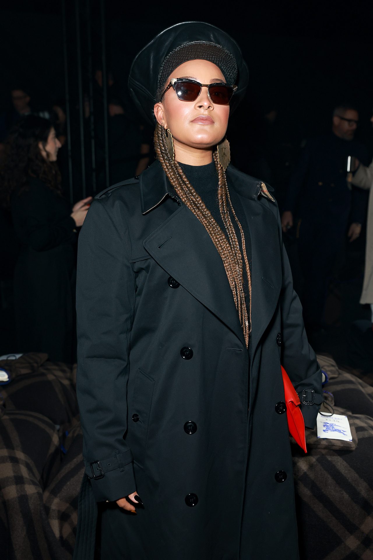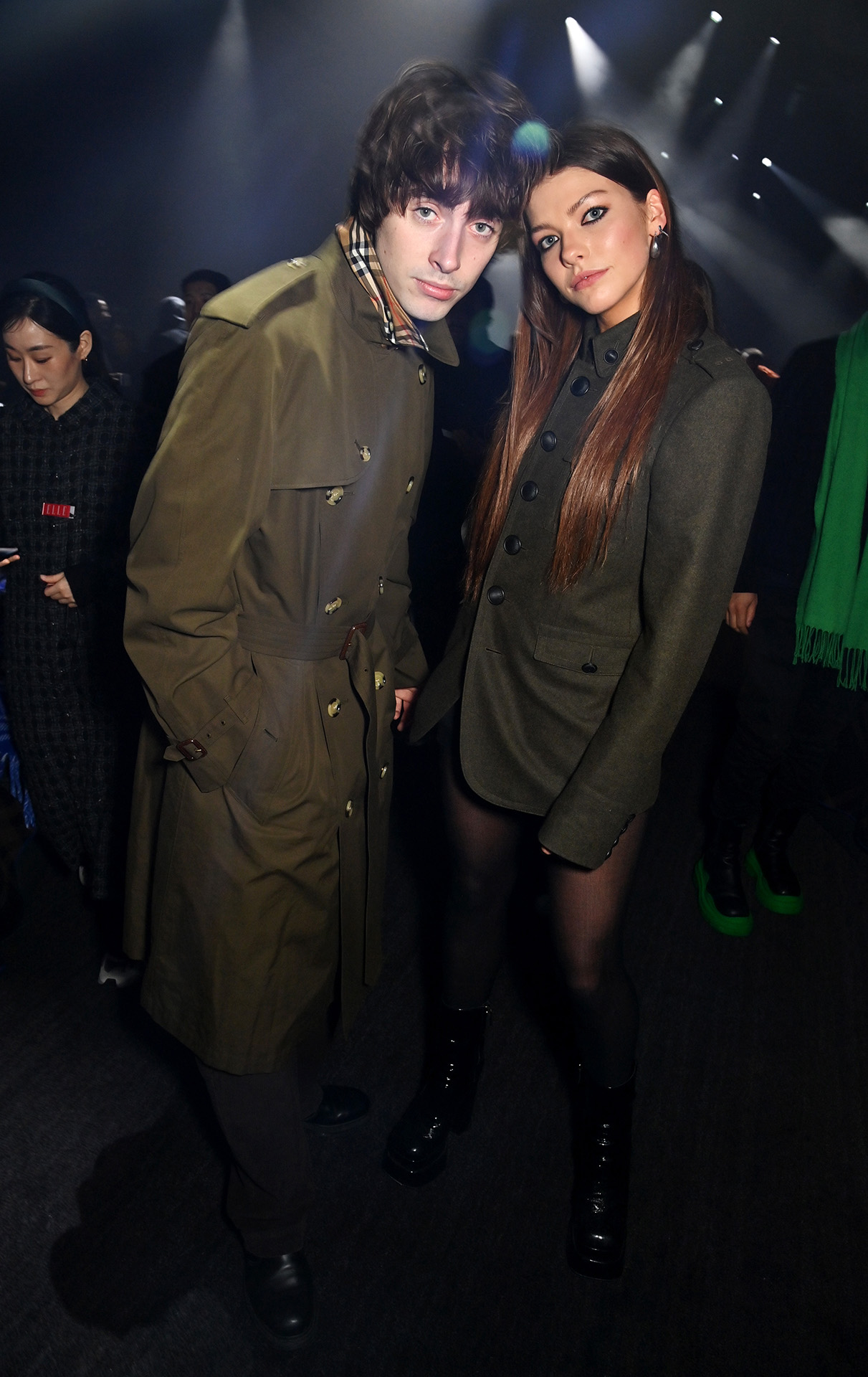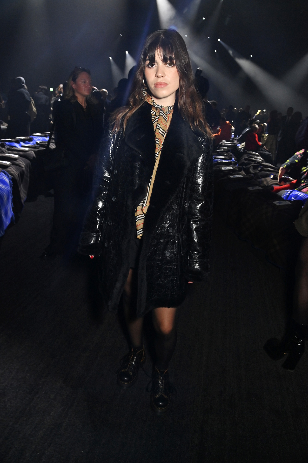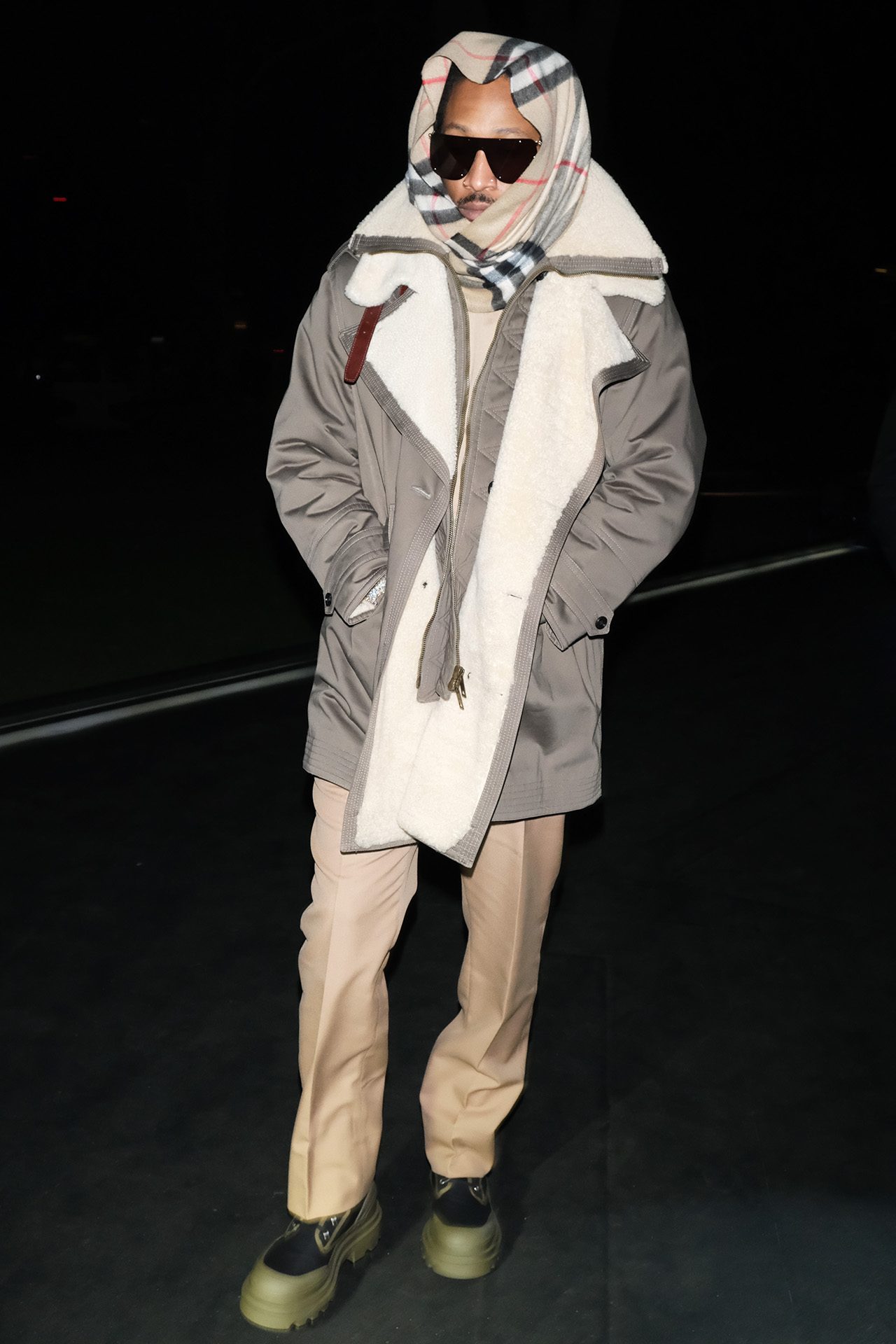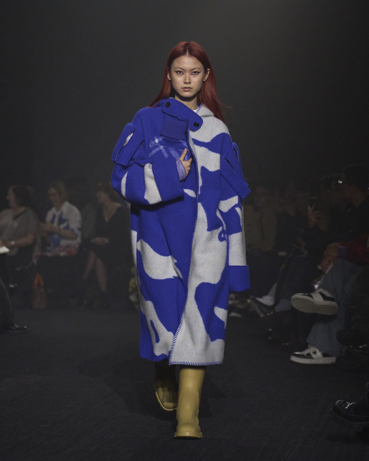 ファーストルックに登場したのは、ブランドのアイコンであるトレンチコート。ダークブラウンのカラーにグリーンのフェイクファーで縁取られたラペルが印象的だ。手元には、紫のバーバリーチェックの湯たんぽを携え、大きなファーチャームが付いたバッグを合わせてコーディネートされている。デコンストラクトされたカーコートやダッフル、アビエーターは、よりソフトなシルエットを強調。また、大胆なカラーのチェックをテーラリング、ブランケットコート、ニットなどにフィーチャーさせると共に、ベルトやエポレットなどの装飾、シルエットに工夫を見せ、クラシックスタイルをアップデートさせた。