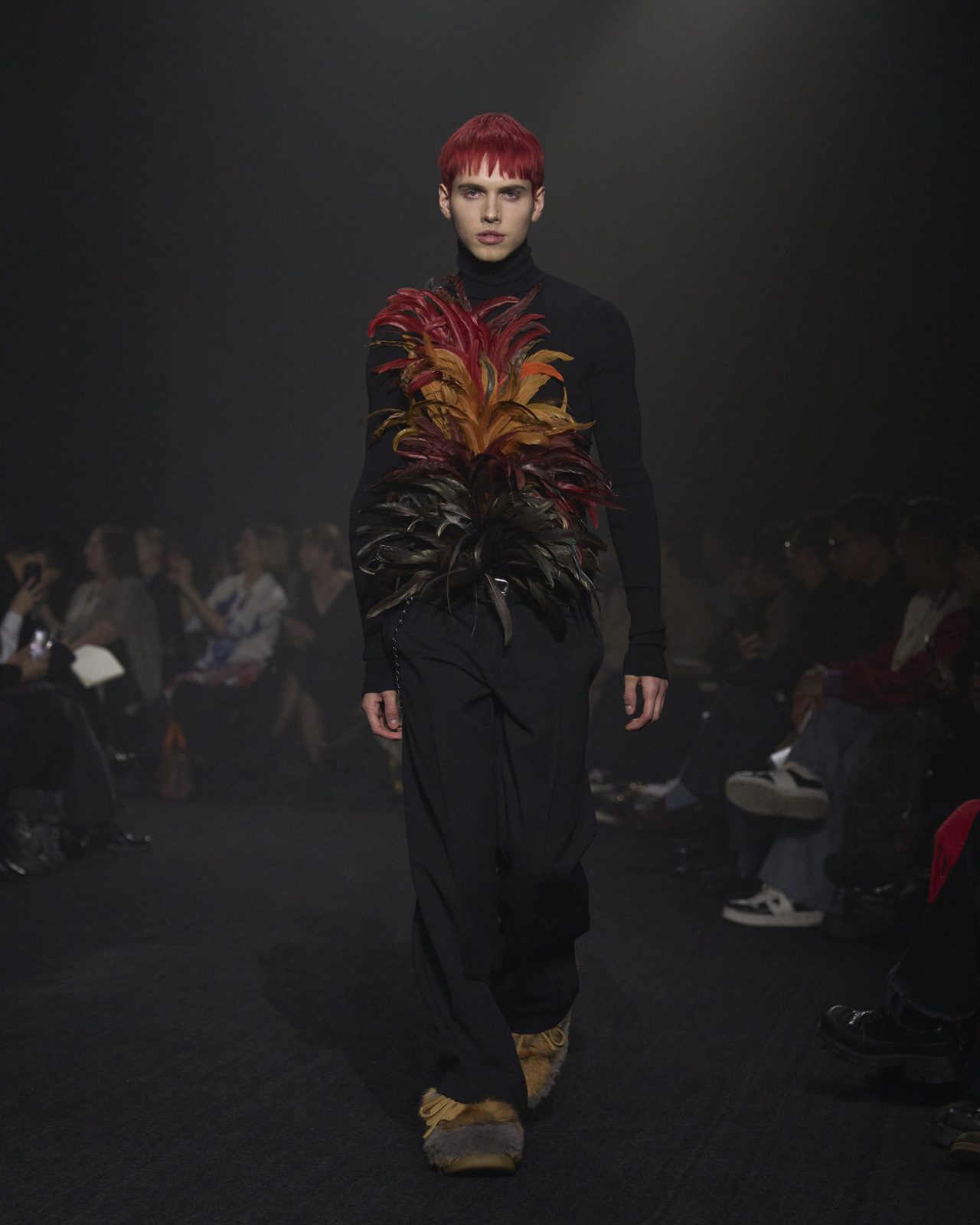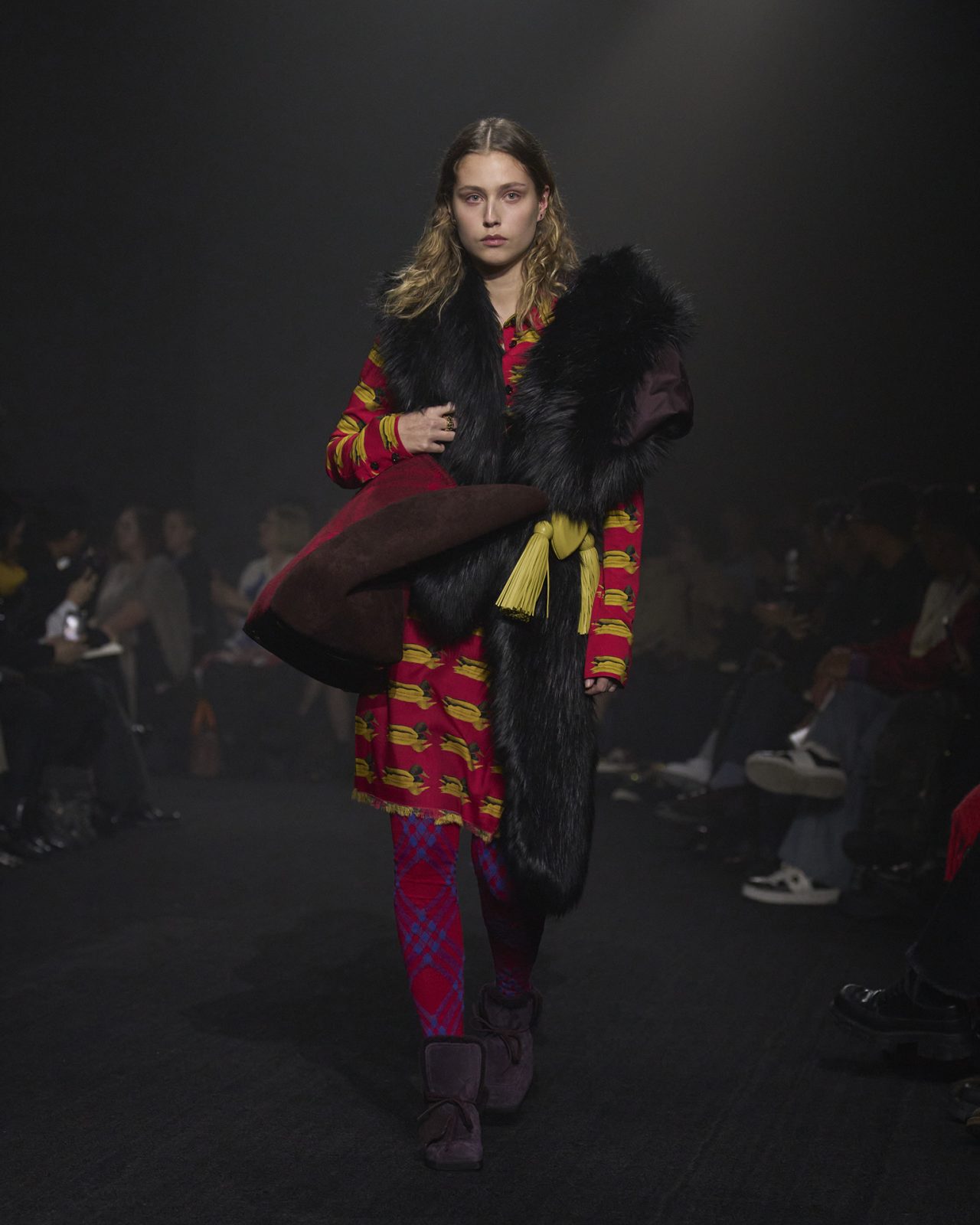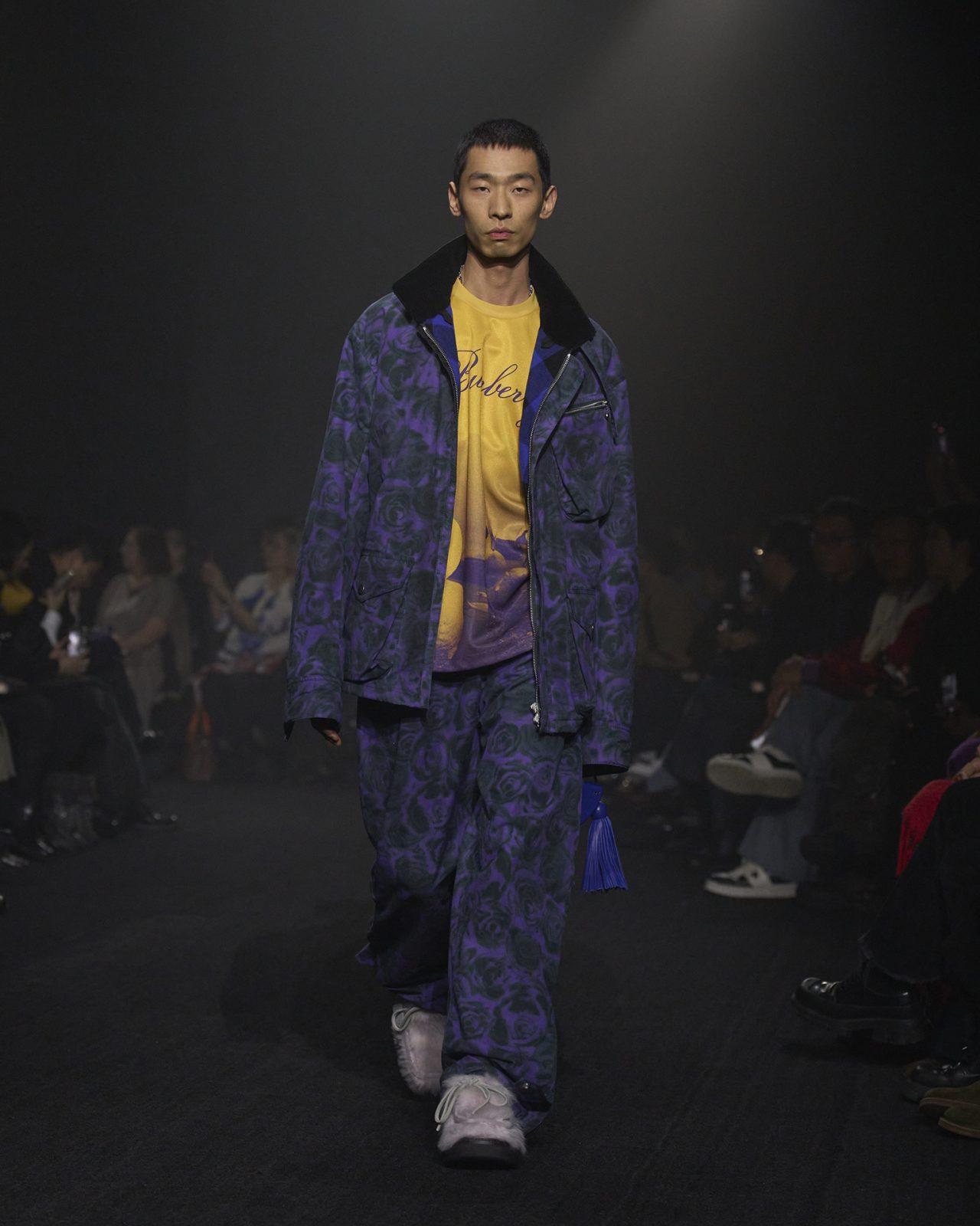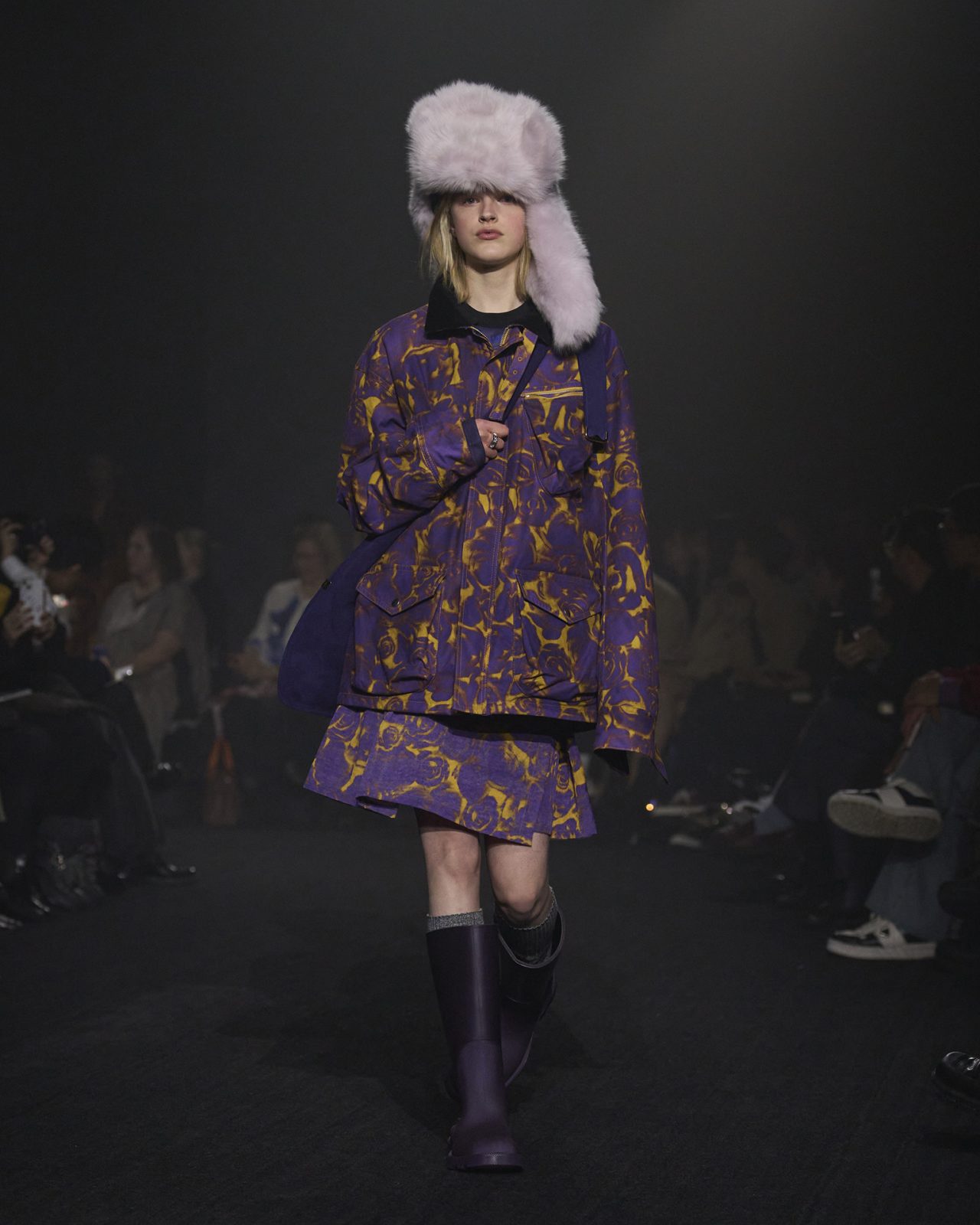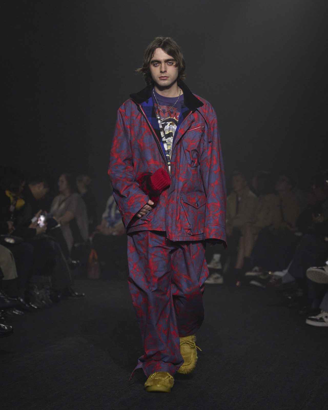 トラウザーに重ねられたタータン風のプリーツキルト、アランセーターやアーガイルセーター、そしてイングリッシュローズのモチーフによって、英国発のブランドとしてのアイデンティティを押し出しながら、グラフィックやカルガモのニット帽、ジッパーが施されたパンツなど遊び心もプラスした。