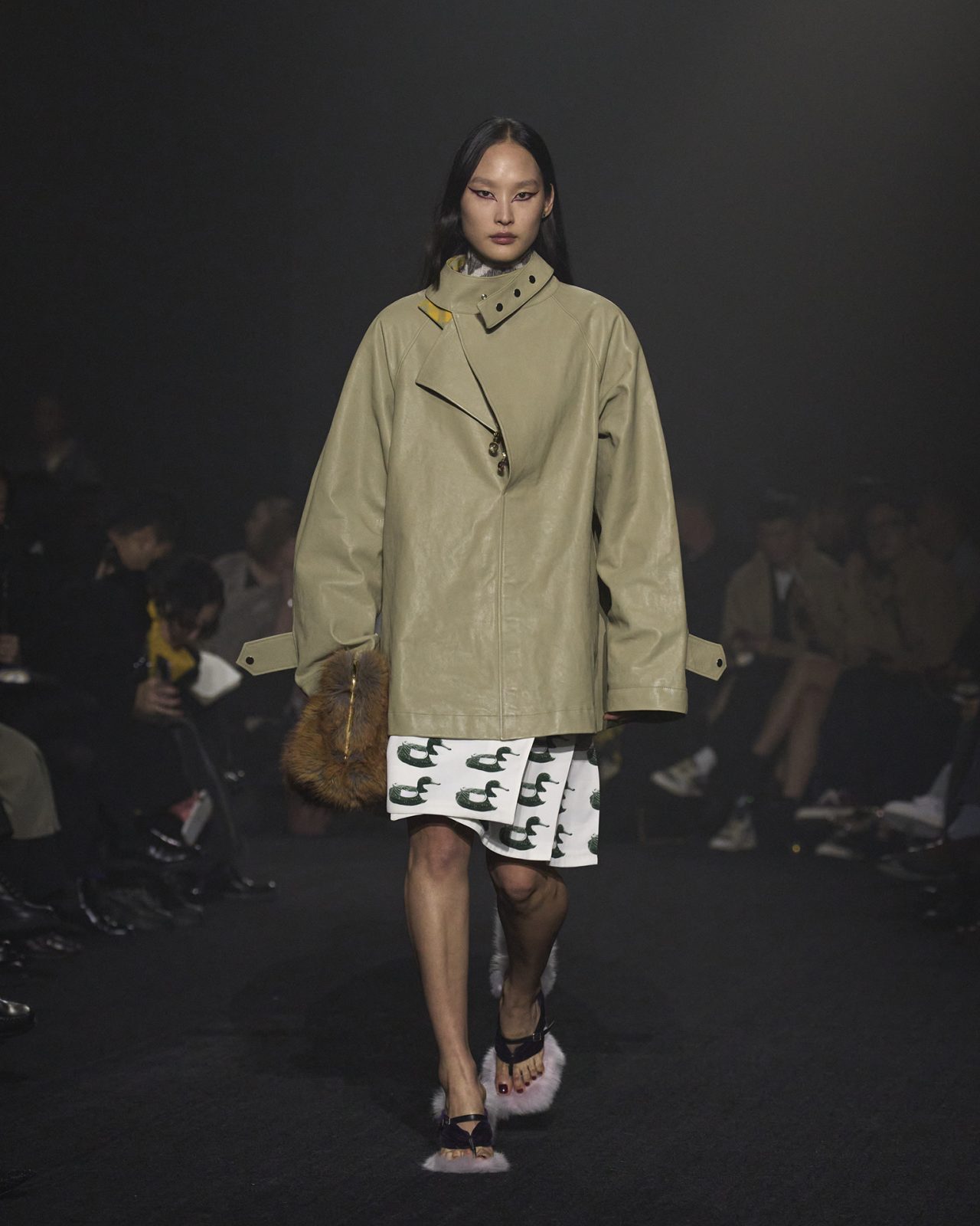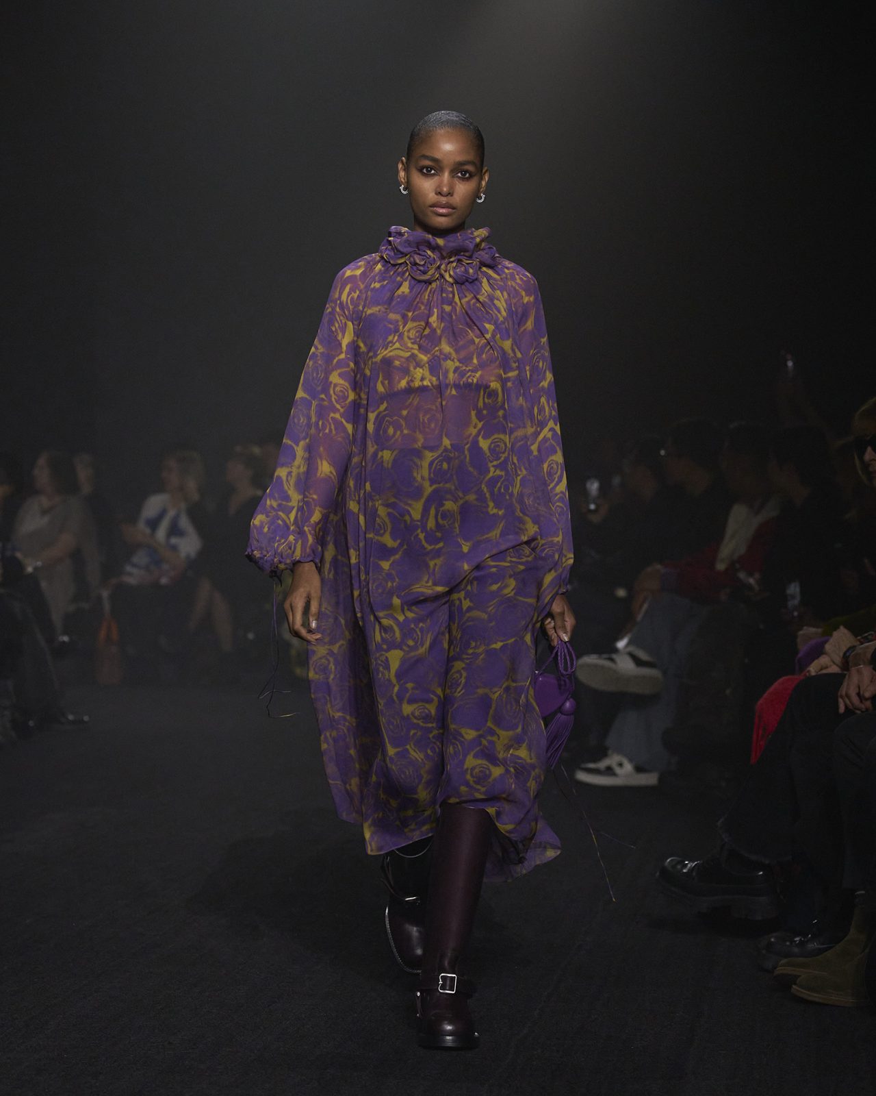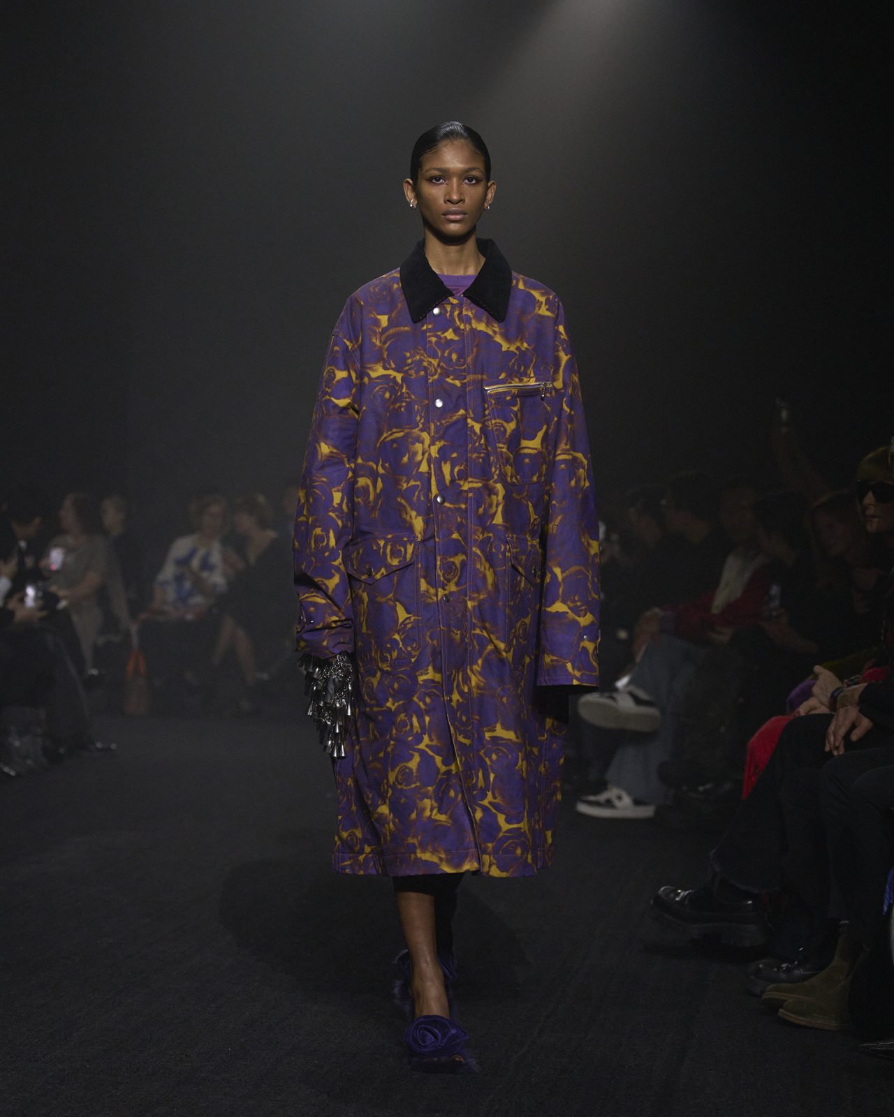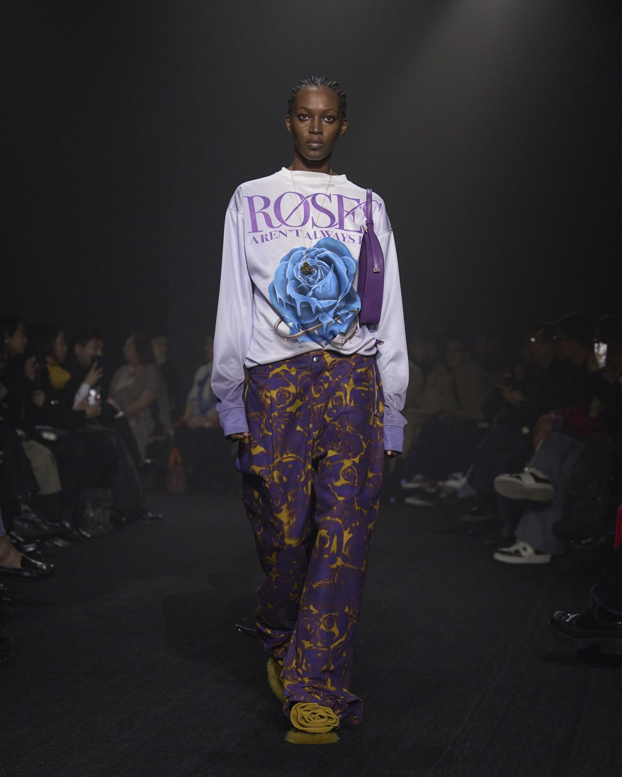 再解釈された Burberry のエンブレムである「馬上の騎士(EKD)」は、流れるドレープが美しいホワイトカラーのドレスに大きくプリントされ、ブランドの伝統を強調した。印象的だったのは、カルガモやイングリッシュローズのグラフィック T シャツ。イギリスらしいパンク要素を持ちながら、「ROSES AREN’T ALWAYS RED (バラはいつも赤ではない)」や「THE WINDS OF CHANGE (変化の風)」、「THE CHANGE IS INVITABLE (変化は避けられない)」といったスローガンにより、新生 Burberry の姿を映し出した。そのメッセージを表すかのように、今回のコレクションでは、ブランドのシグネチャーであるキャメルのチェックは登場せず、Daniel Lee らしい鮮やかなカラーでデザインされた。
