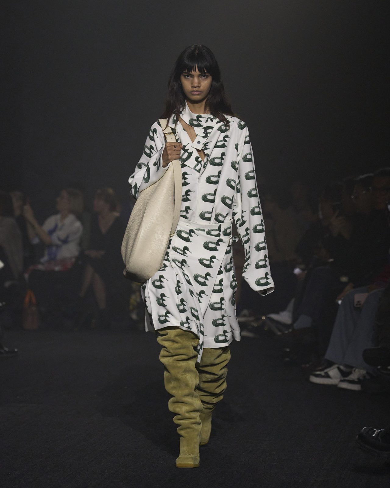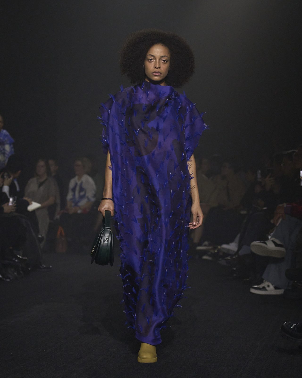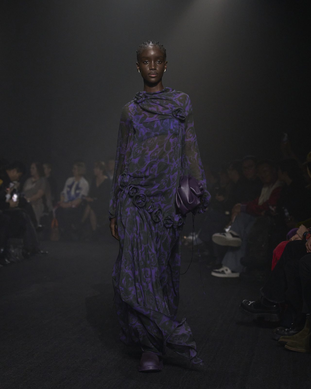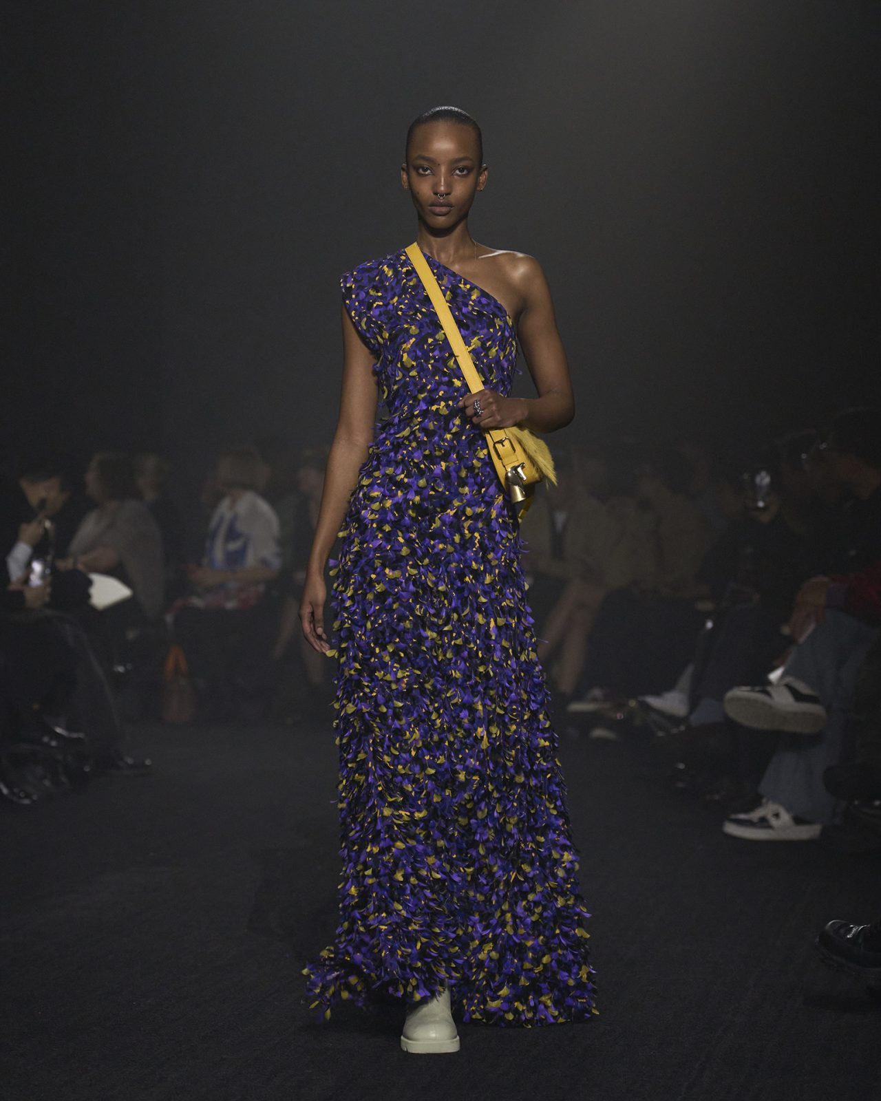 再解釈された Burberry のエンブレムである「馬上の騎士(EKD)」は、流れるドレープが美しいホワイトカラーのドレスに大きくプリントされ、ブランドの伝統を強調した。印象的だったのは、カルガモやイングリッシュローズのグラフィック T シャツ。イギリスらしいパンク要素を持ちながら、「ROSES AREN’T ALWAYS RED (バラはいつも赤ではない)」や「THE WINDS OF CHANGE (変化の風)」、「THE CHANGE IS INVITABLE (変化は避けられない)」といったスローガンにより、新生 Burberry の姿を映し出した。そのメッセージを表すかのように、今回のコレクションでは、ブランドのシグネチャーであるキャメルのチェックは登場せず、Daniel Lee らしい鮮やかなカラーでデザインされた。